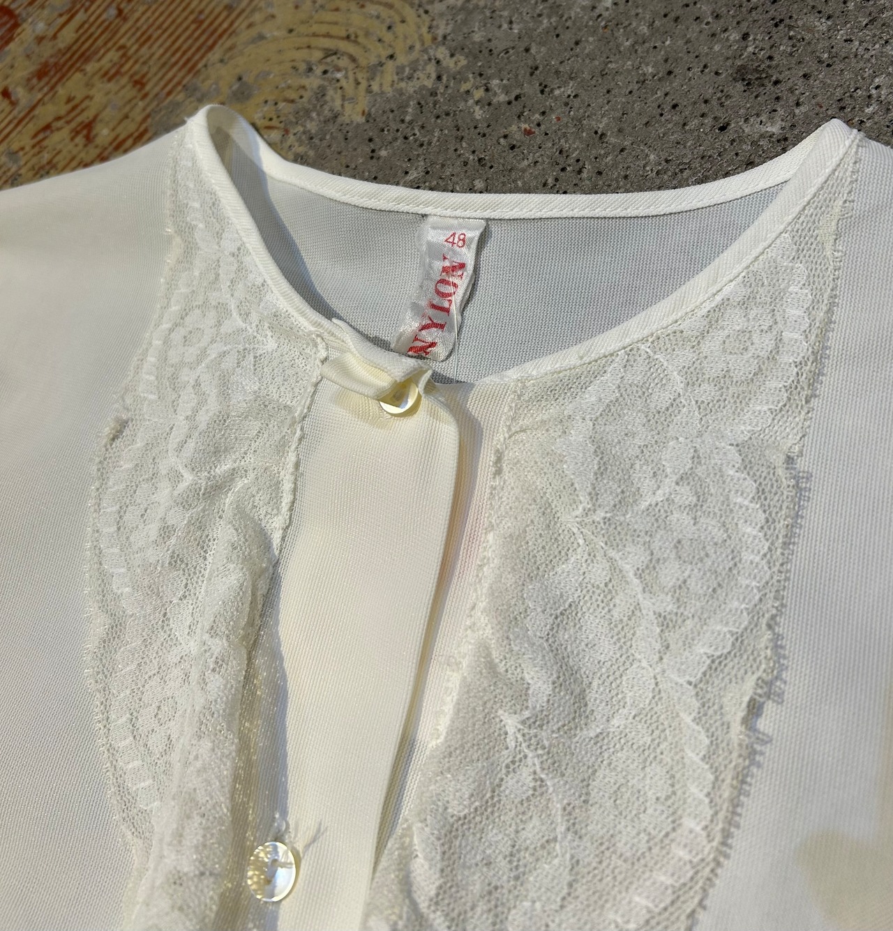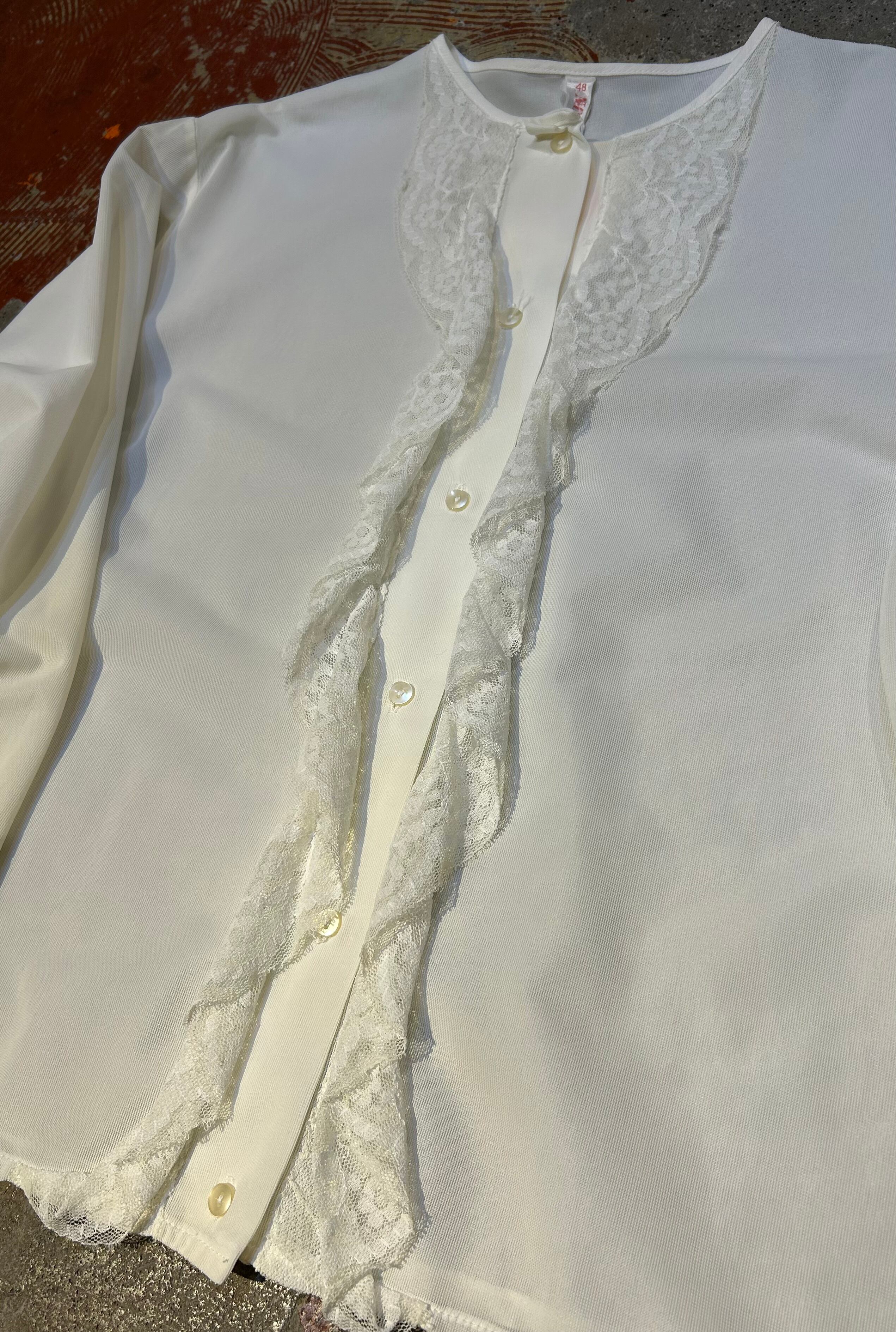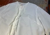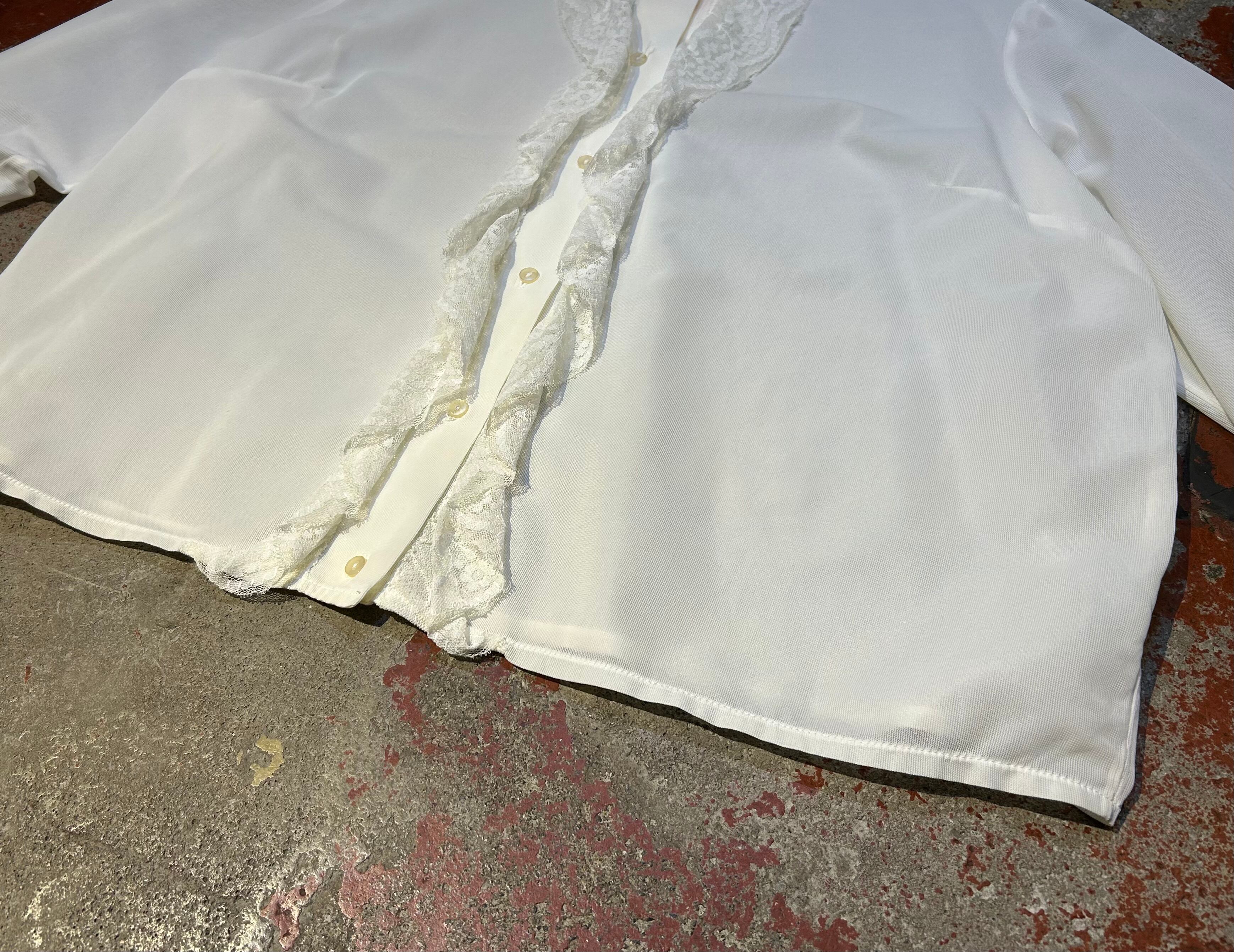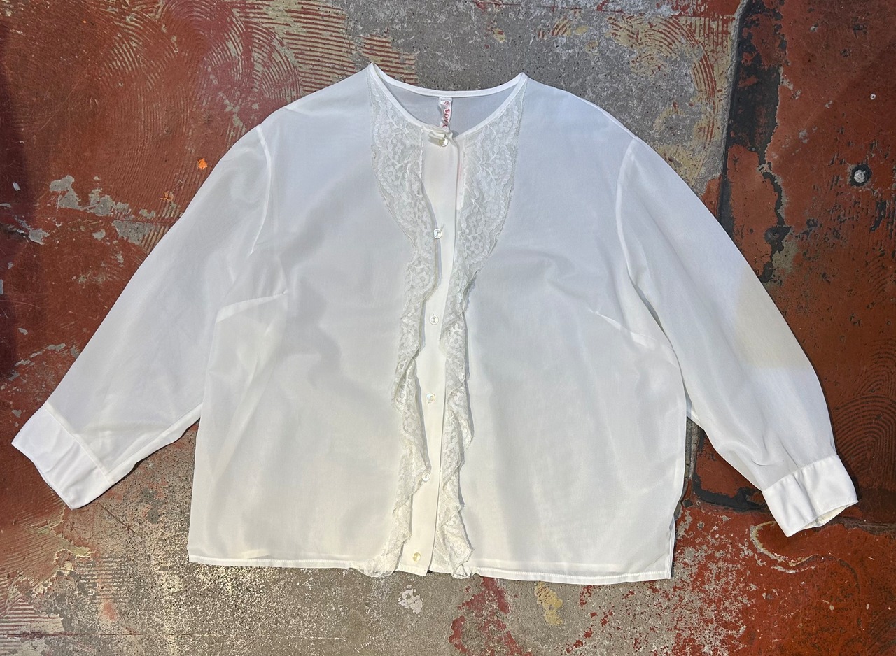 少し生成りがかった色合いとセンターレースがアクセントになるブラウス。