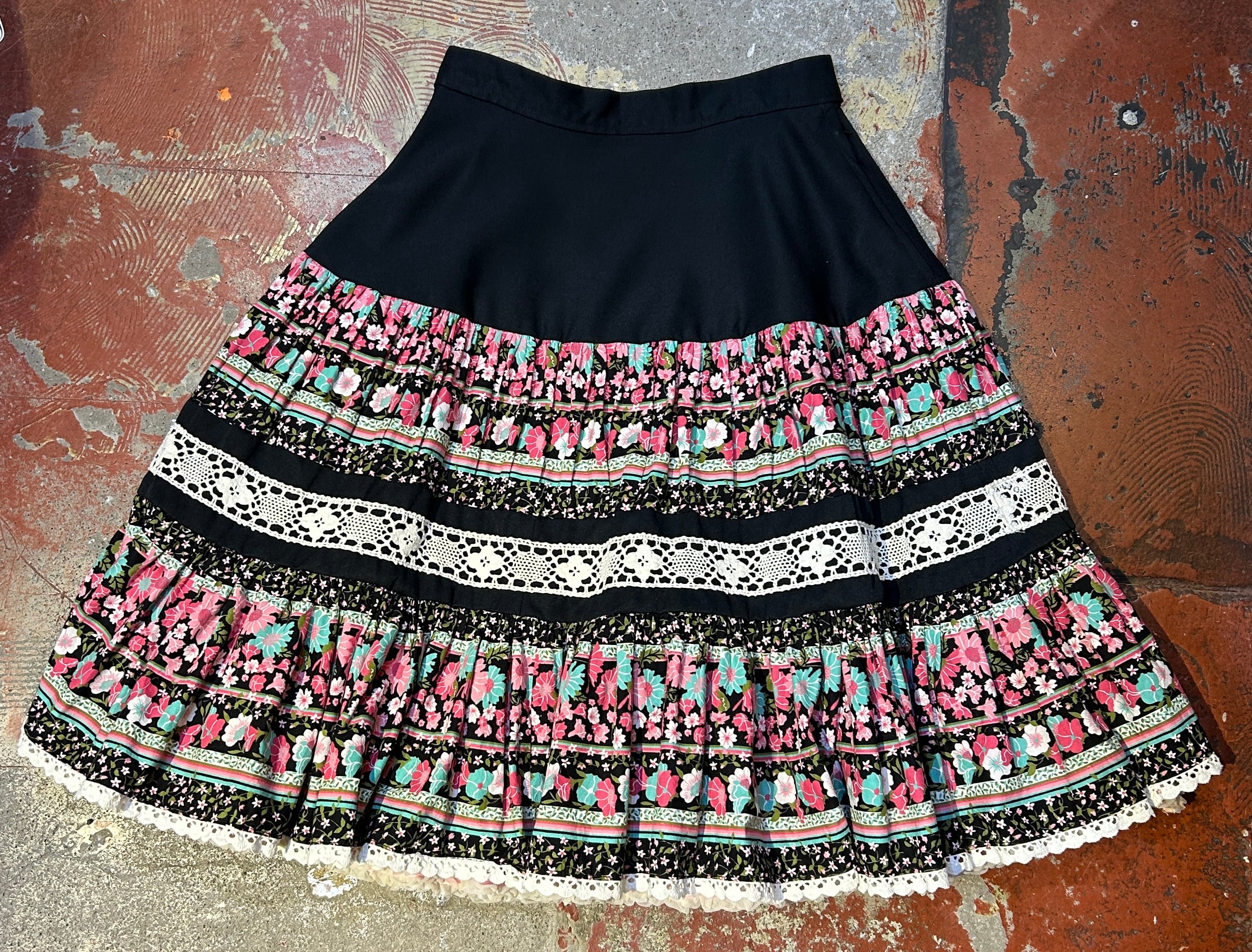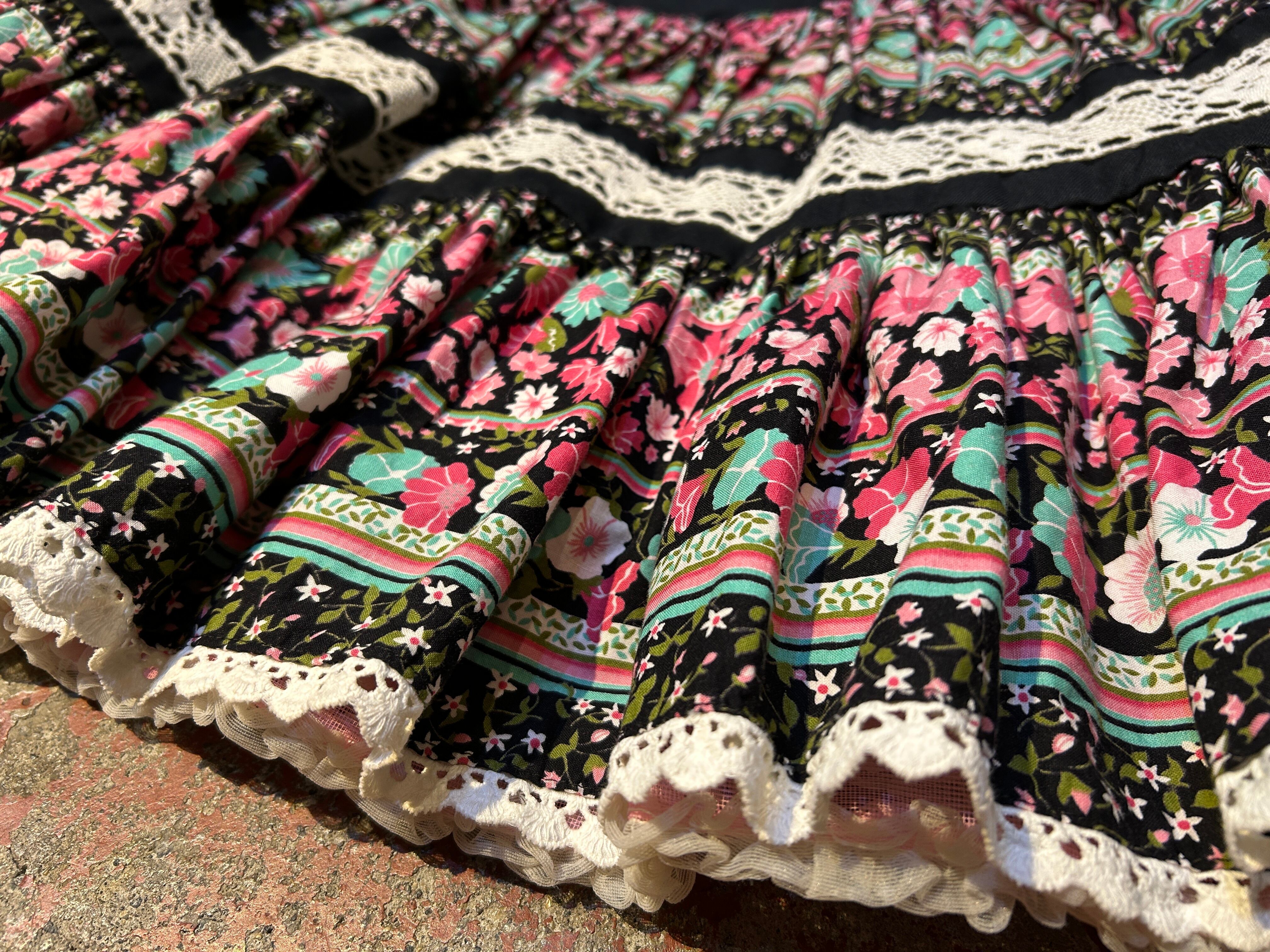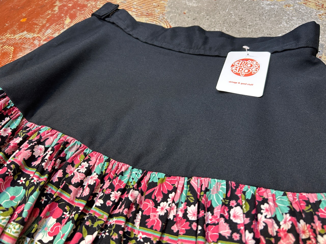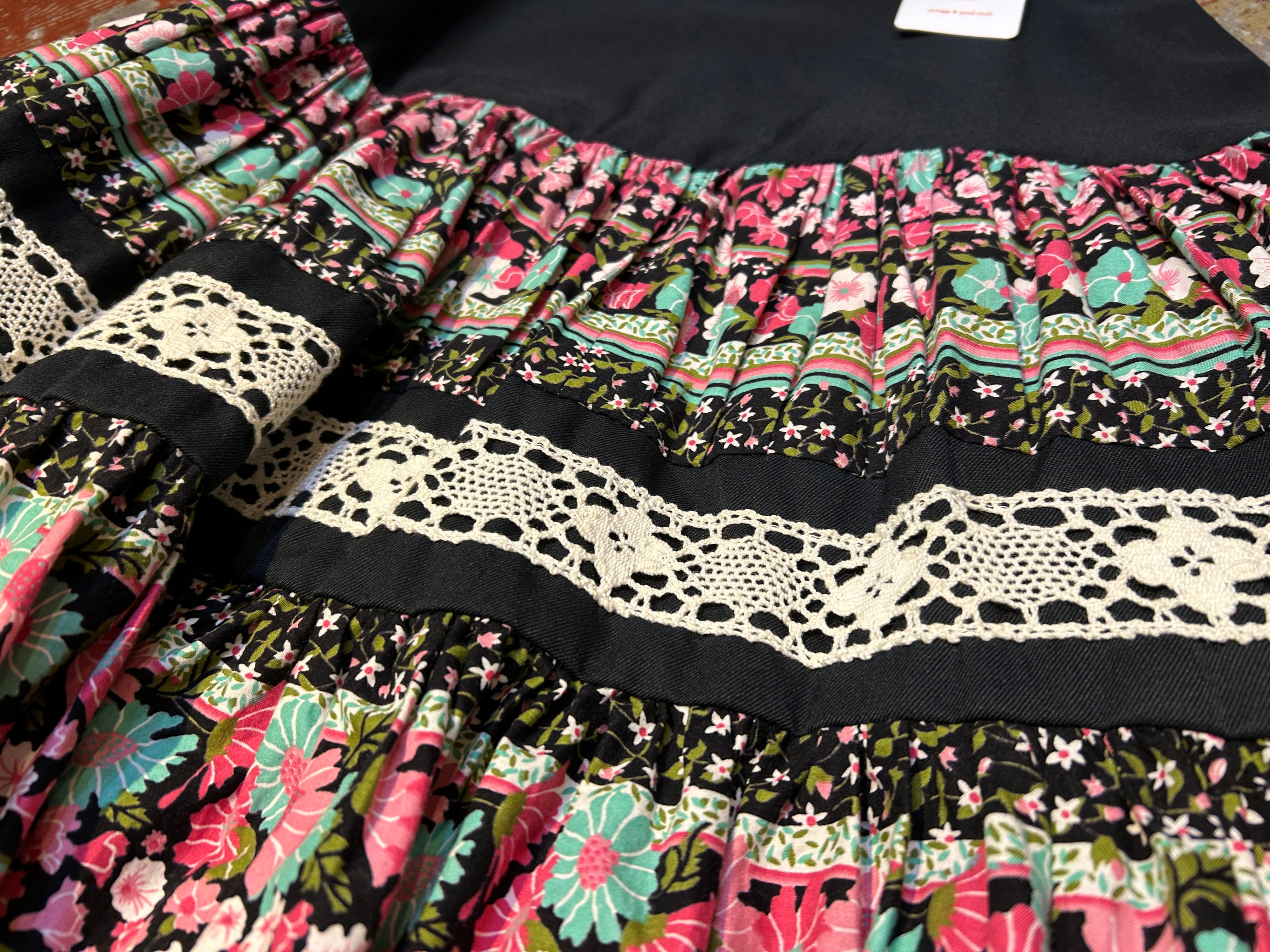 ビンテージチュールティアードスカート。ブラックベースで引き締まったボディに鮮やかなピンクとエメラルドの花柄が可愛らしい1着。