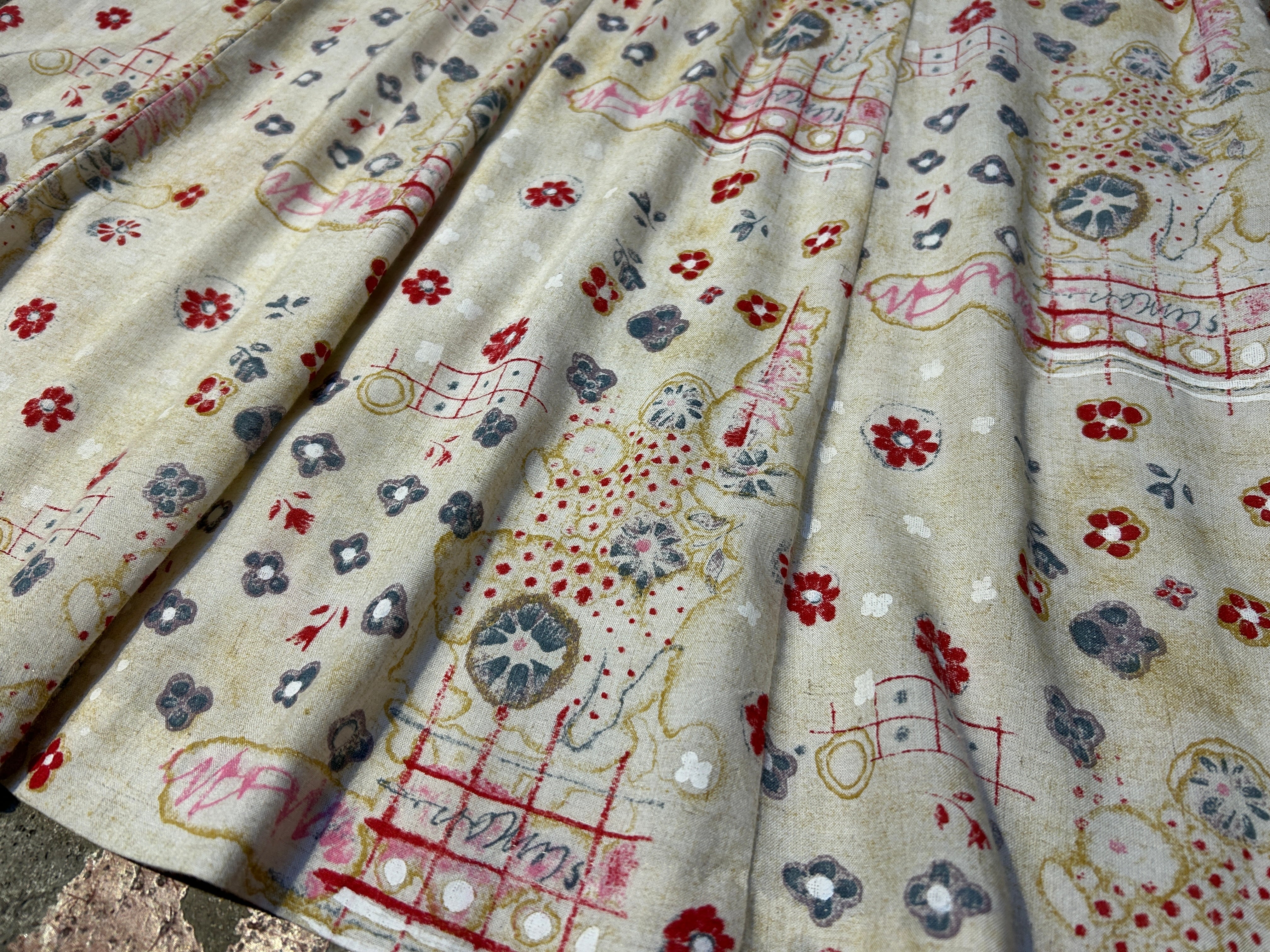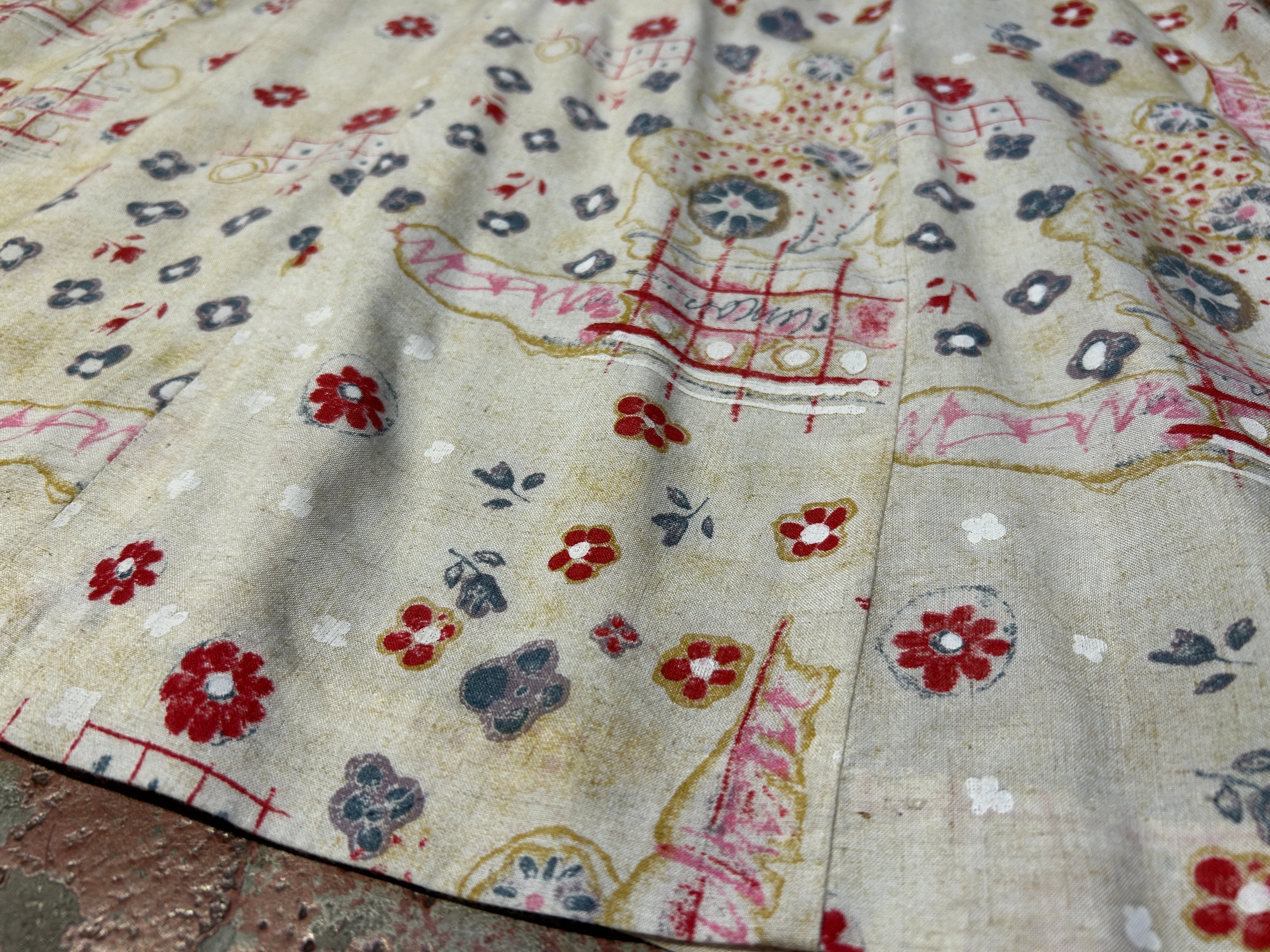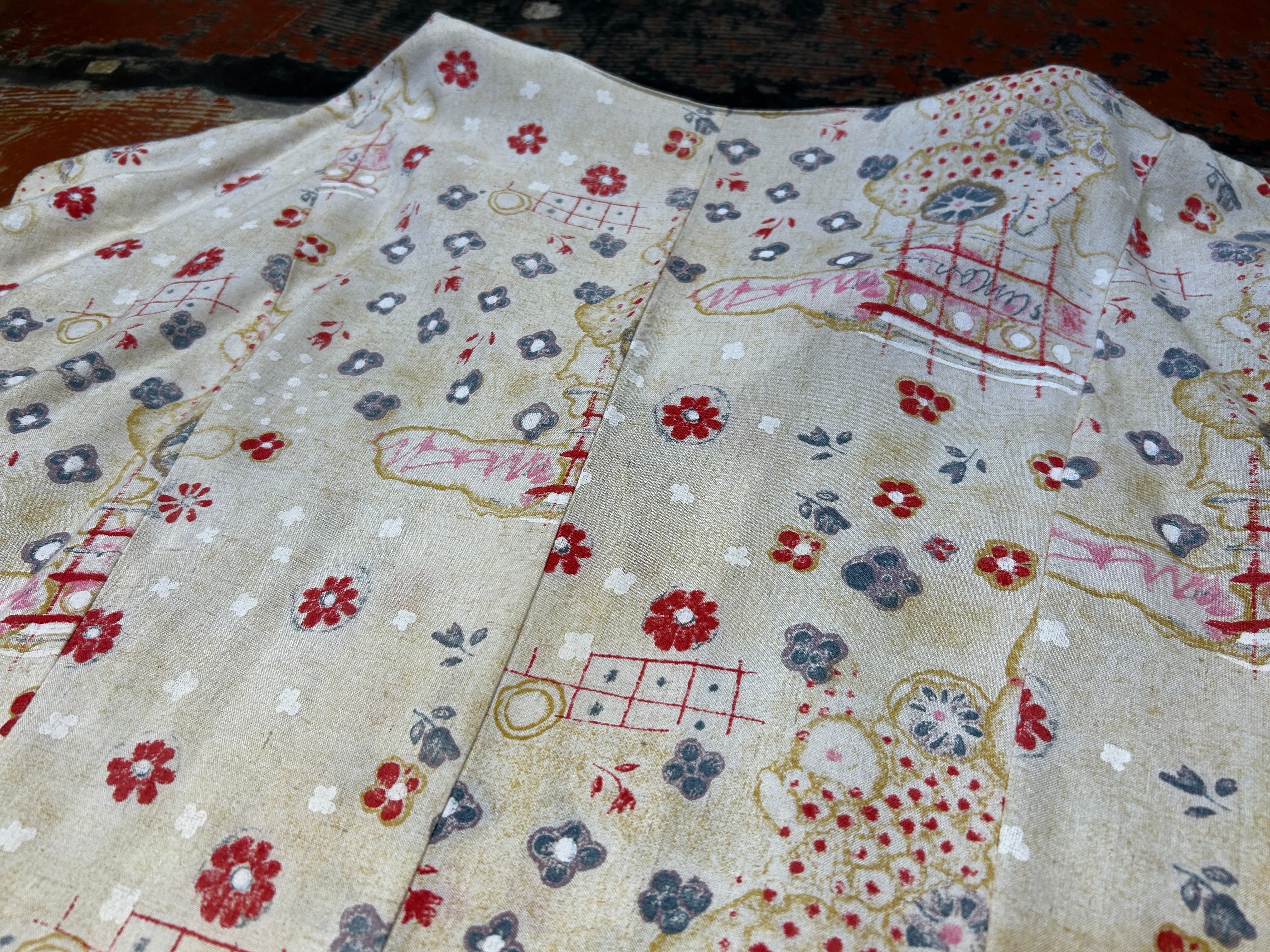 手書きのようなゆるいタッチのフラワーパターンと全体のナチュラルな生地感が優しい1着。