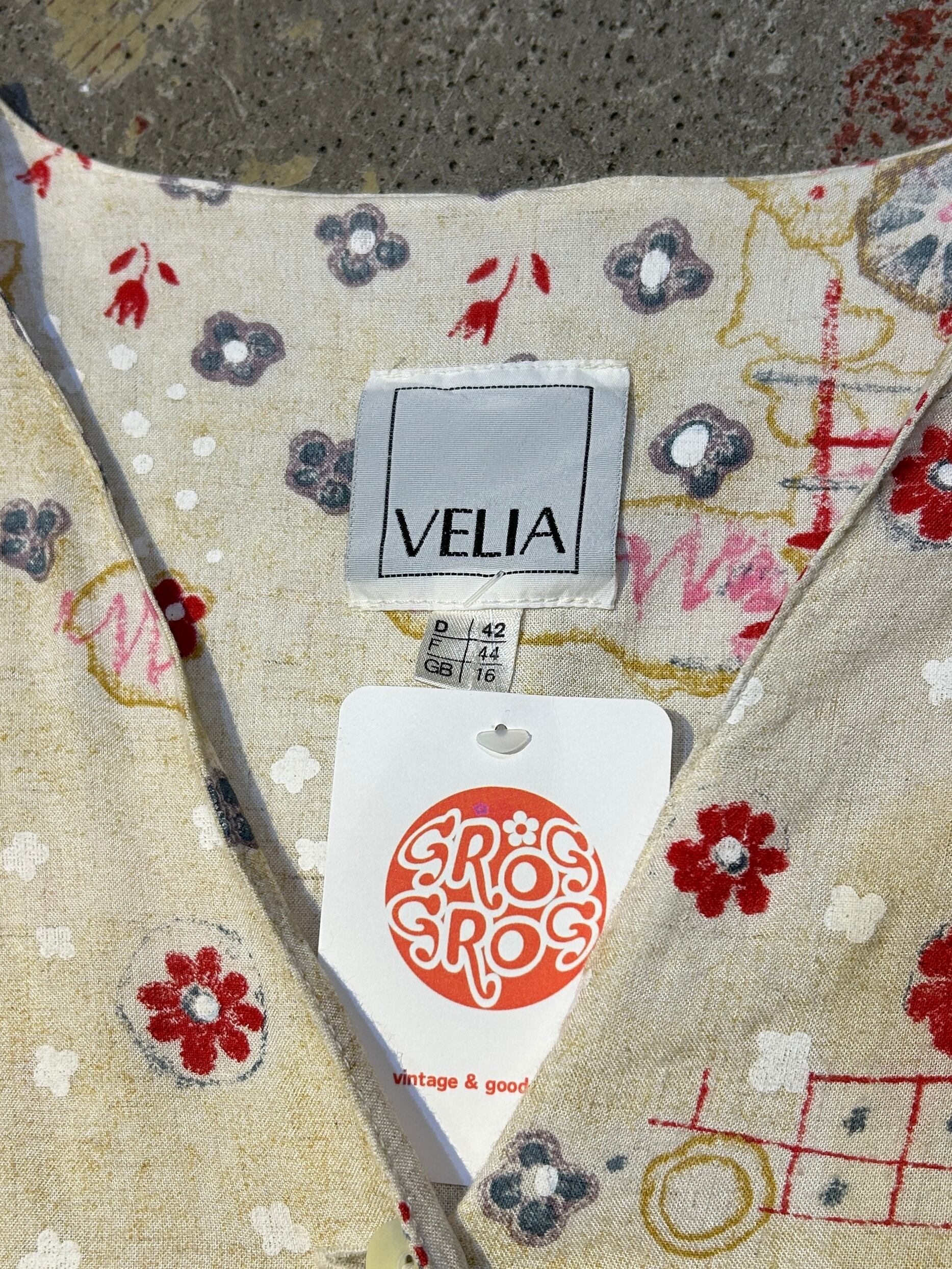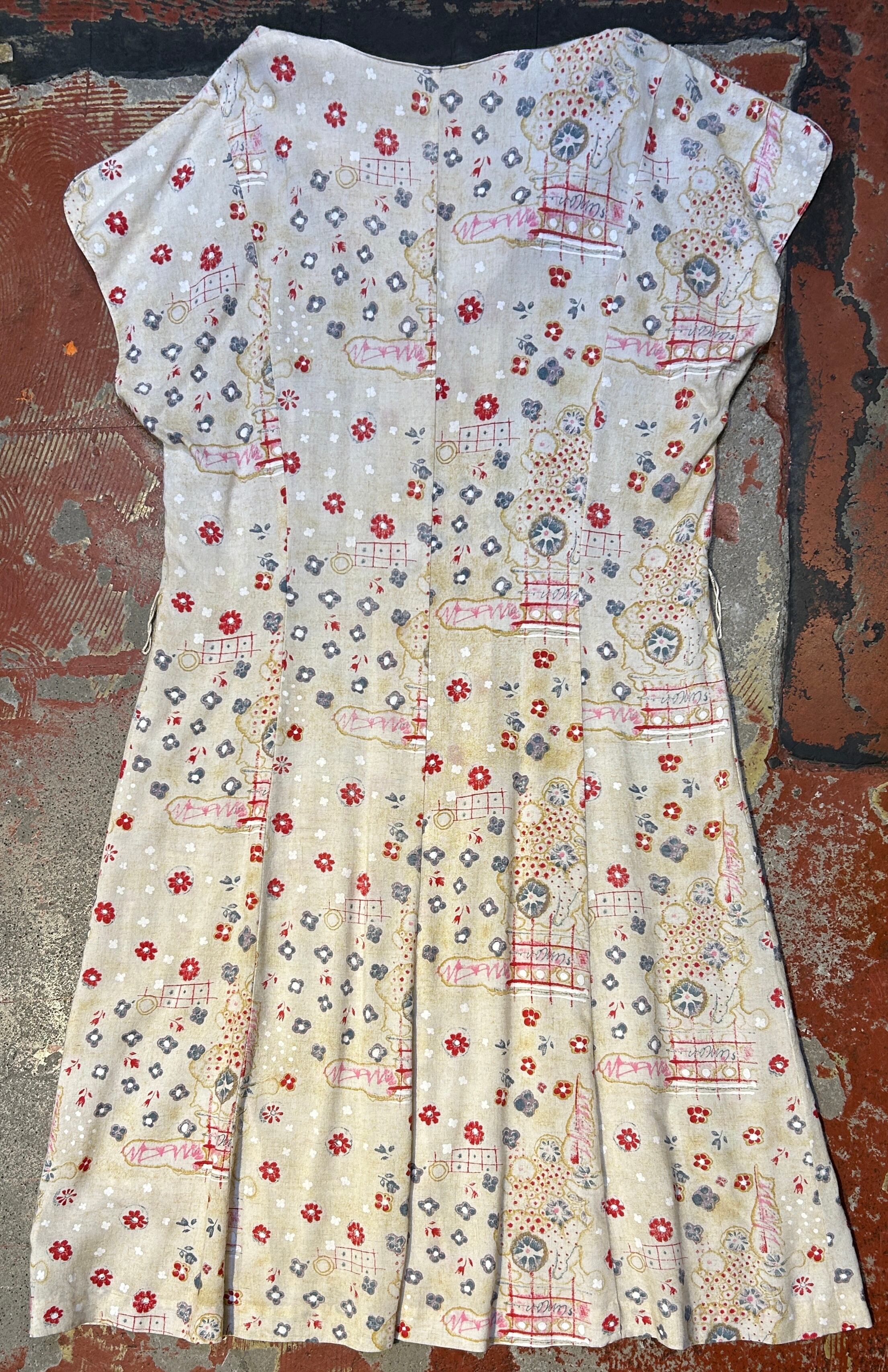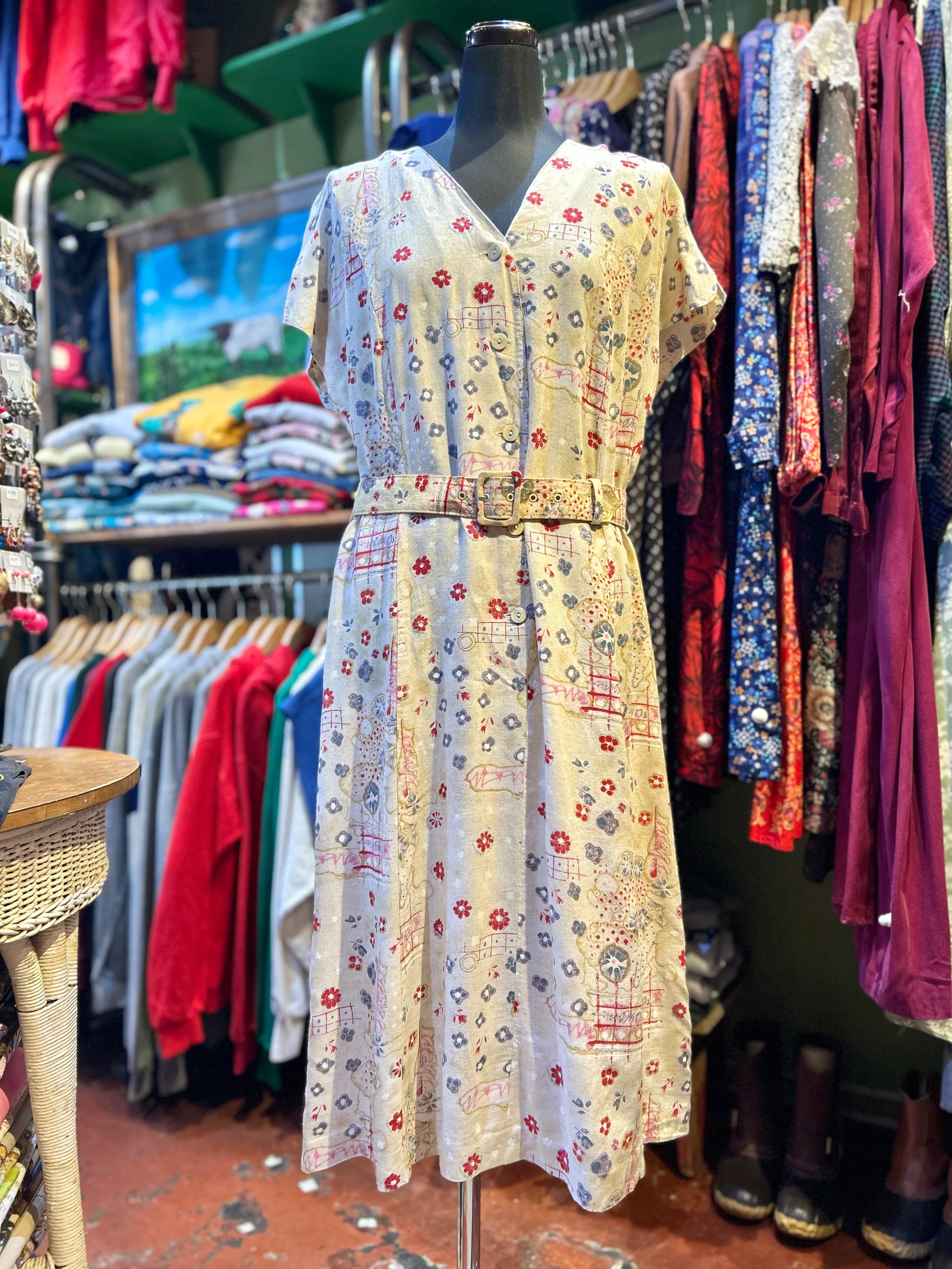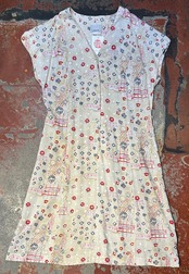 手書きのようなゆるいタッチのフラワーパターンと全体のナチュラルな生地感が優しい1着。