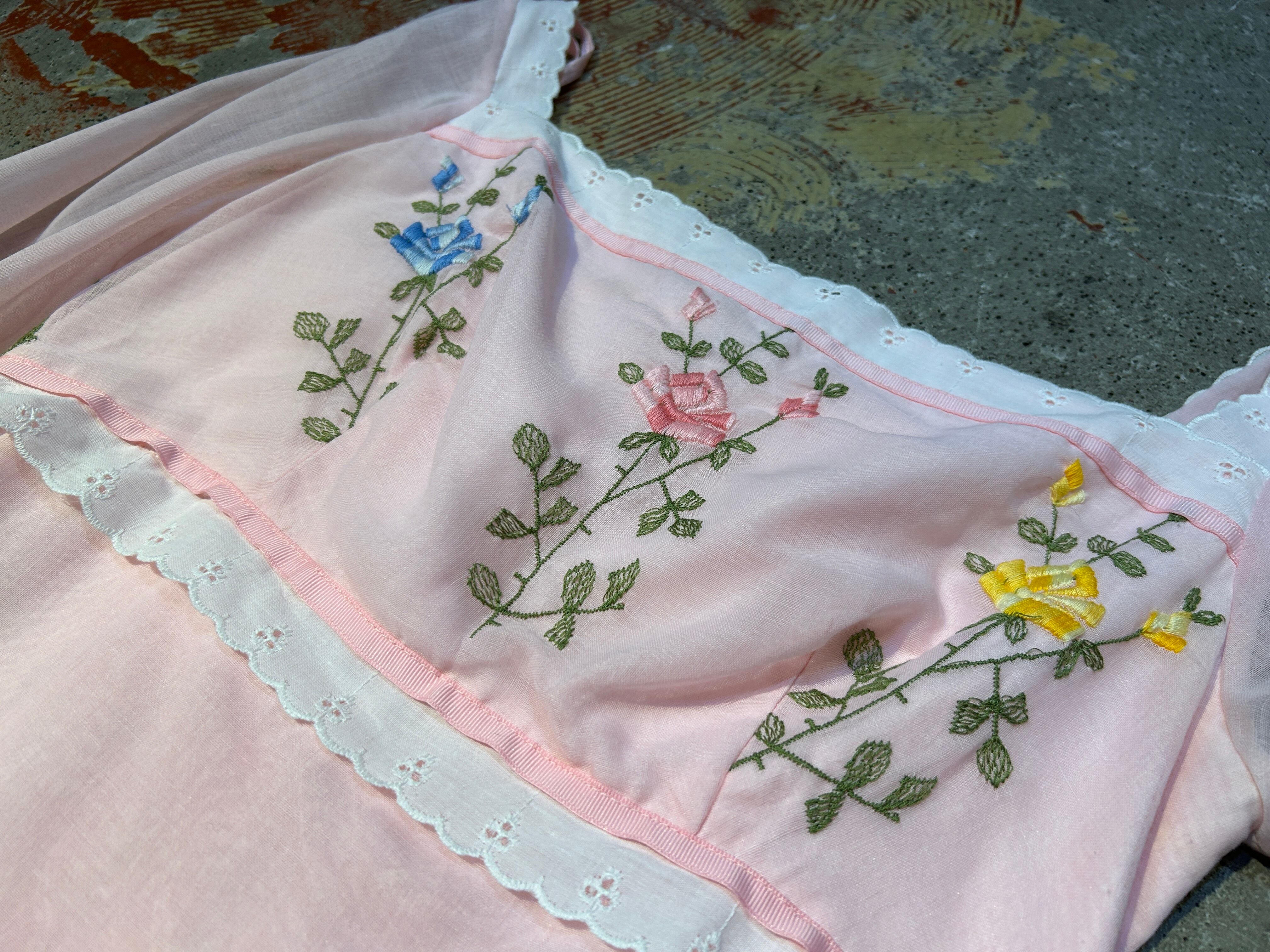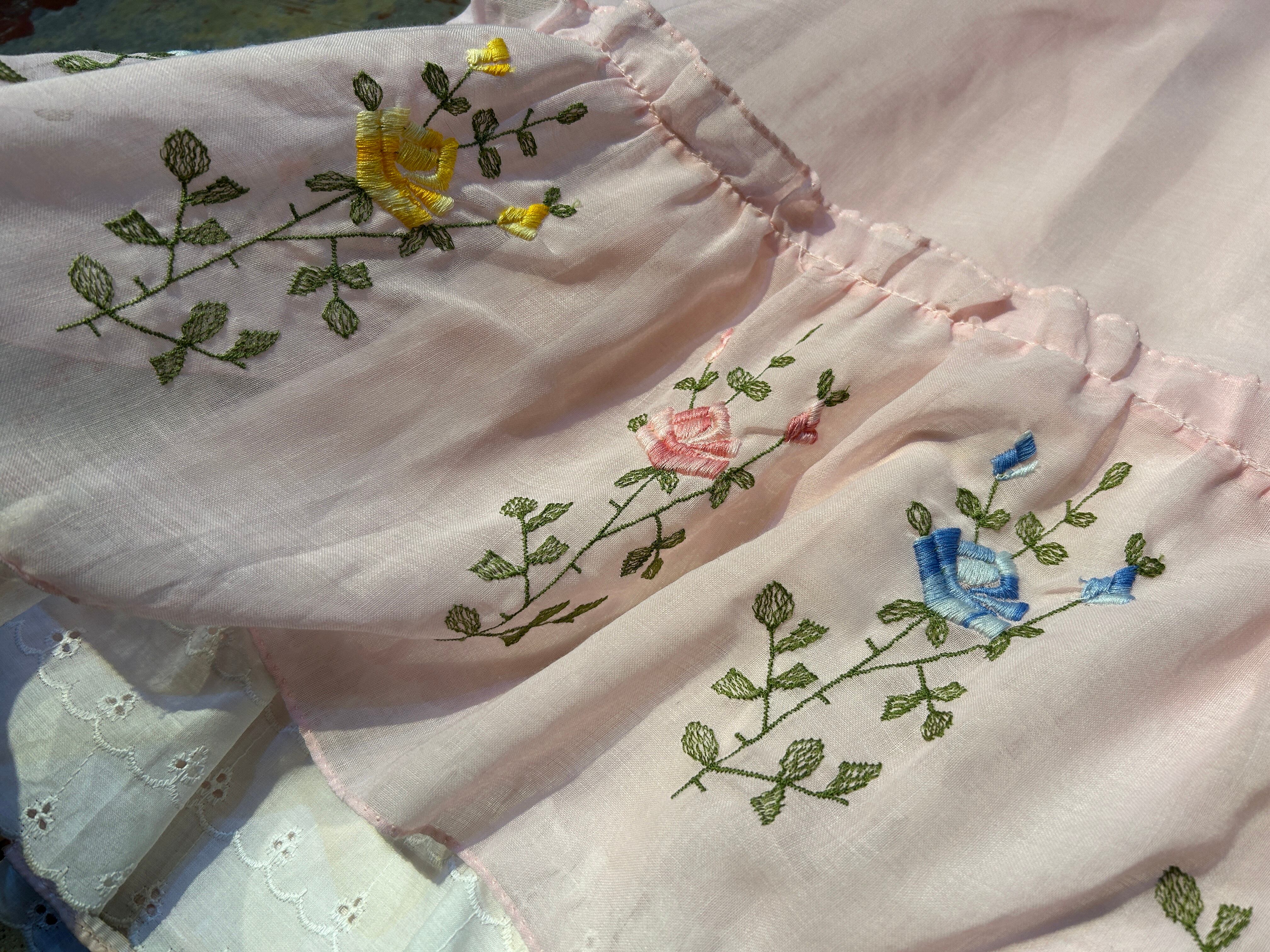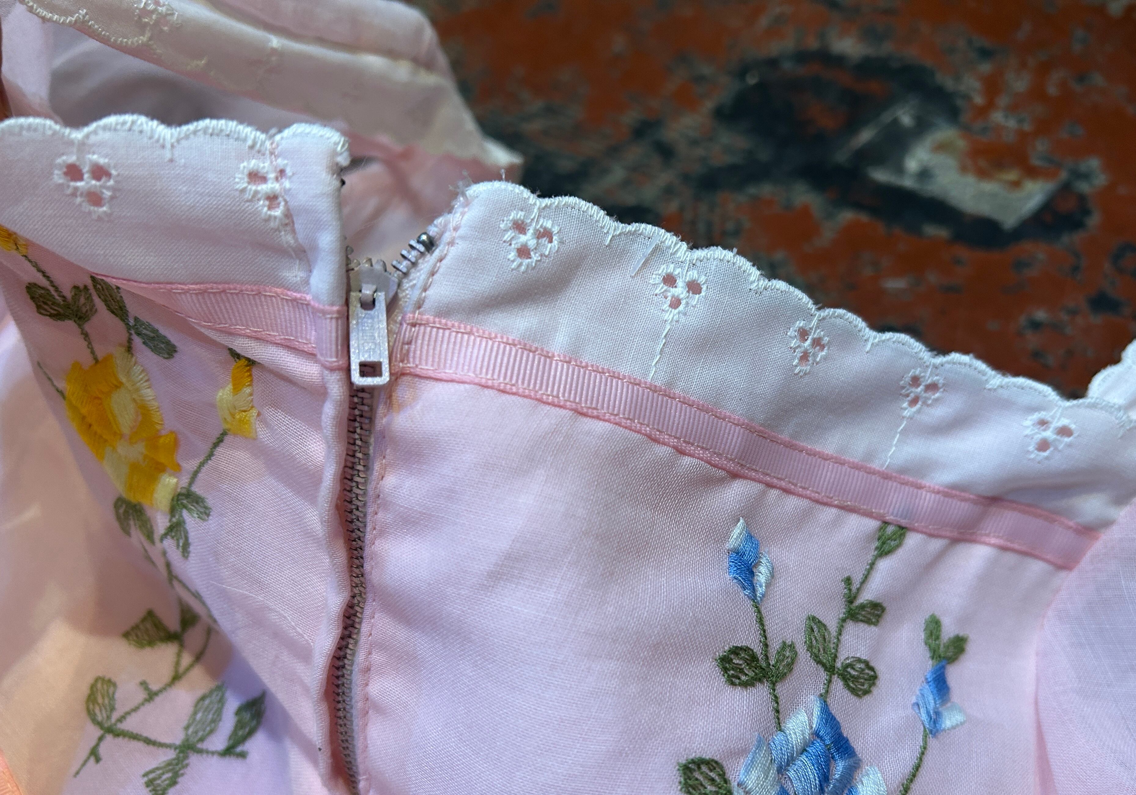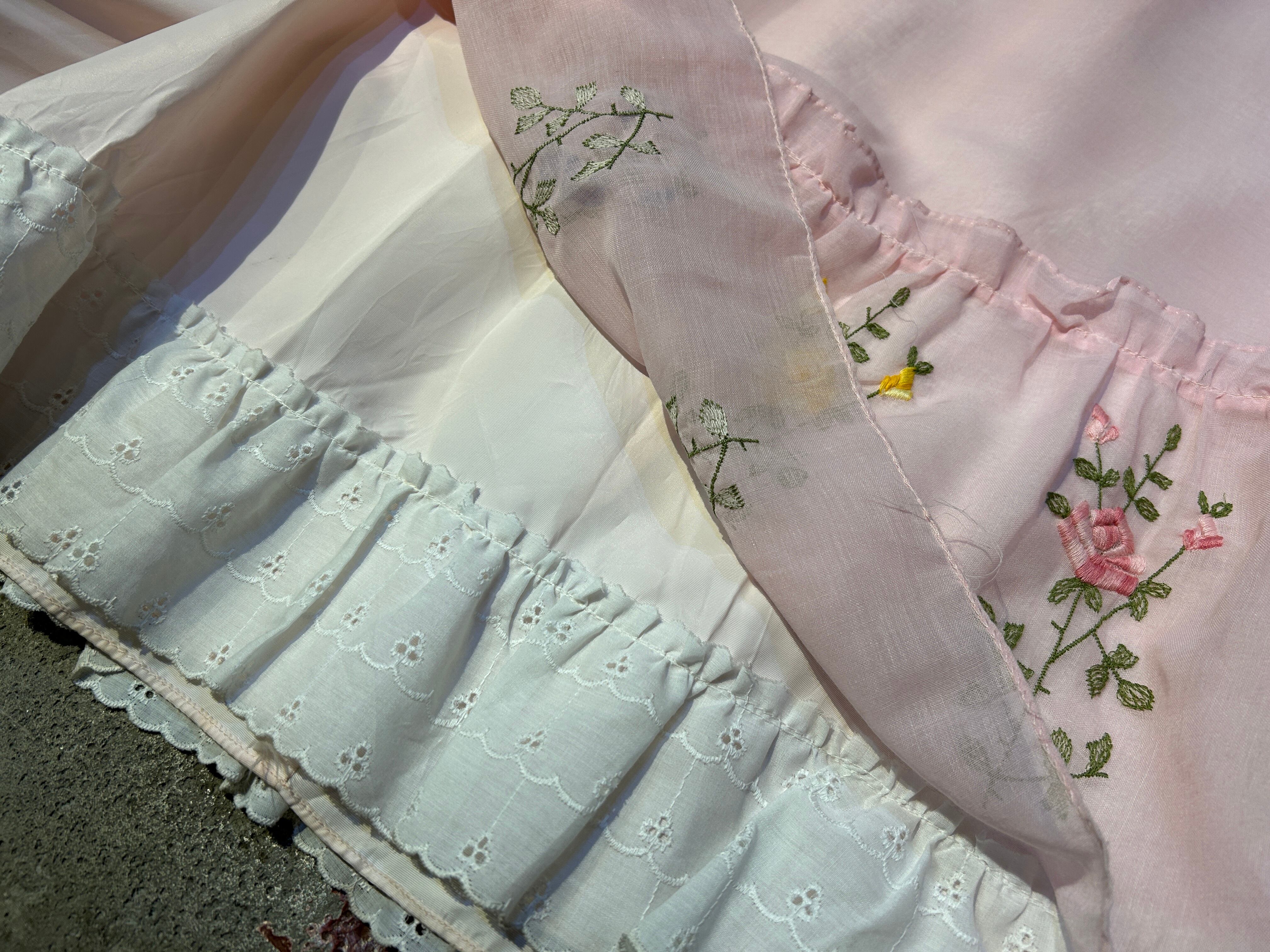 淡いピンクボディに胸元と裾の花刺繍、
