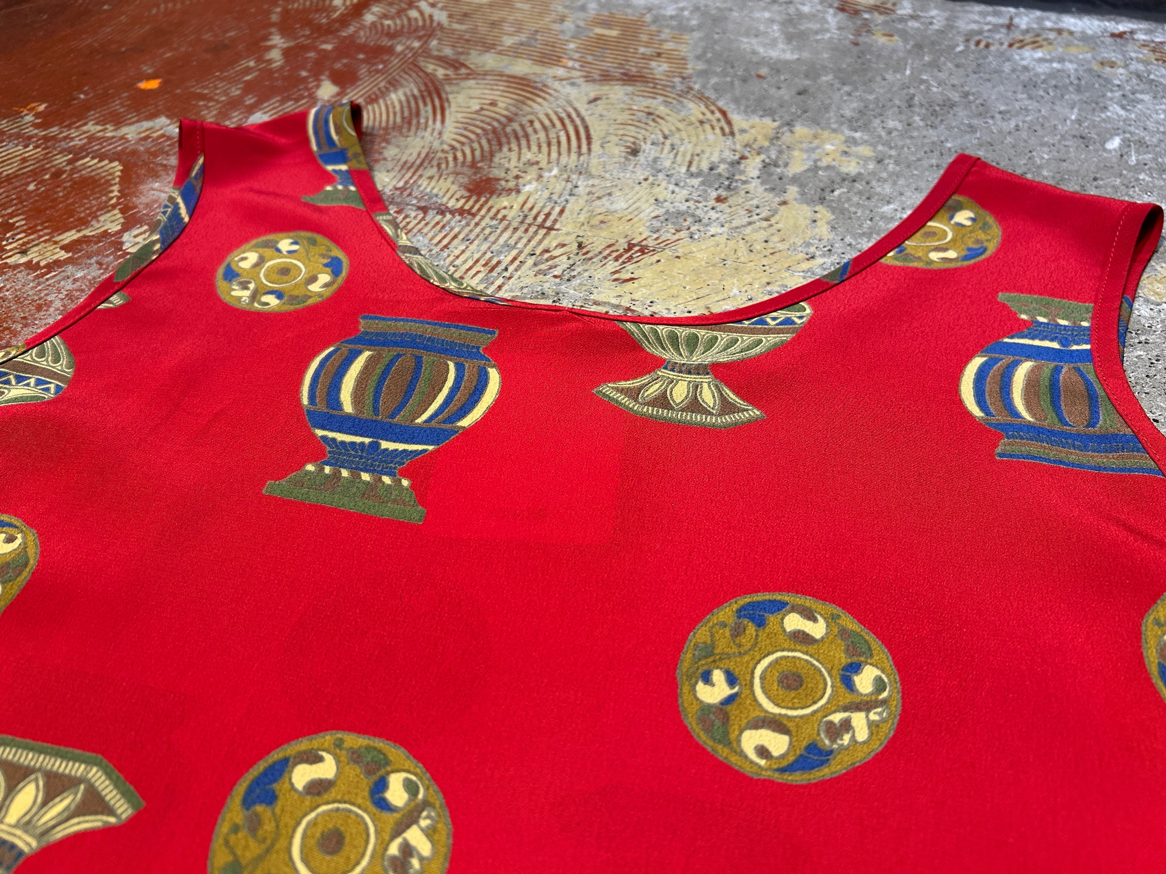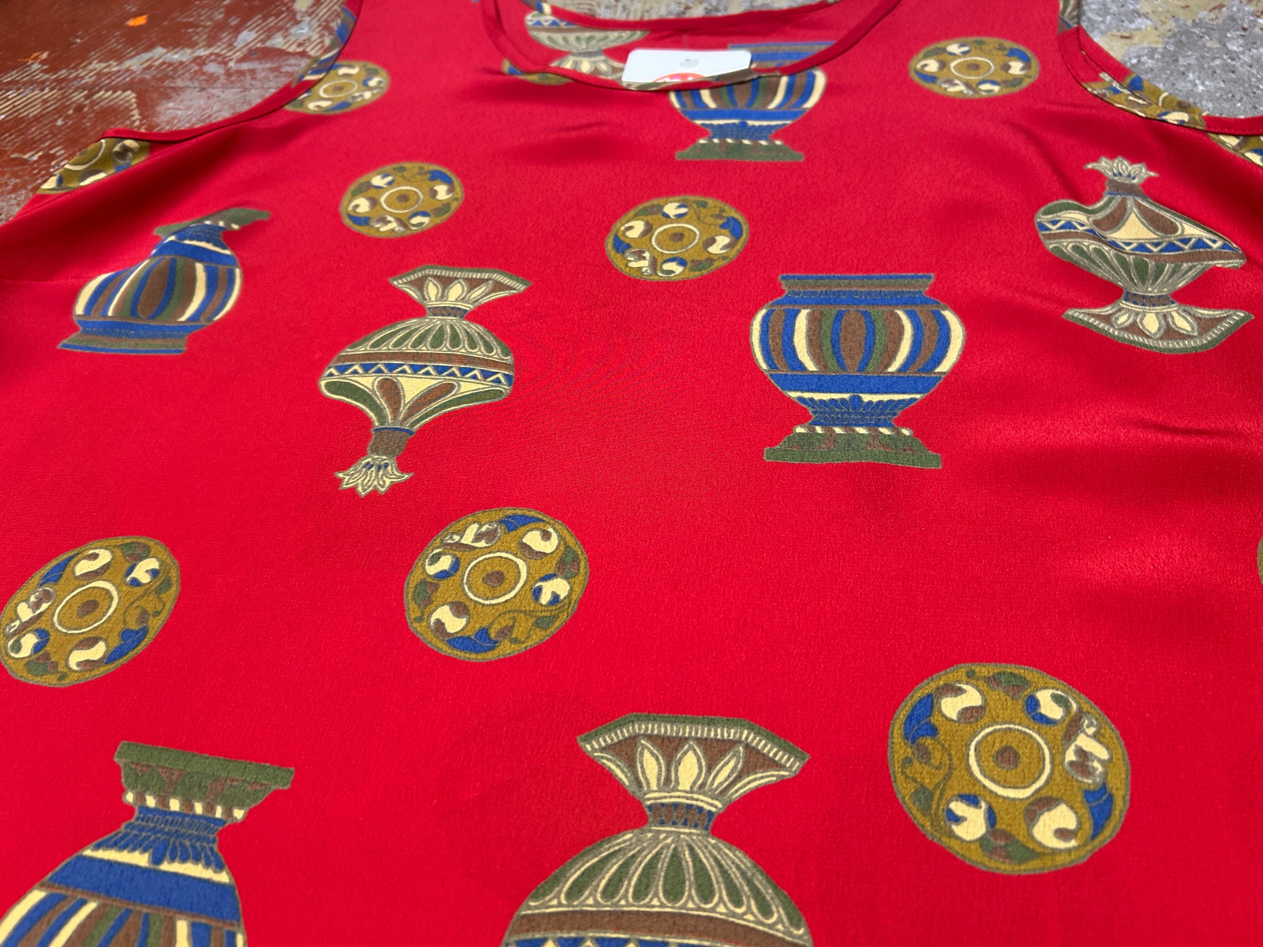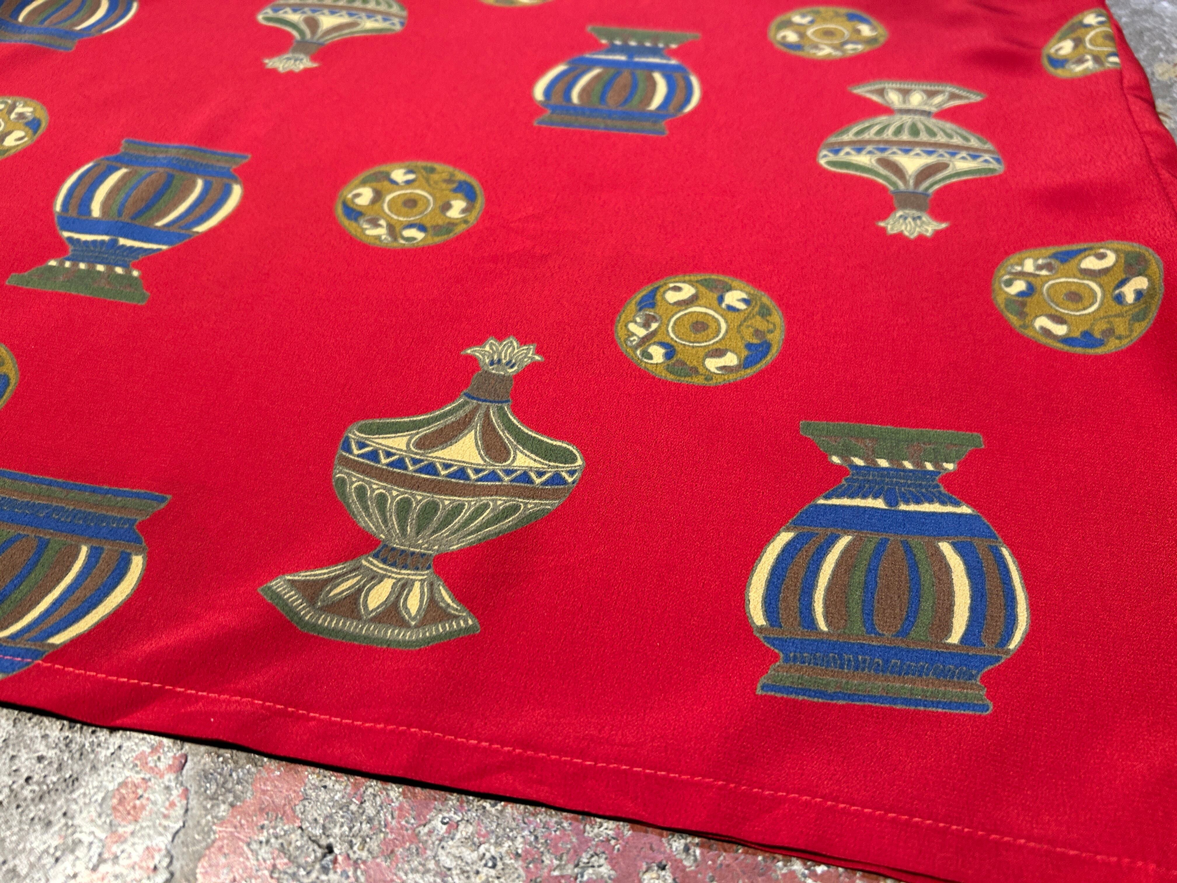 赤のボディに壺や陶器のパターンが珍しい雰囲気のトップス。