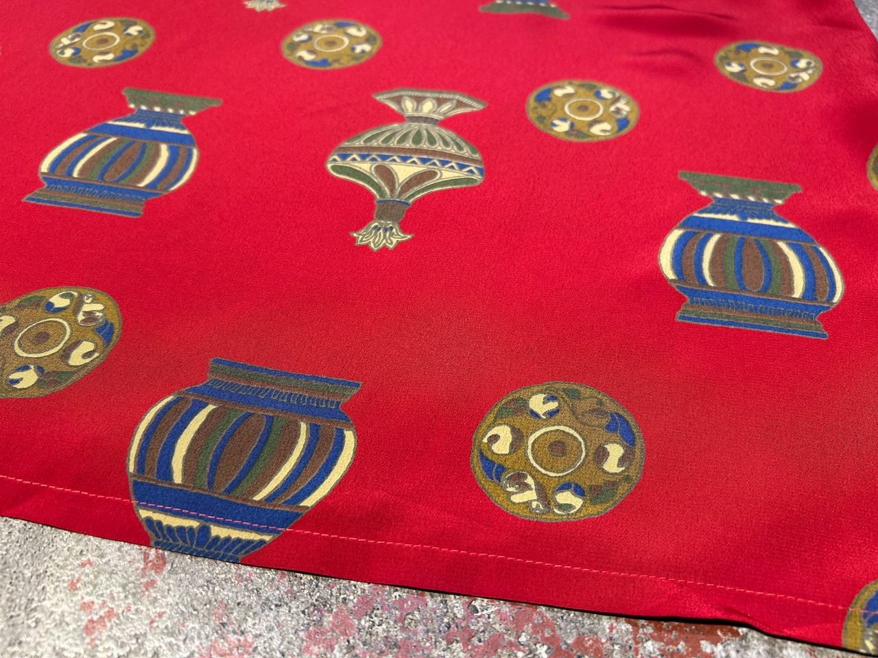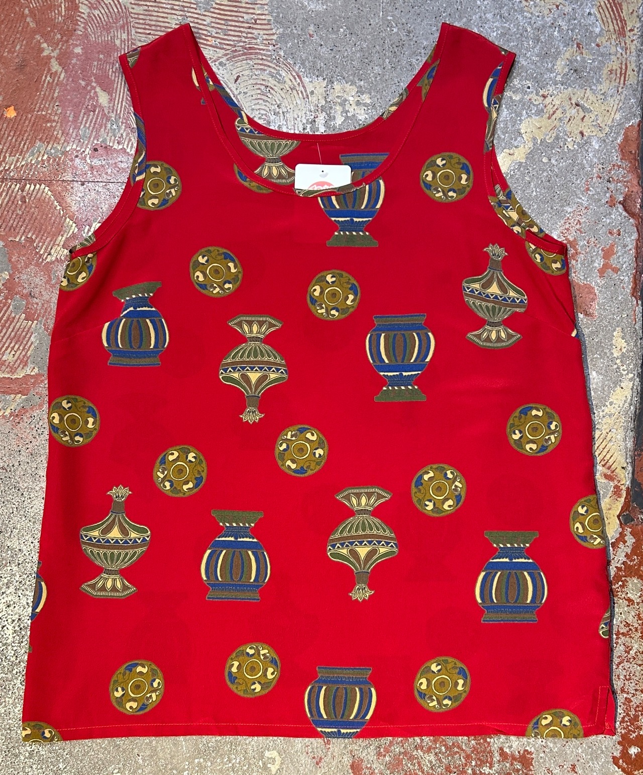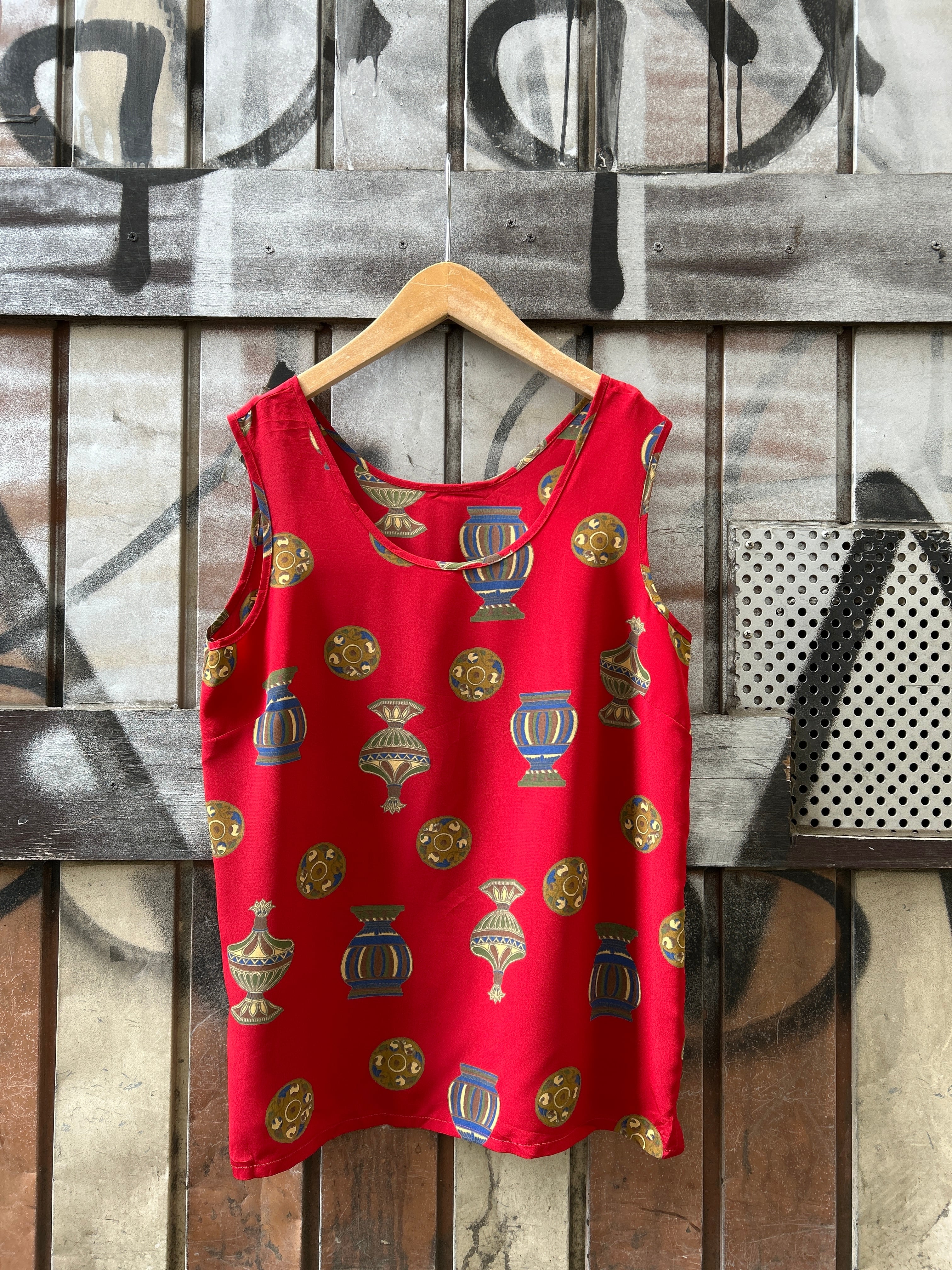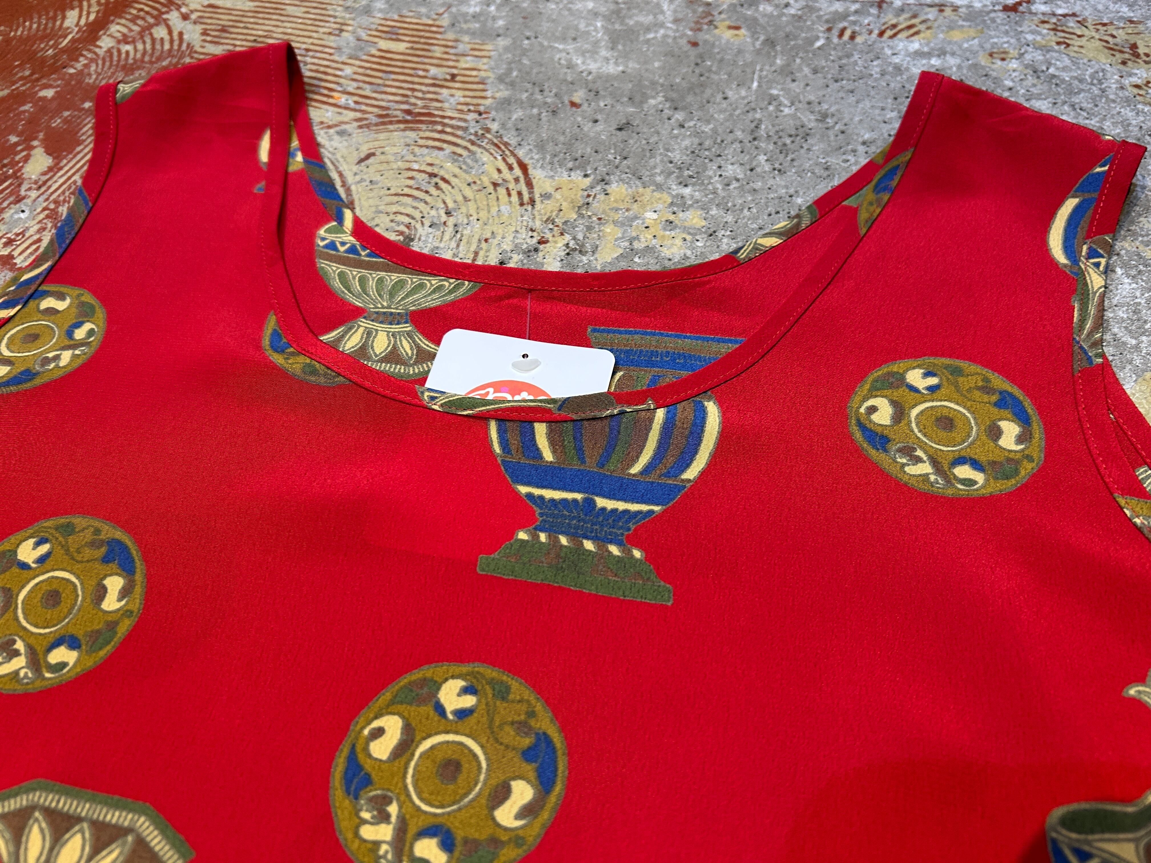 赤のボディに壺や陶器のパターンが珍しい雰囲気のトップス。