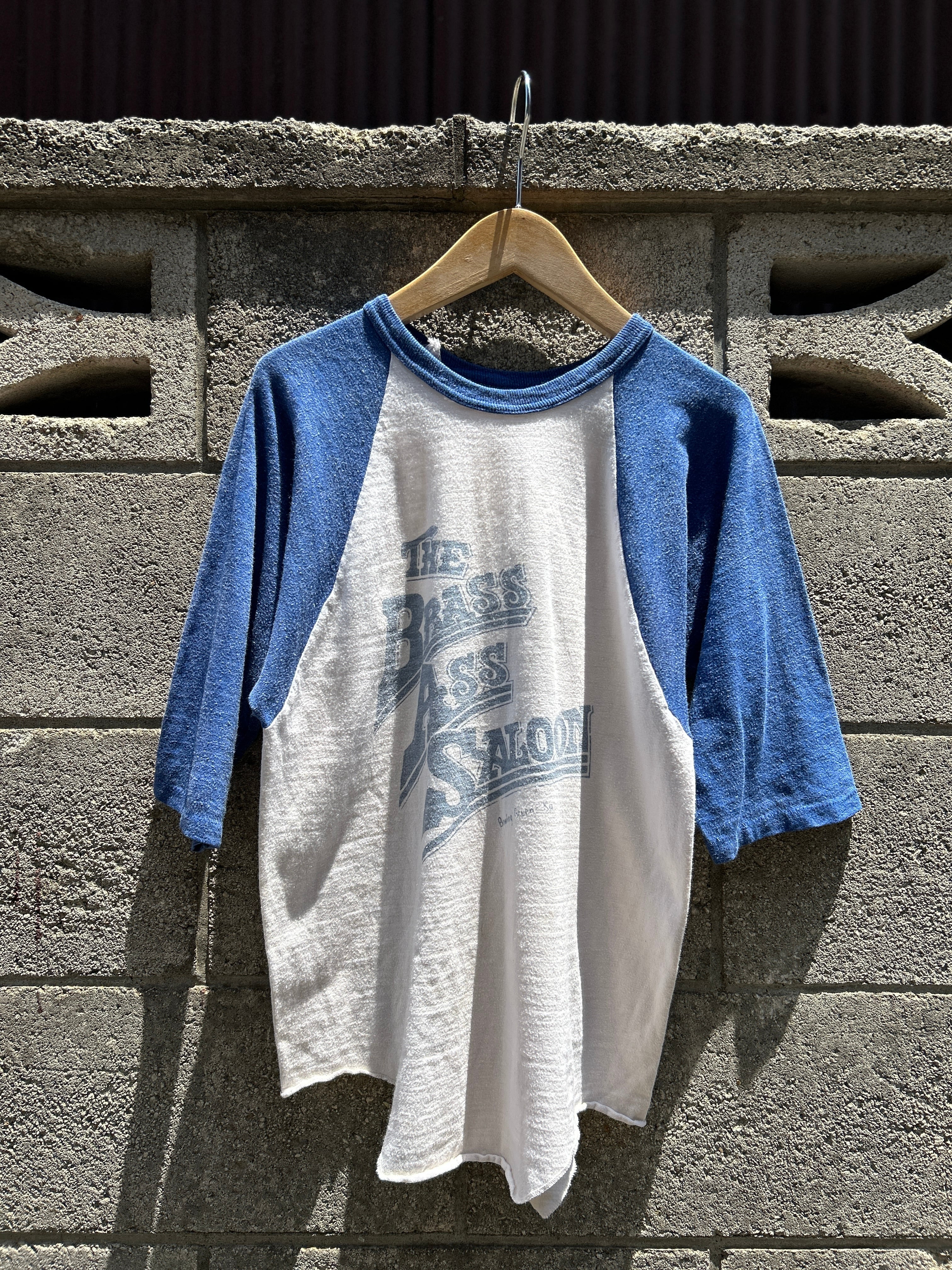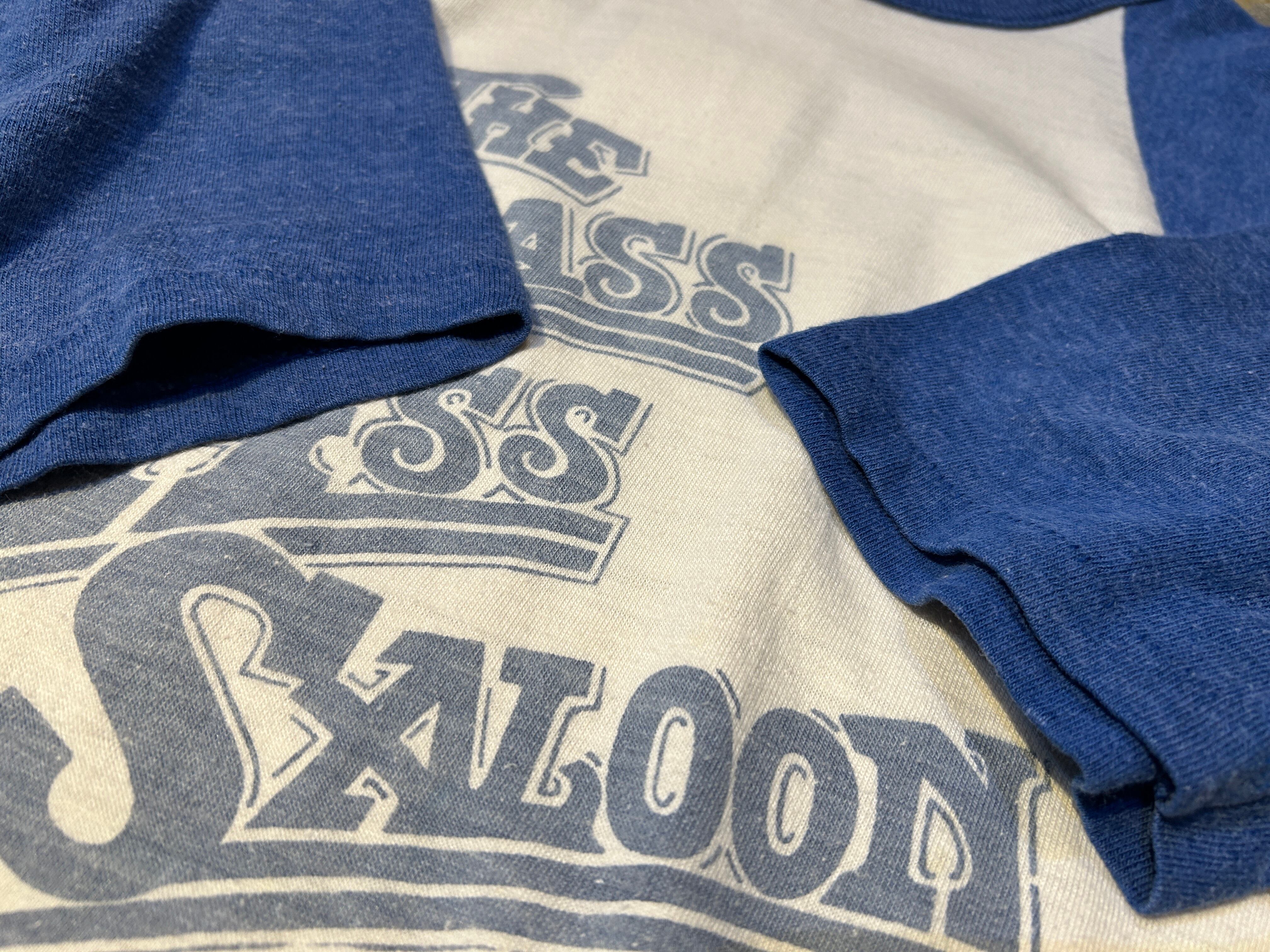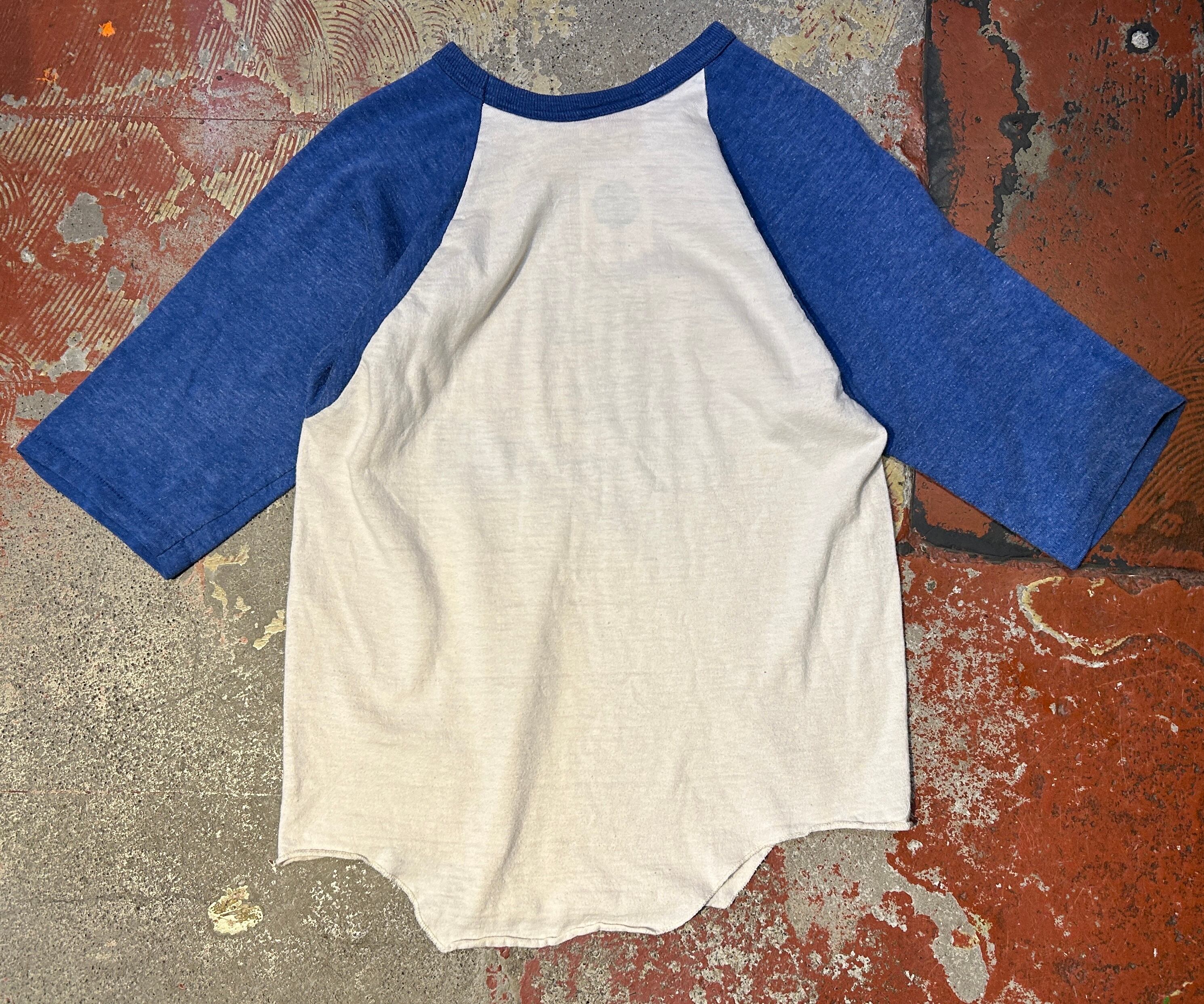 白と青のラグランボディ、フロントの染み込みプリントが雰囲気抜群のアイテム。
