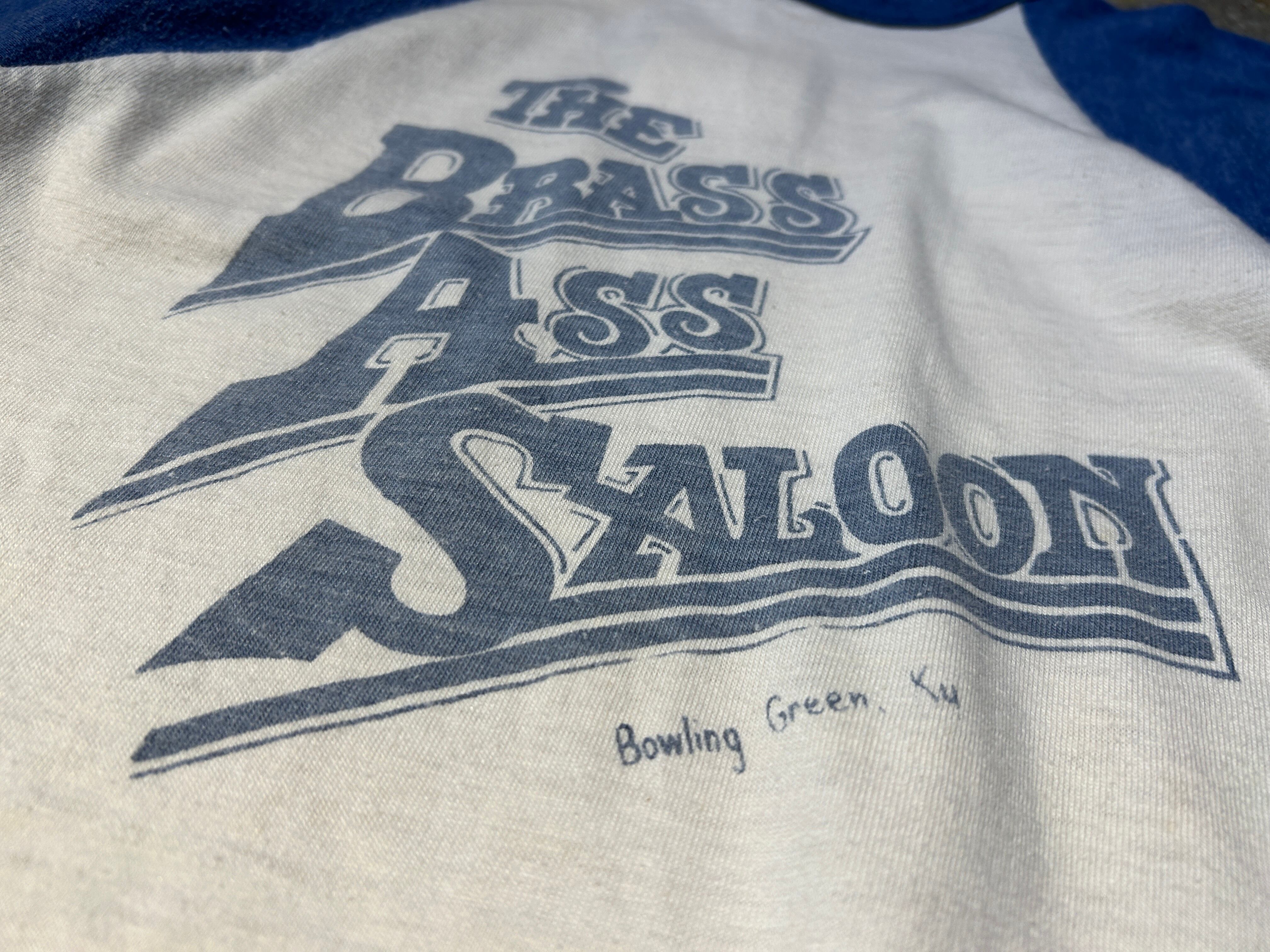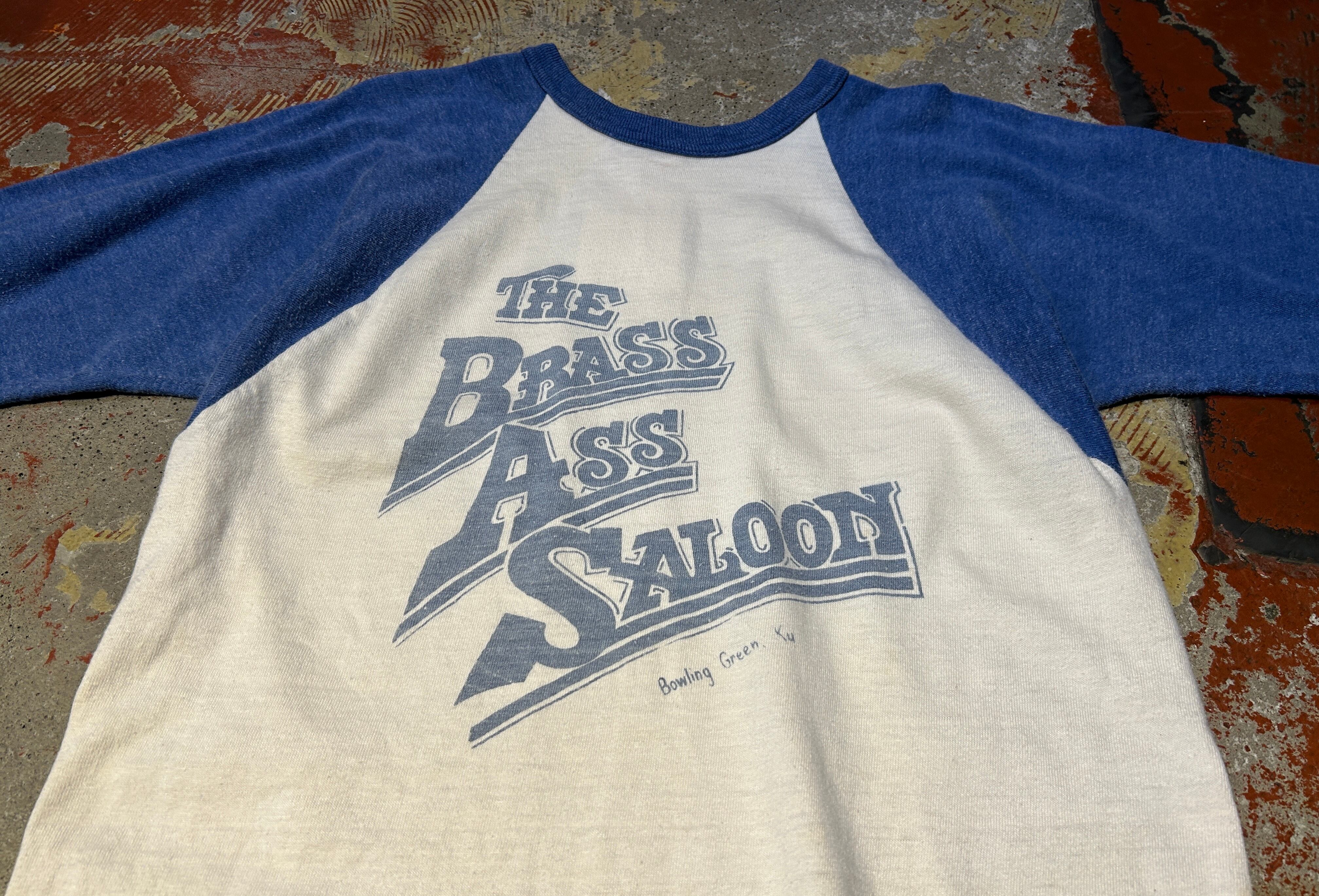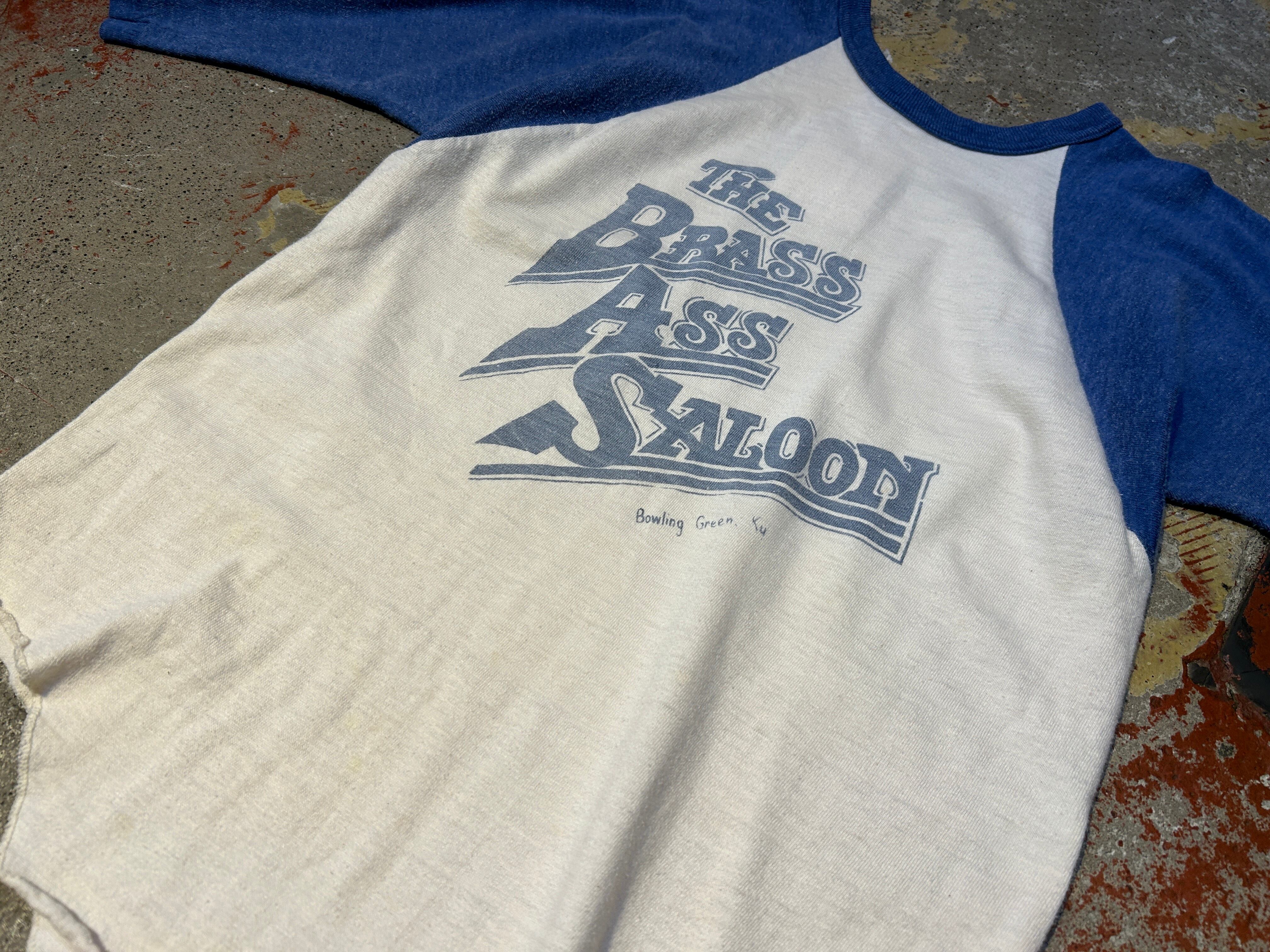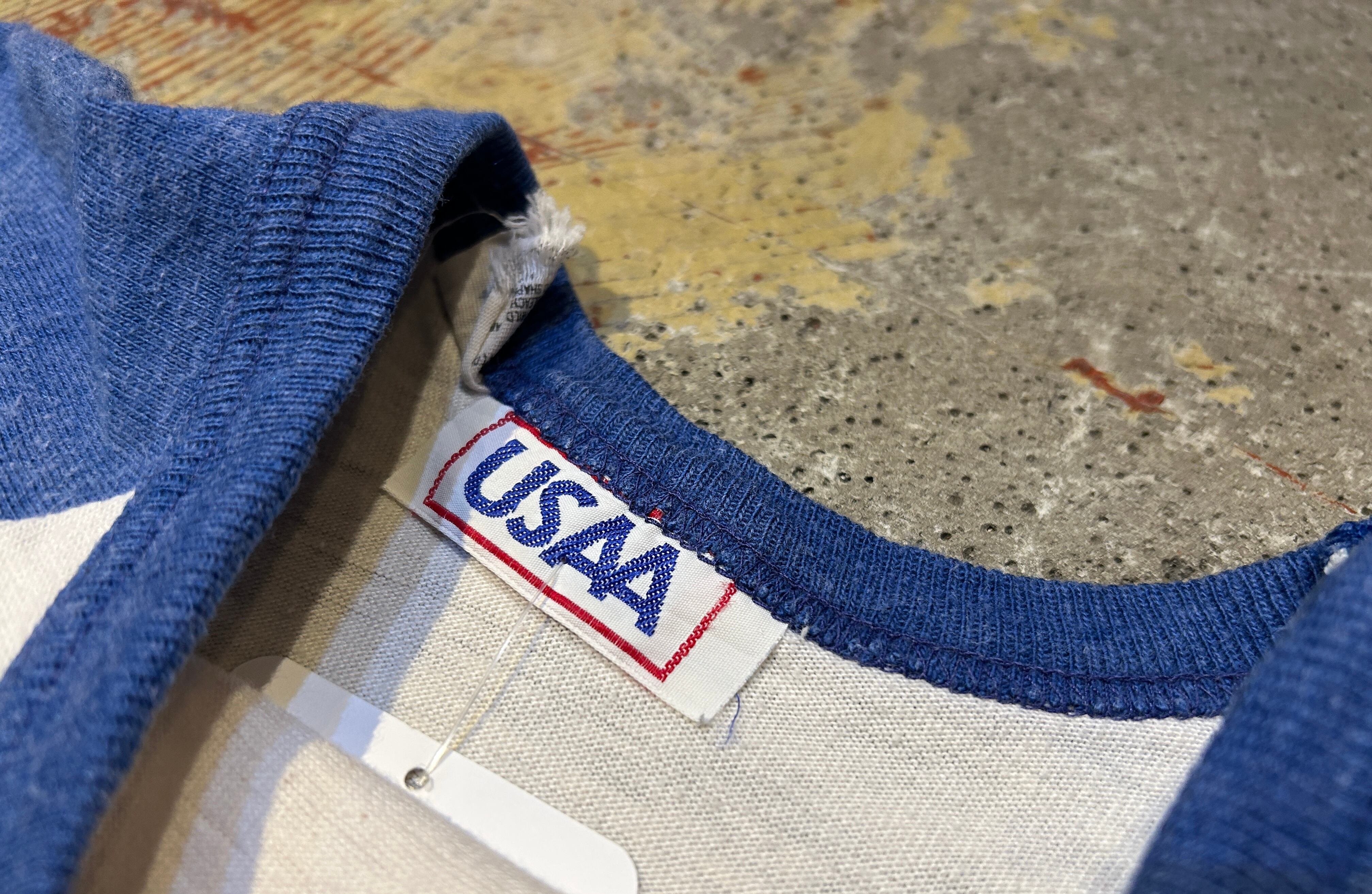 白と青のラグランボディ、フロントの染み込みプリントが雰囲気抜群のアイテム。