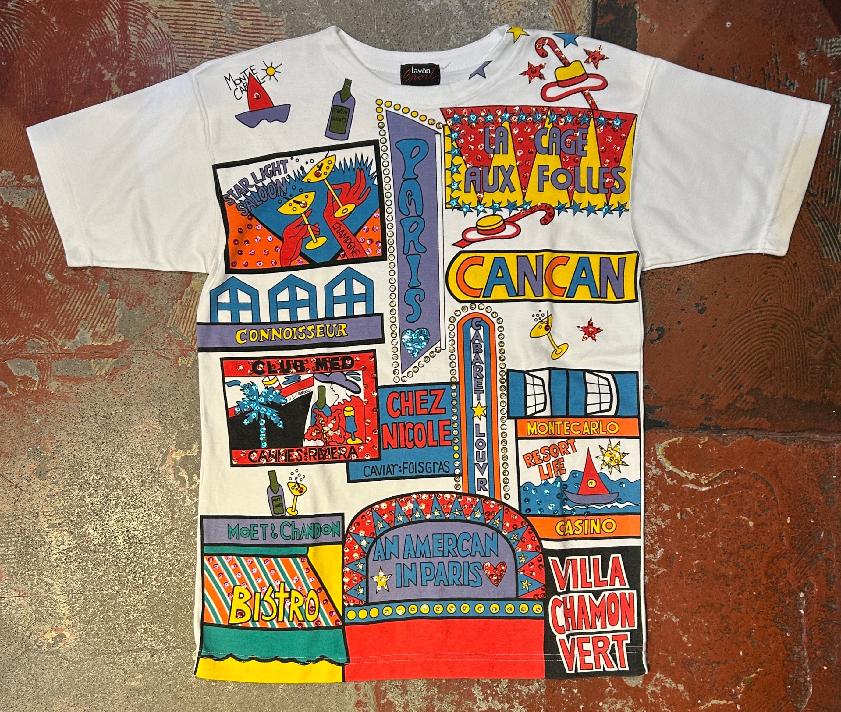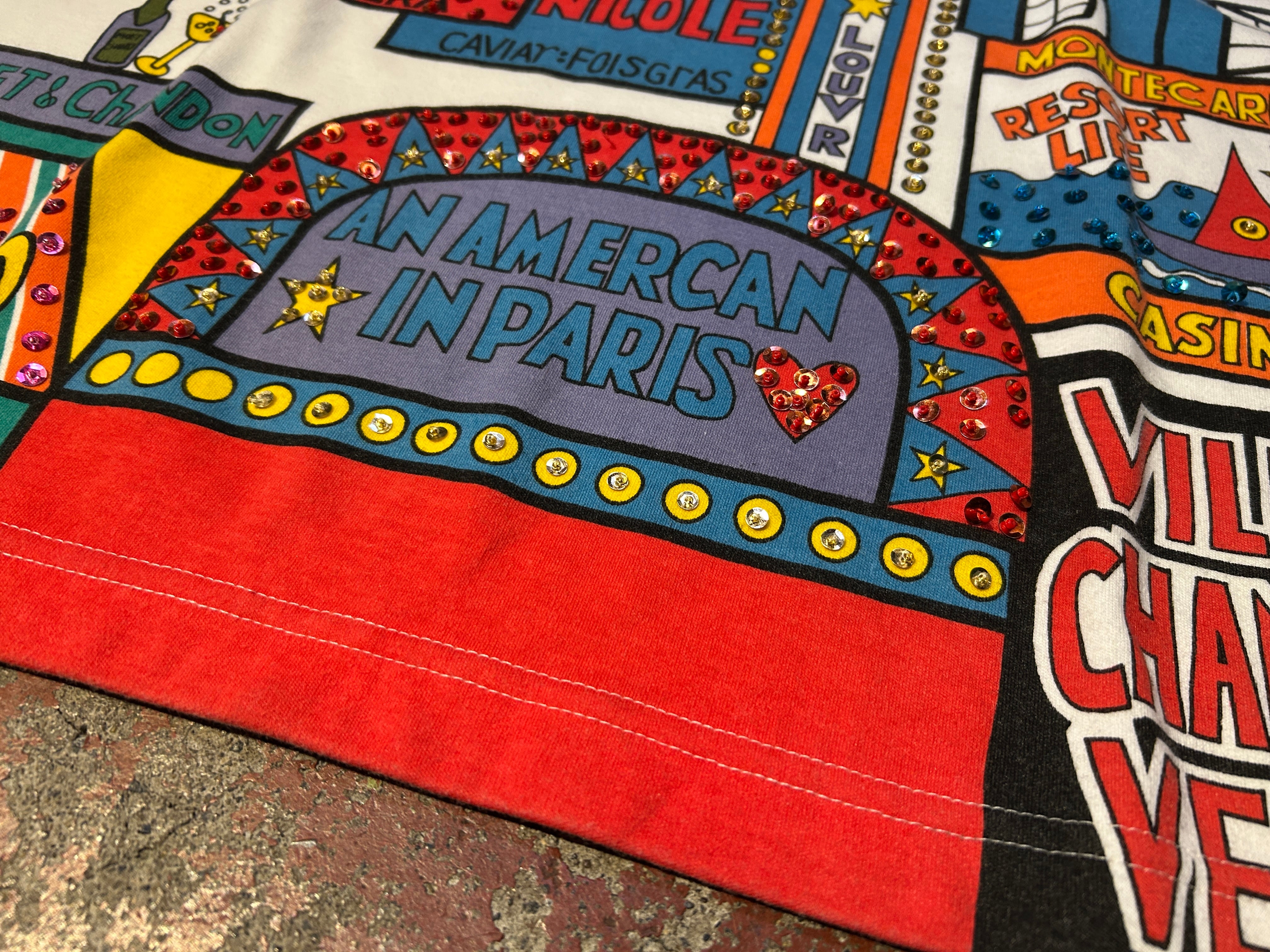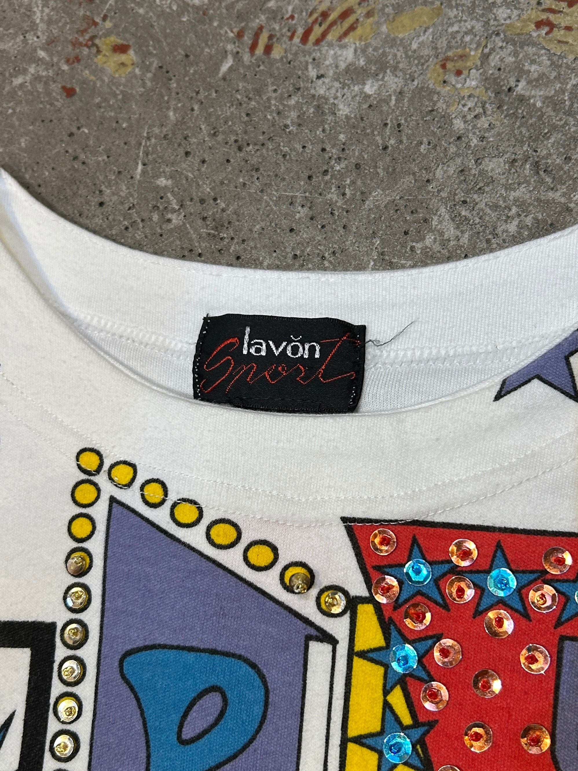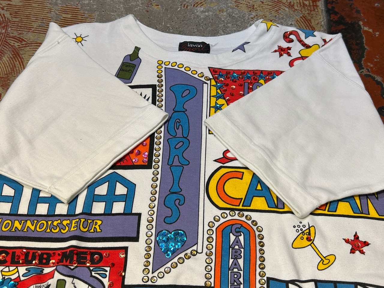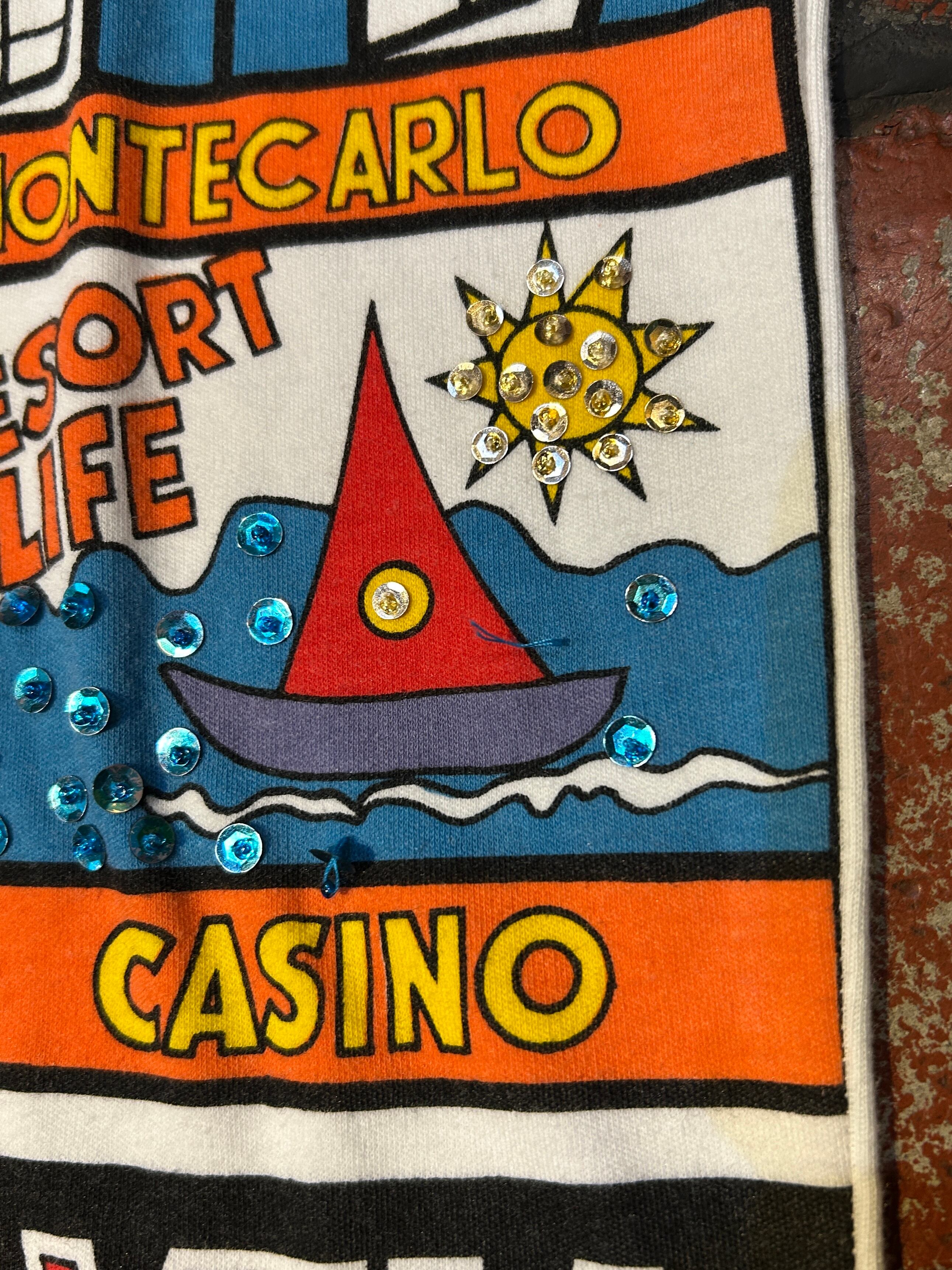 カラフルなナイトクラブのプリントに、沢山のスパンコールとビーズが施された煌びやかなアイテム。
