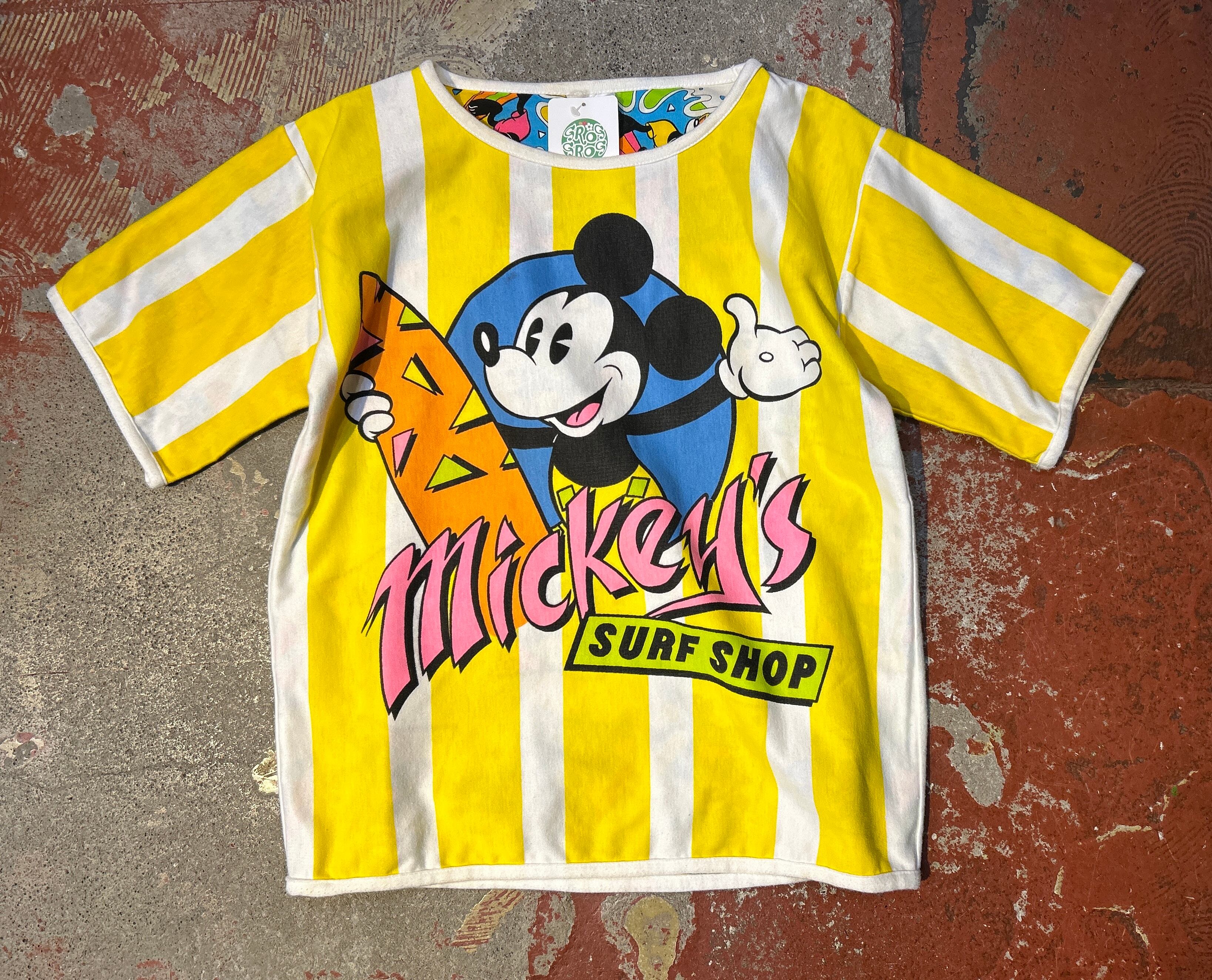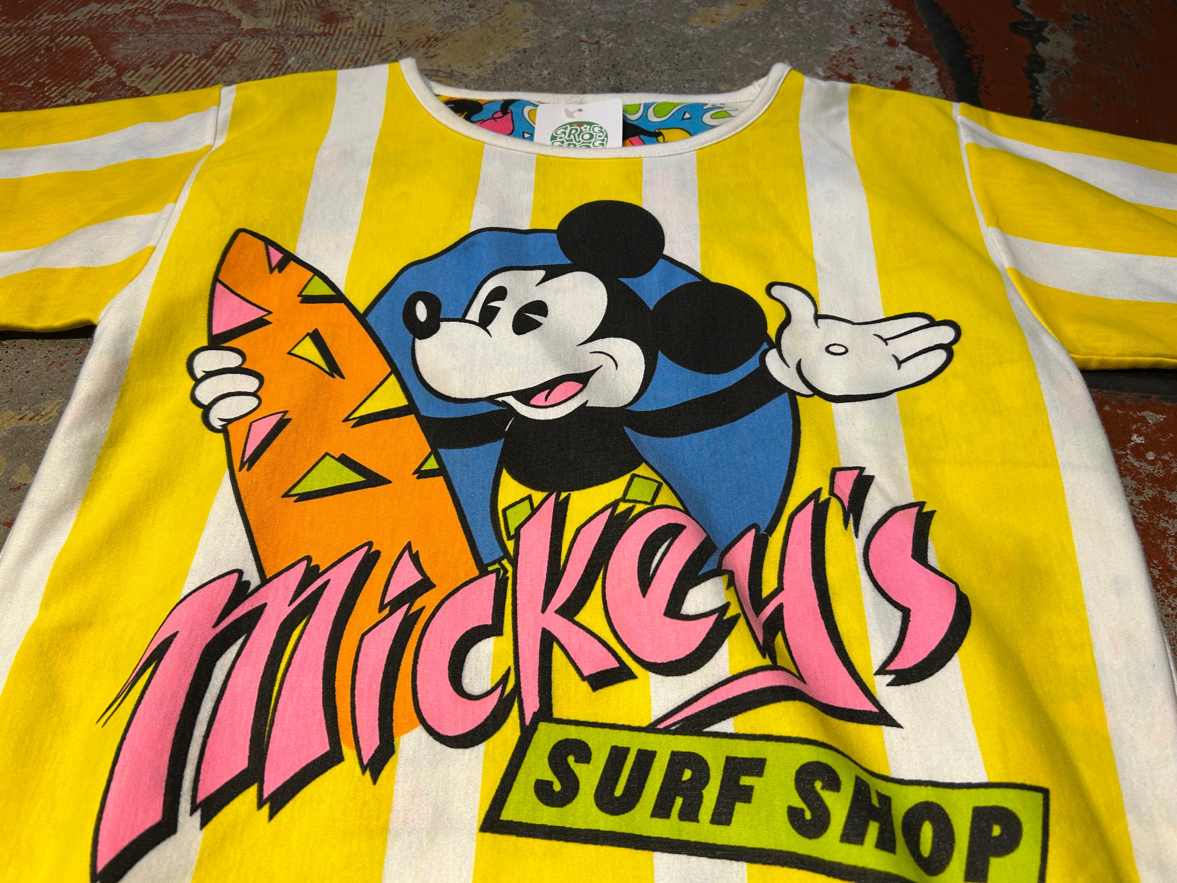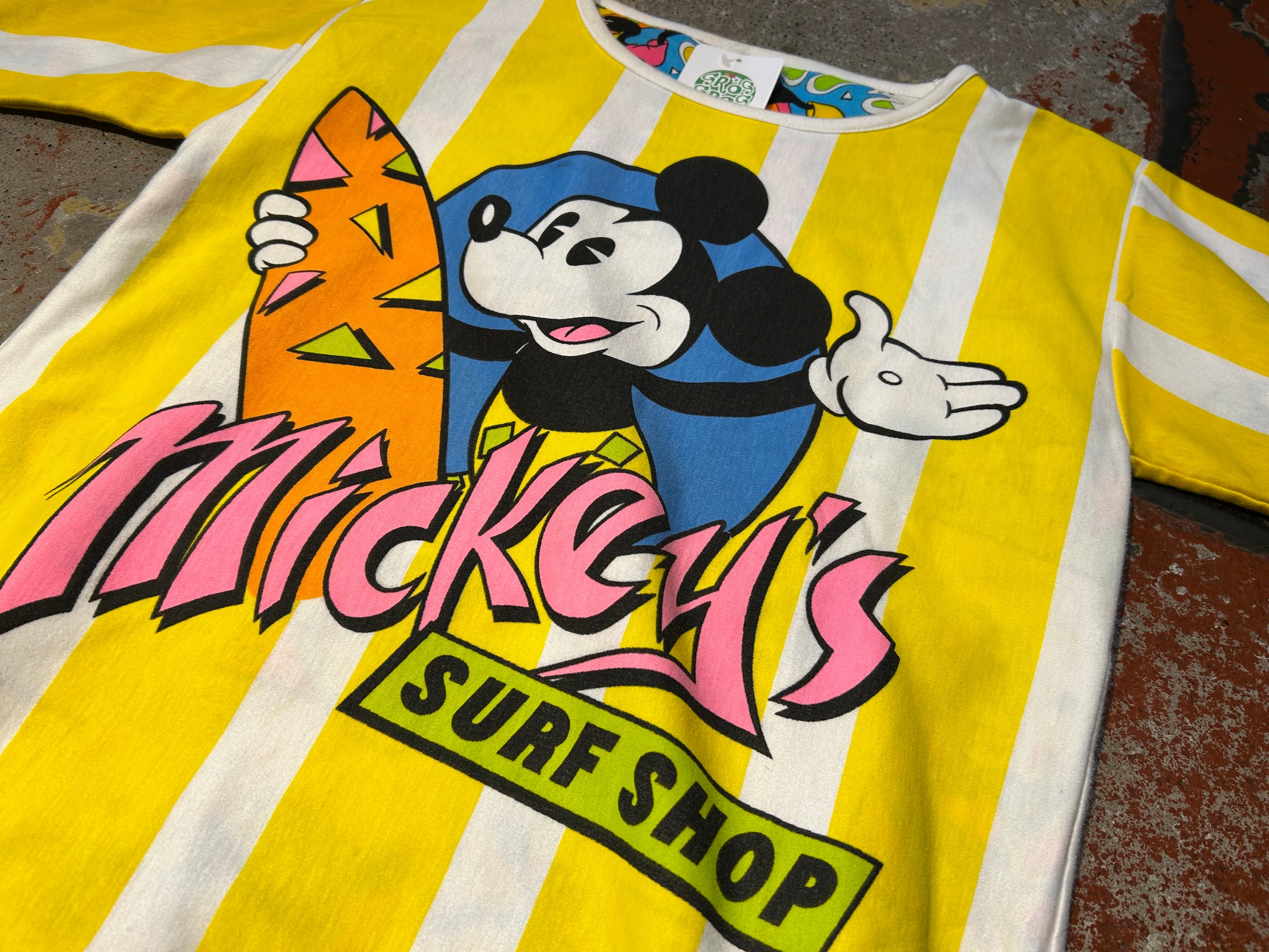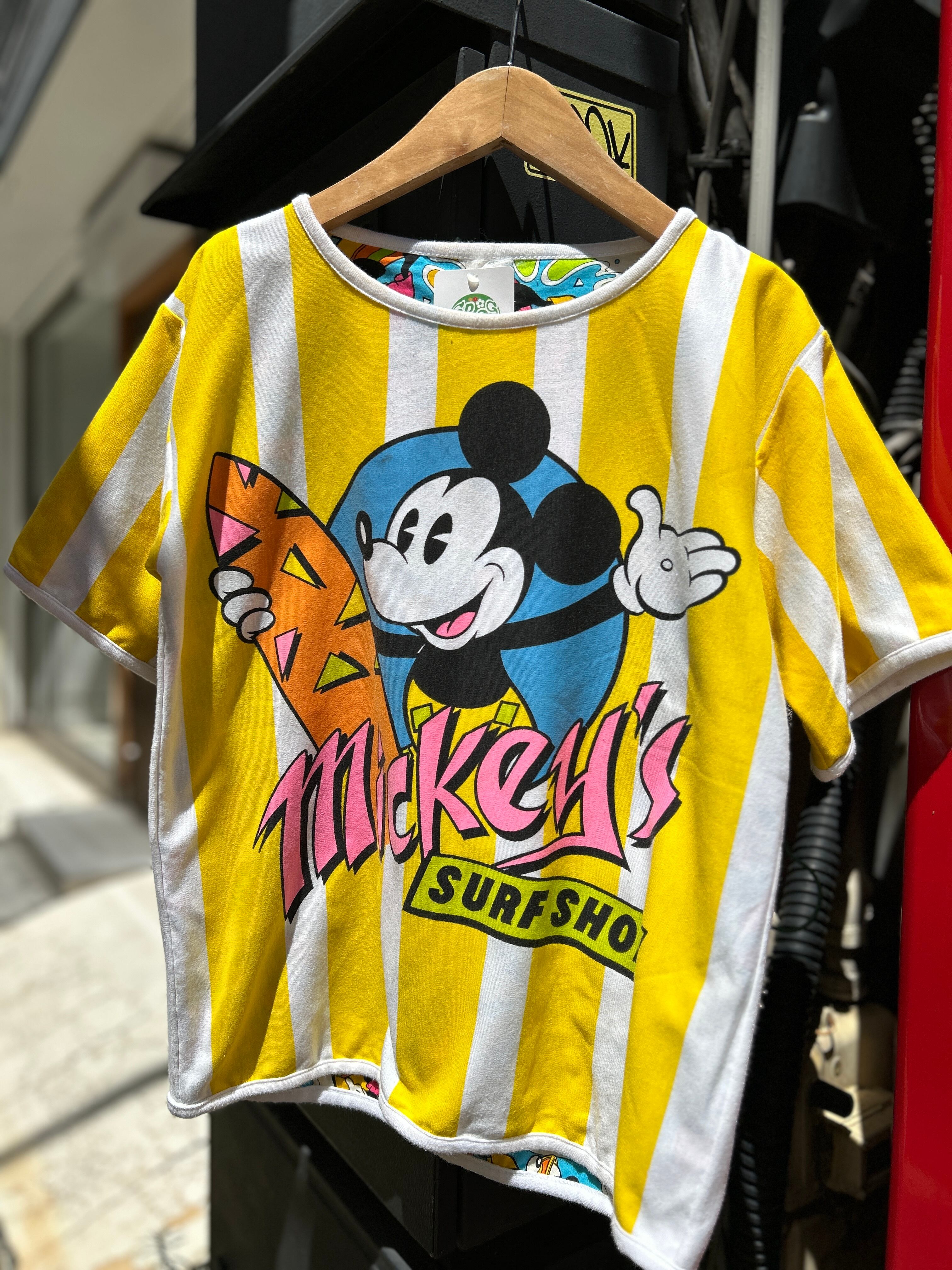 黄色と白の太めピッチのパイカットミッキー面と、サーフィンをしているミッキー面の両面アイテム。