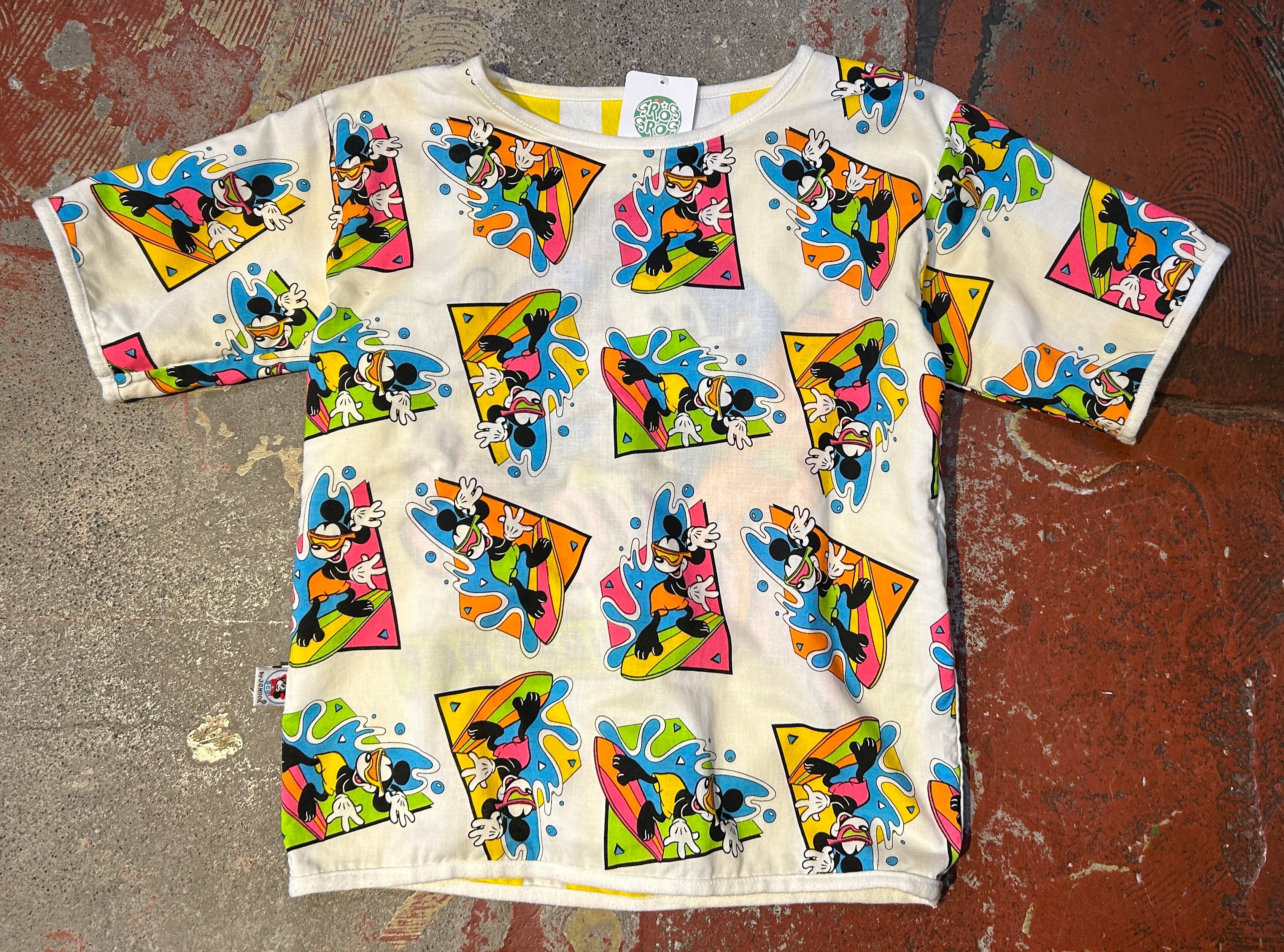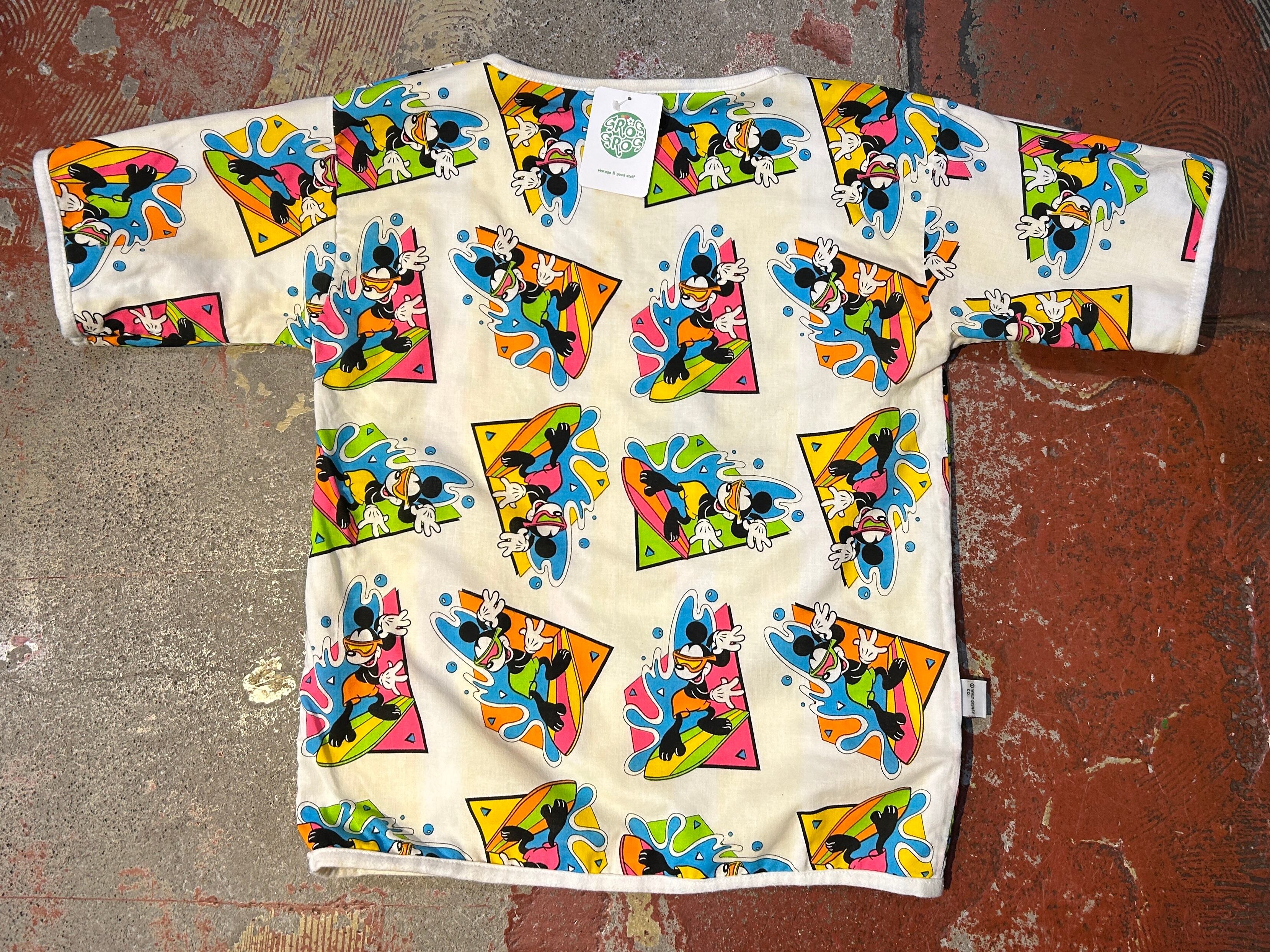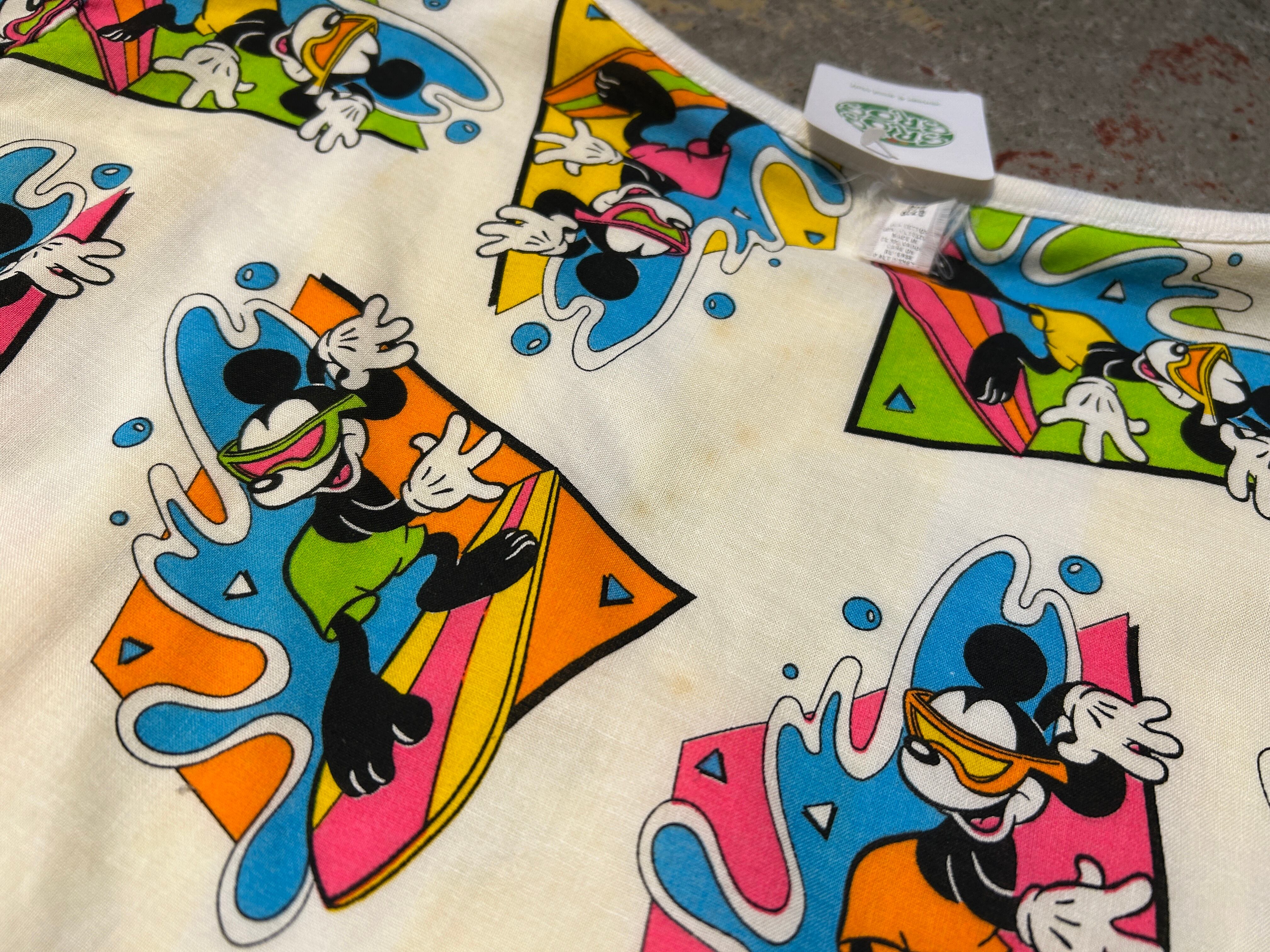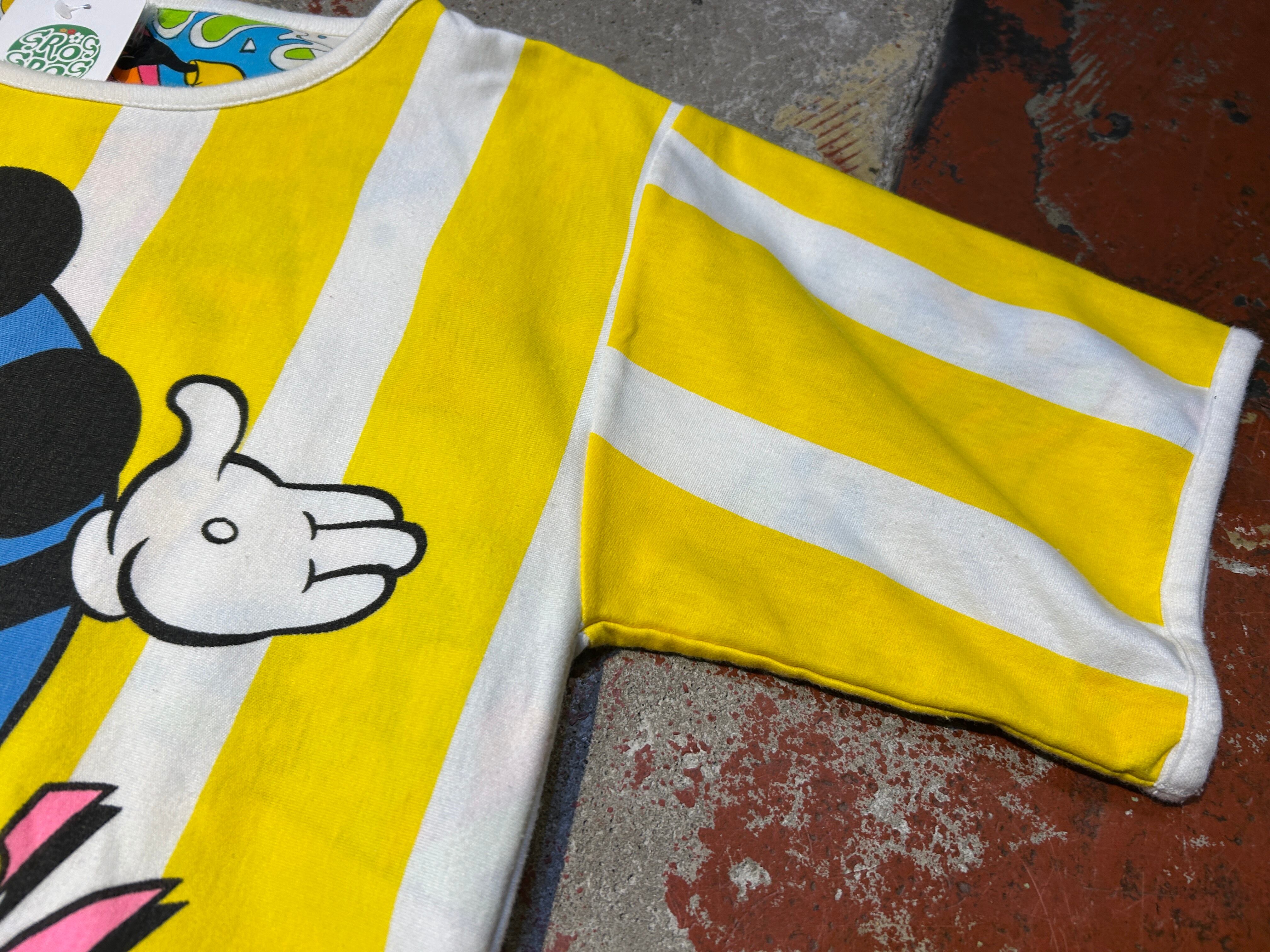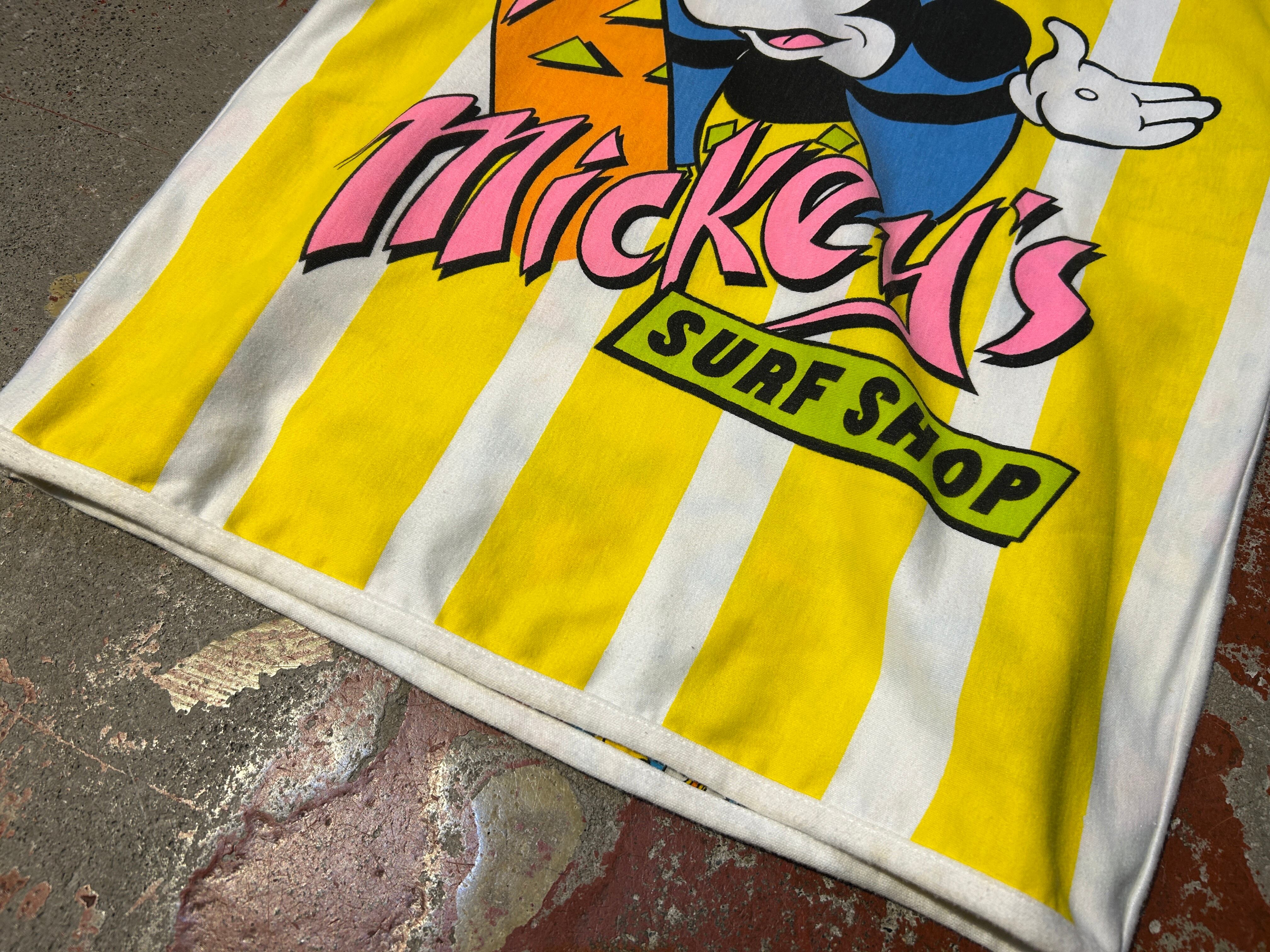黄色と白の太めピッチのパイカットミッキー面と、サーフィンをしているミッキー面の両面アイテム。