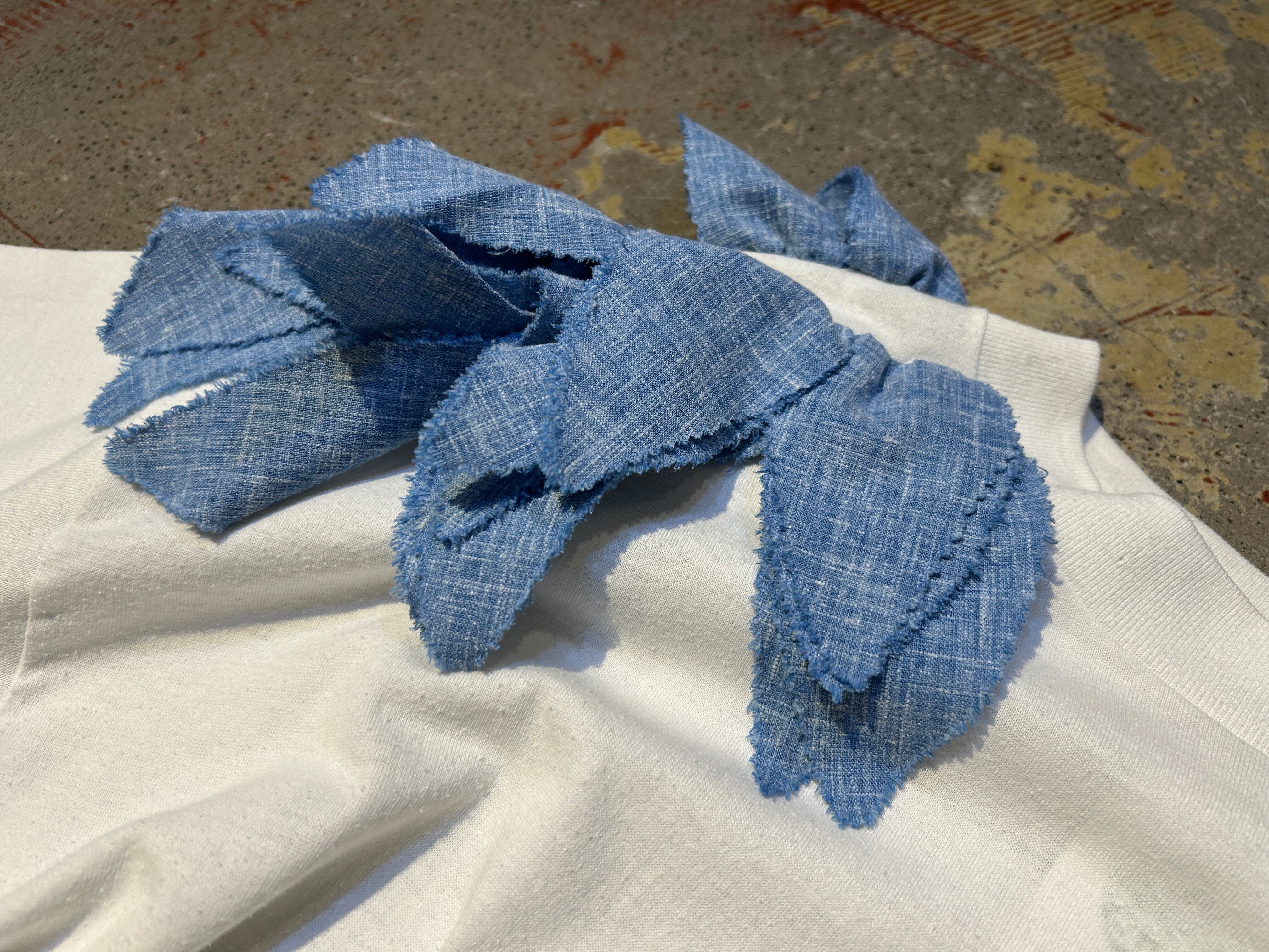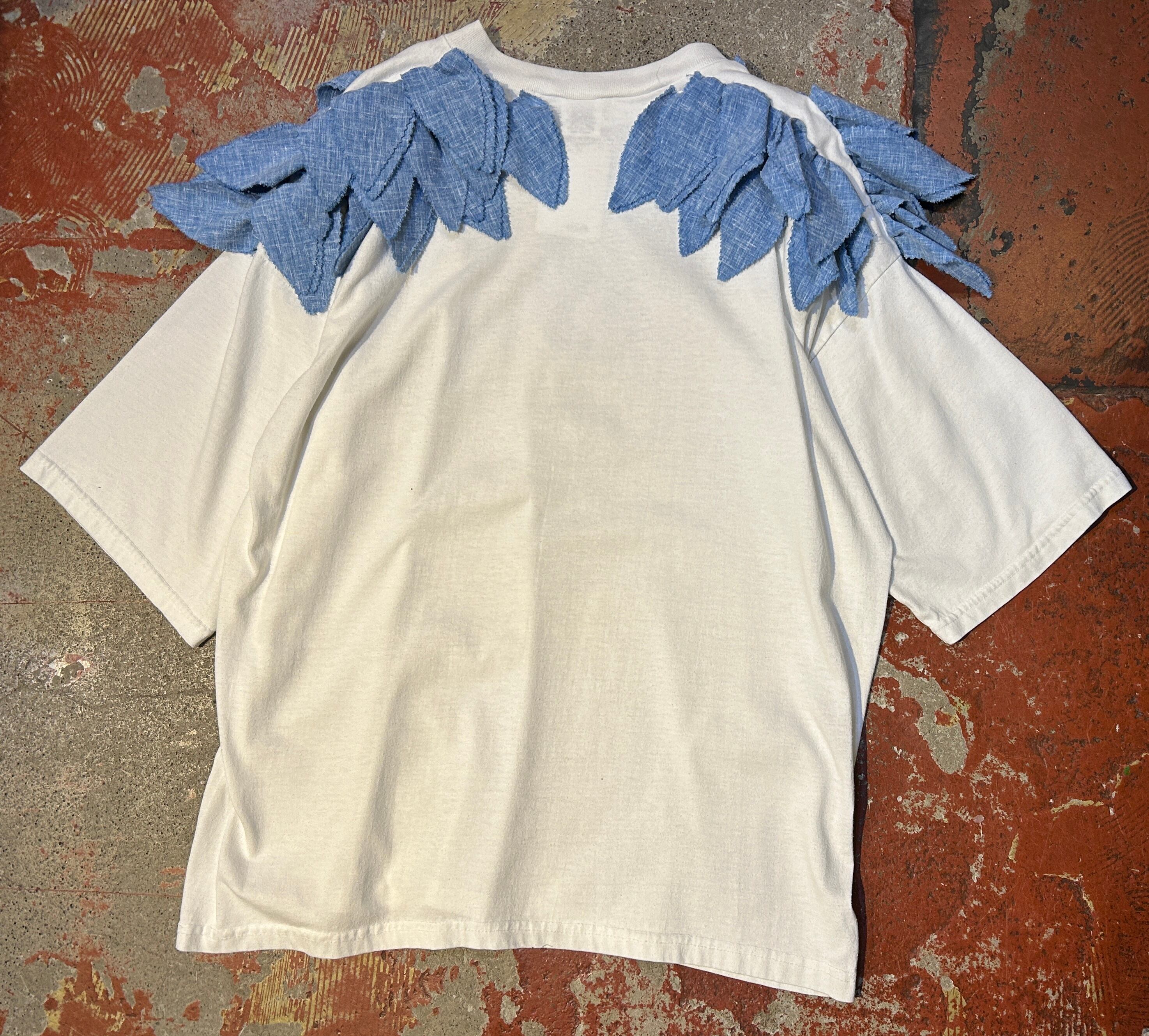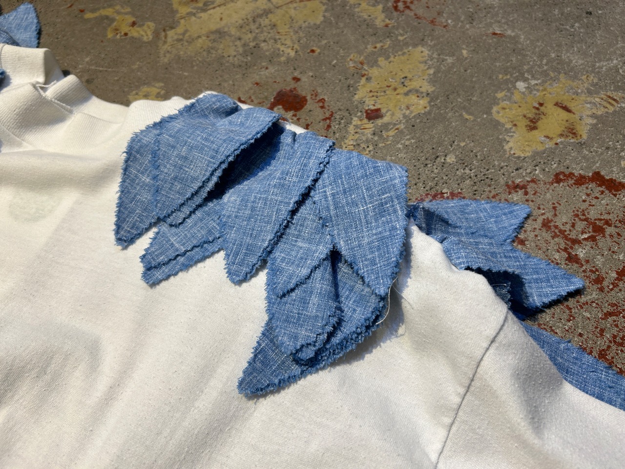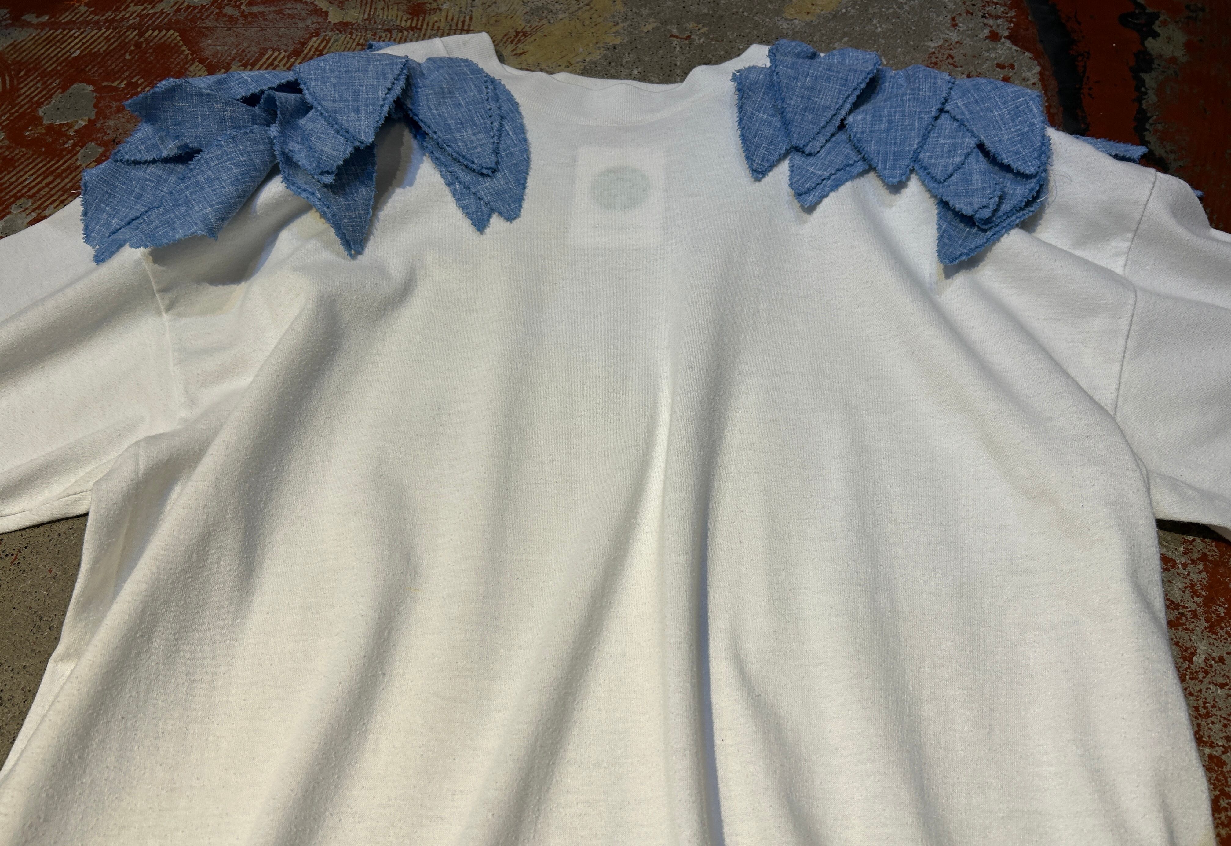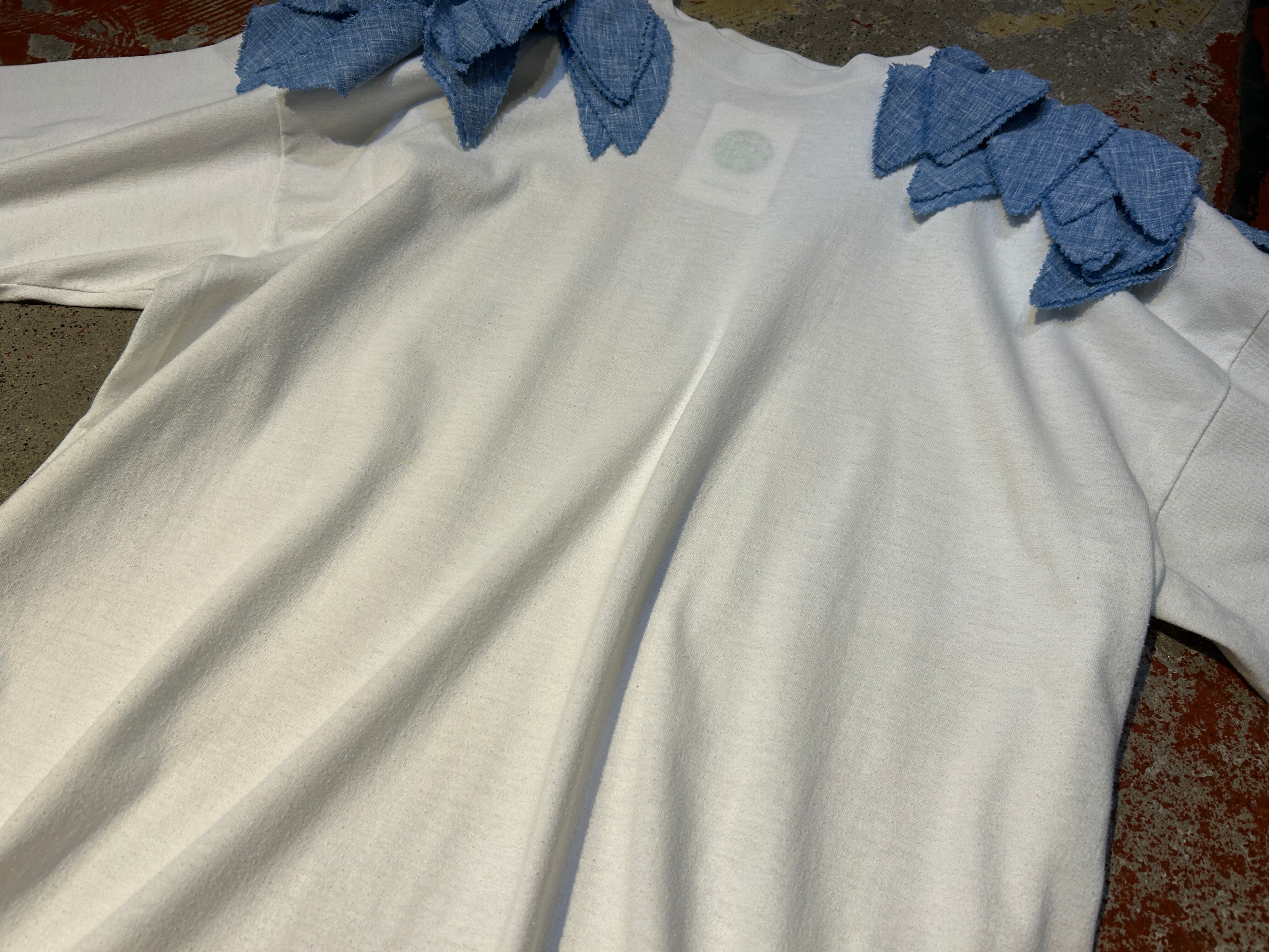 肩にシャンブレーの葉っぱみたいなヒラヒラが施された個性的なアイテム。