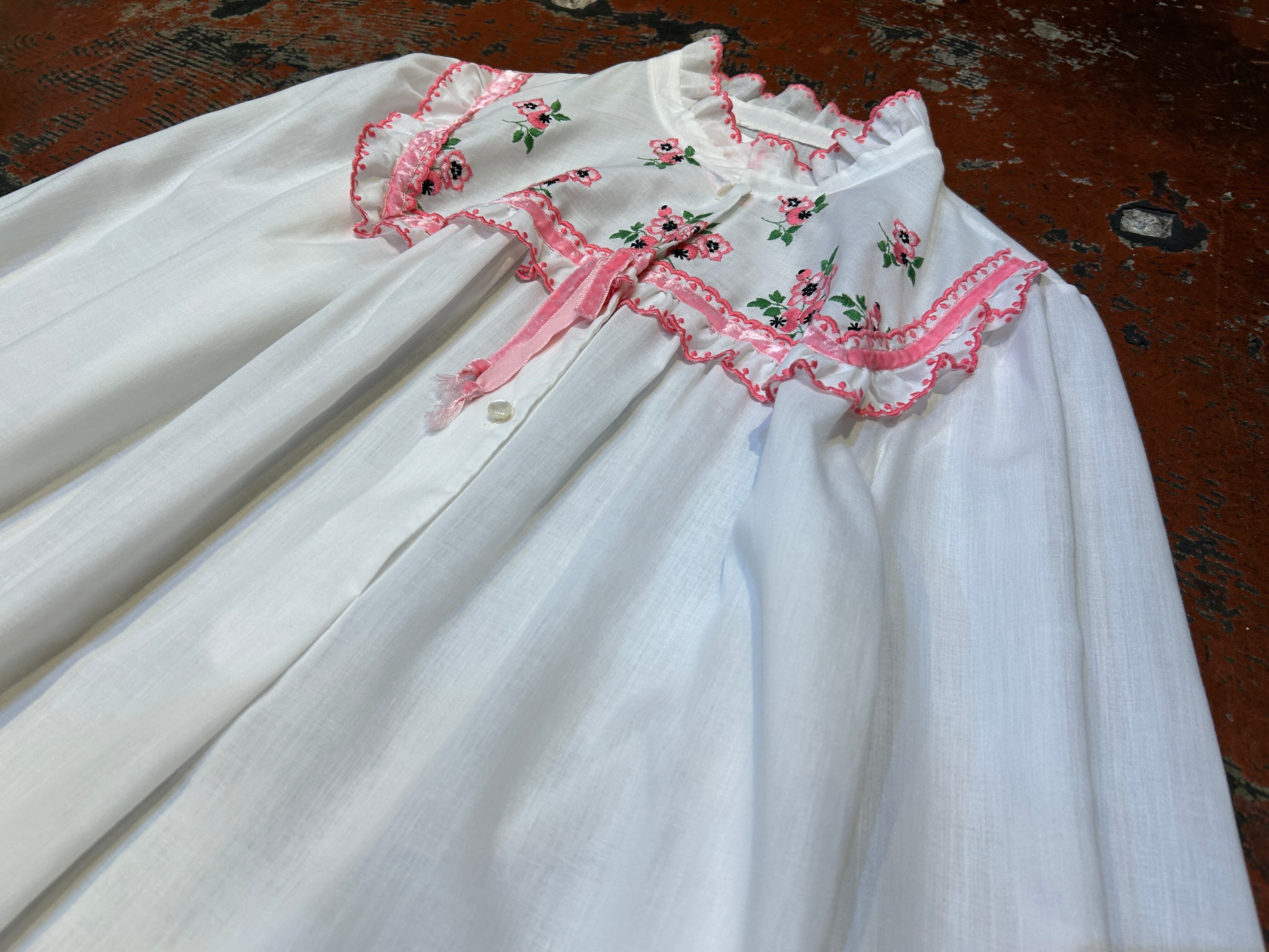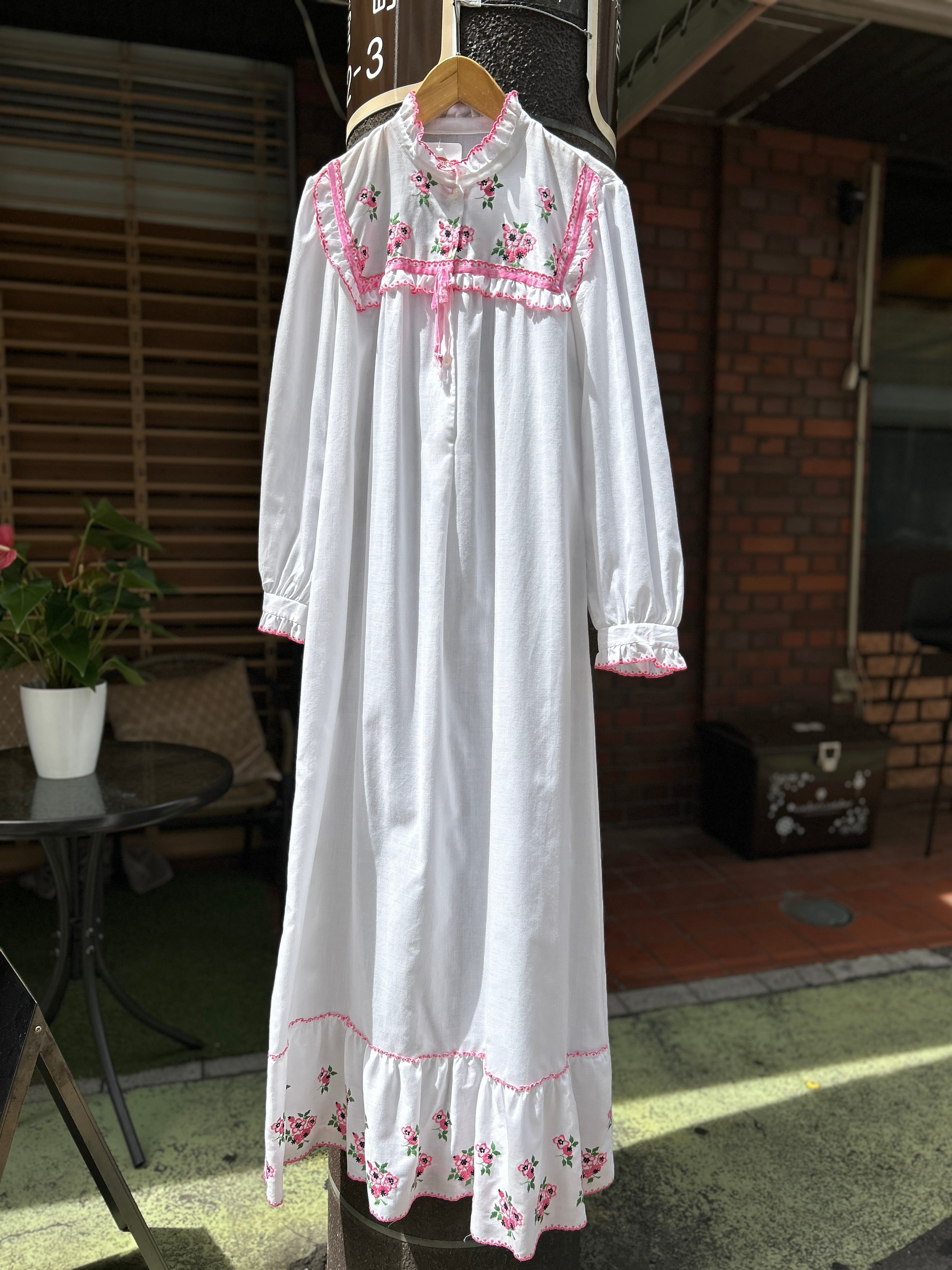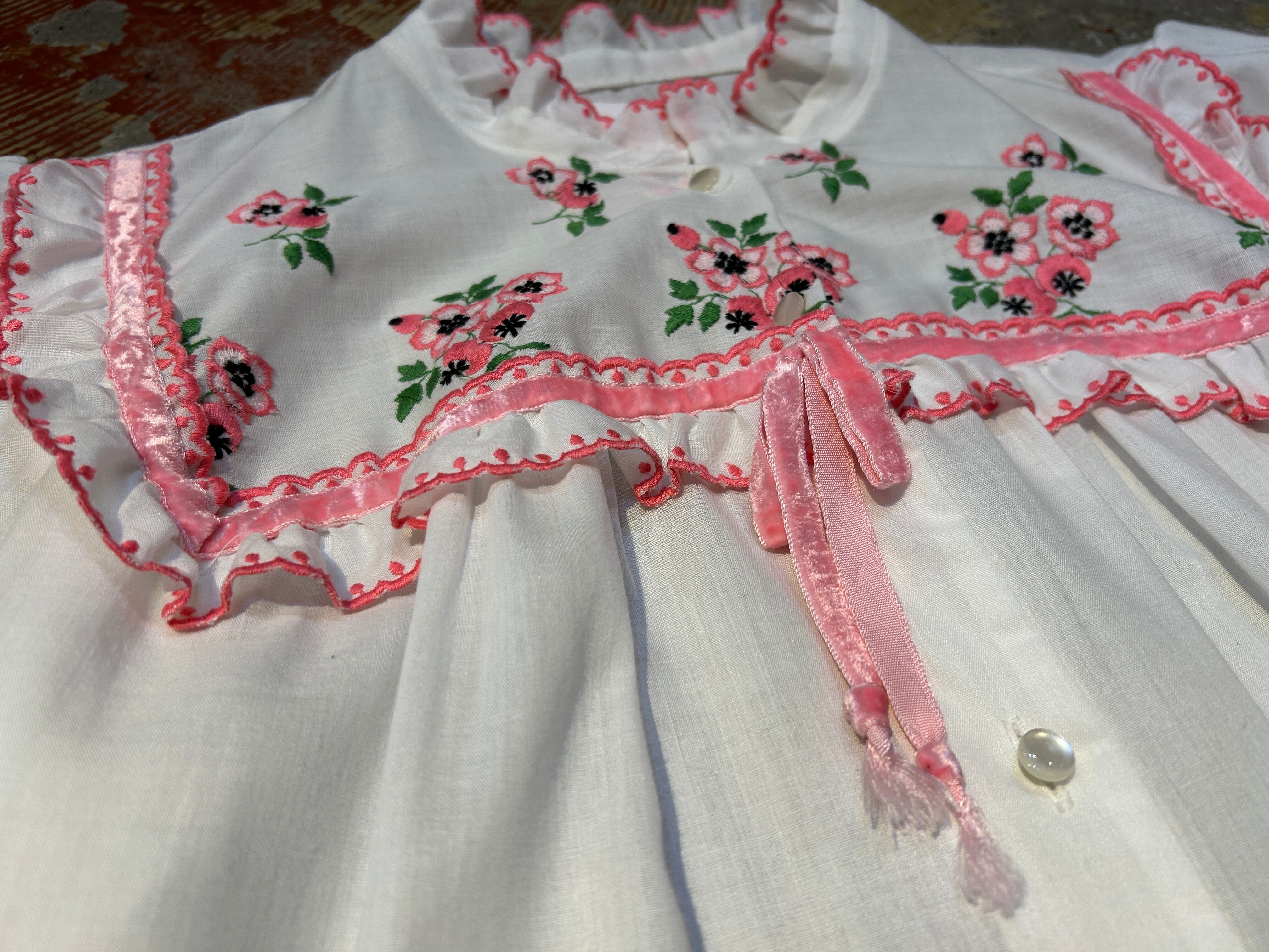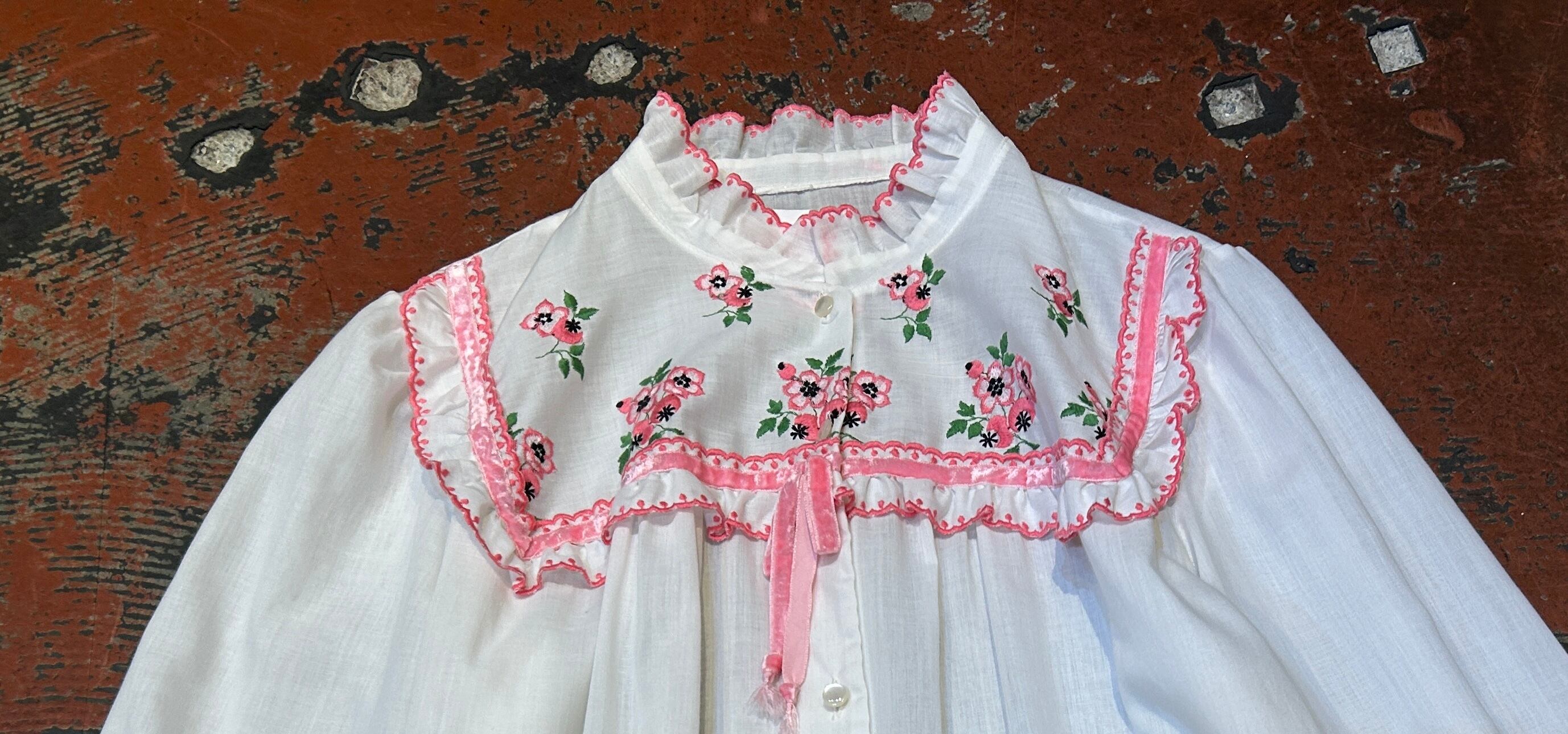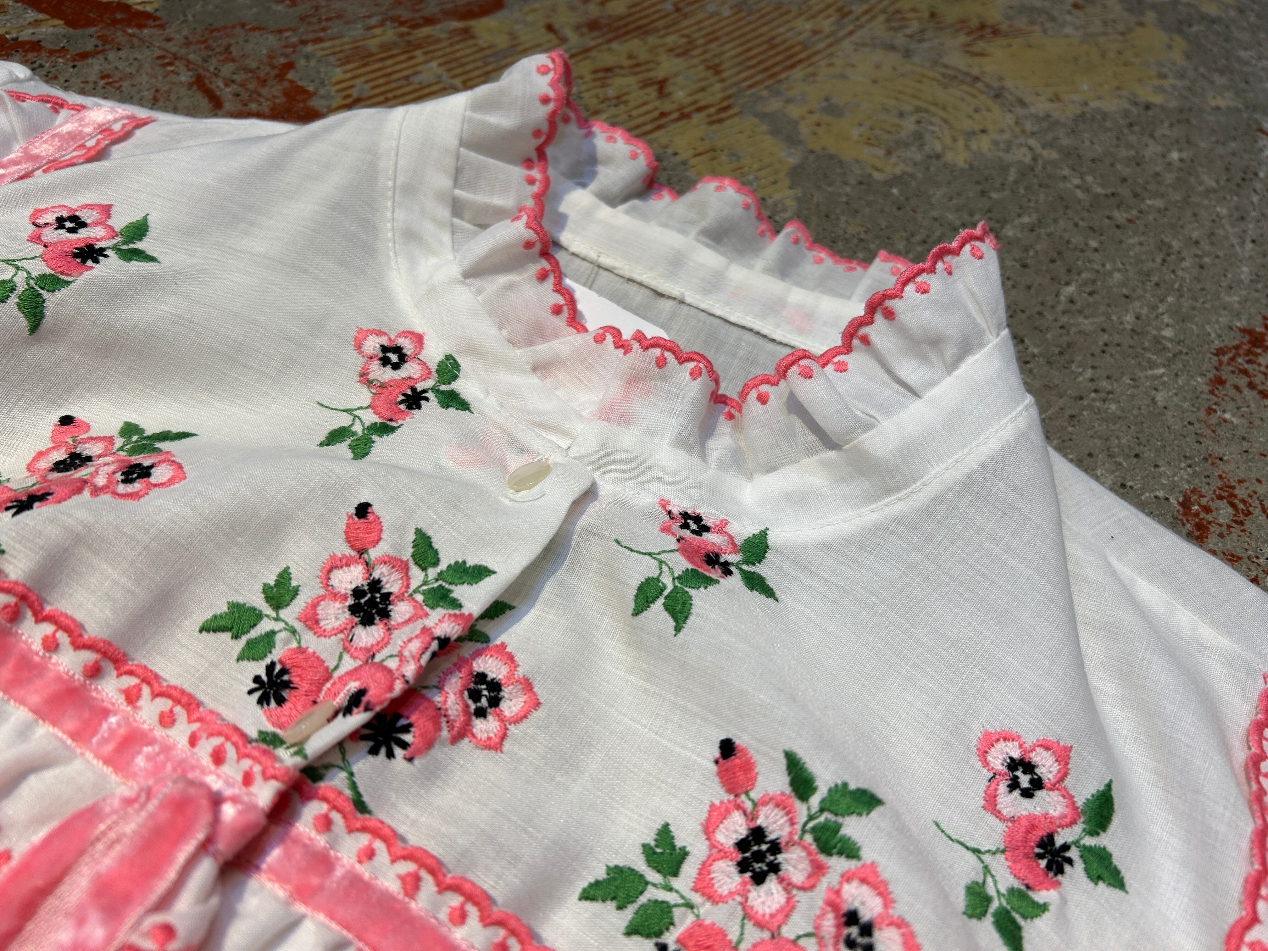 透け感のあるホワイトボディに、ピンクのフラワー刺繍とフリル、ベロアのリボンが可愛らしいアイテム。