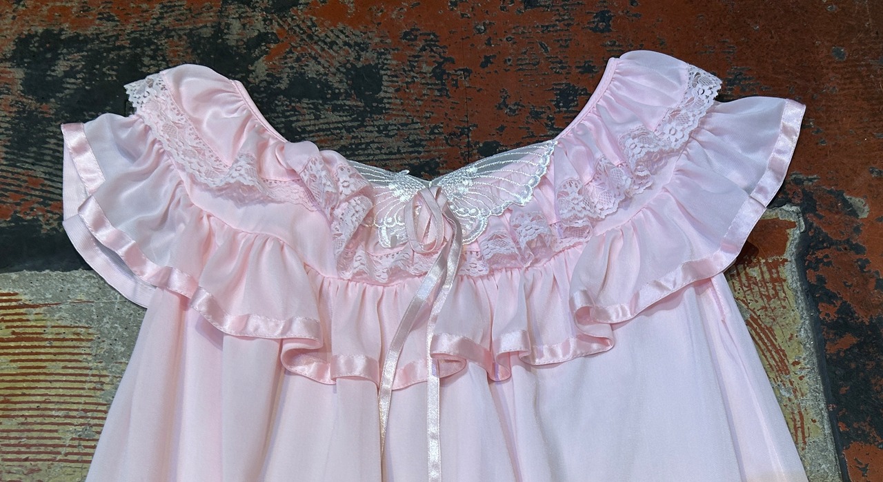 二重の立体感のある作り、フロントには蝶々のレースモチーフがアクセントのアイテム。