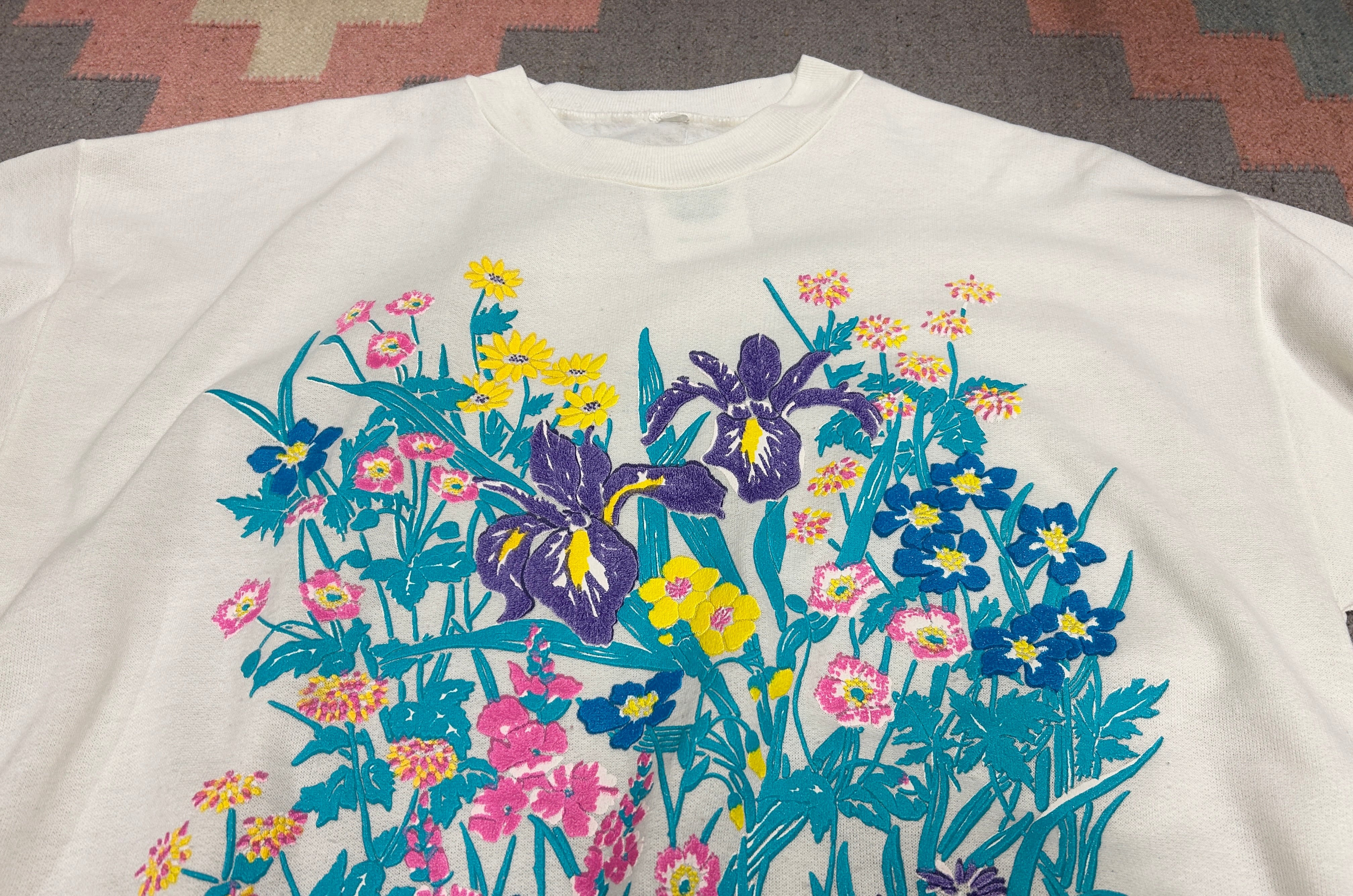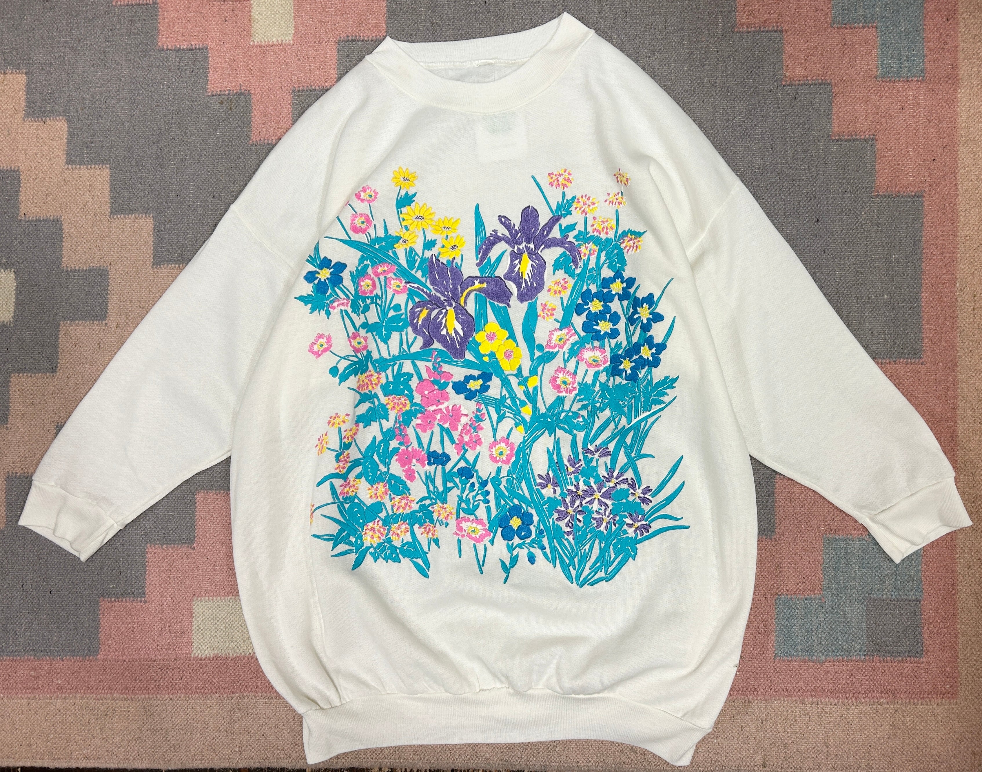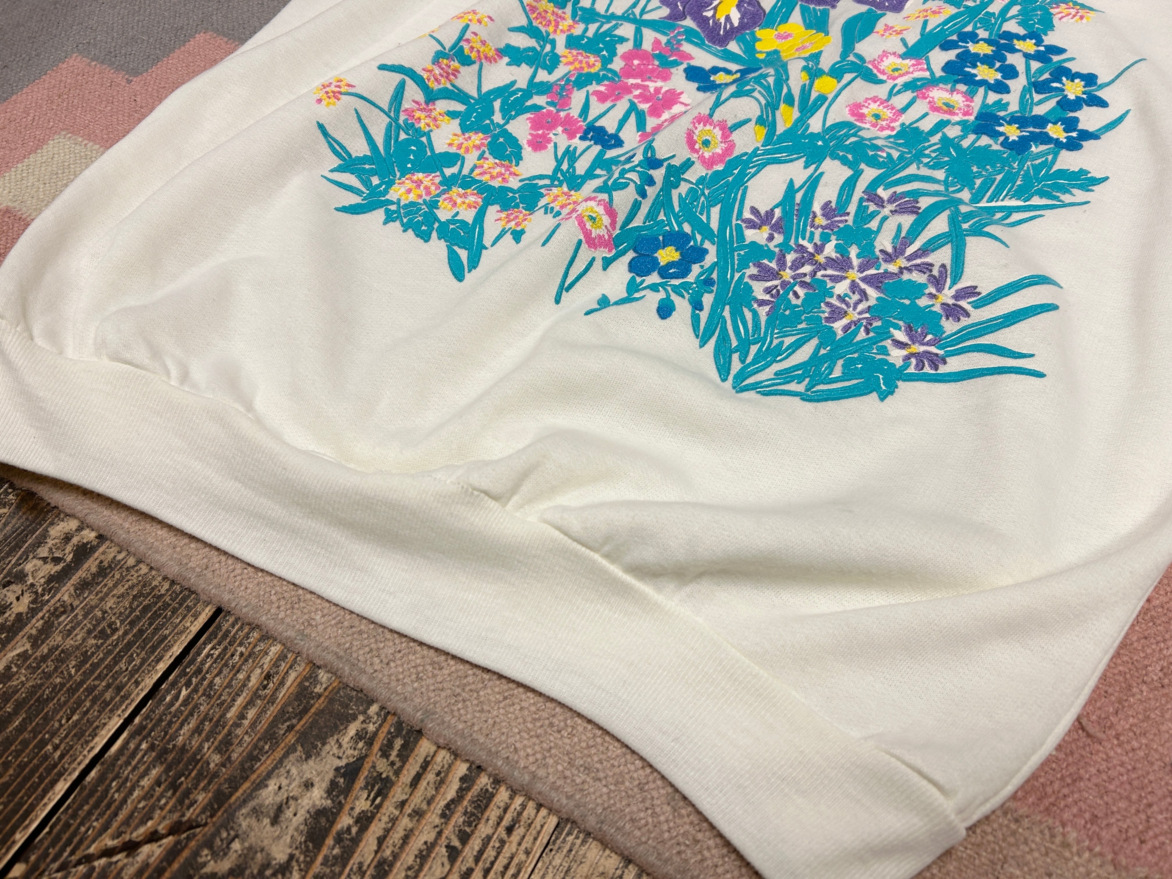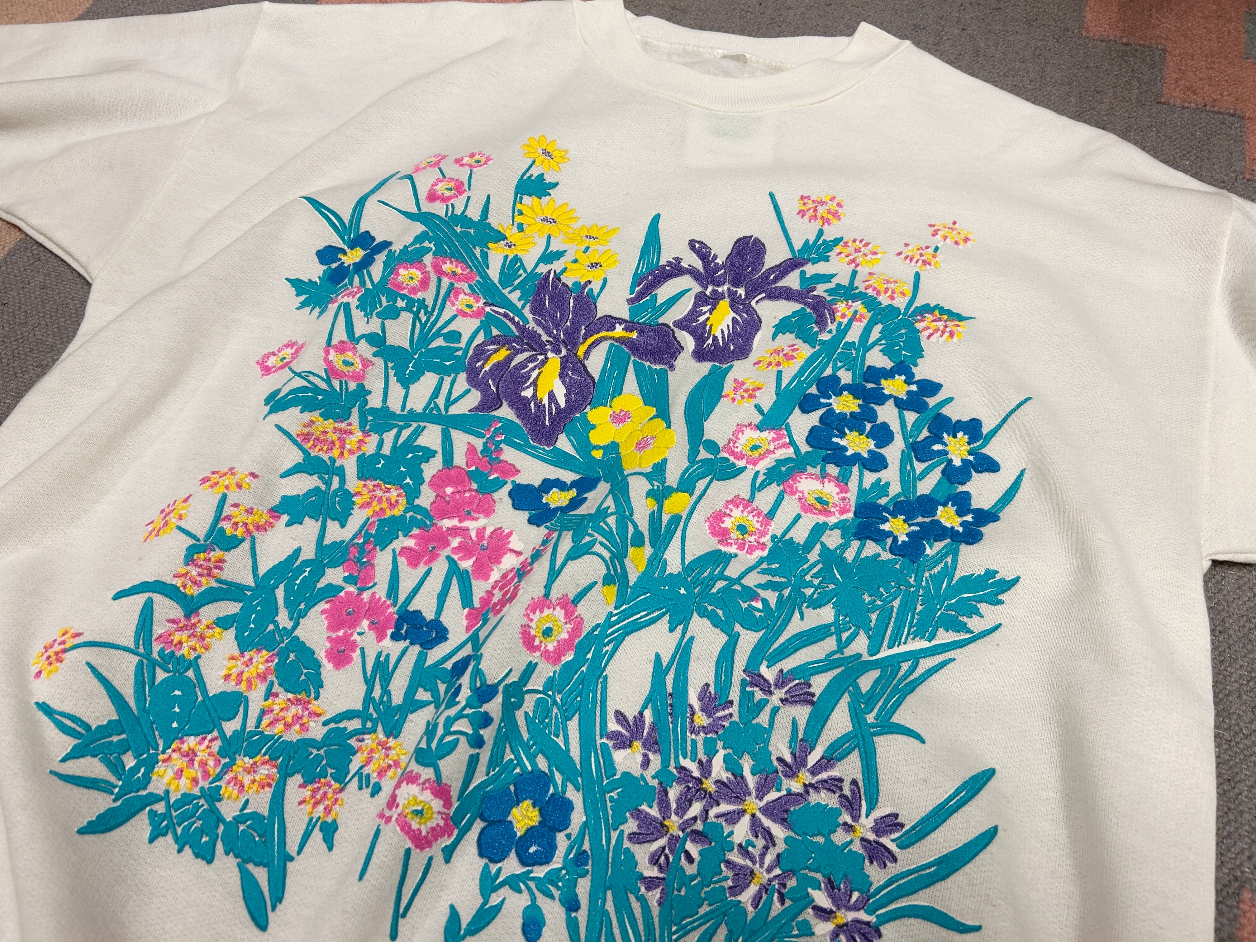 オフホワイトボディにカラフルなお花のプリントが可愛らしいアイテム。