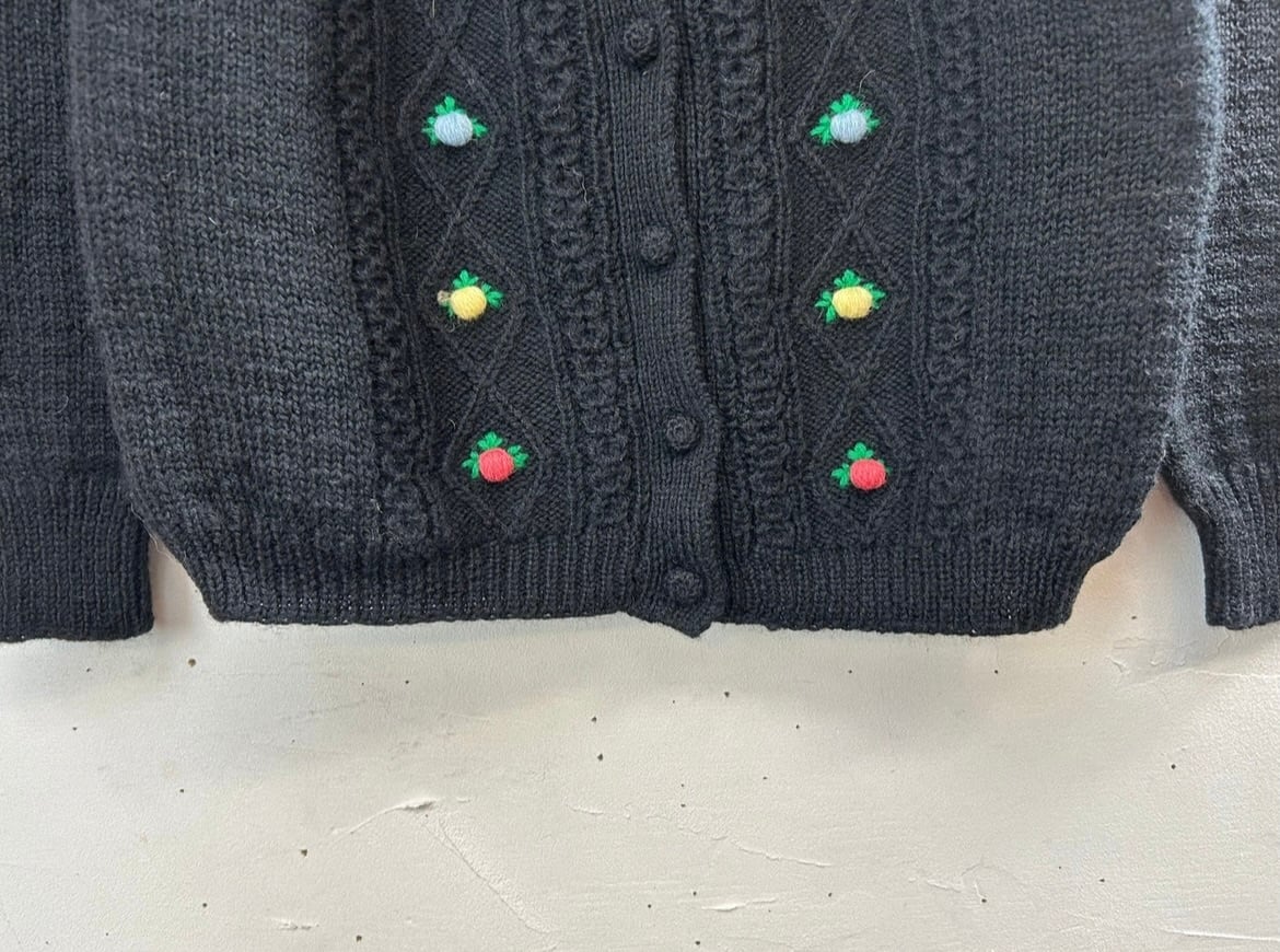 カラフルな立体感のあるお花や、ケーブルなど様々な技法で編まれたとても可愛らしい1着。