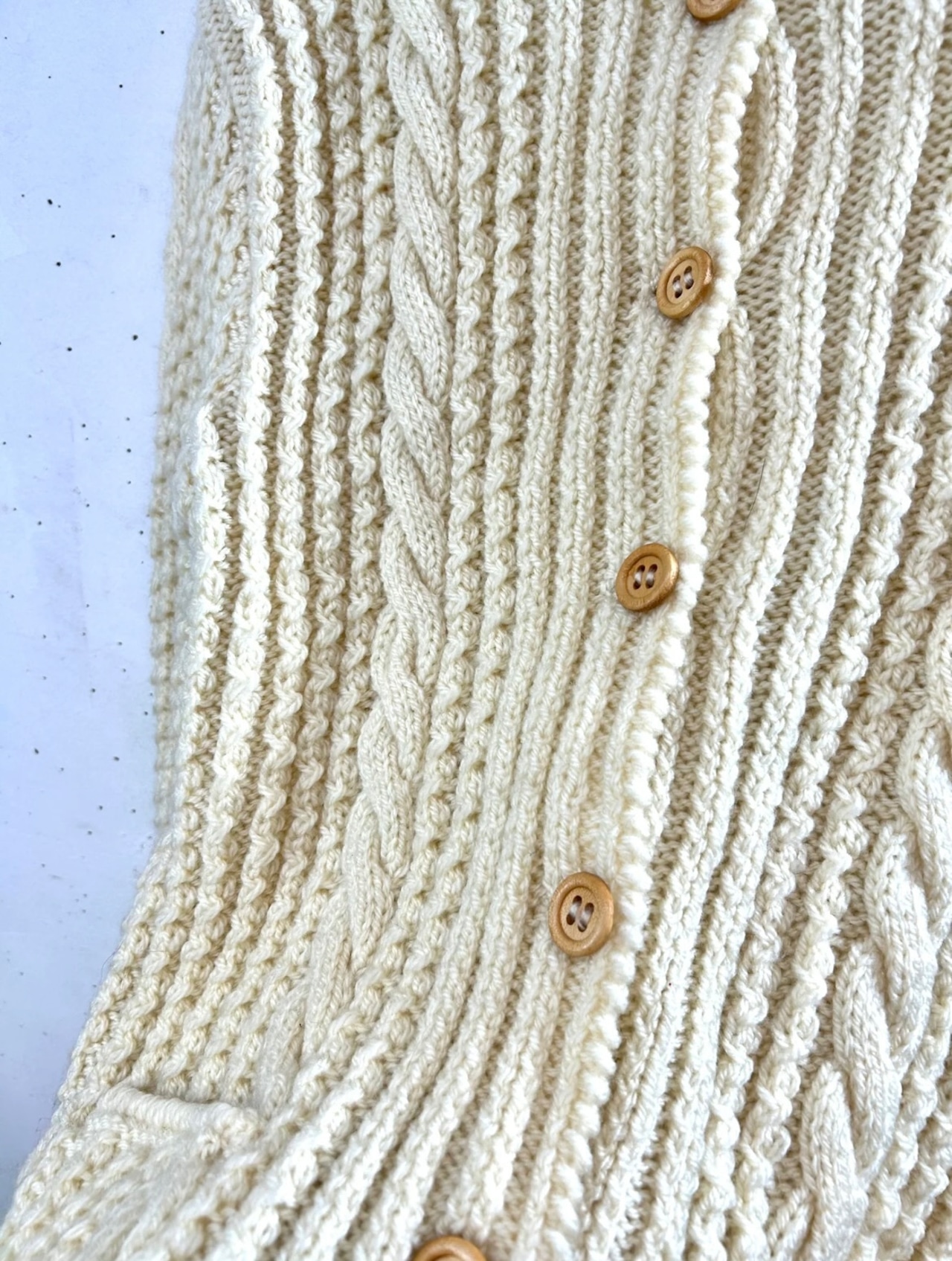 様々な編み模様が組み合わされ、ウッドボタンもアクセントになりどこから見ても圧巻なとてもクオリティの高いデザインが魅力的です。