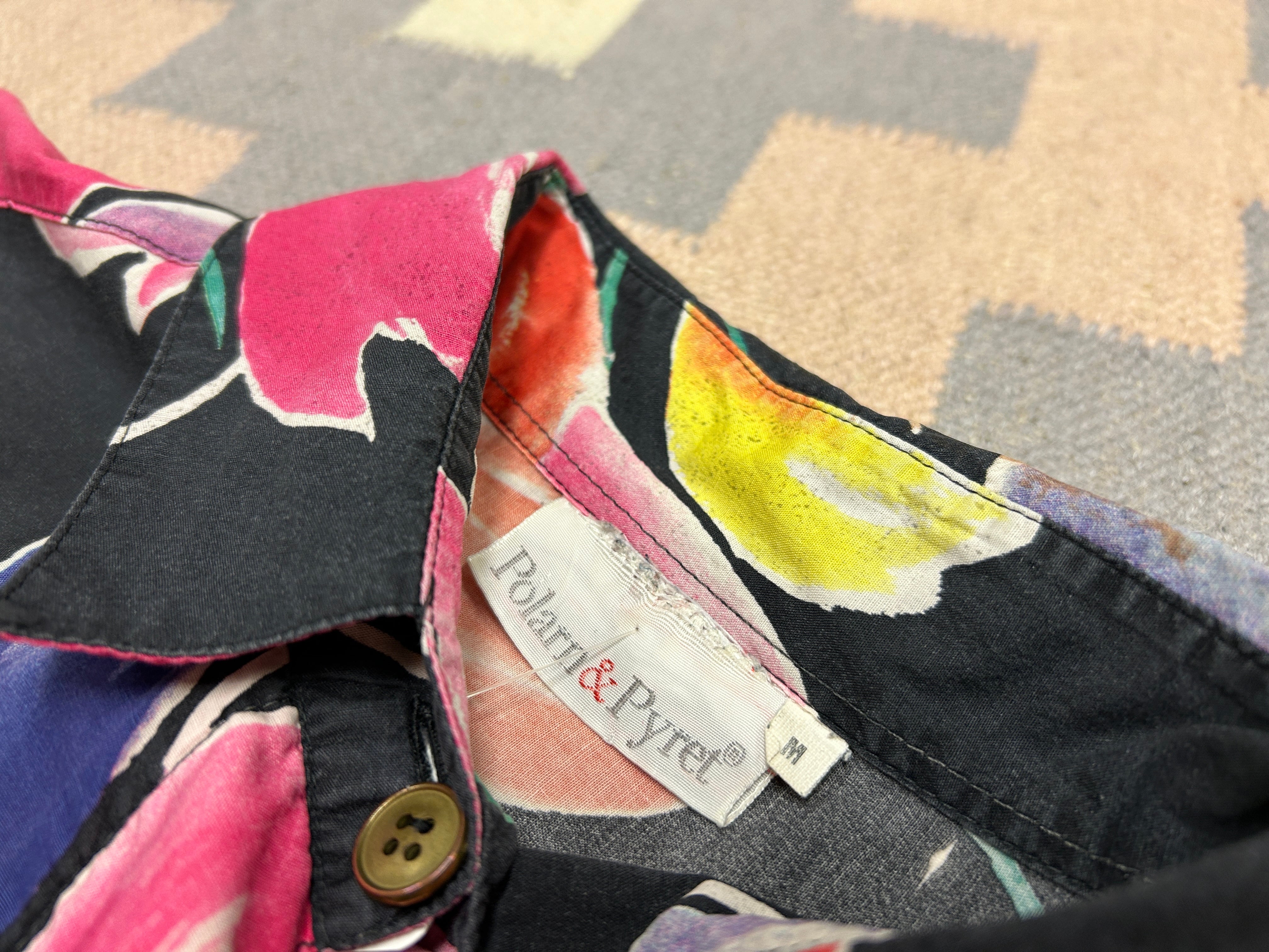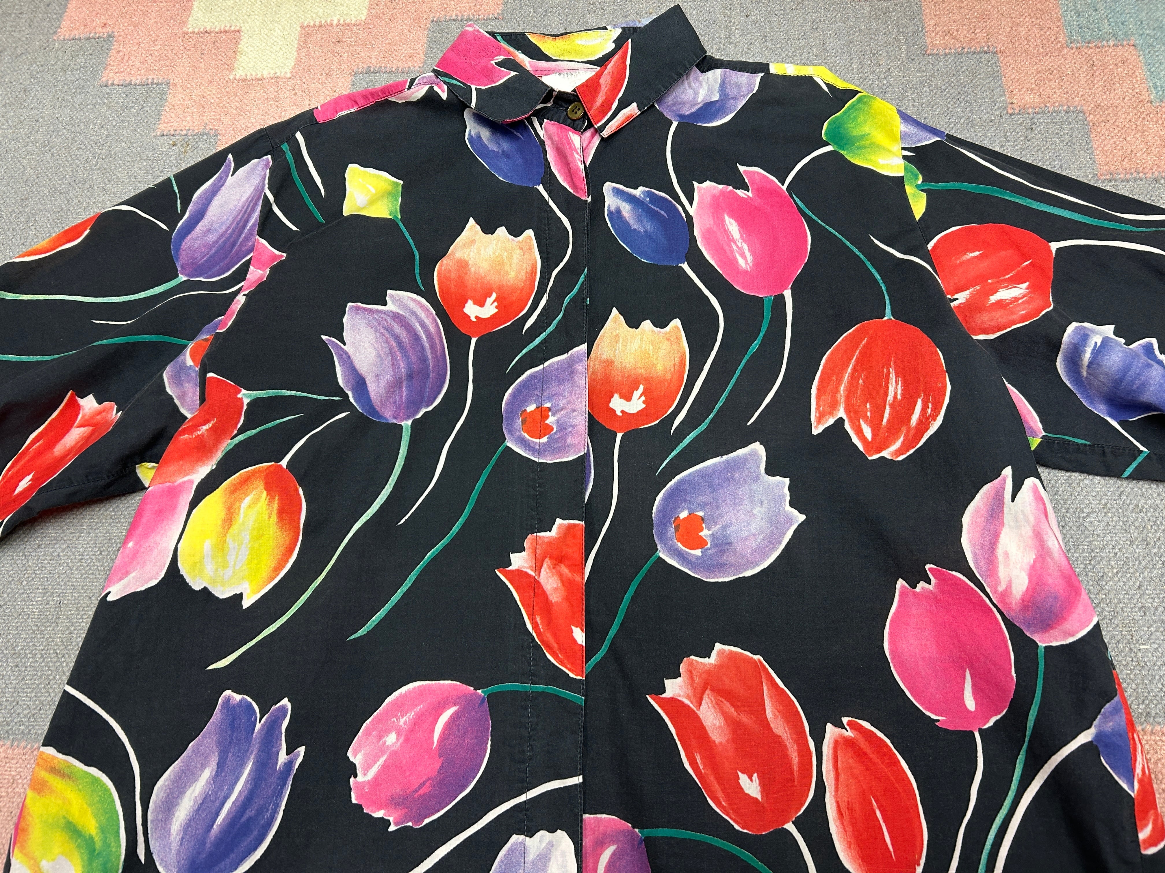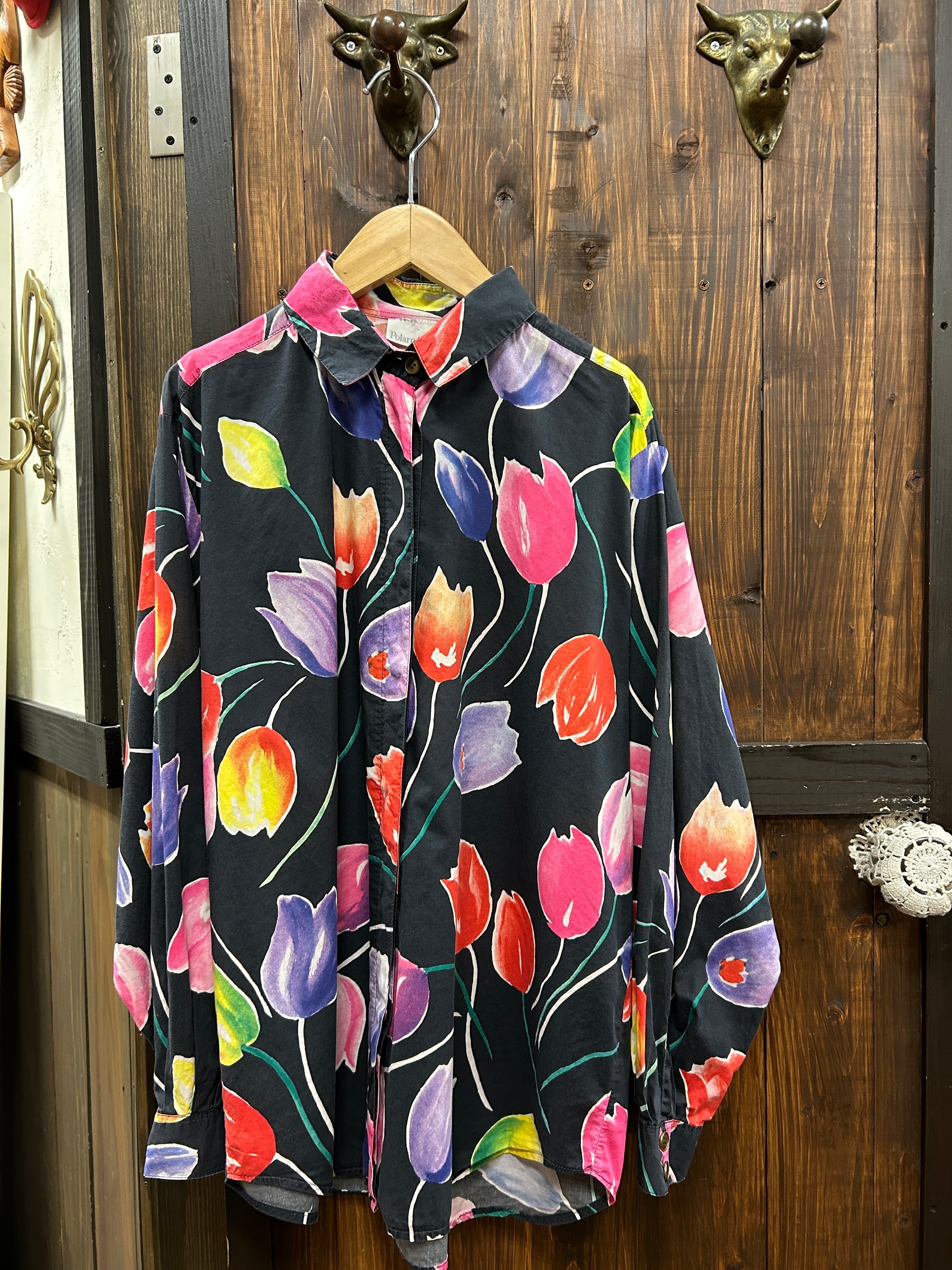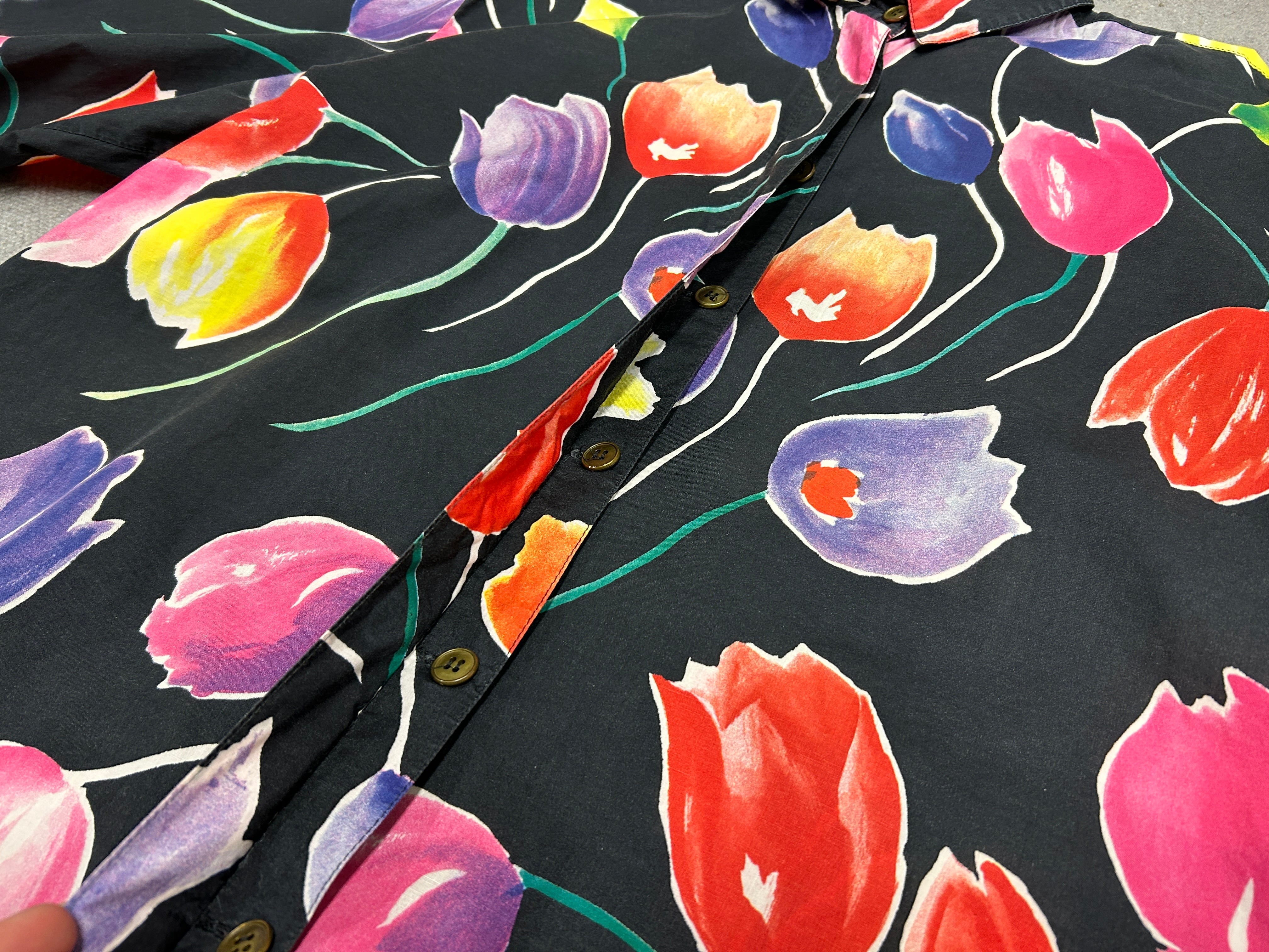 黒ボディにカラフルなチューリッププリントが目を奪うアイテム。