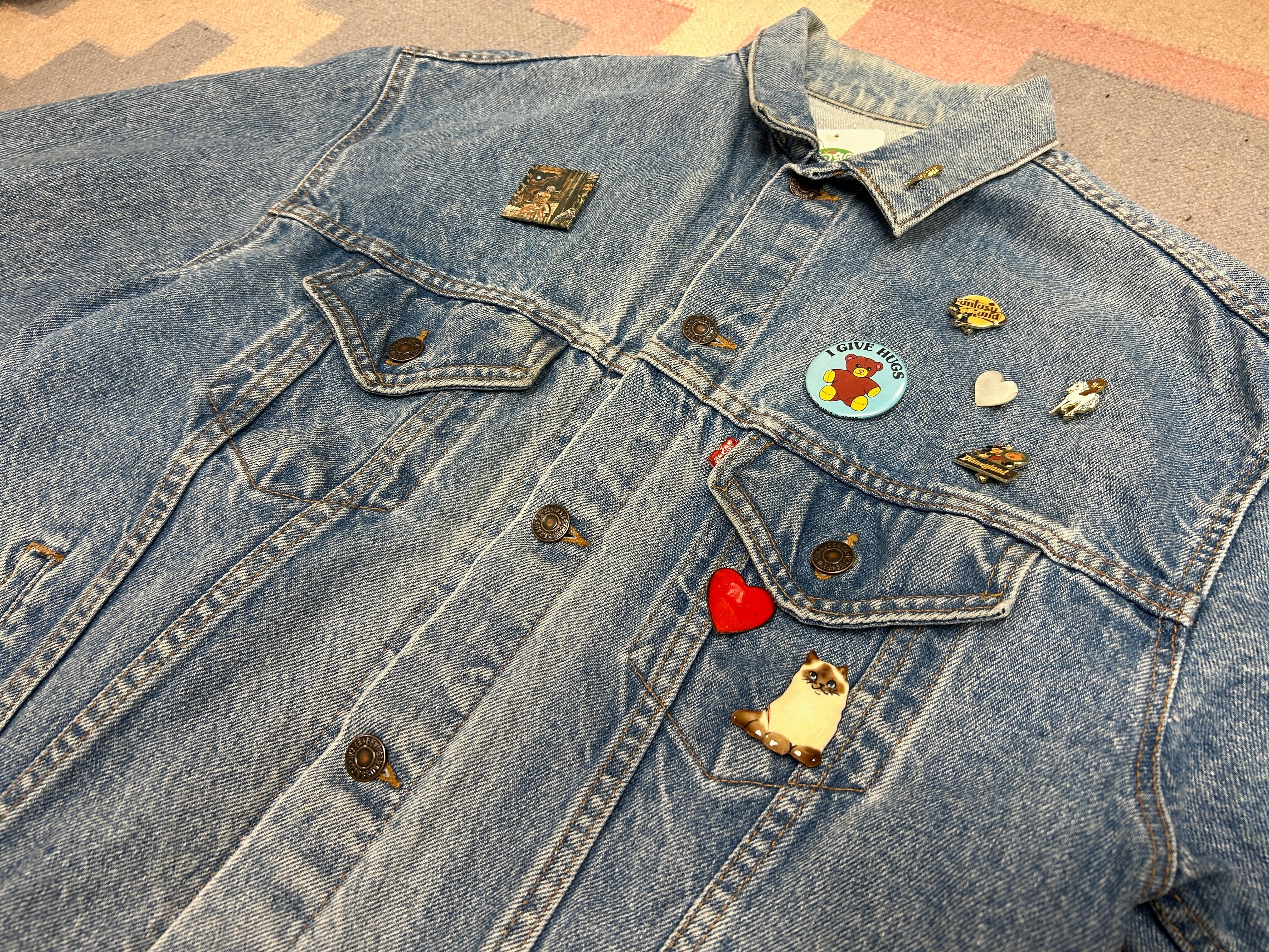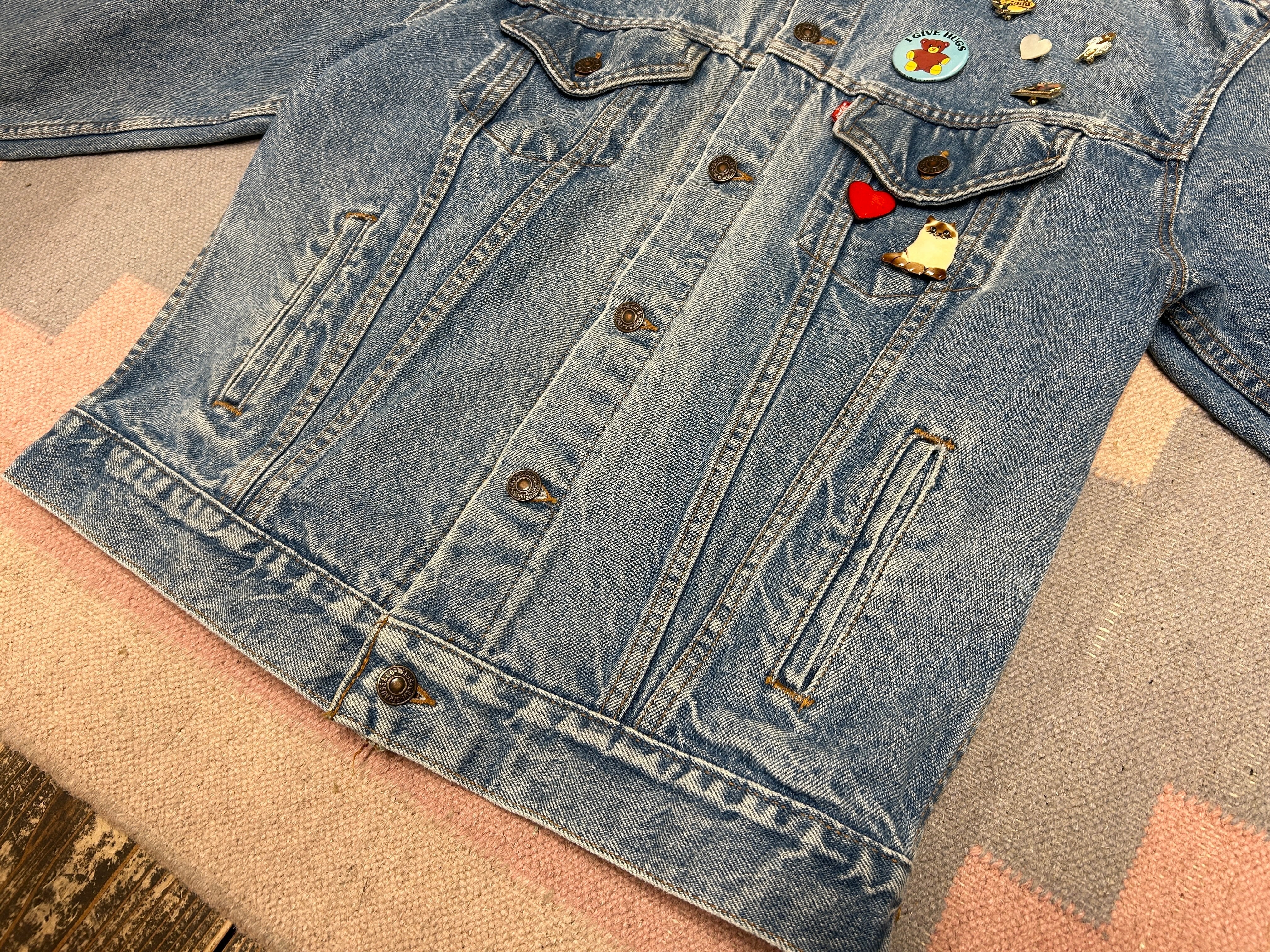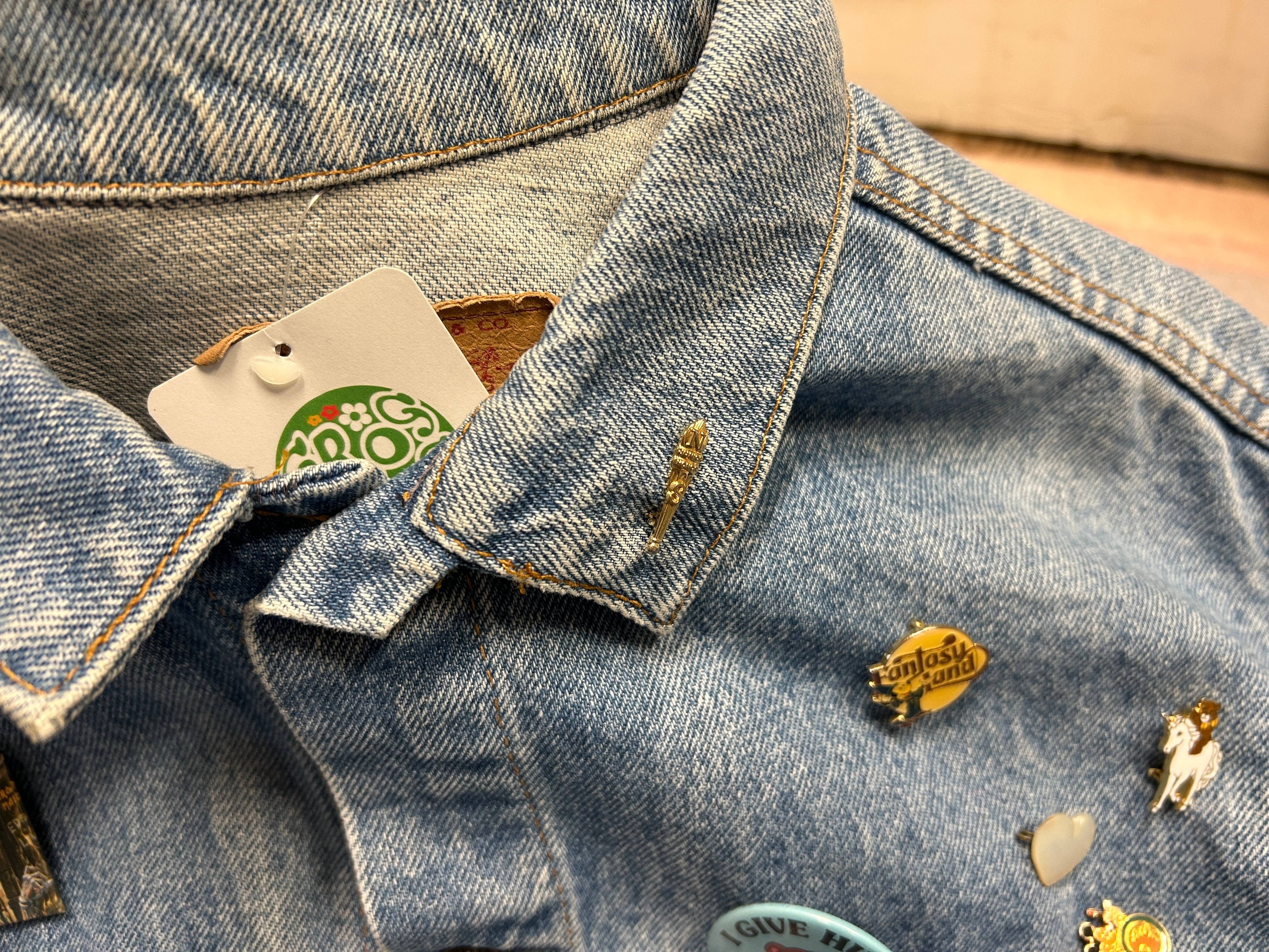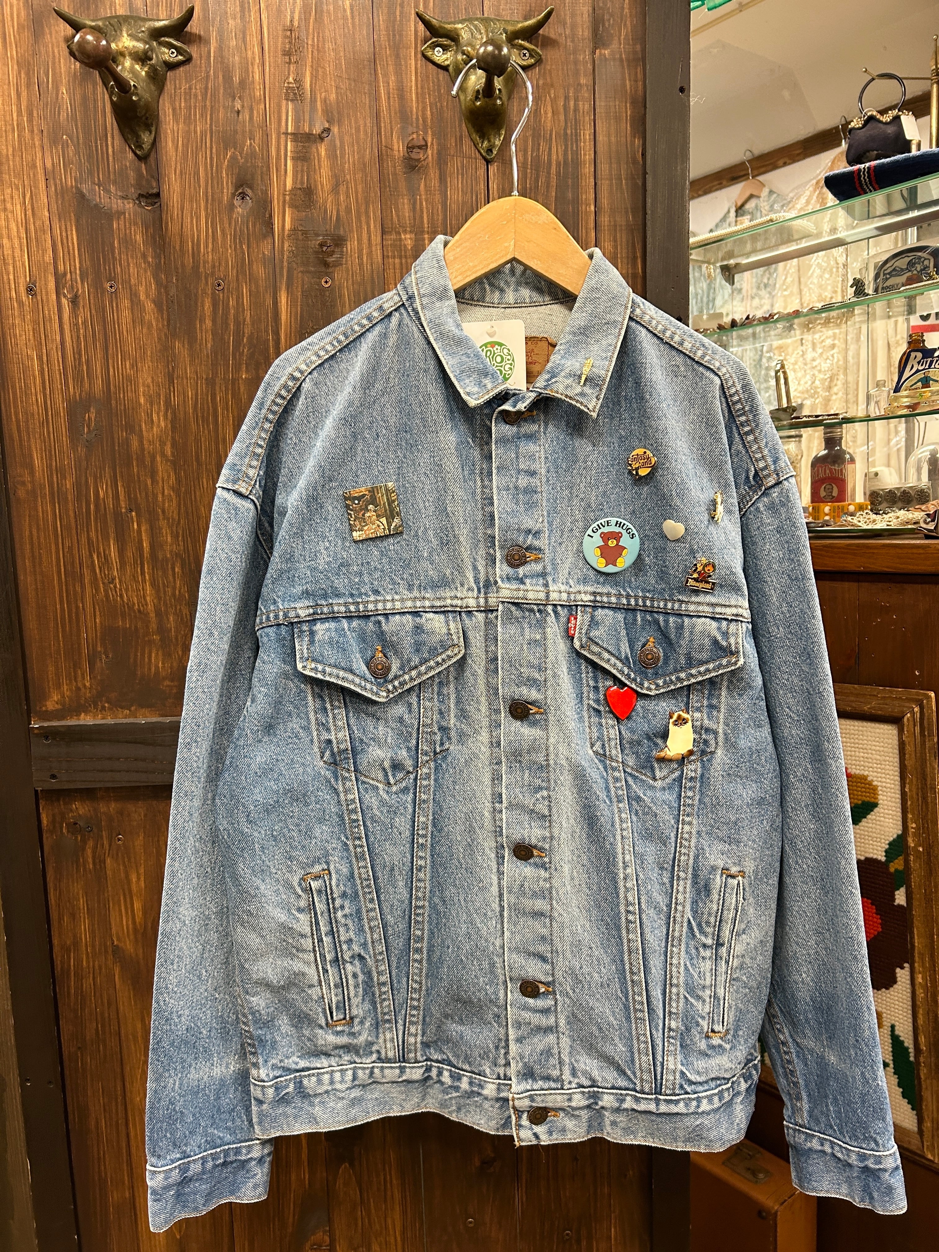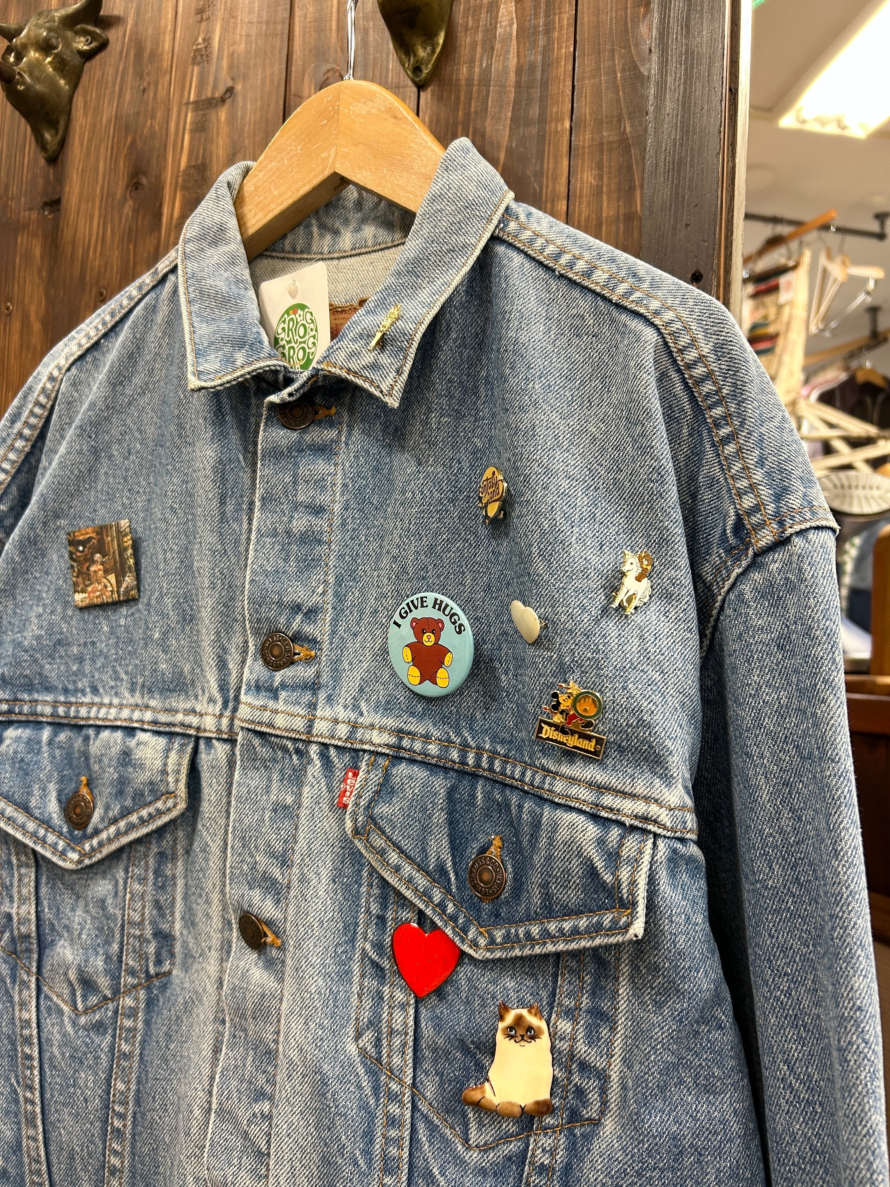 定番デニムジャケットに、前のオーナーのセンス抜群のブローチが光るアイテム。