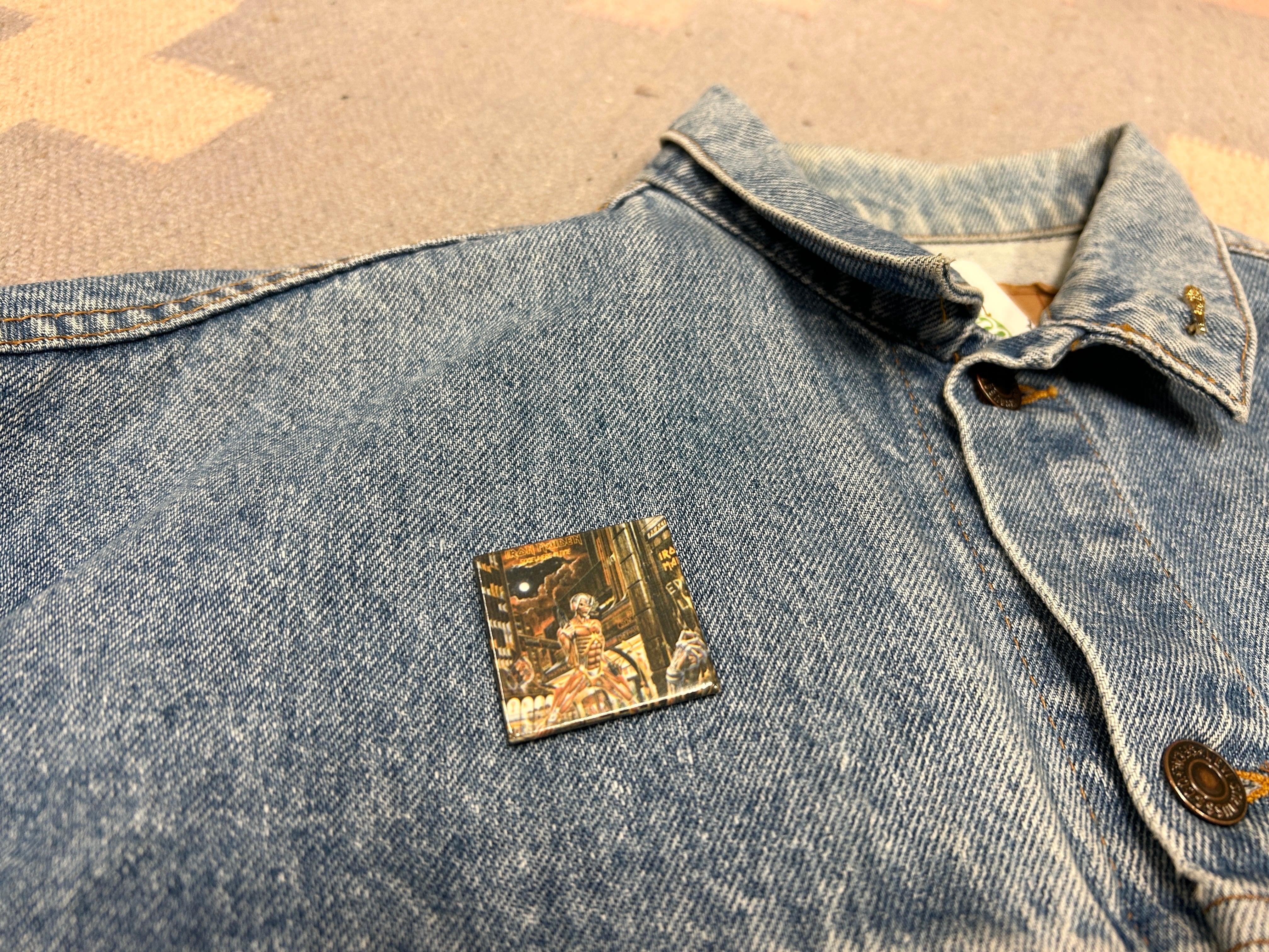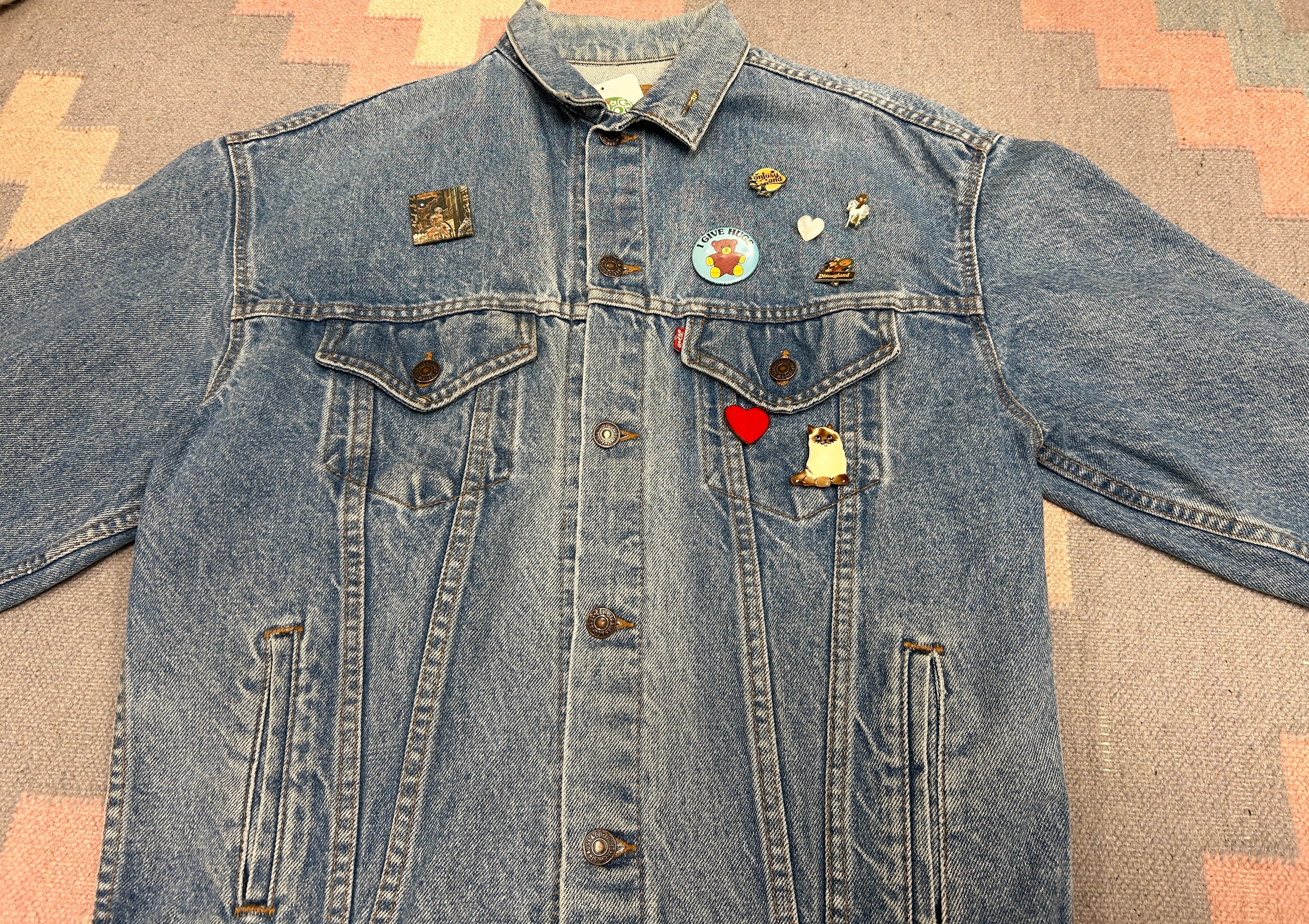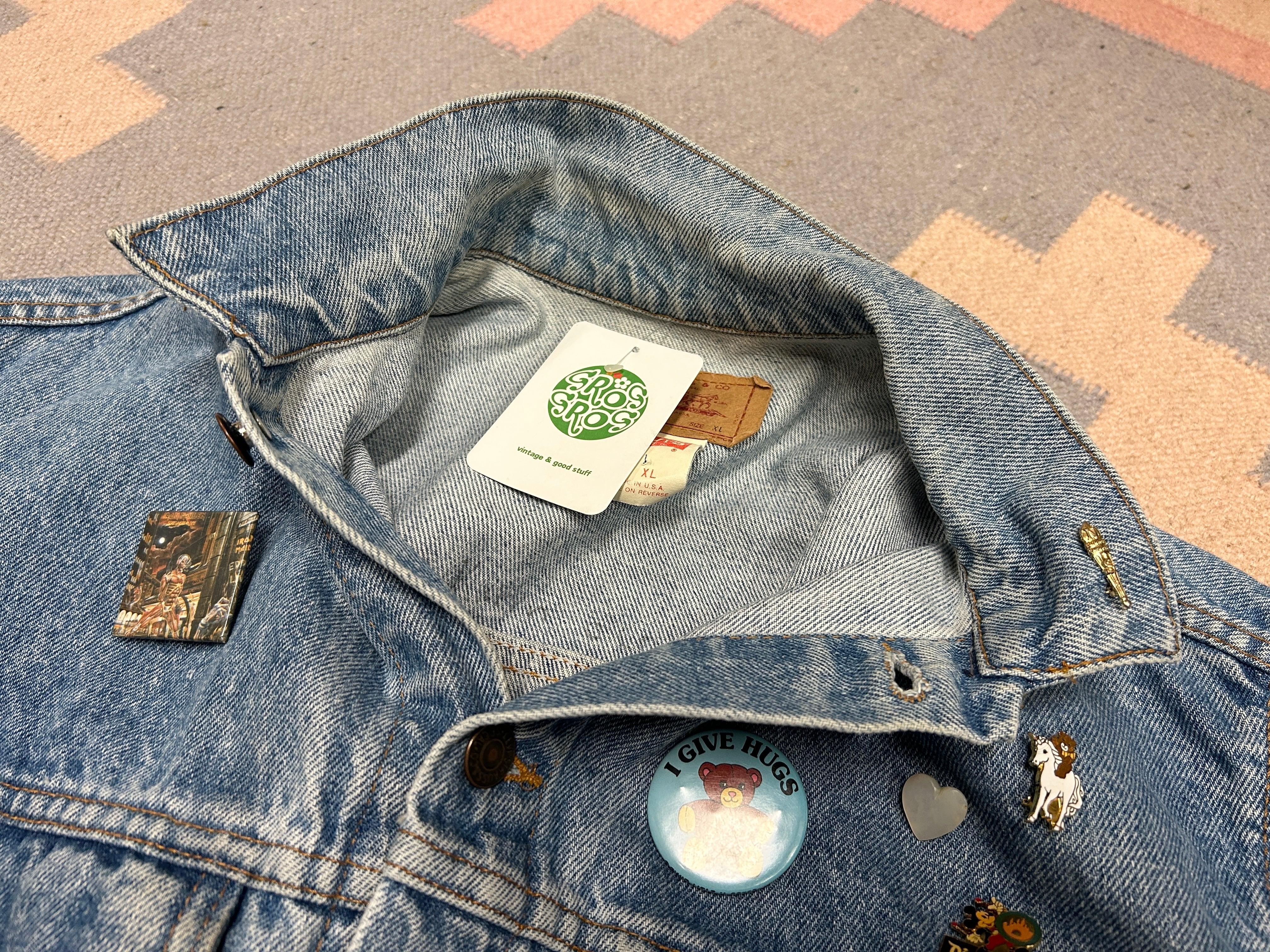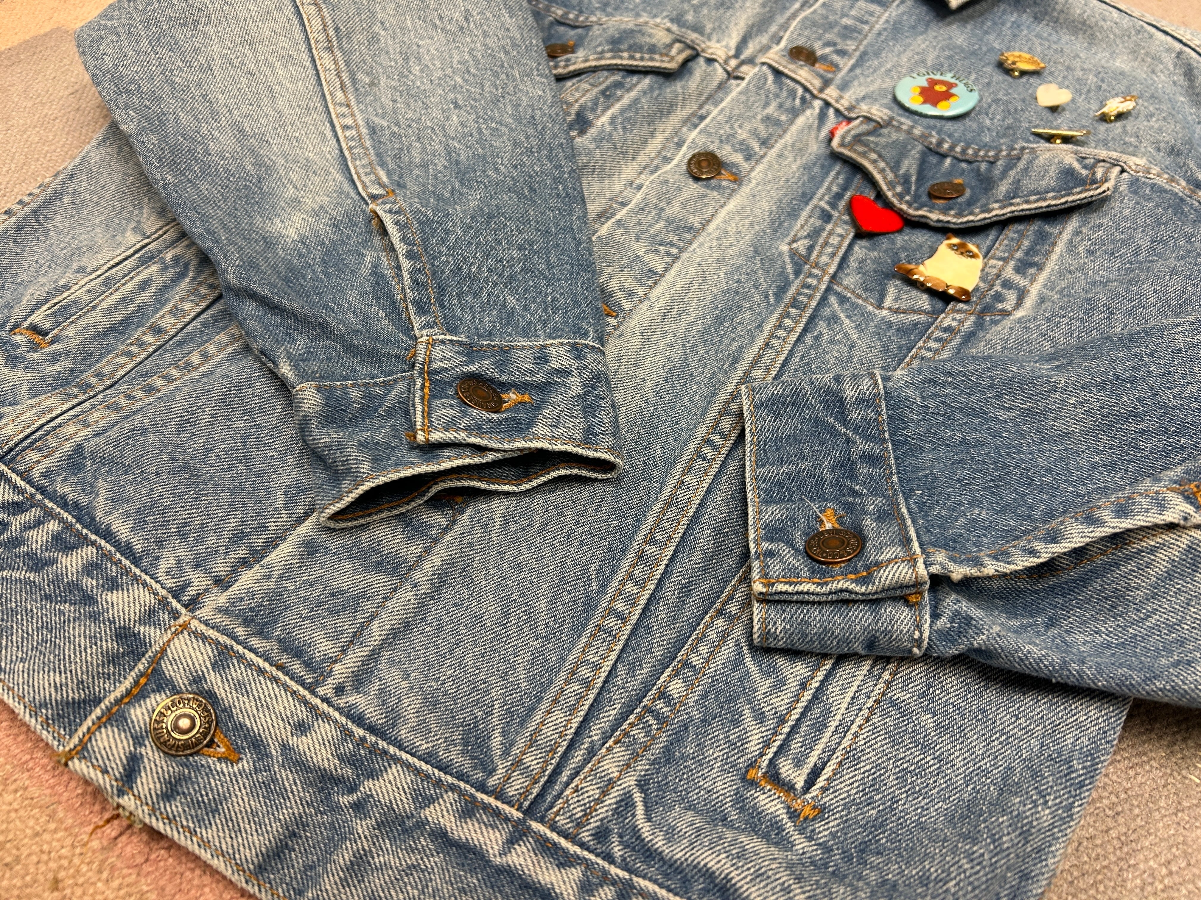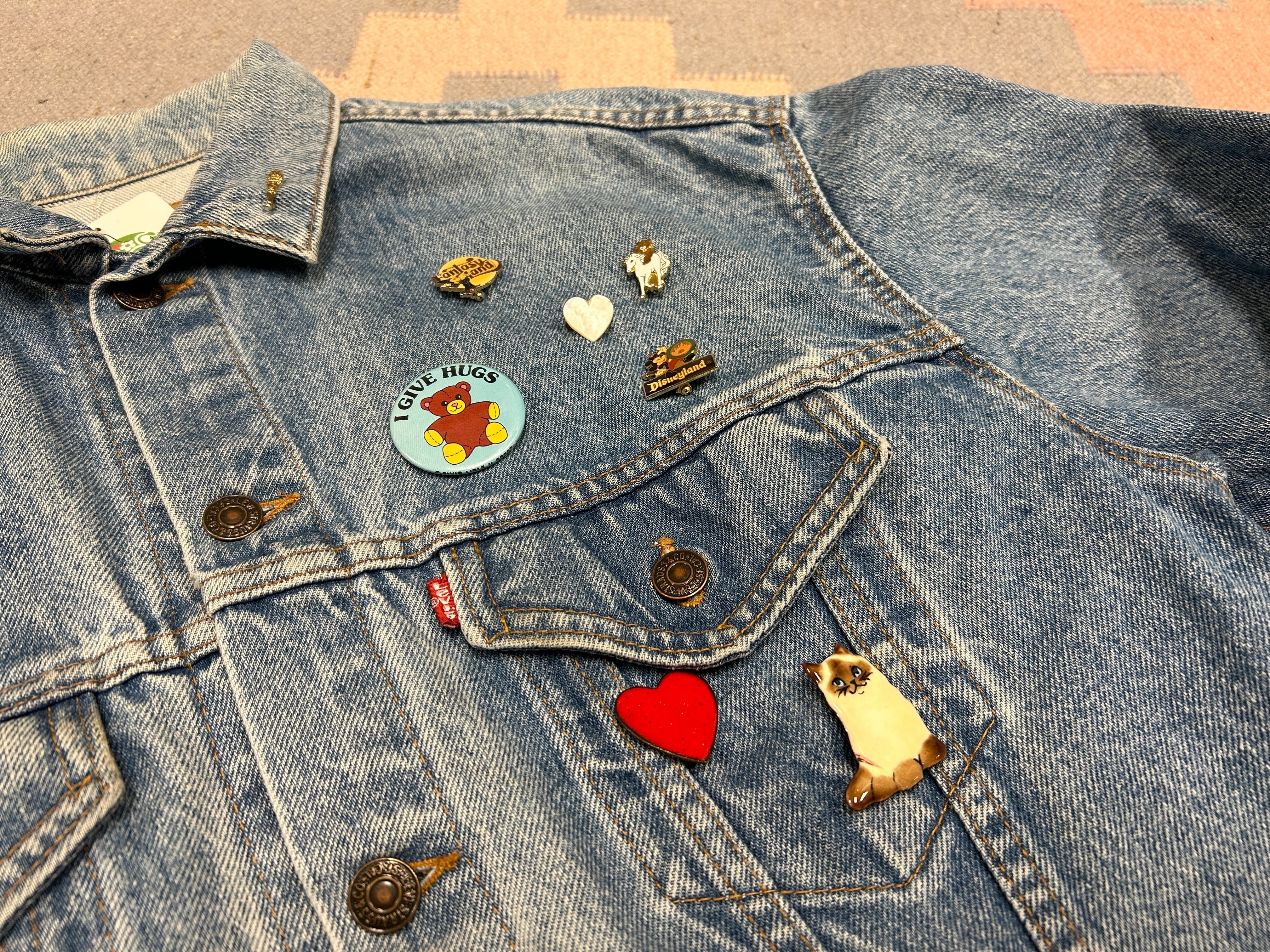 定番デニムジャケットに、前のオーナーのセンス抜群のブローチが光るアイテム。