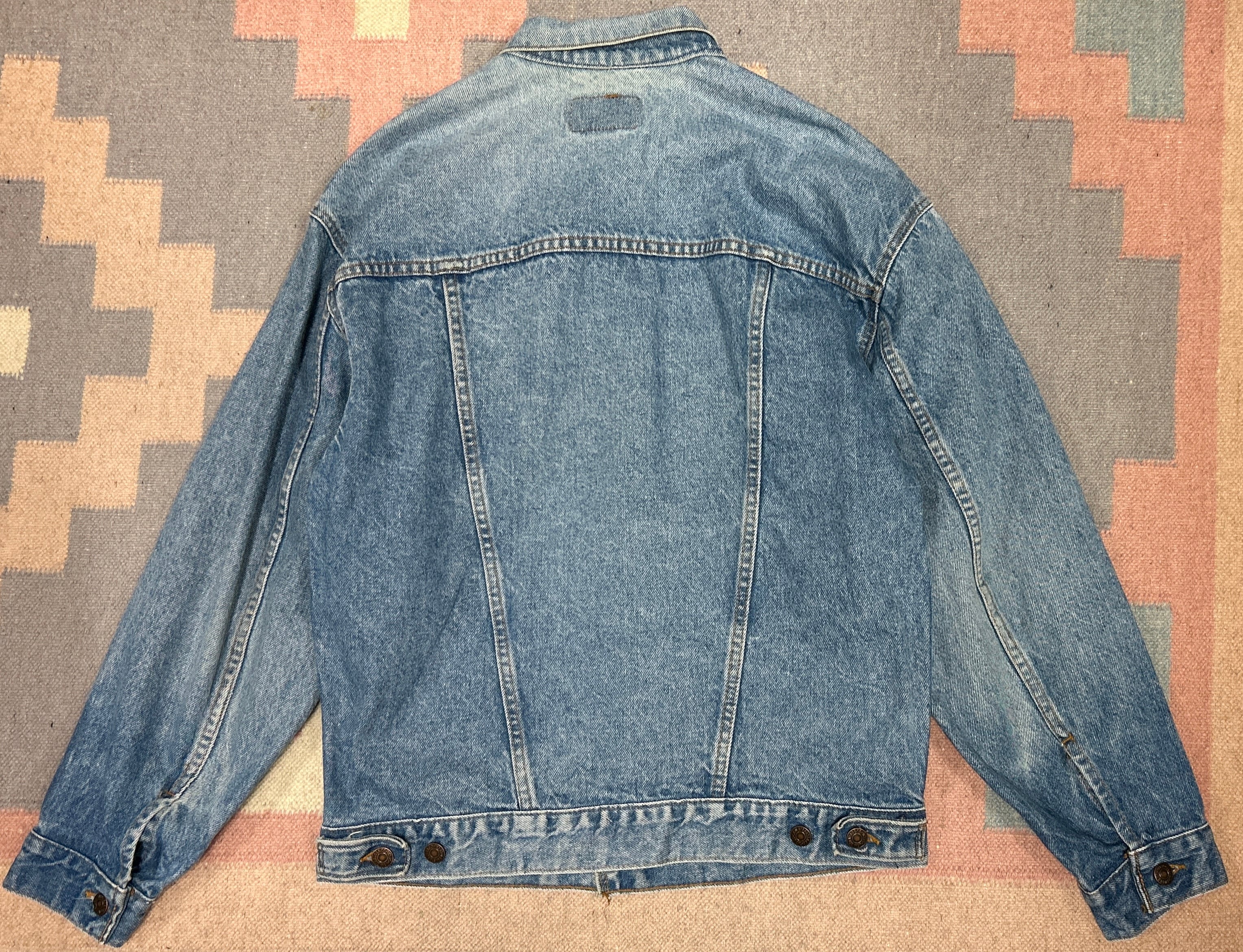 コンディション:襟内側や背中ヨーク、袖等デニム特有のあたりや色落ちがございますが味としてお楽しみ頂けます。その他特筆するダメージ等無く、ビンテージにご理解頂いている方でしたら、比較的程度の良いアイテムかと思われます。