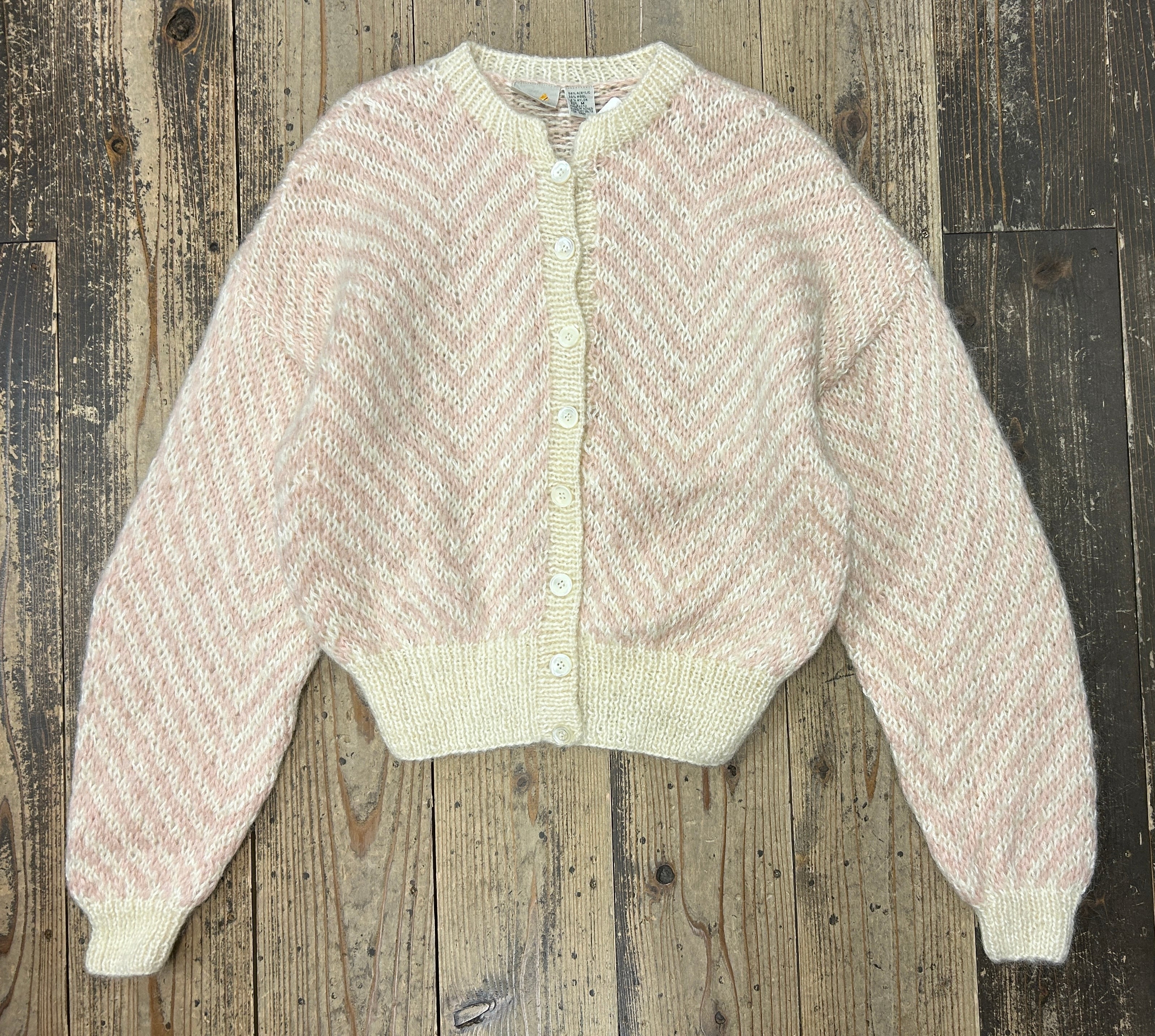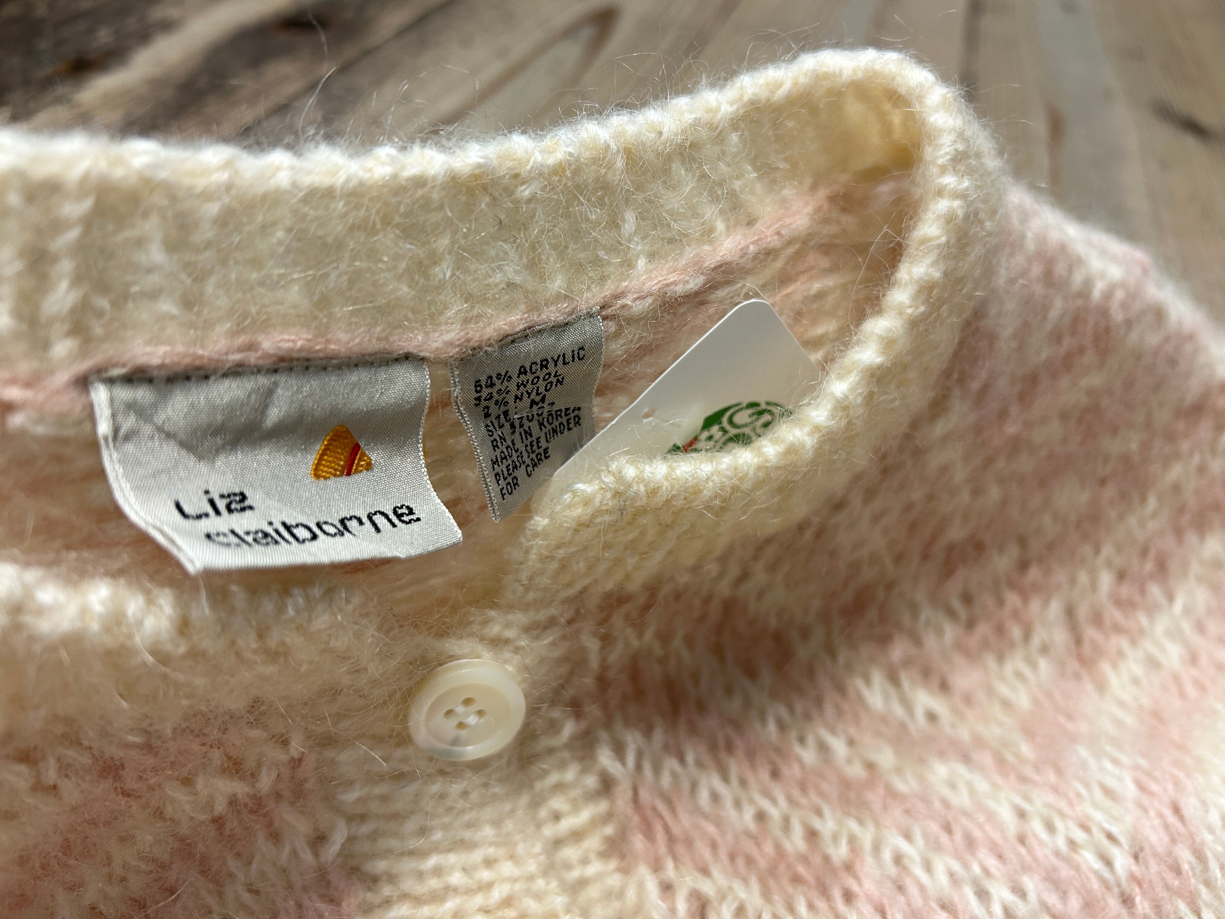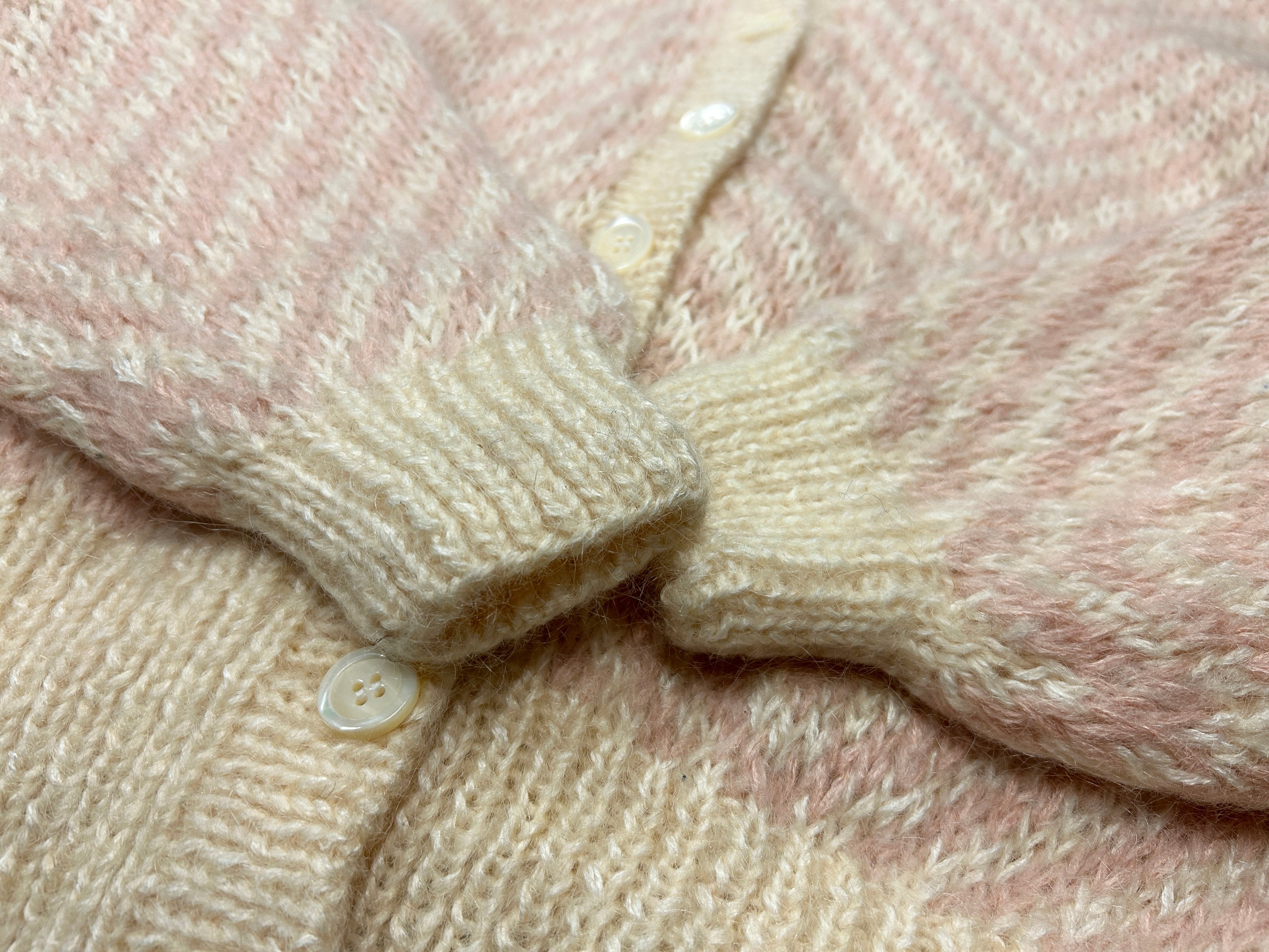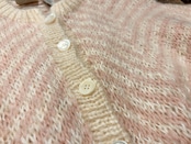 オフホワイトとピンクのふわふわな素材感が可愛らしいアイテム。