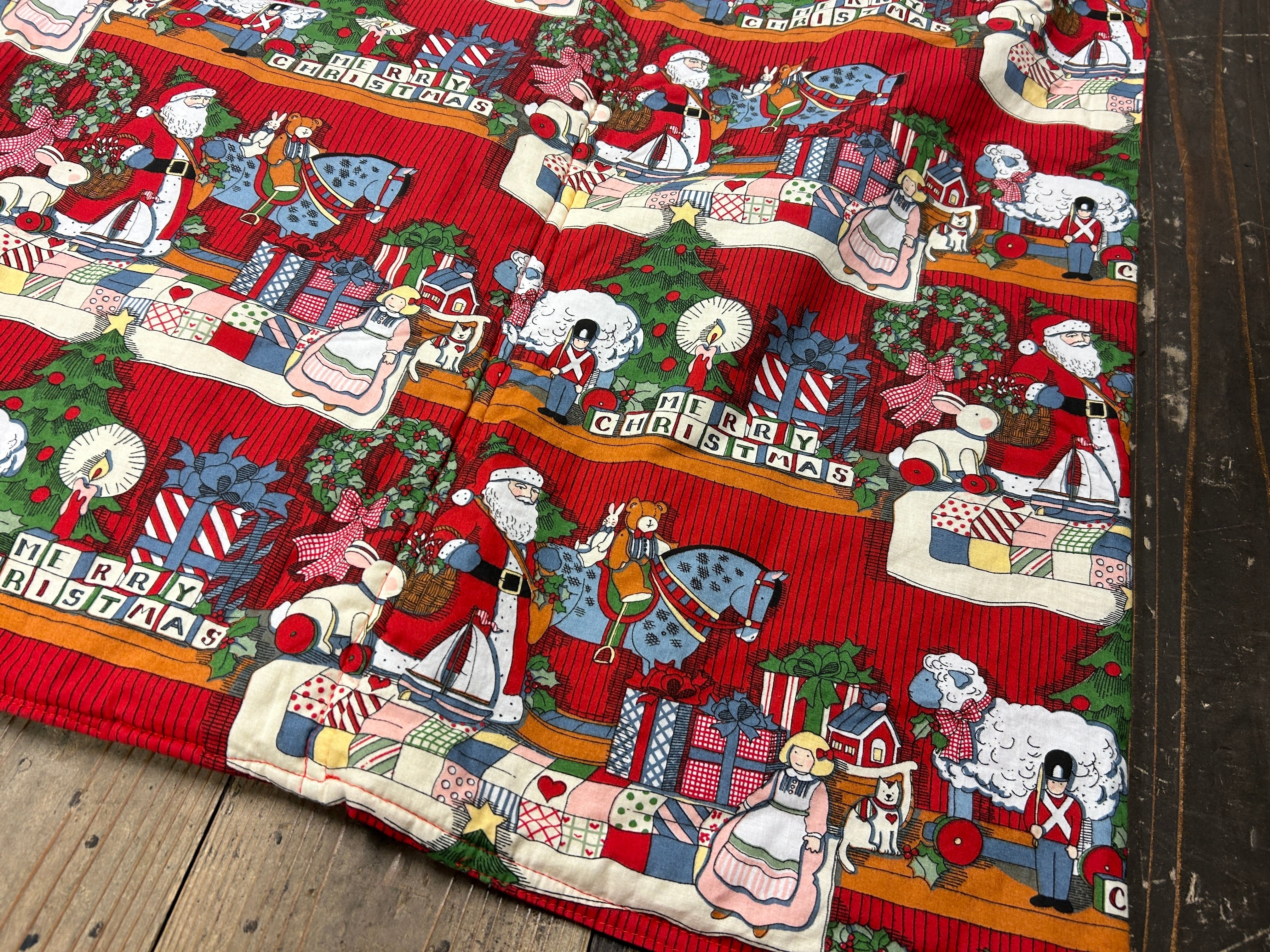 サンタや人形など、クリスマスのプレゼントが陳列されたようなプリント。