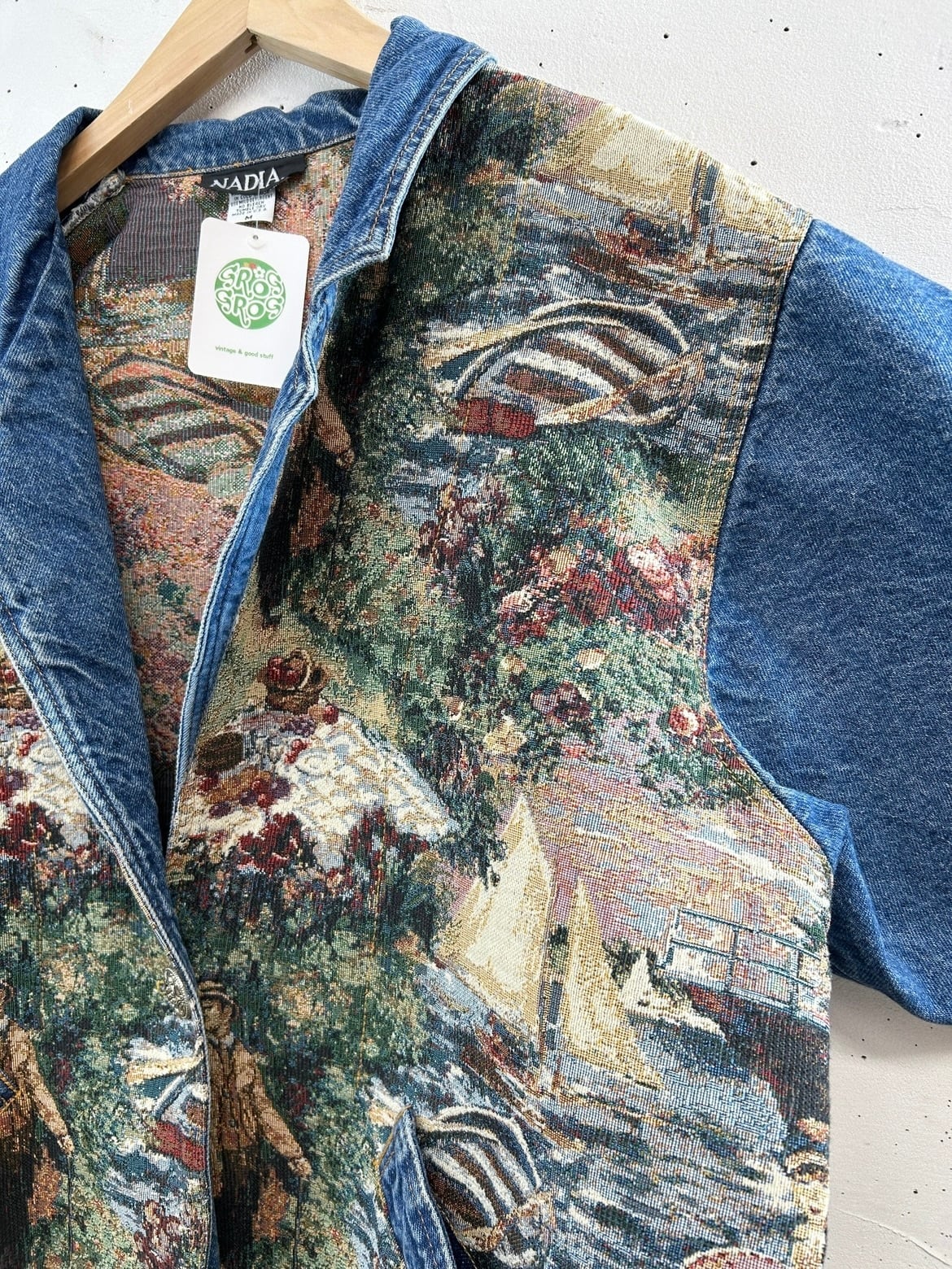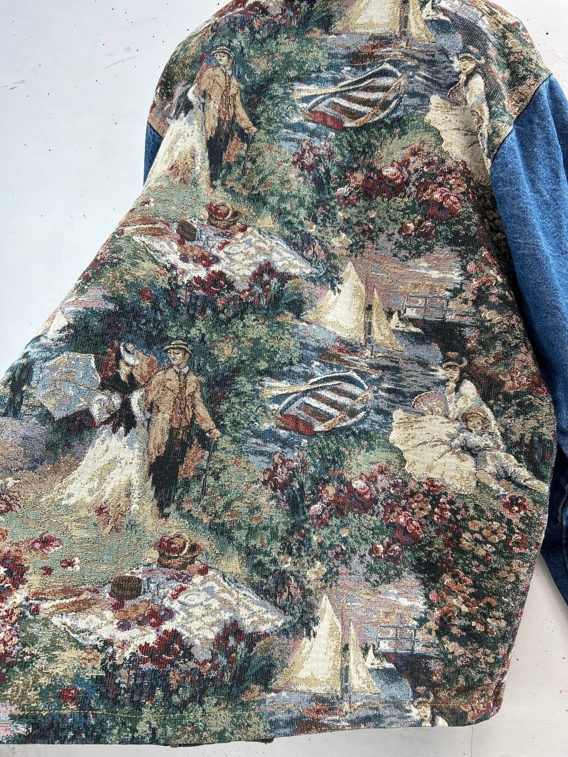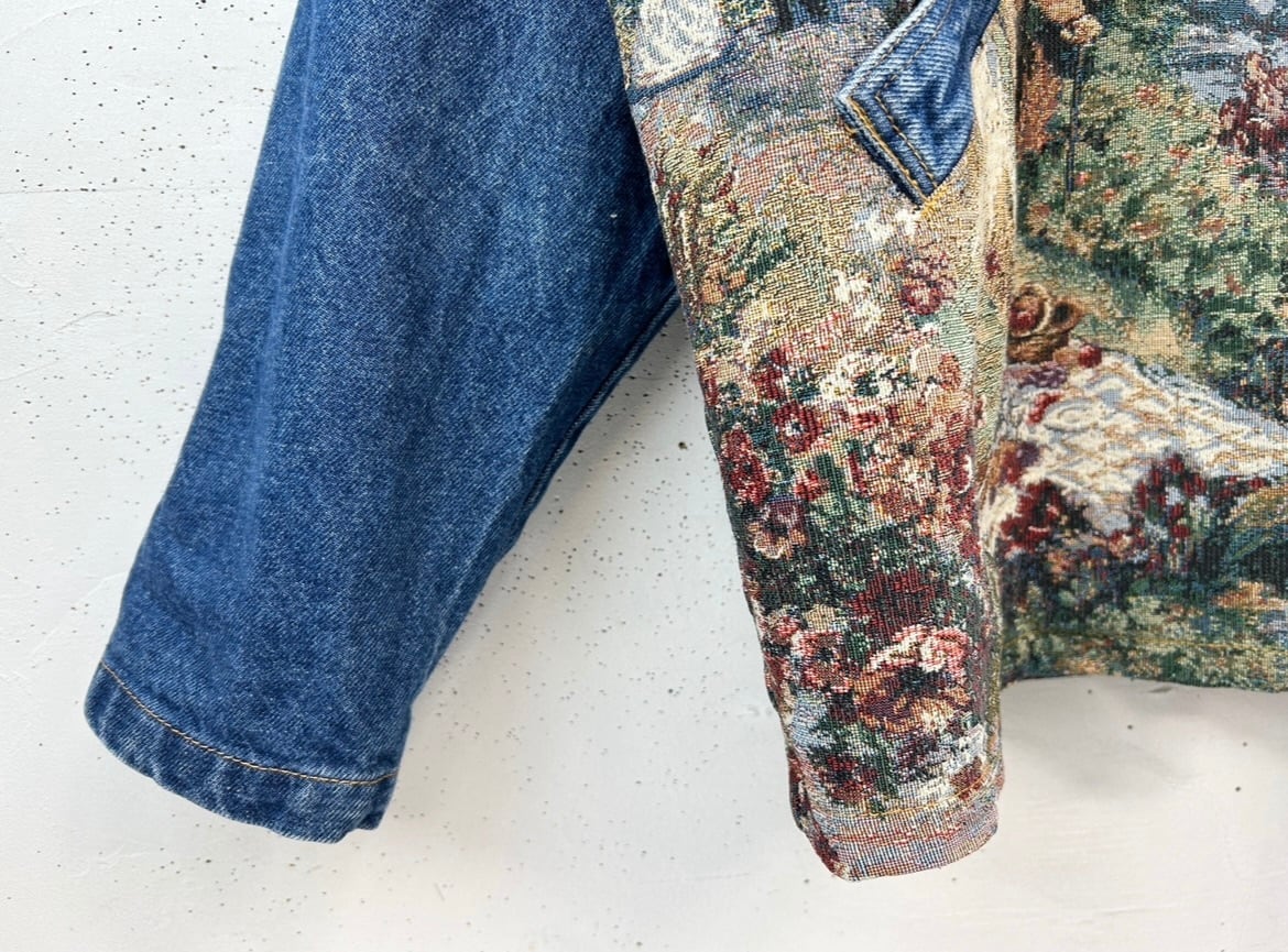 デニム生地とゴブランの切り替えがデザイン性の高い1着。