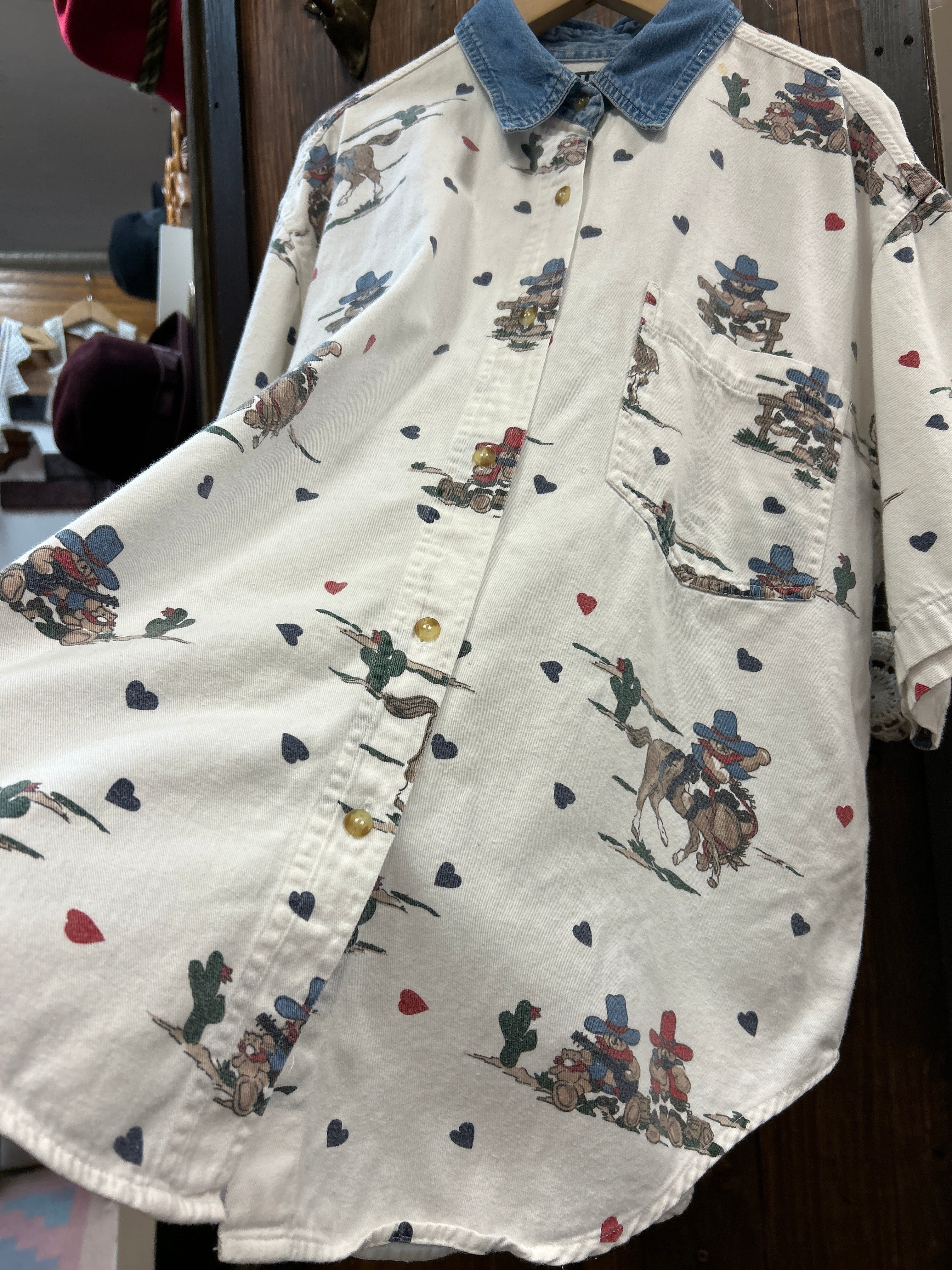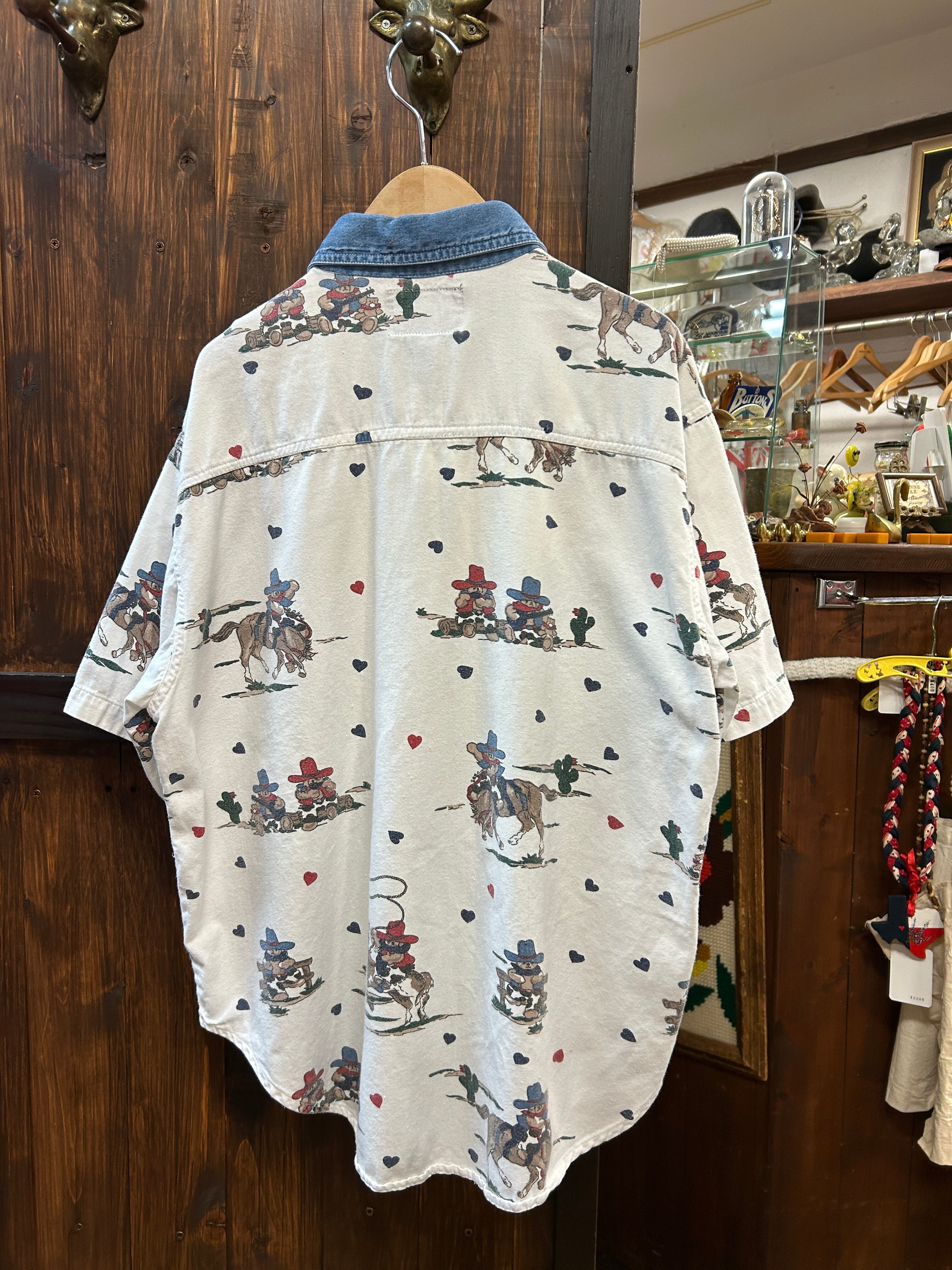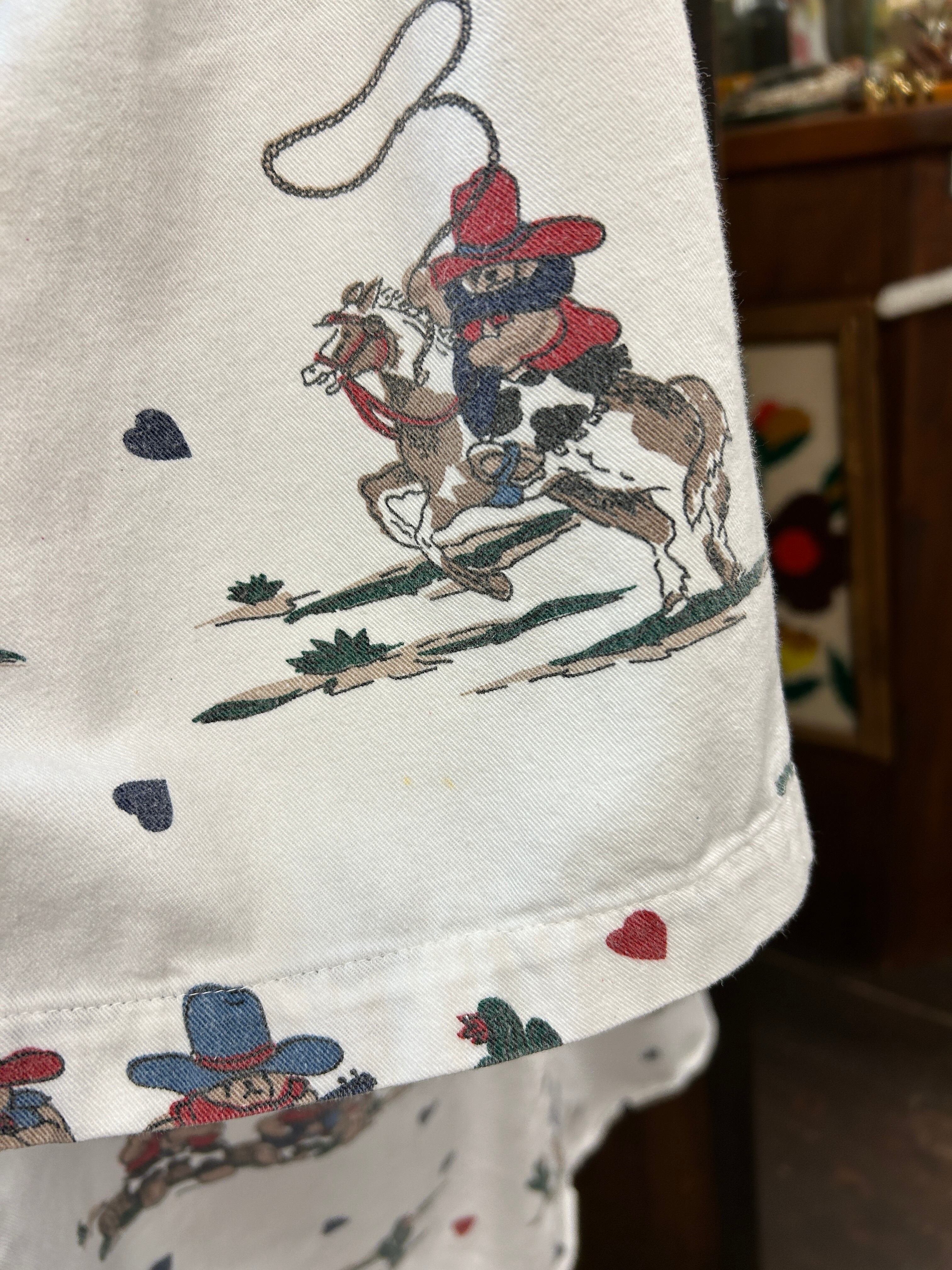 牛柄のパンツを履いたカウボーイスタイルのクマプリントが可愛いアイテム。
