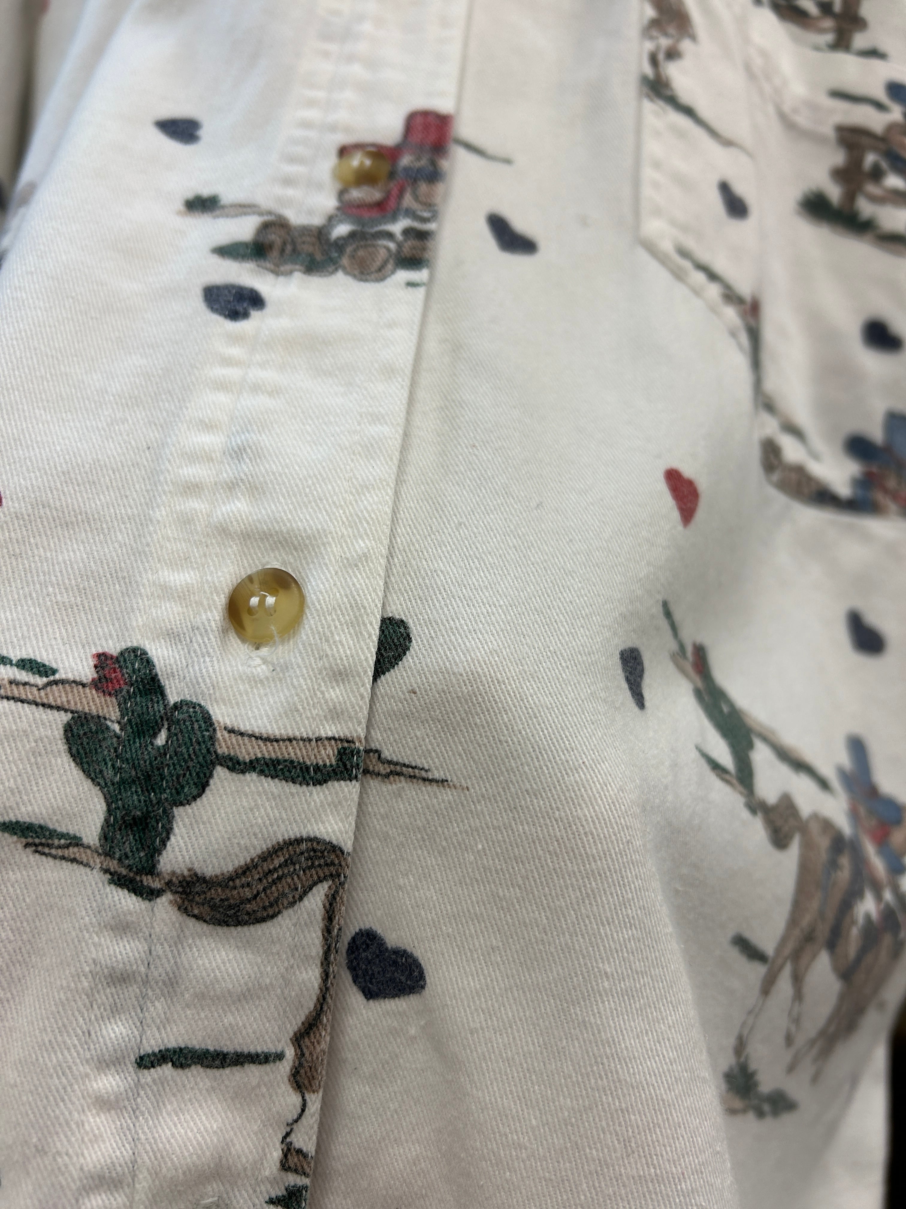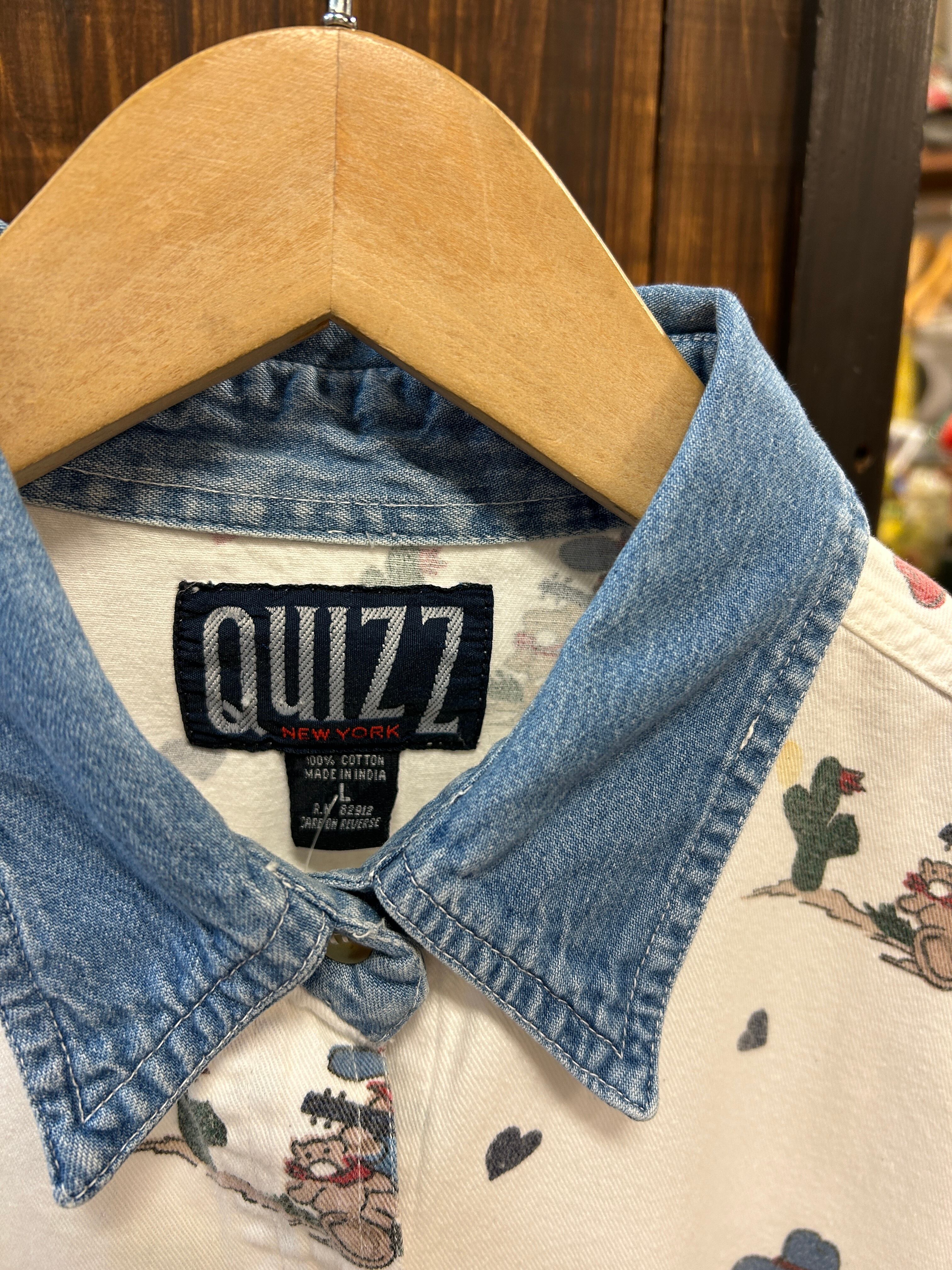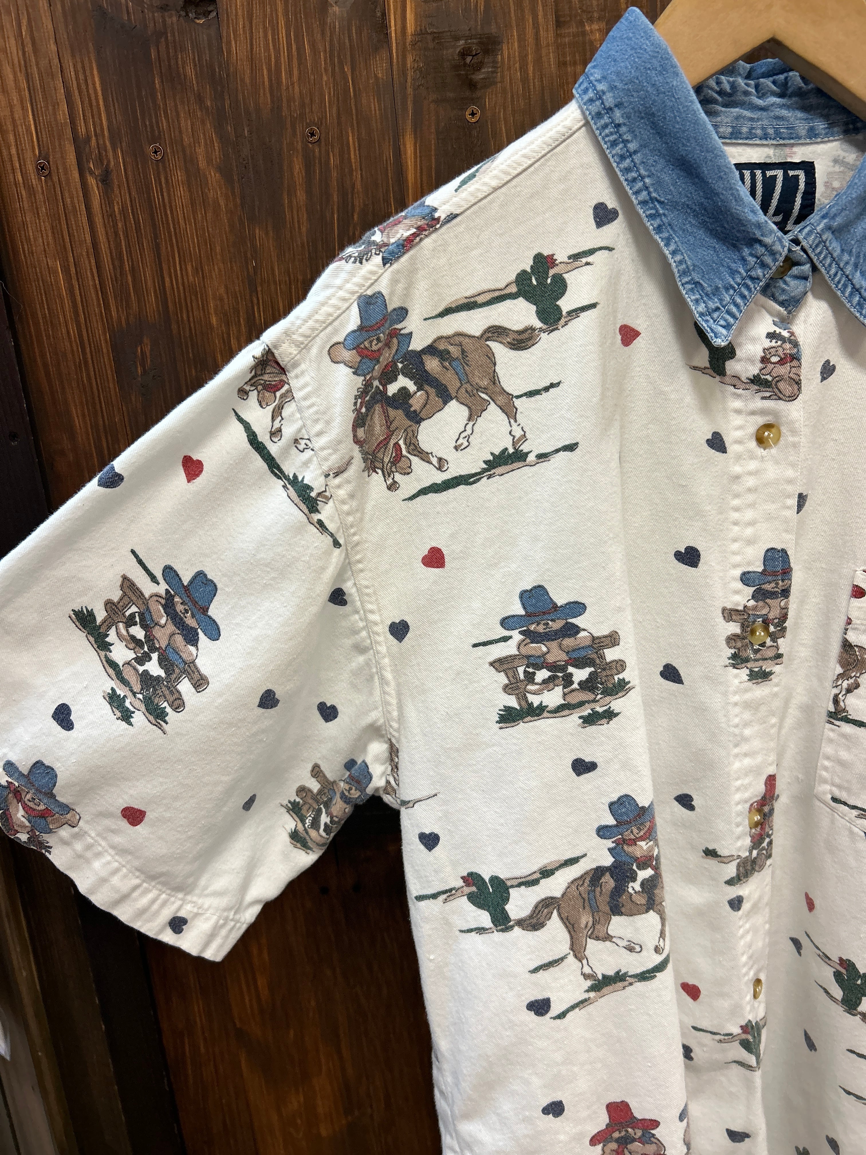 牛柄のパンツを履いたカウボーイスタイルのクマプリントが可愛いアイテム。