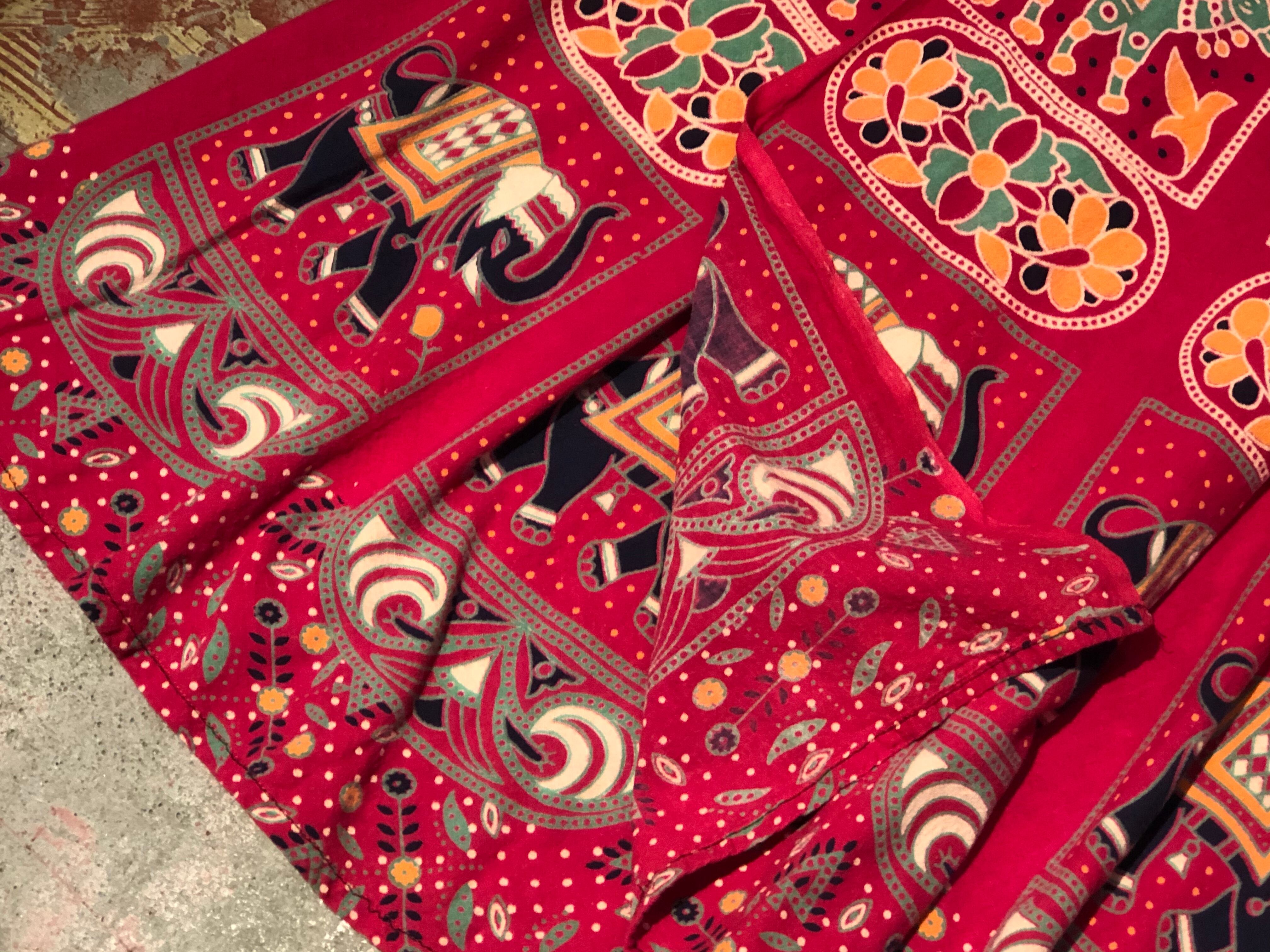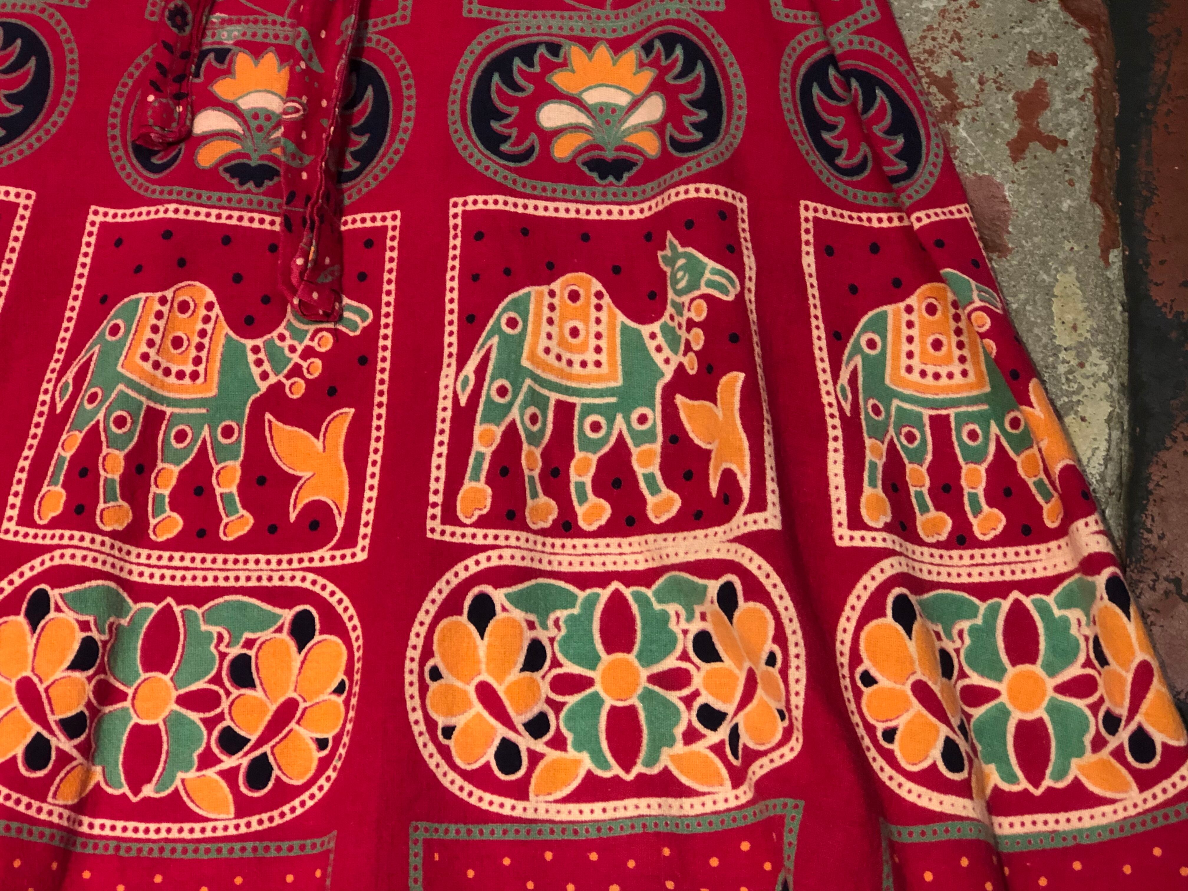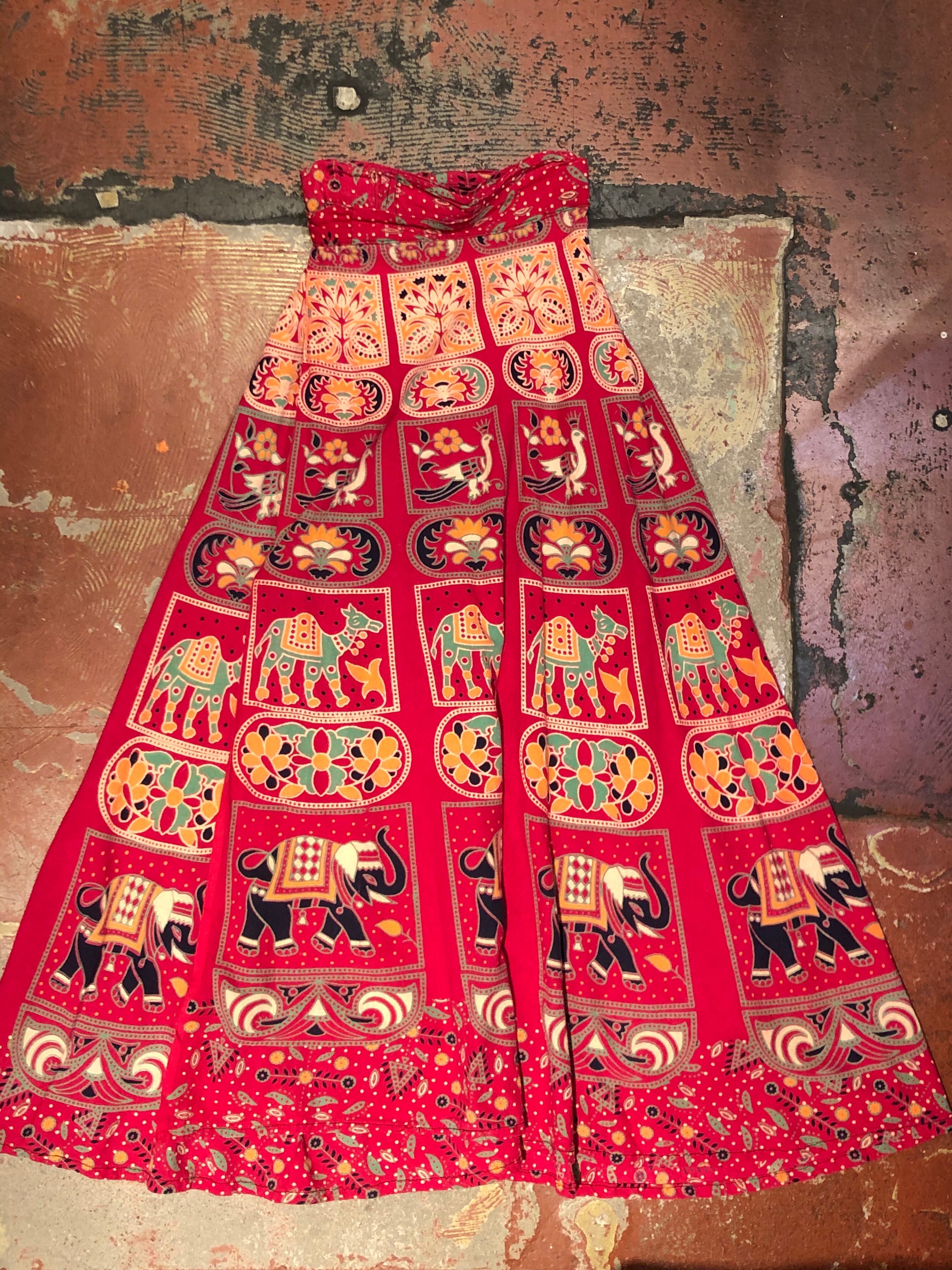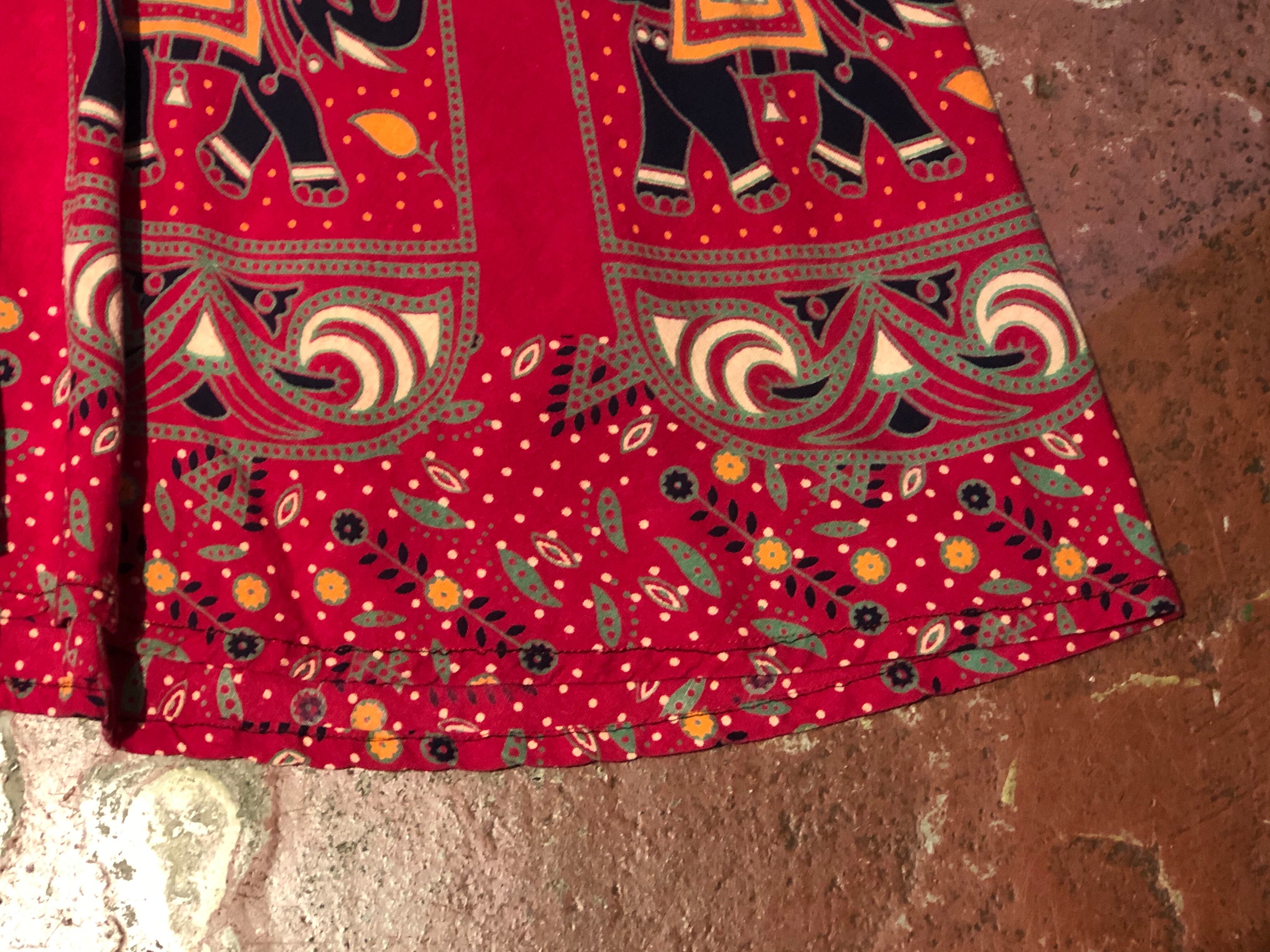 色鮮やかなレッドボディに鳥、ラクダ、像などがプリントされた1着。