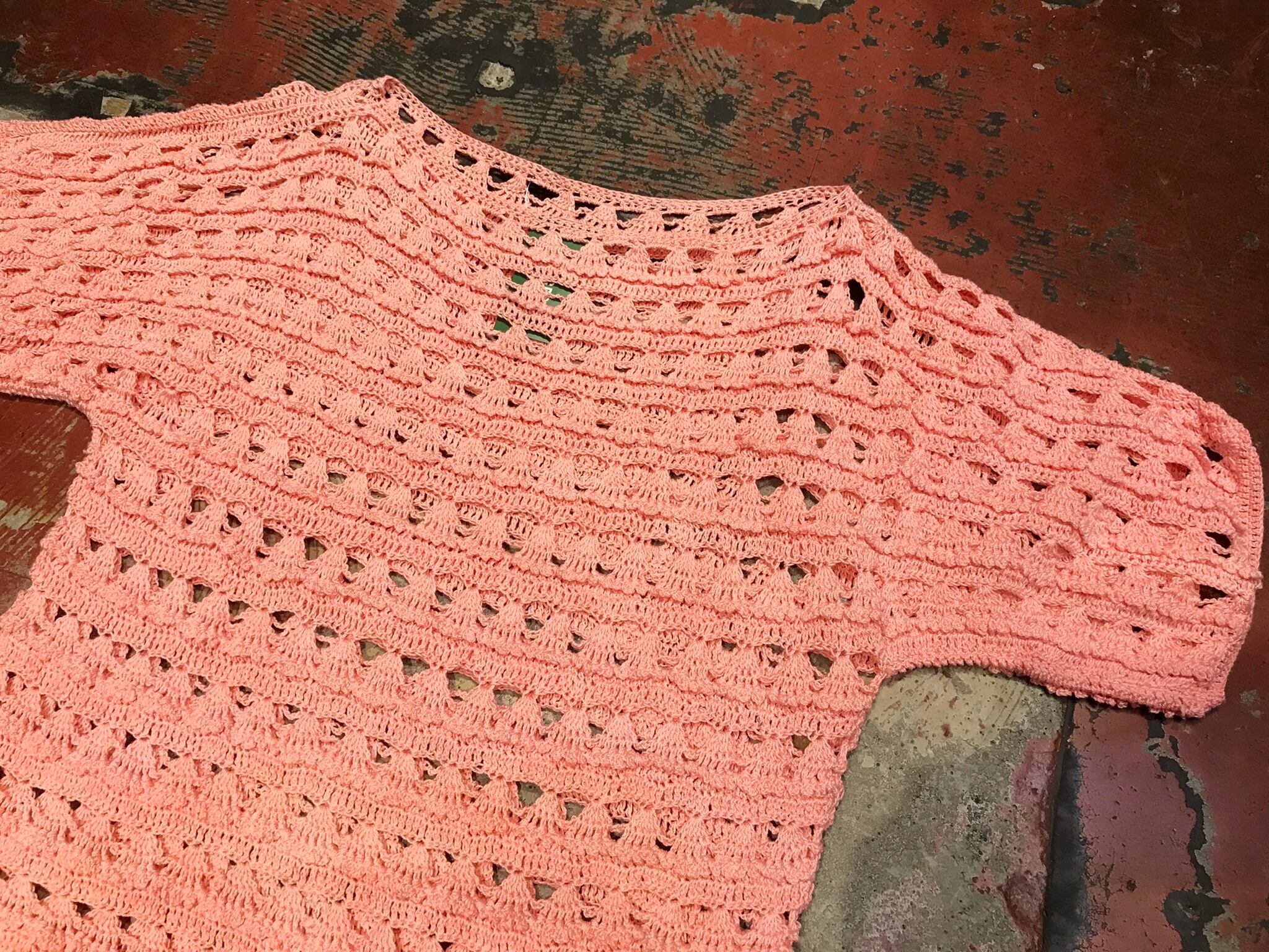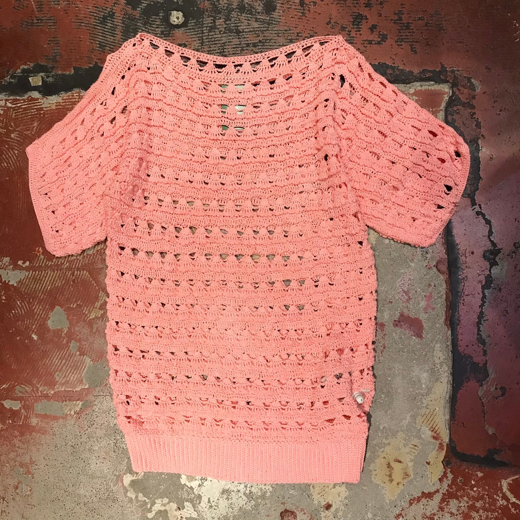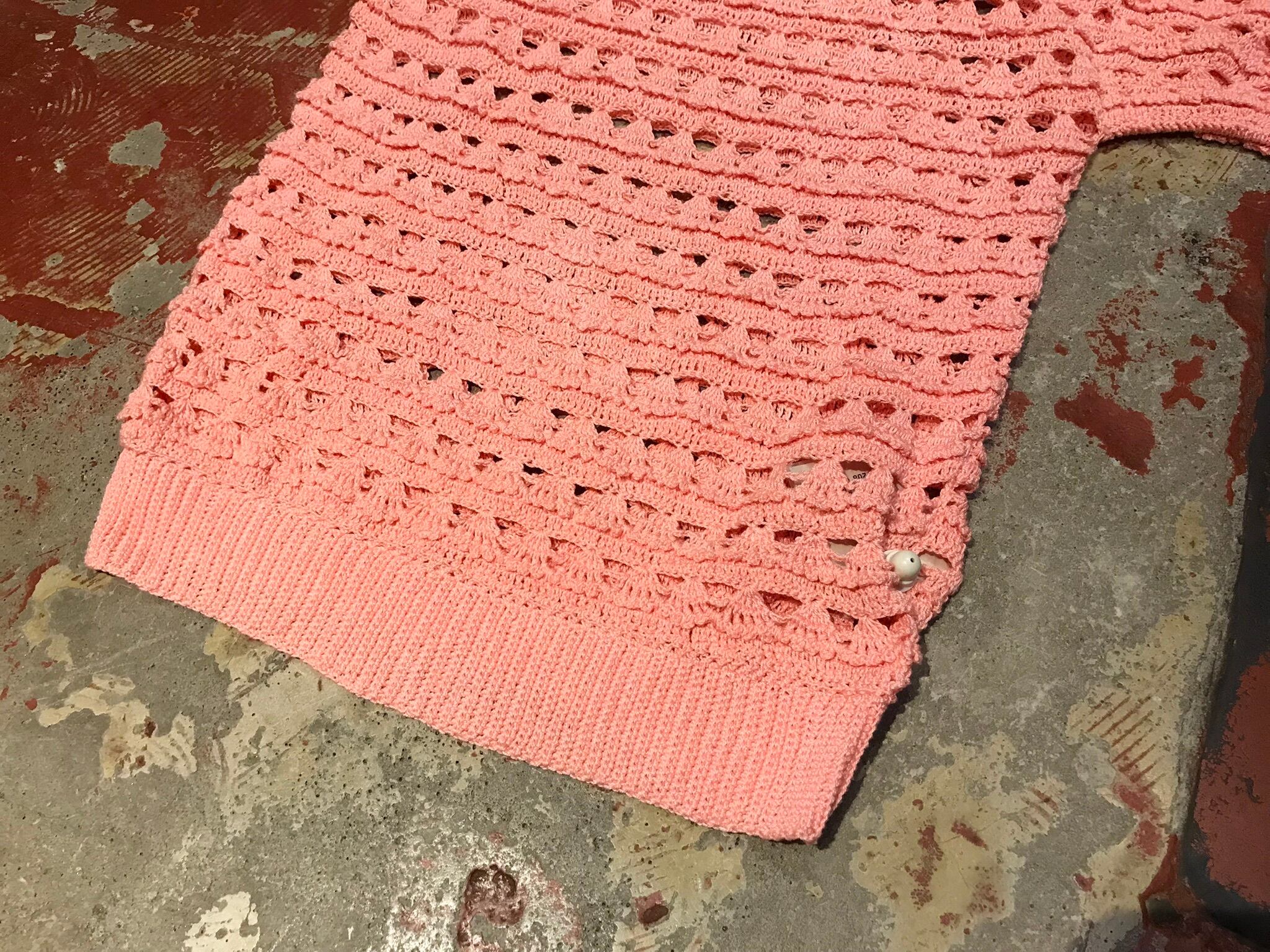 こちらは可愛らしい桜ピンクカラーで、ヒラヒラしたクロシェデザインが可愛らしい1着。