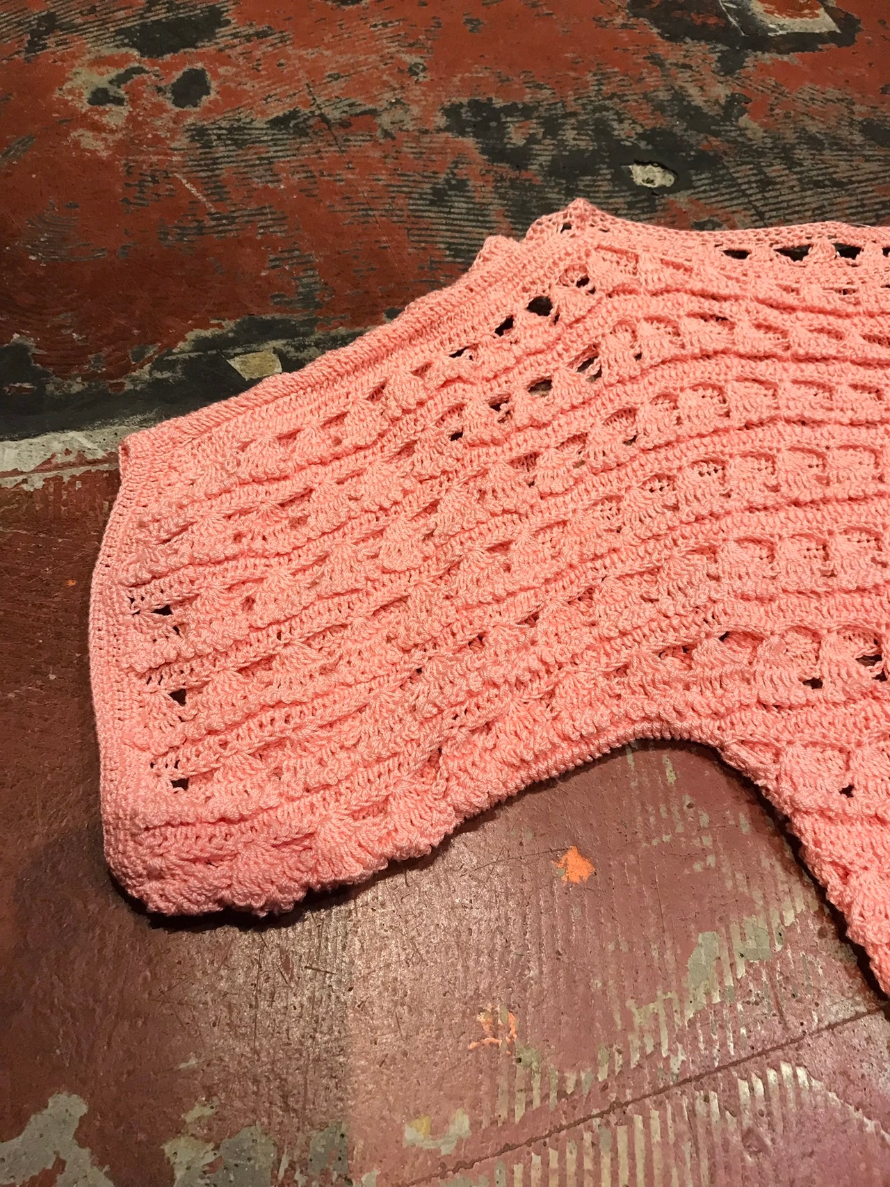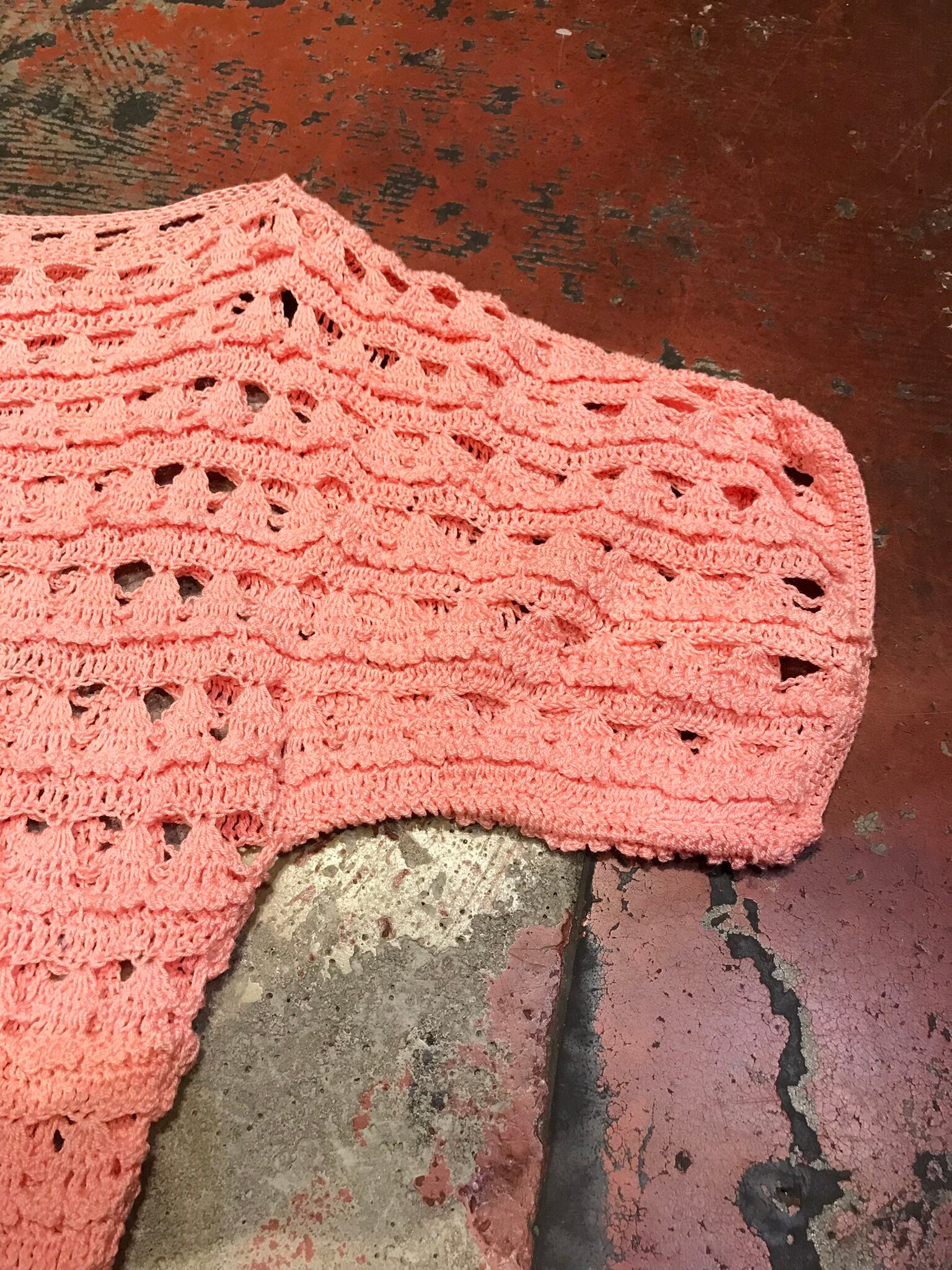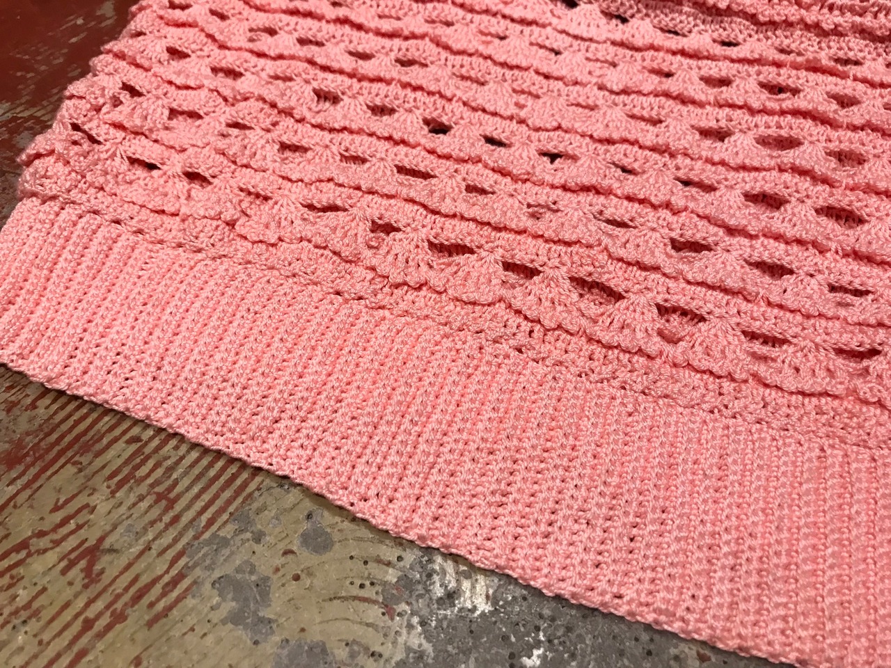 こちらは可愛らしい桜ピンクカラーで、ヒラヒラしたクロシェデザインが可愛らしい1着。