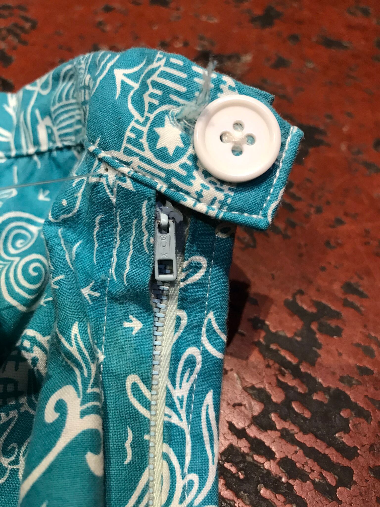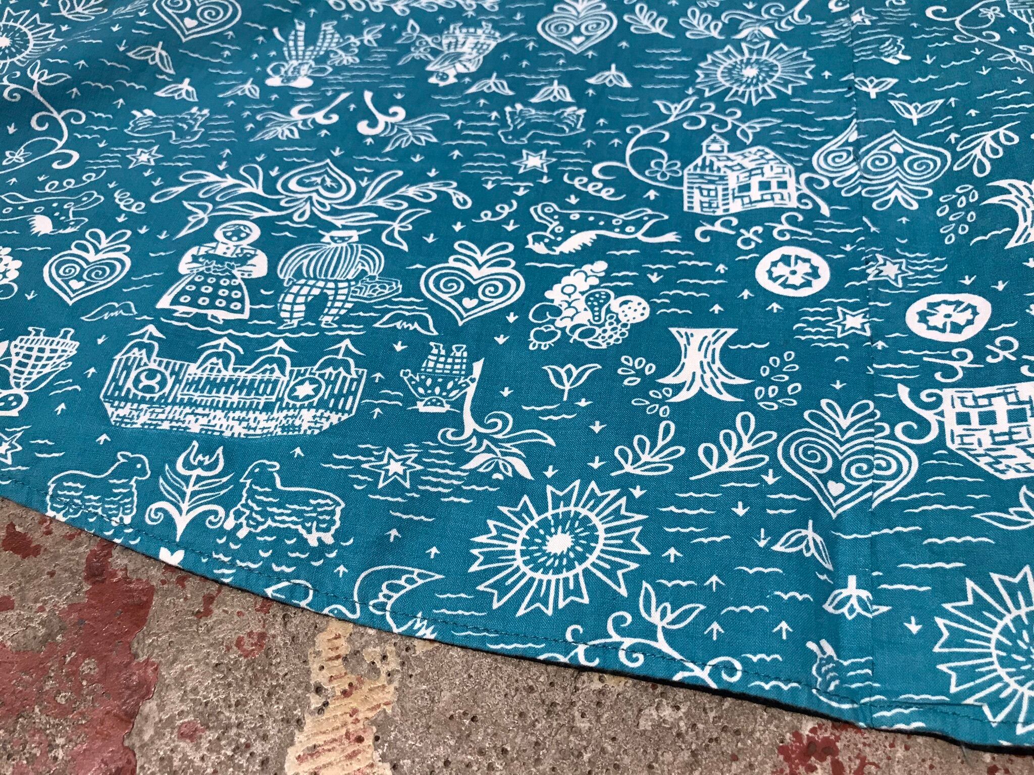 鮮やかなターコイズブルーボディに映えるチロリアンパターンが可愛らしい1着。