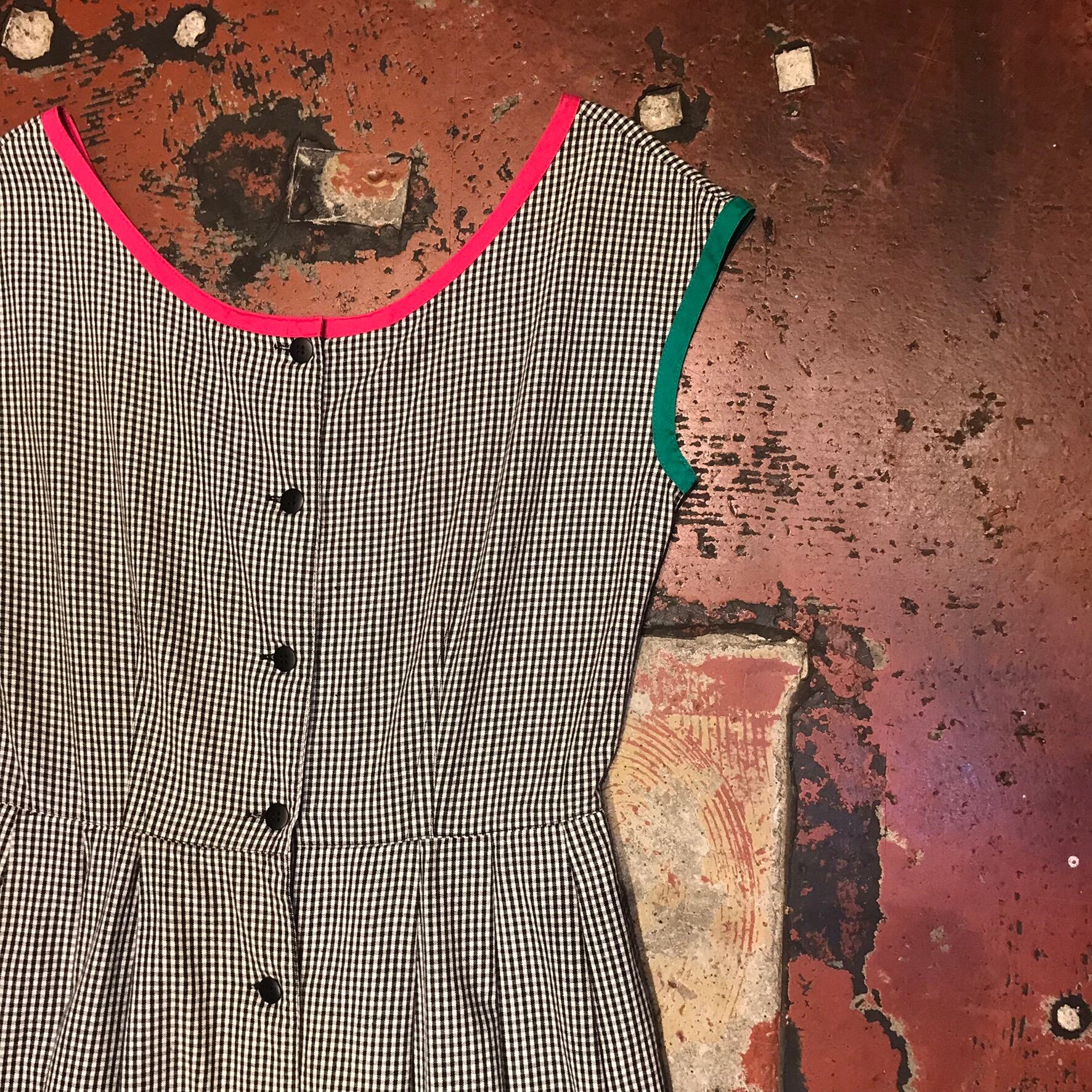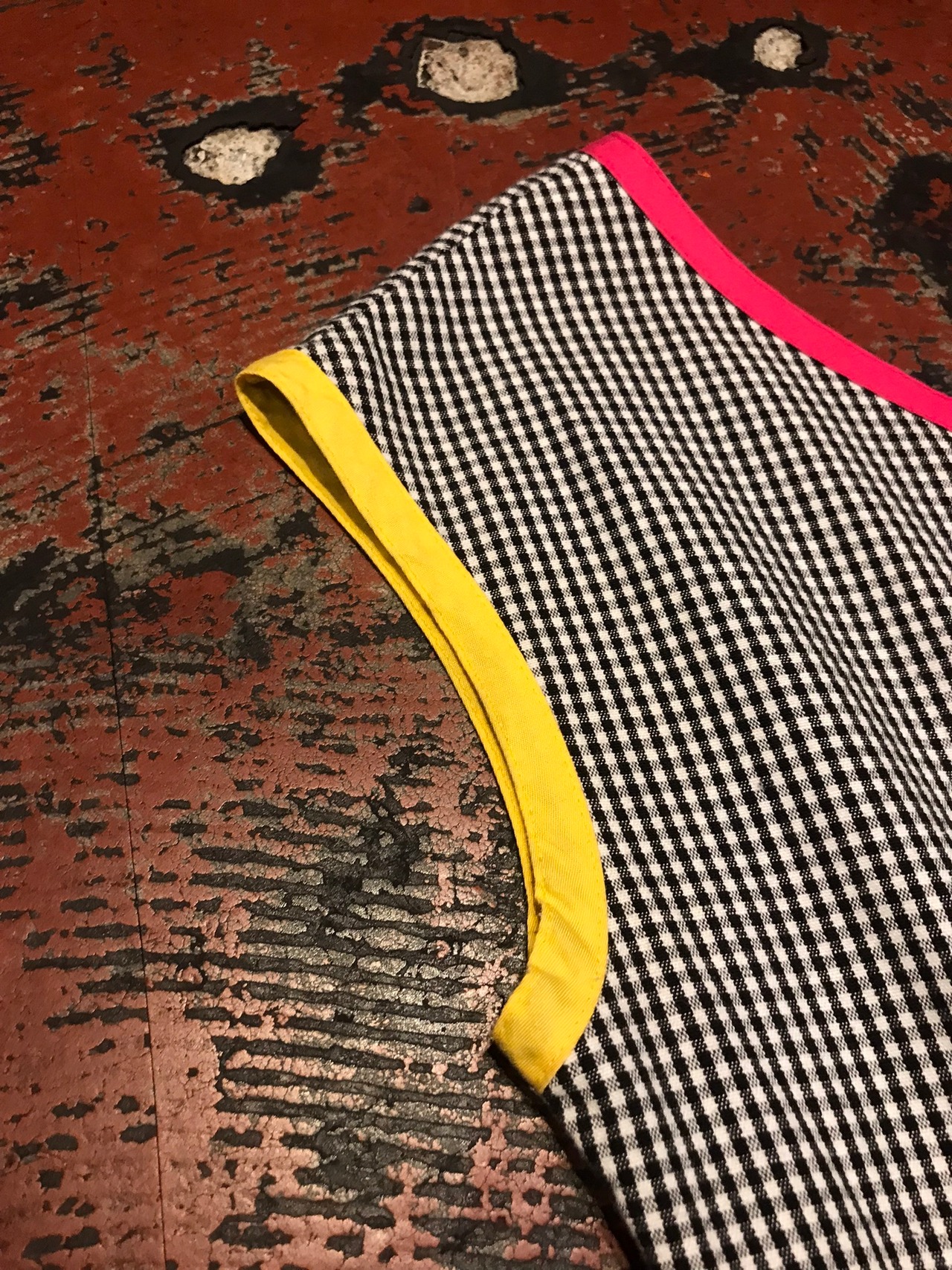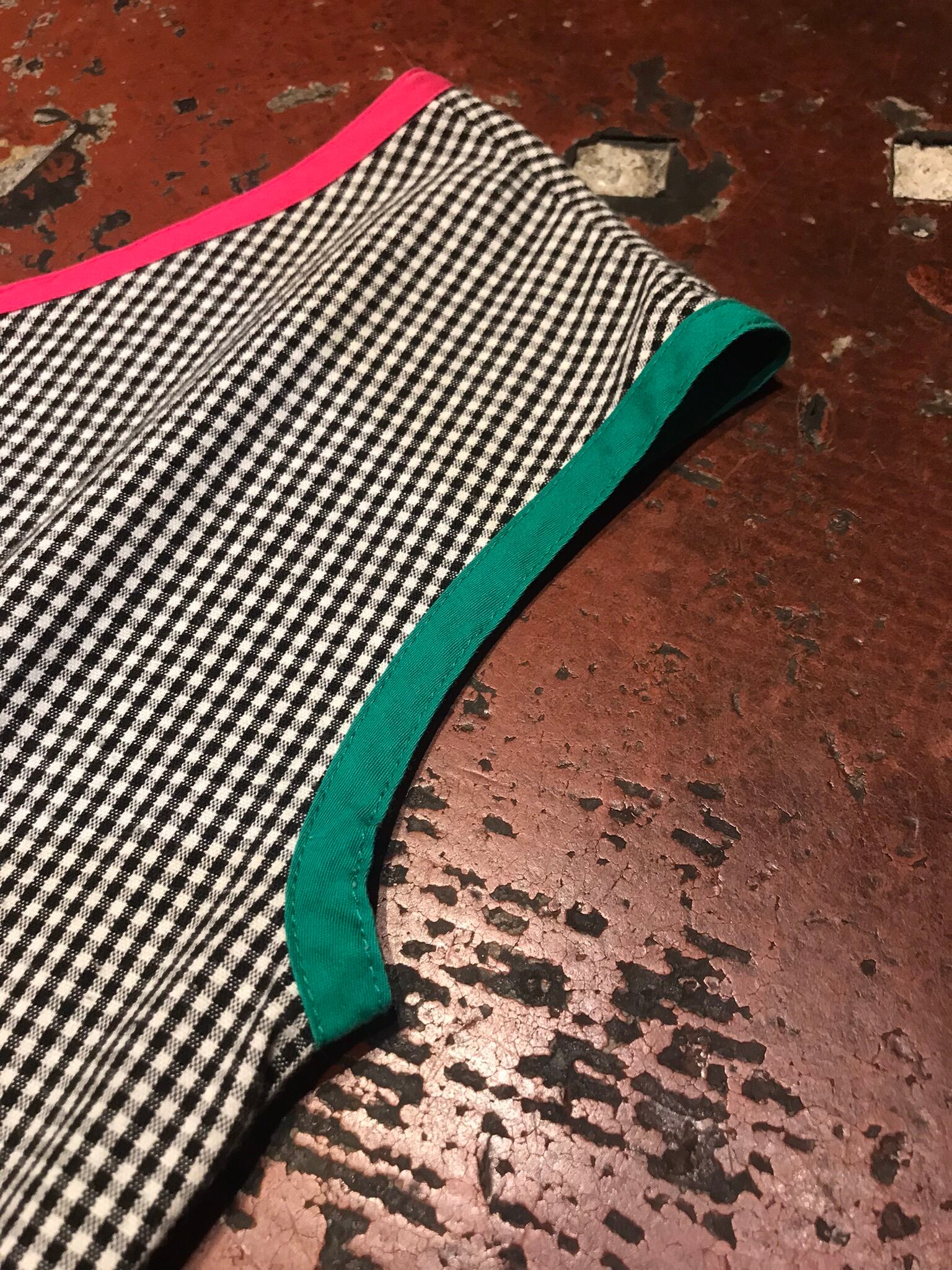 ブラックとホワイトの細かいチェックに、ネックラインとアームホールにはカラフルなパイピングが施された可愛らしいアイテム。
