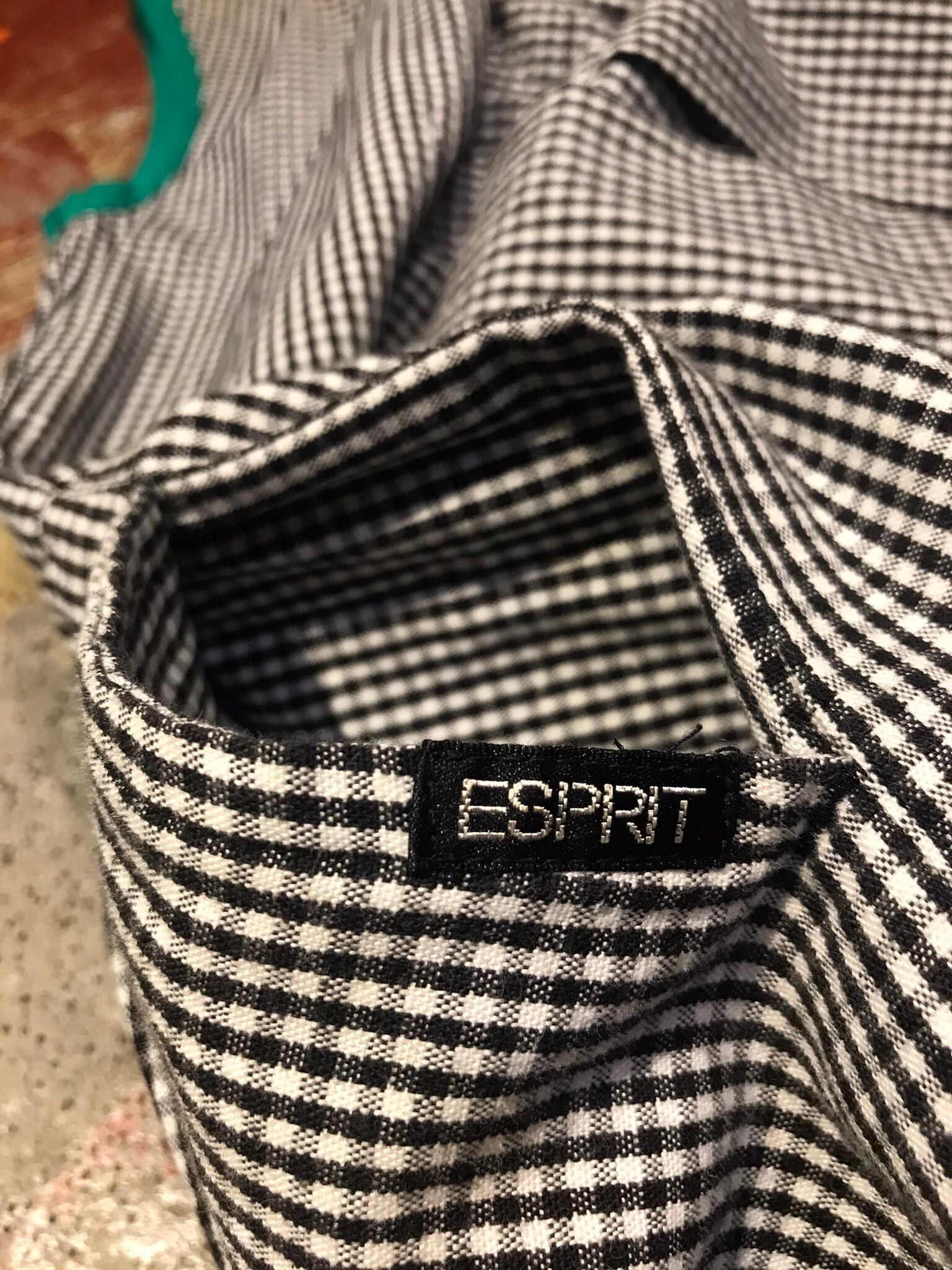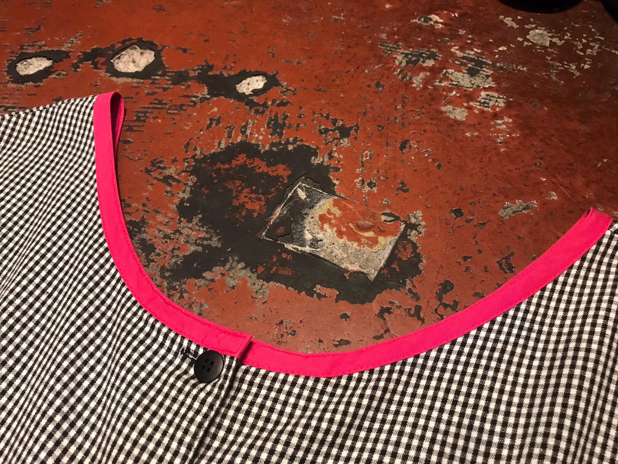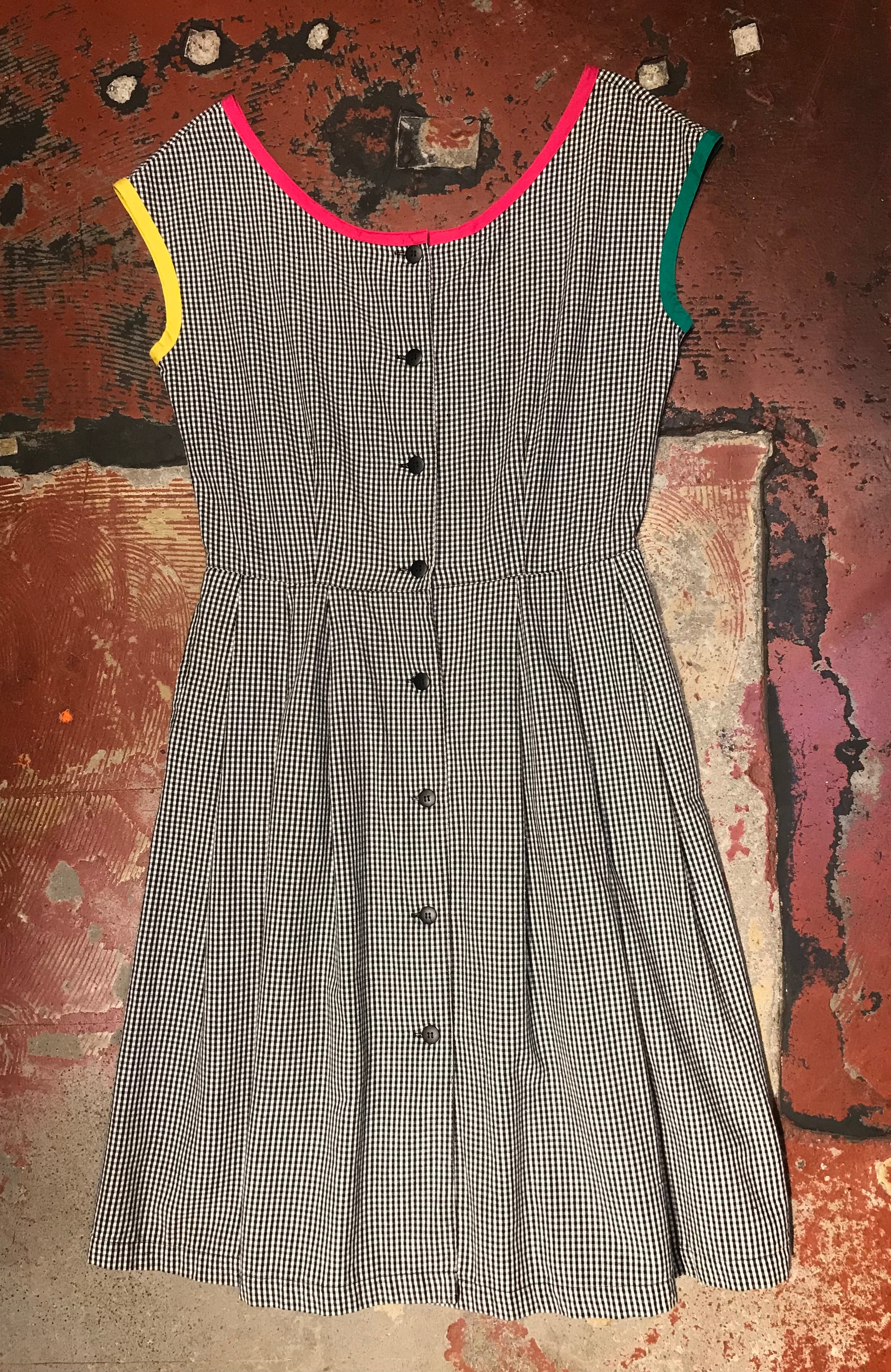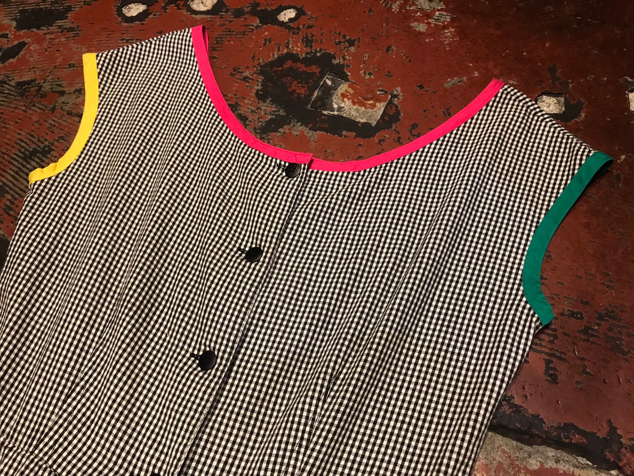 ブラックとホワイトの細かいチェックに、ネックラインとアームホールにはカラフルなパイピングが施された可愛らしいアイテム。