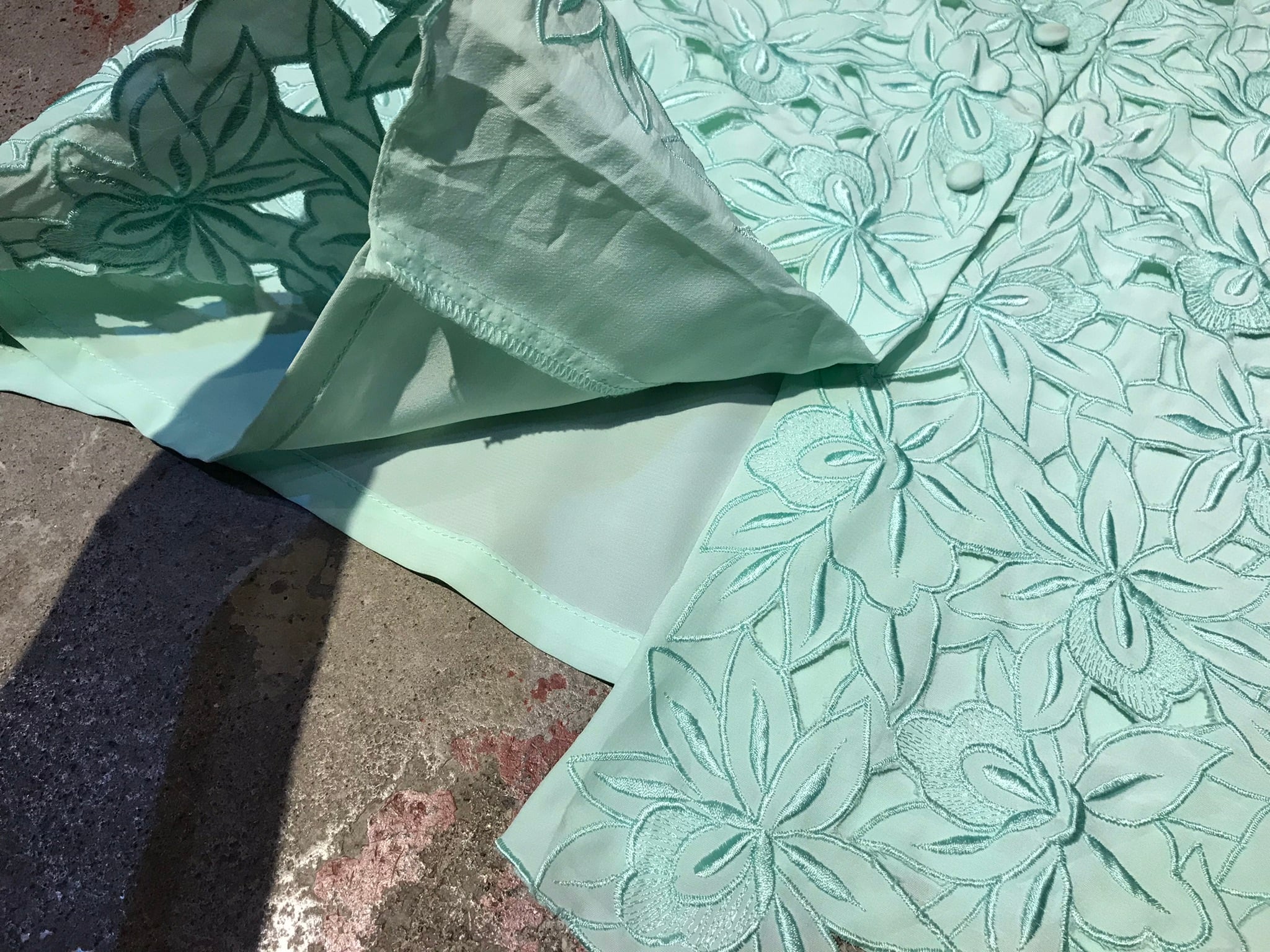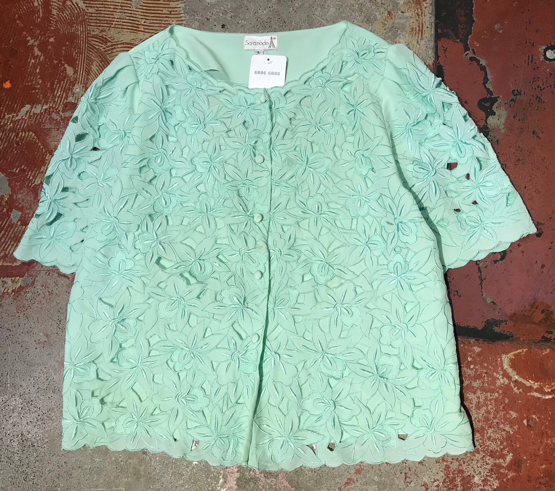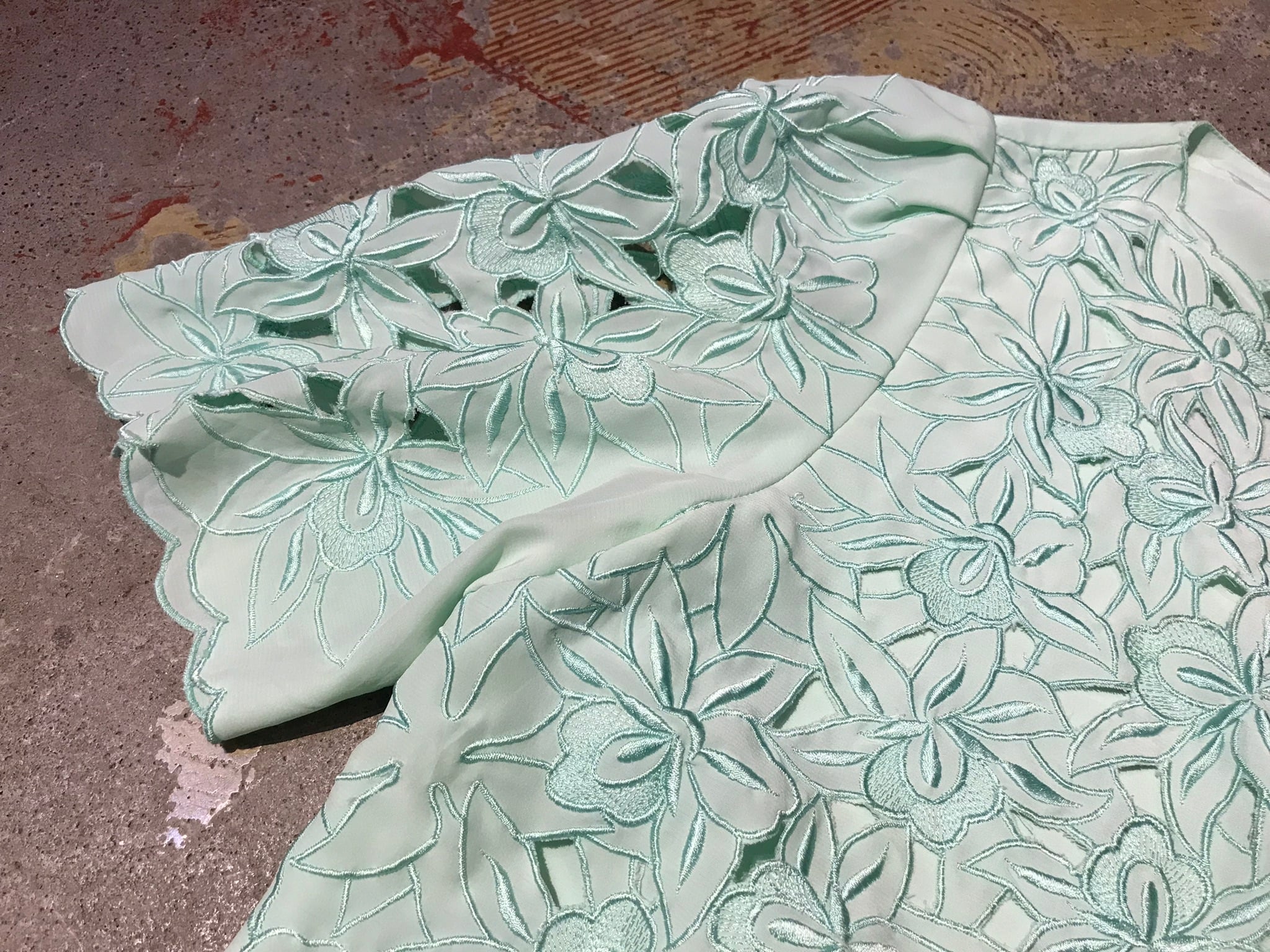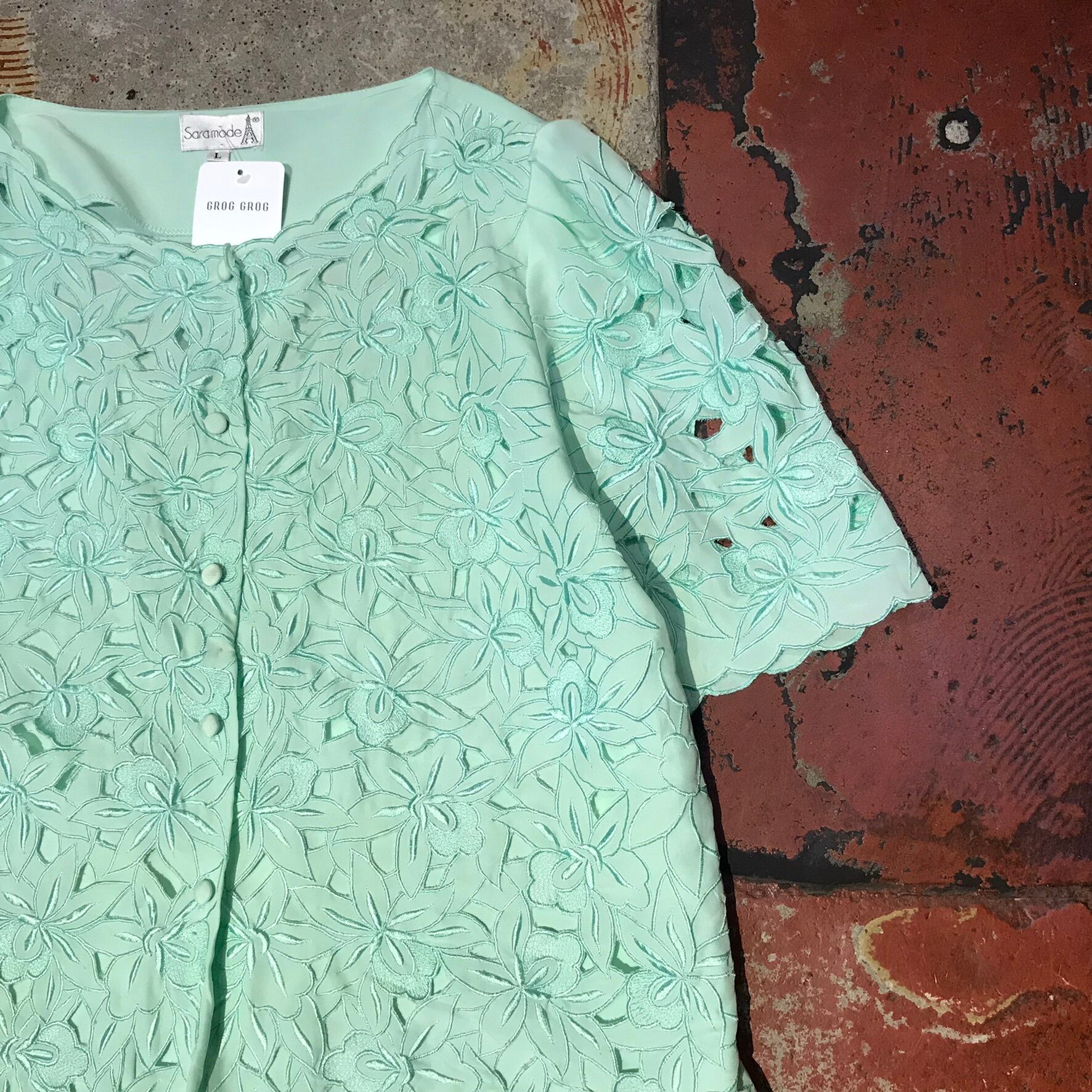袖フロントがレースのようにカットワーク刺繍されたアイテム。