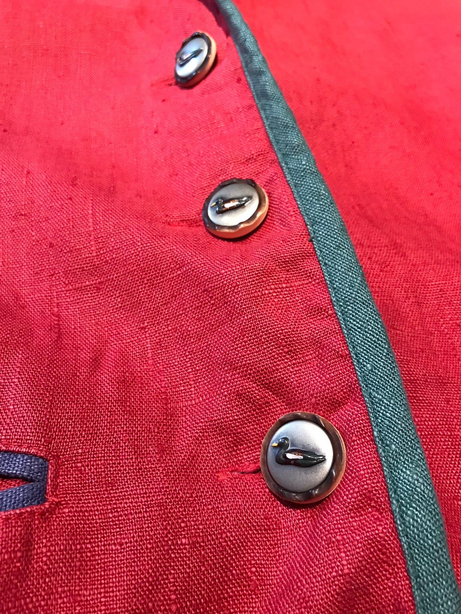 風合いのあるリネン生地で重厚感があり、シンプルな形ながらもカモのデザインが施されたボタンがアクセントになっております。