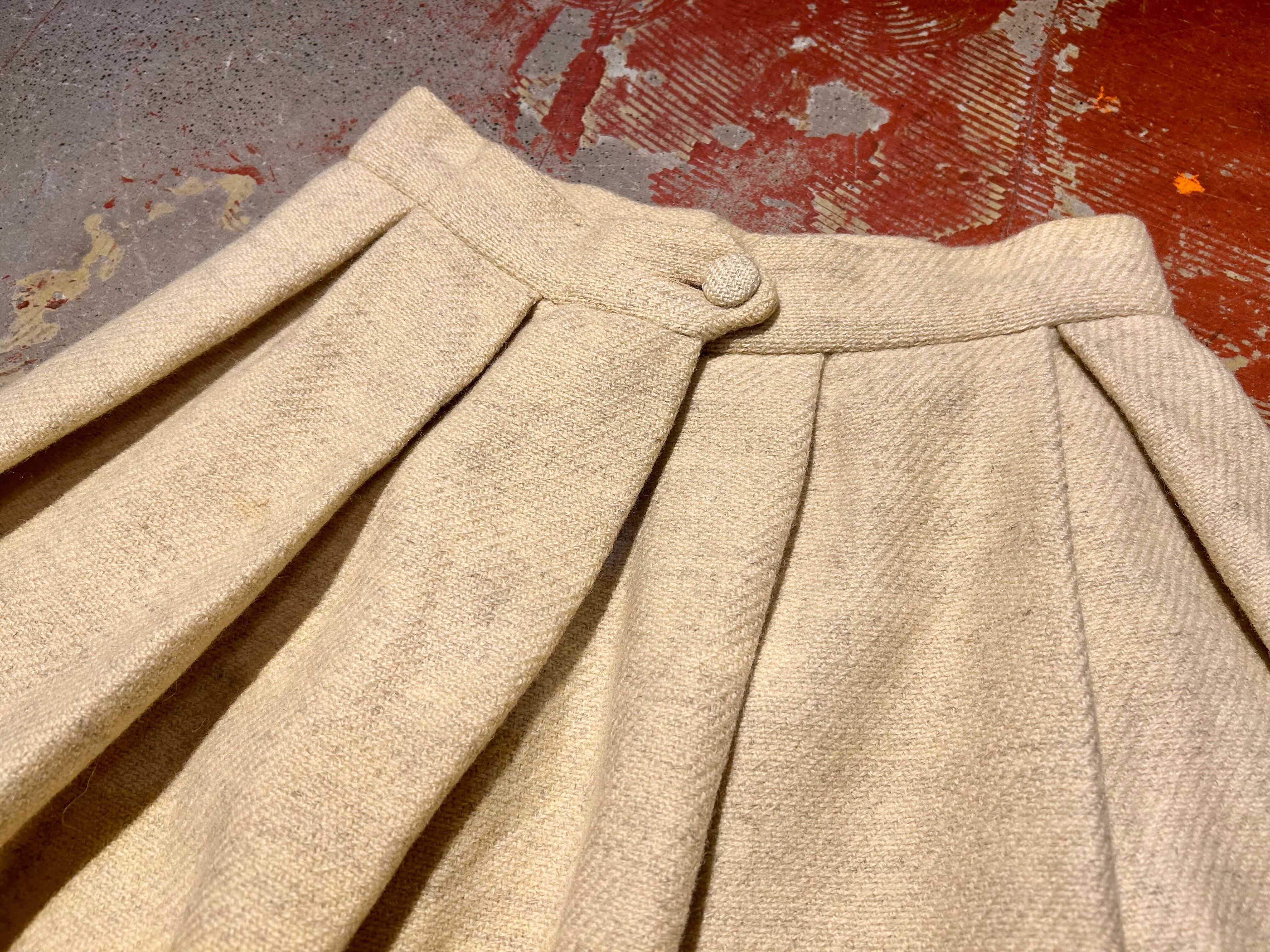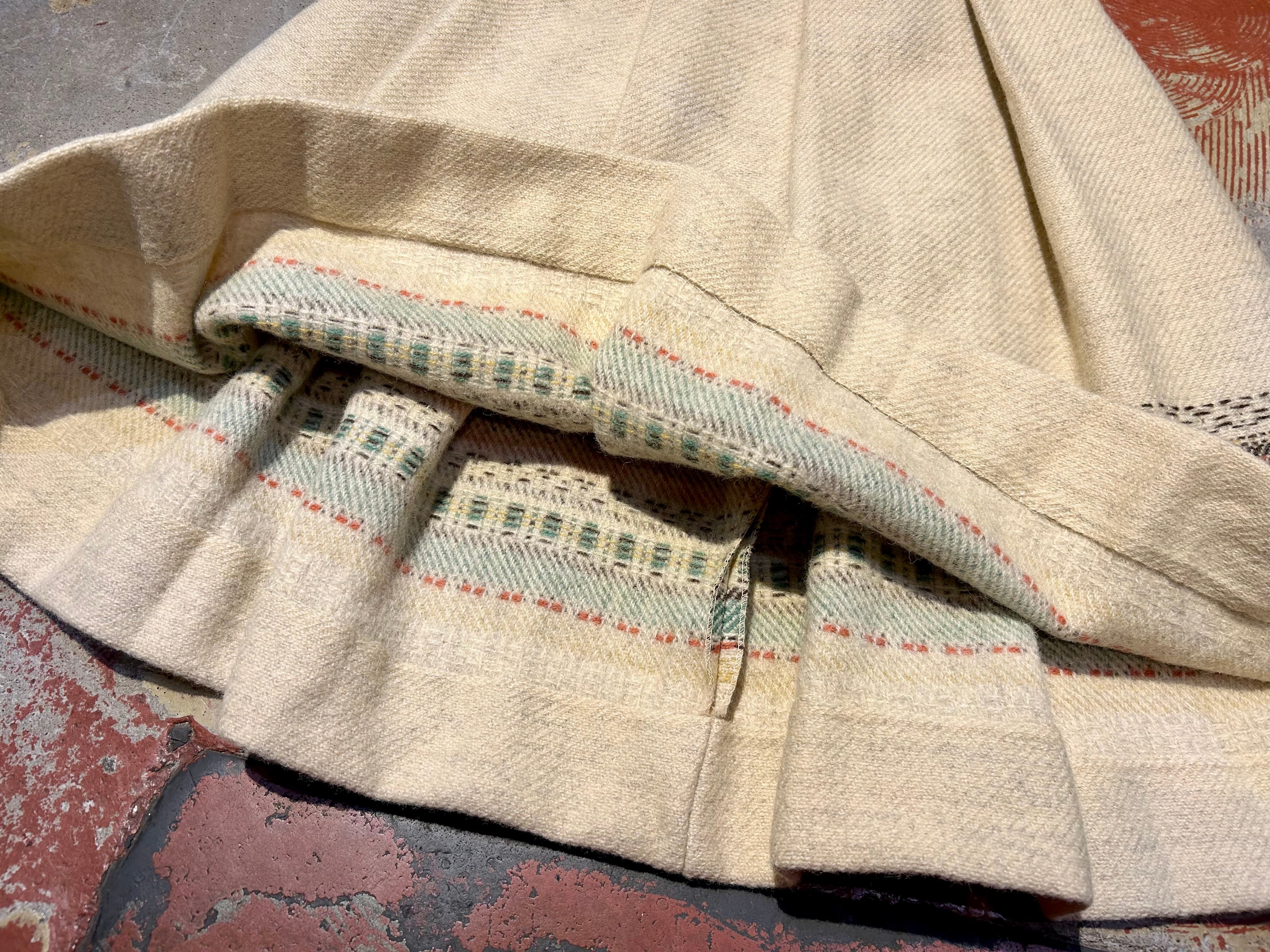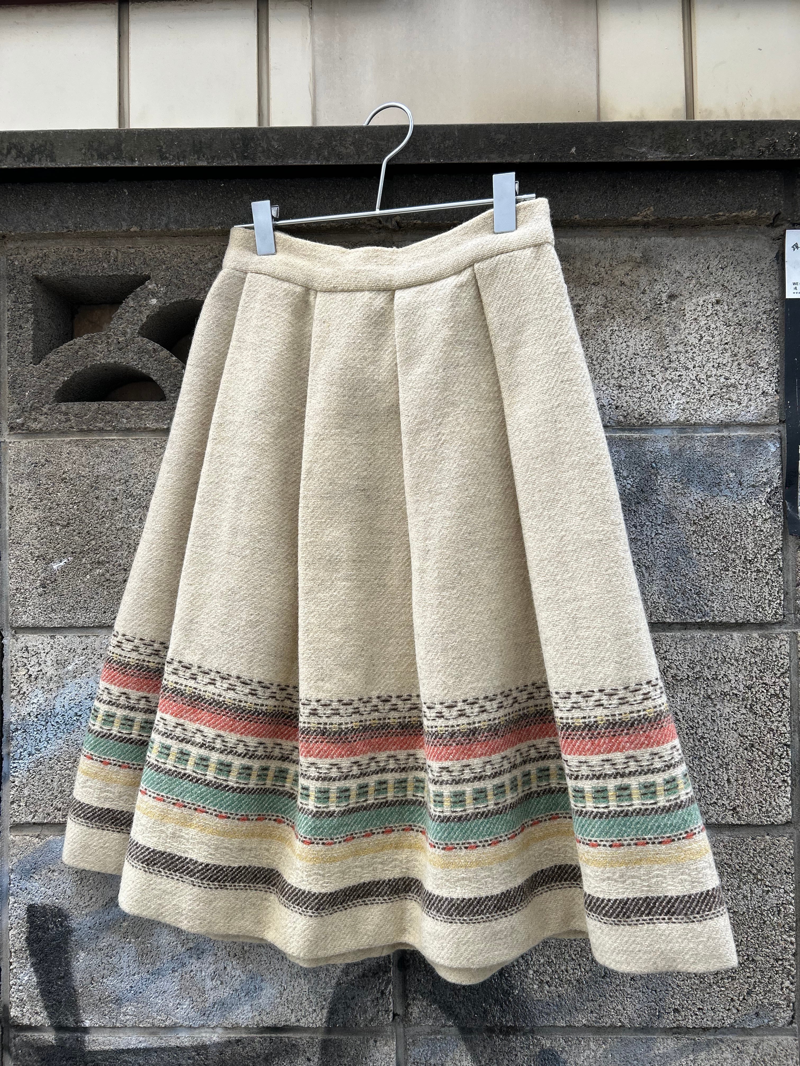 恐らくウールのしっかりとしたボディと大きめのプリーツとネイティブな雰囲気の模様が可愛い1着。