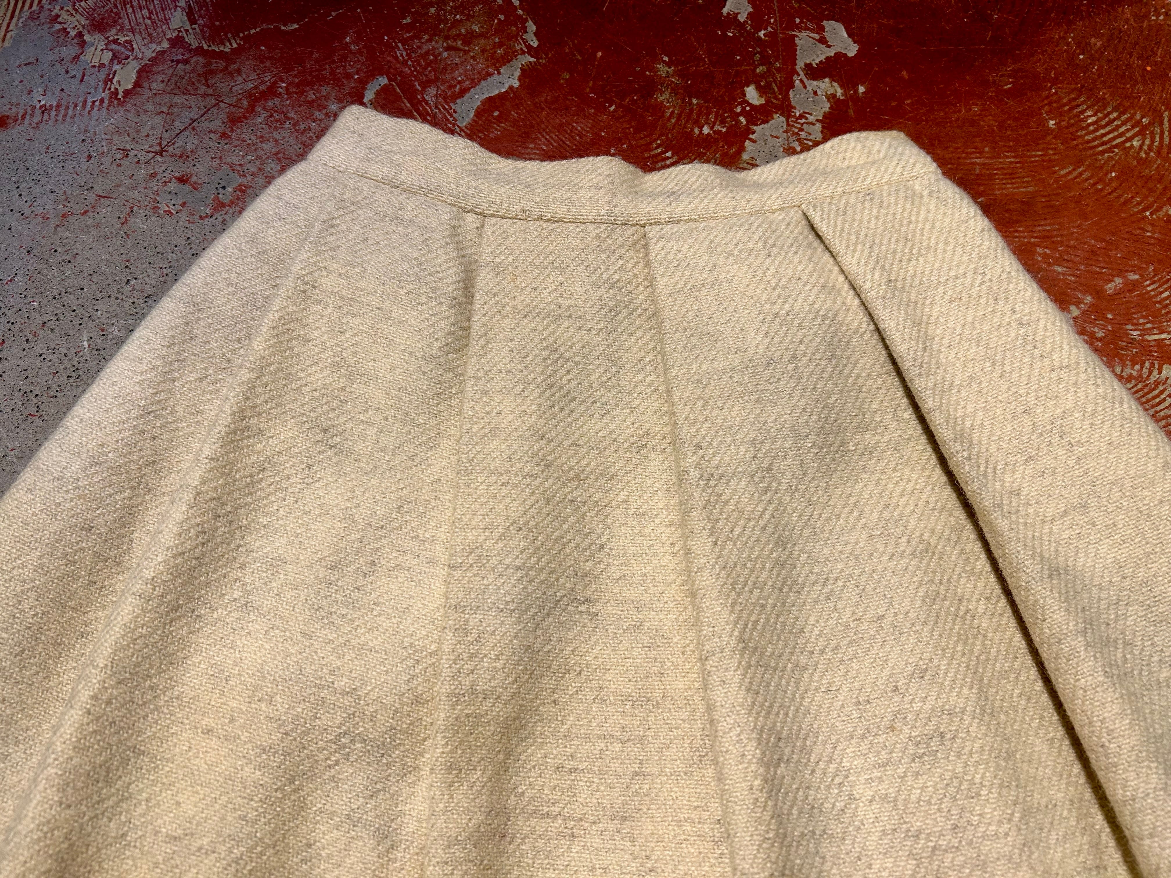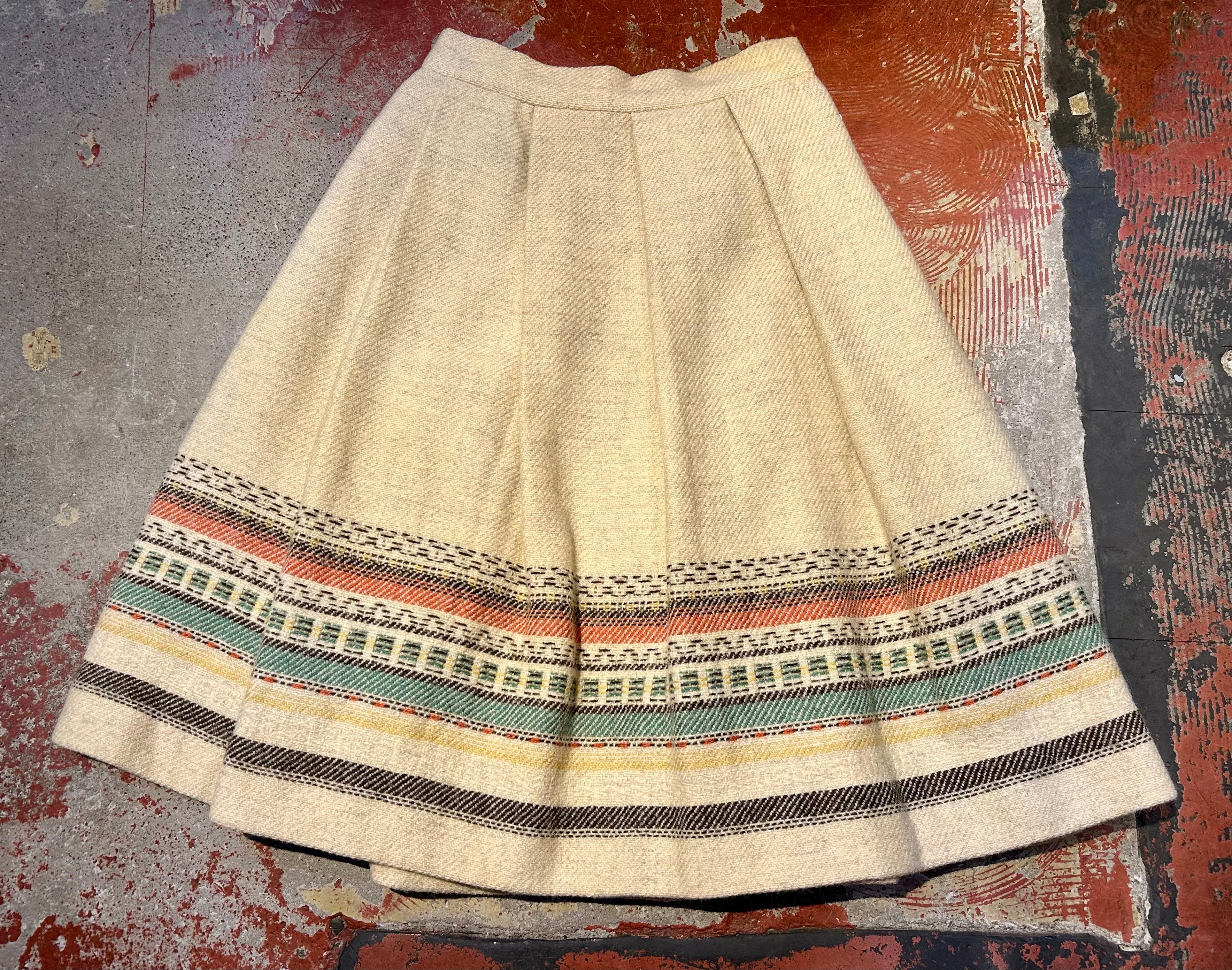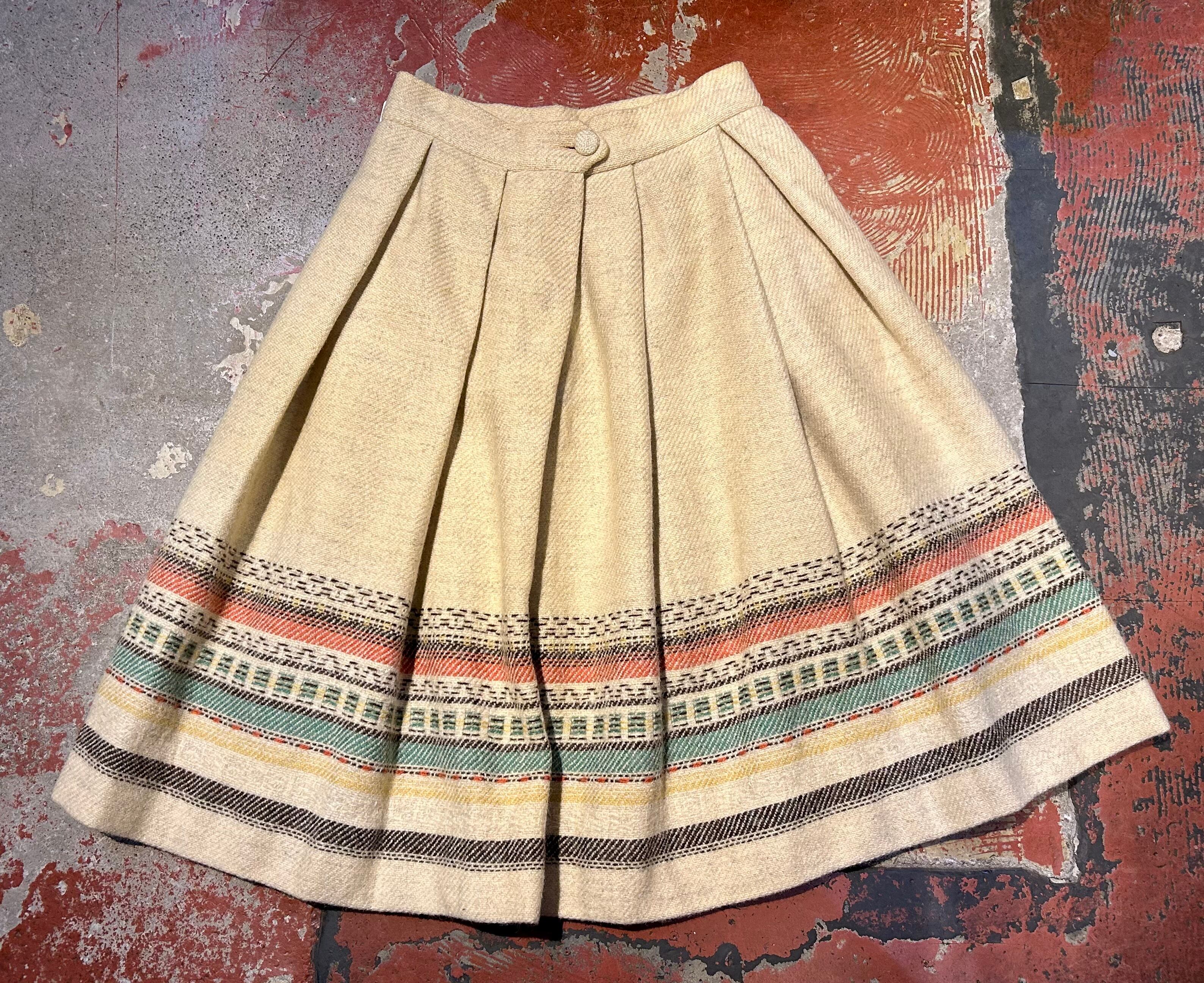 恐らくウールのしっかりとしたボディと大きめのプリーツとネイティブな雰囲気の模様が可愛い1着。
