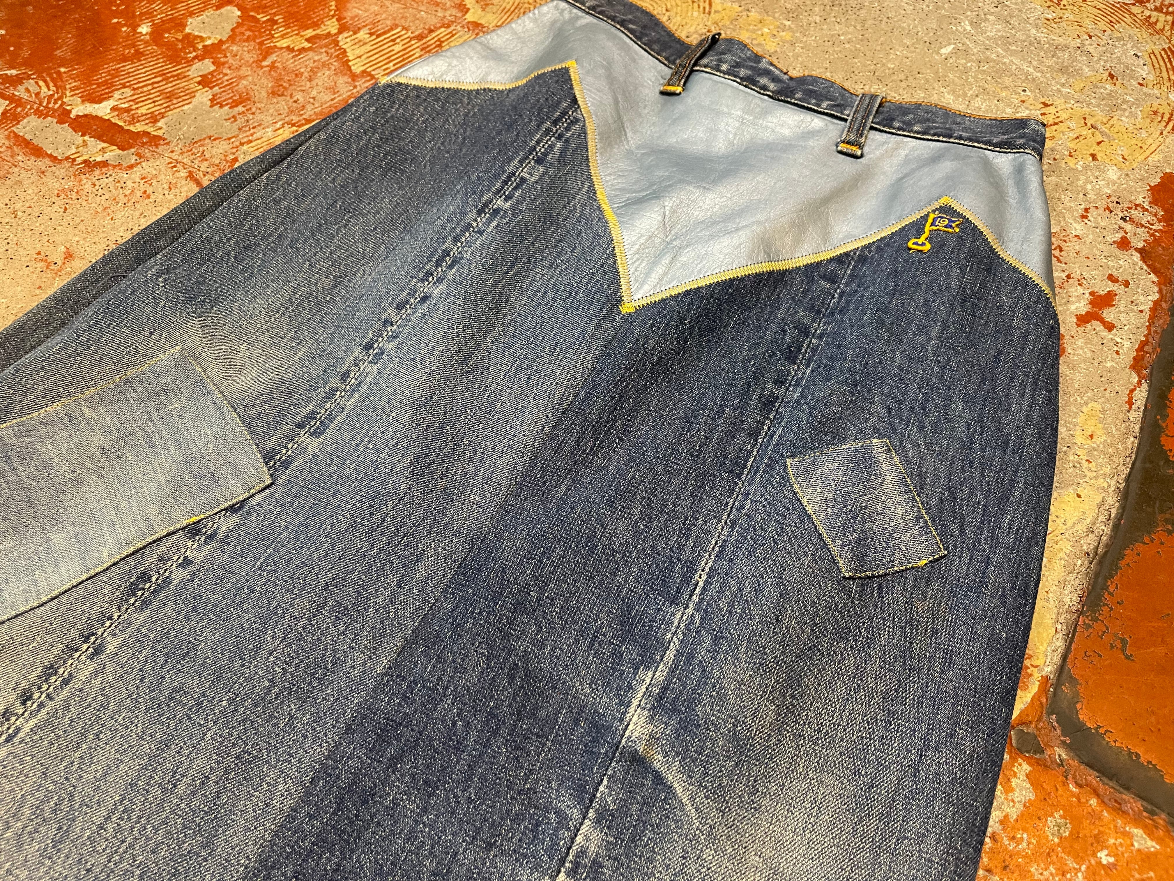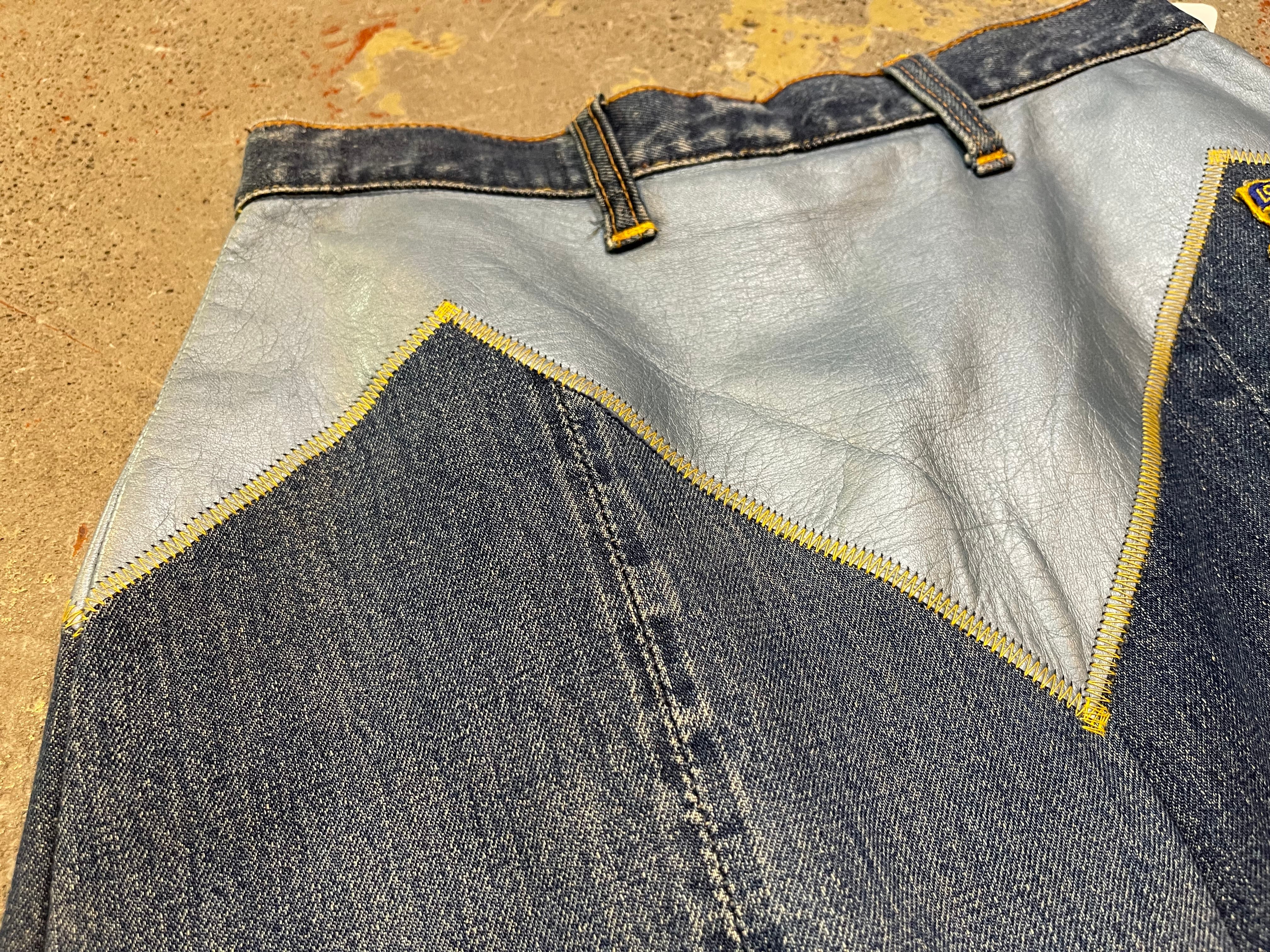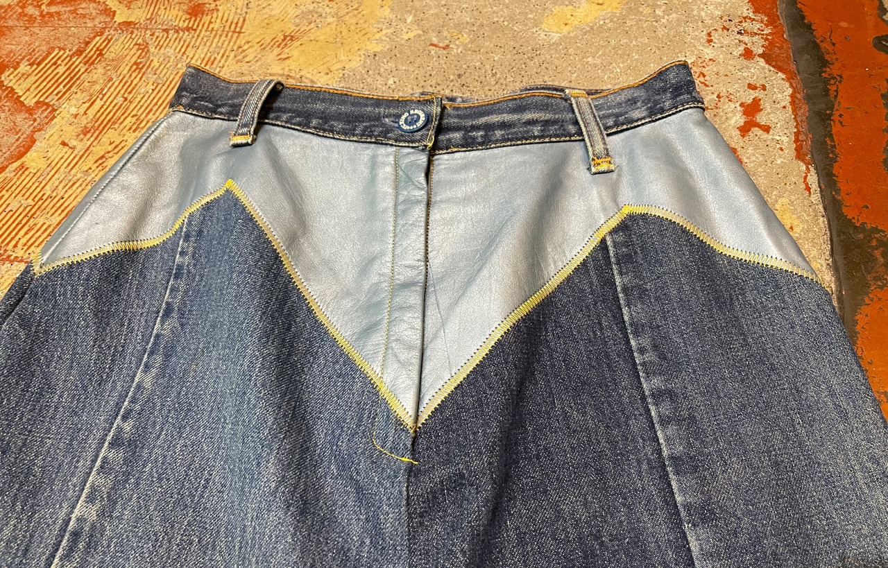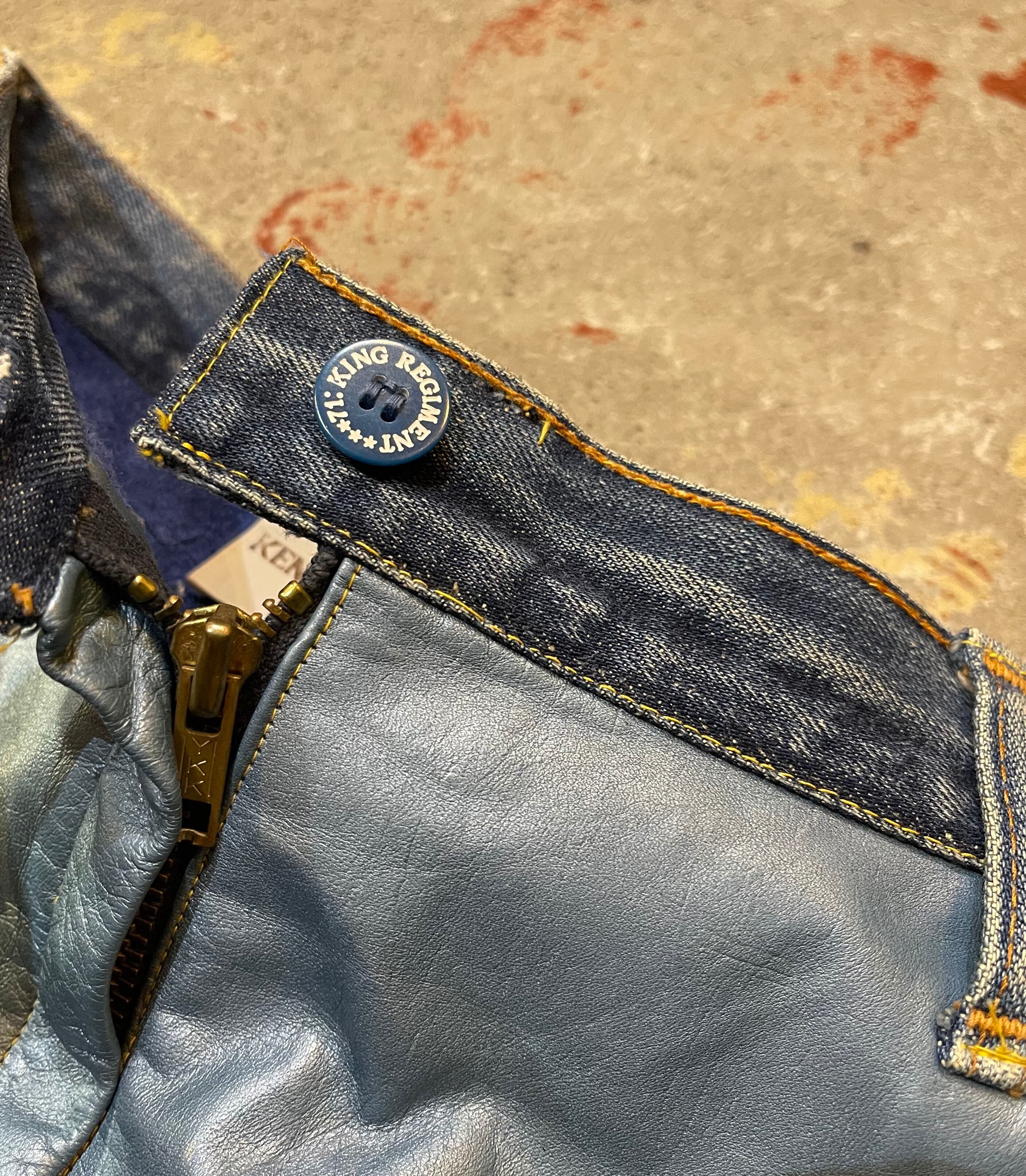 ミミ付きのビンテージデニムとレザーを用いたアイテム。