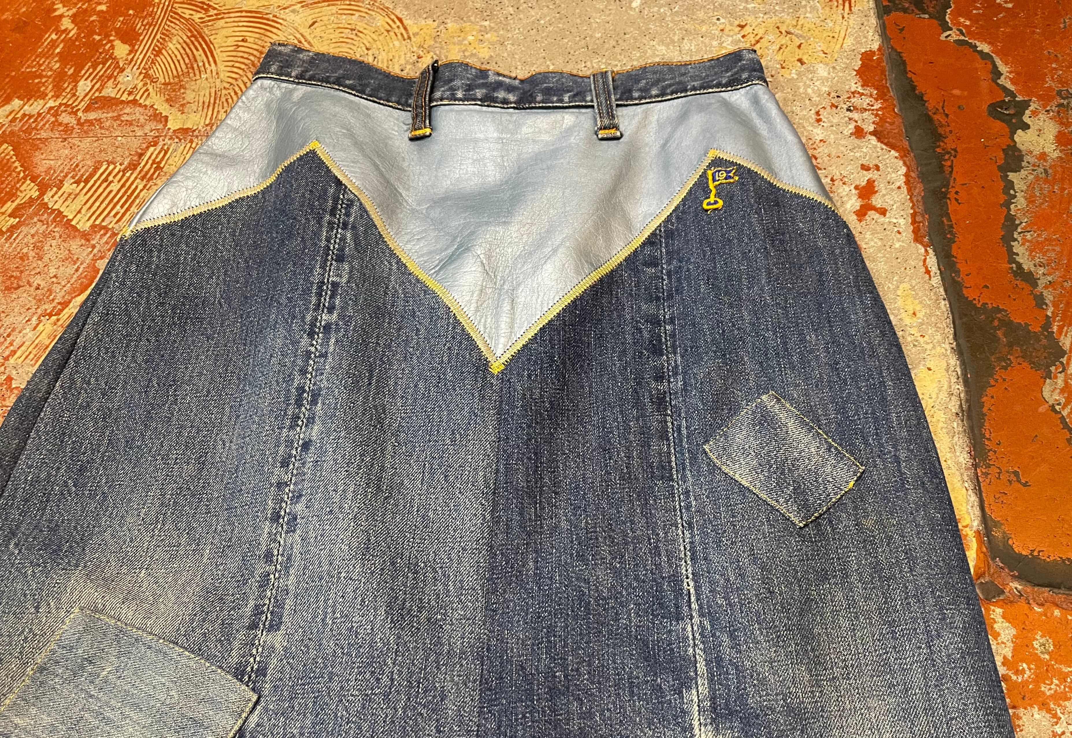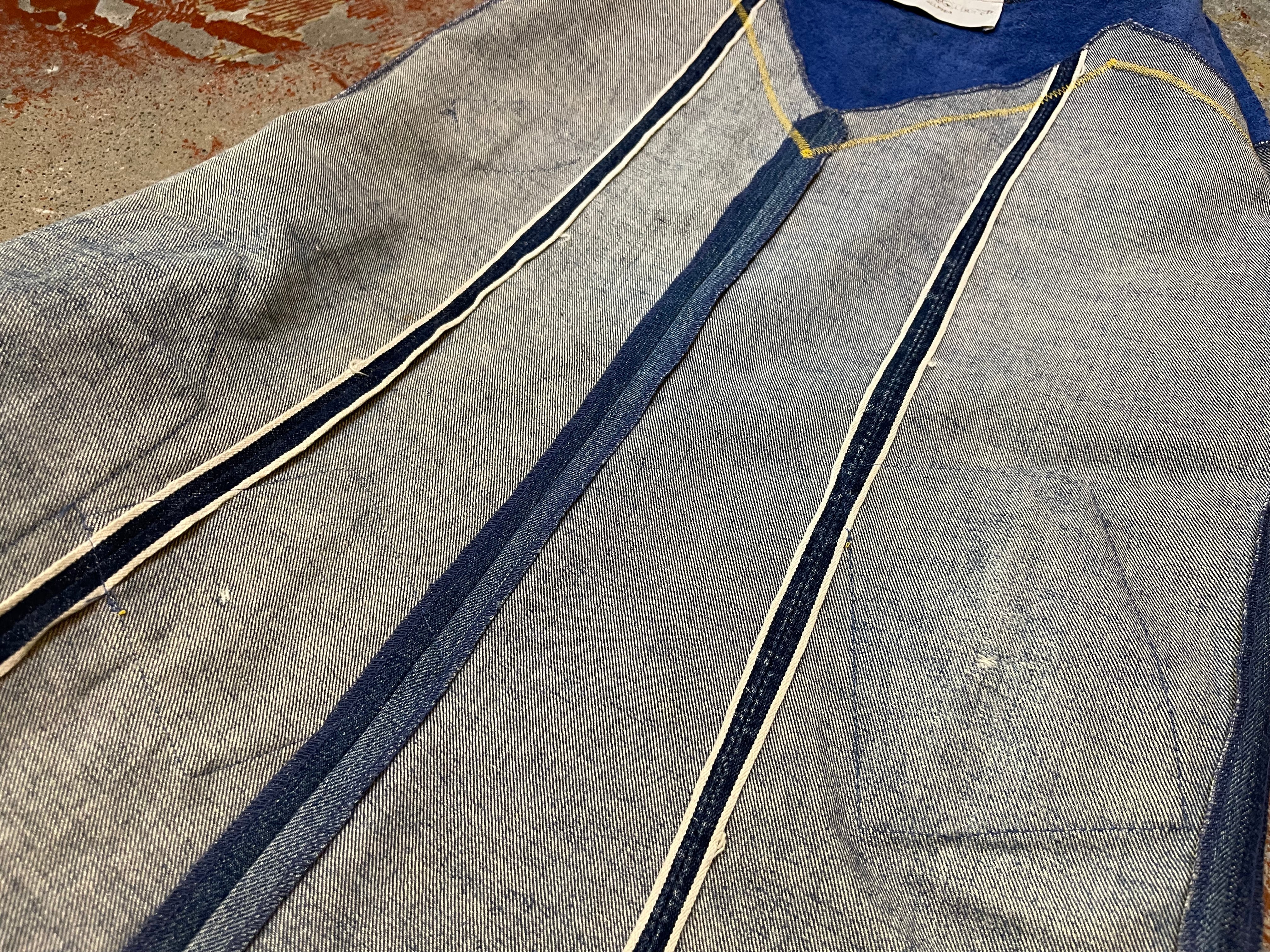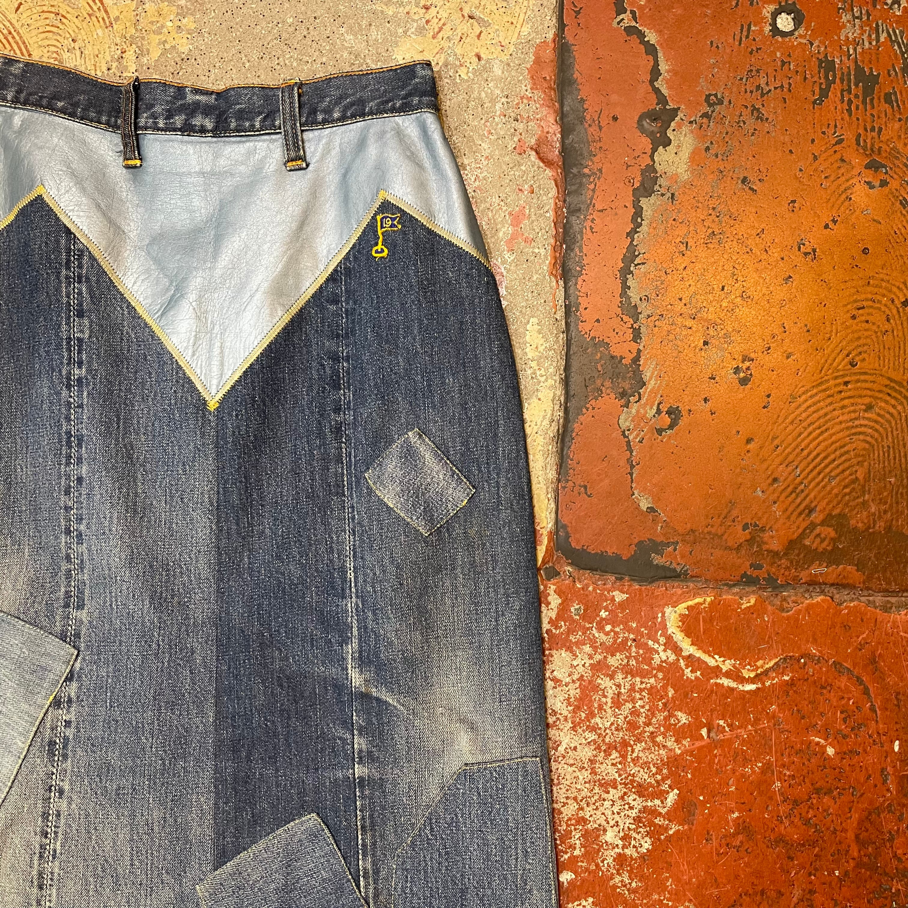 ミミ付きのビンテージデニムとレザーを用いたアイテム。