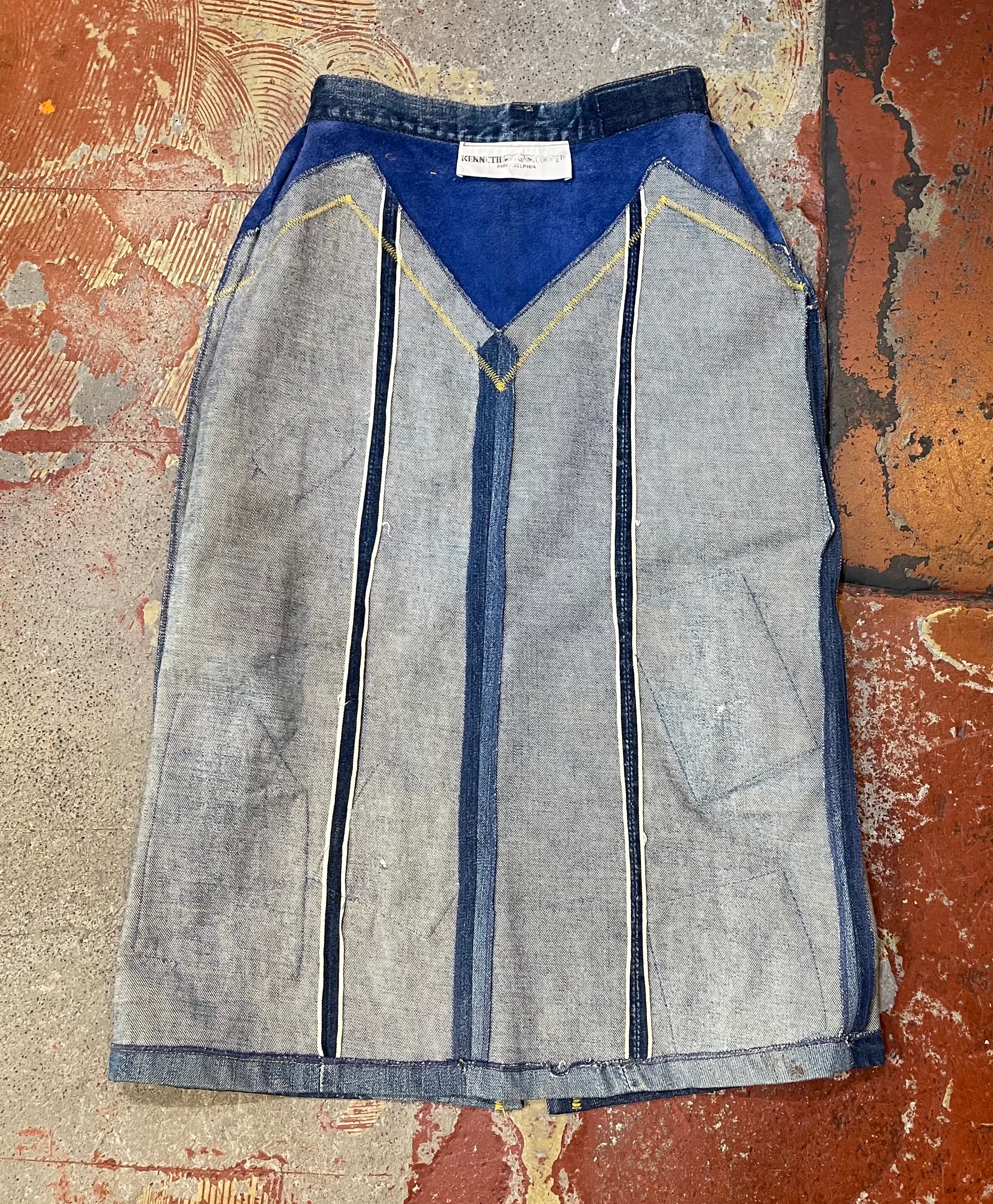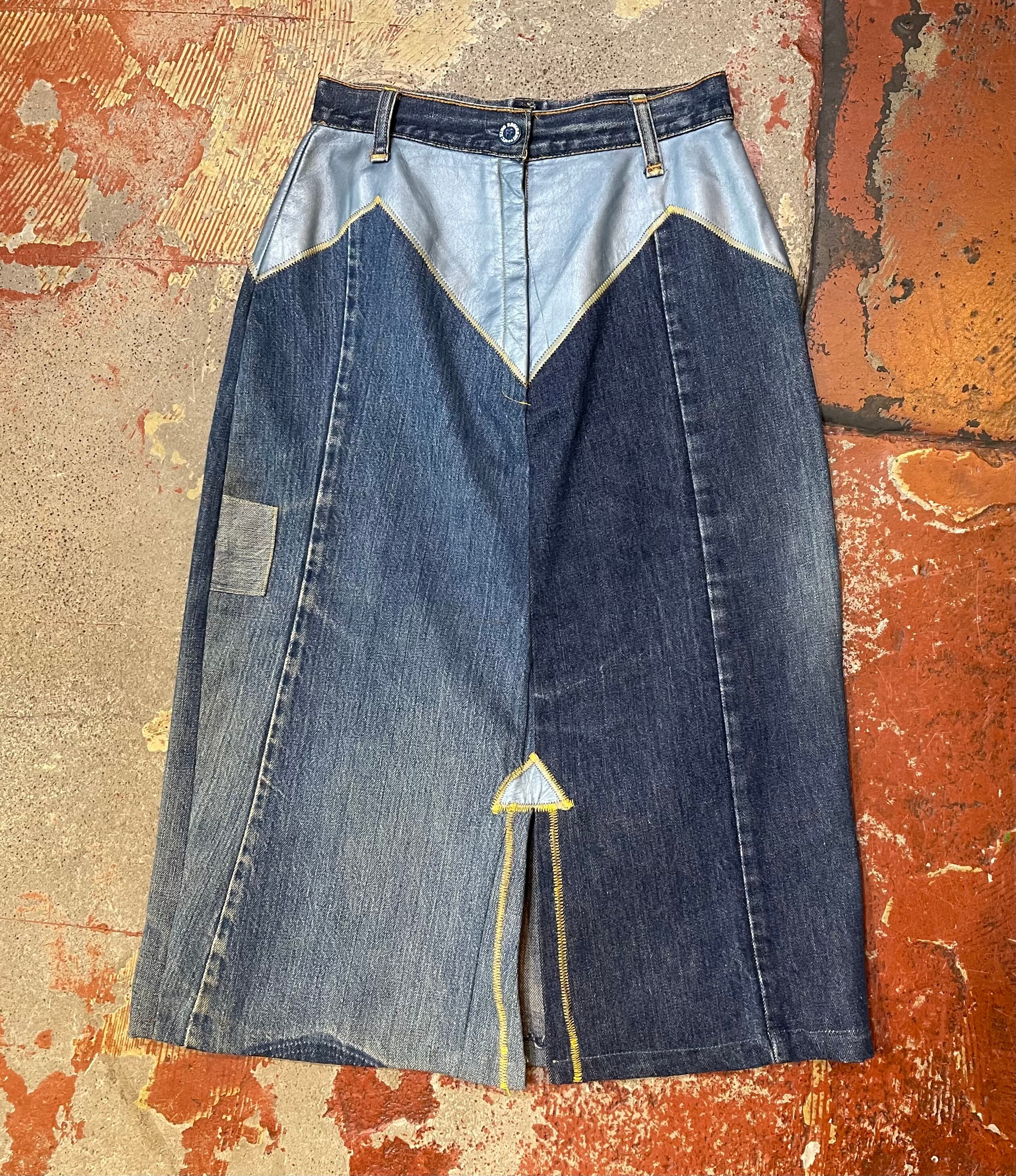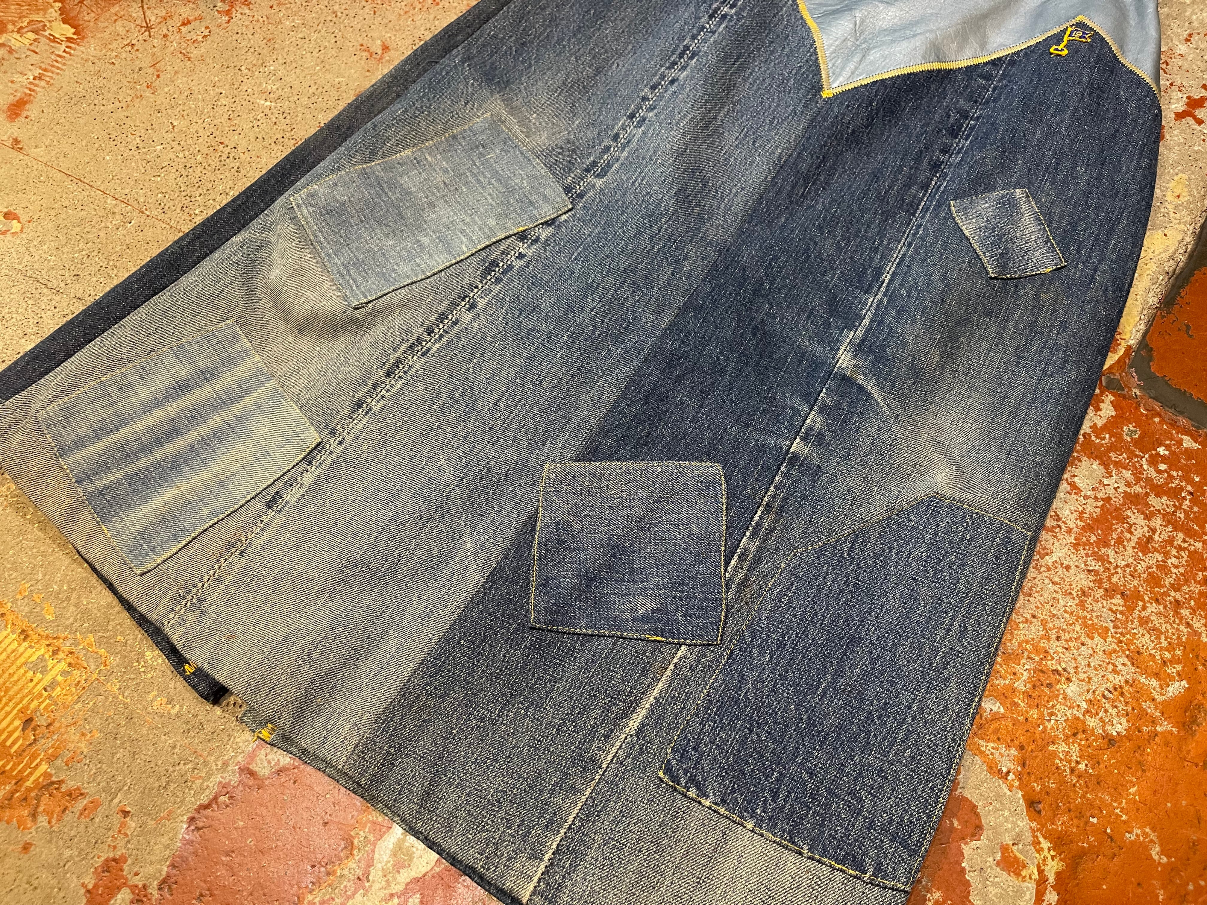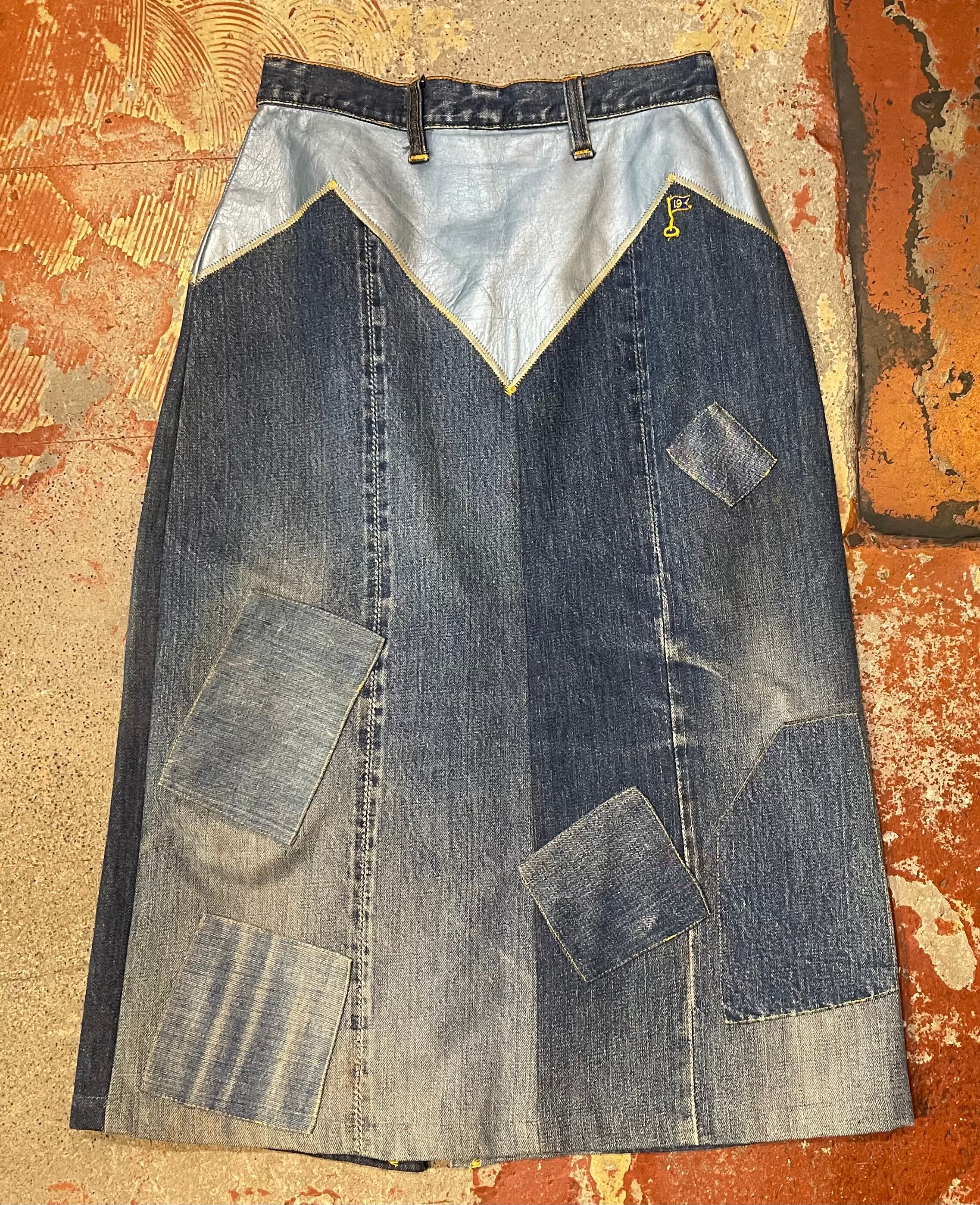 ミミ付きのビンテージデニムとレザーを用いたアイテム。