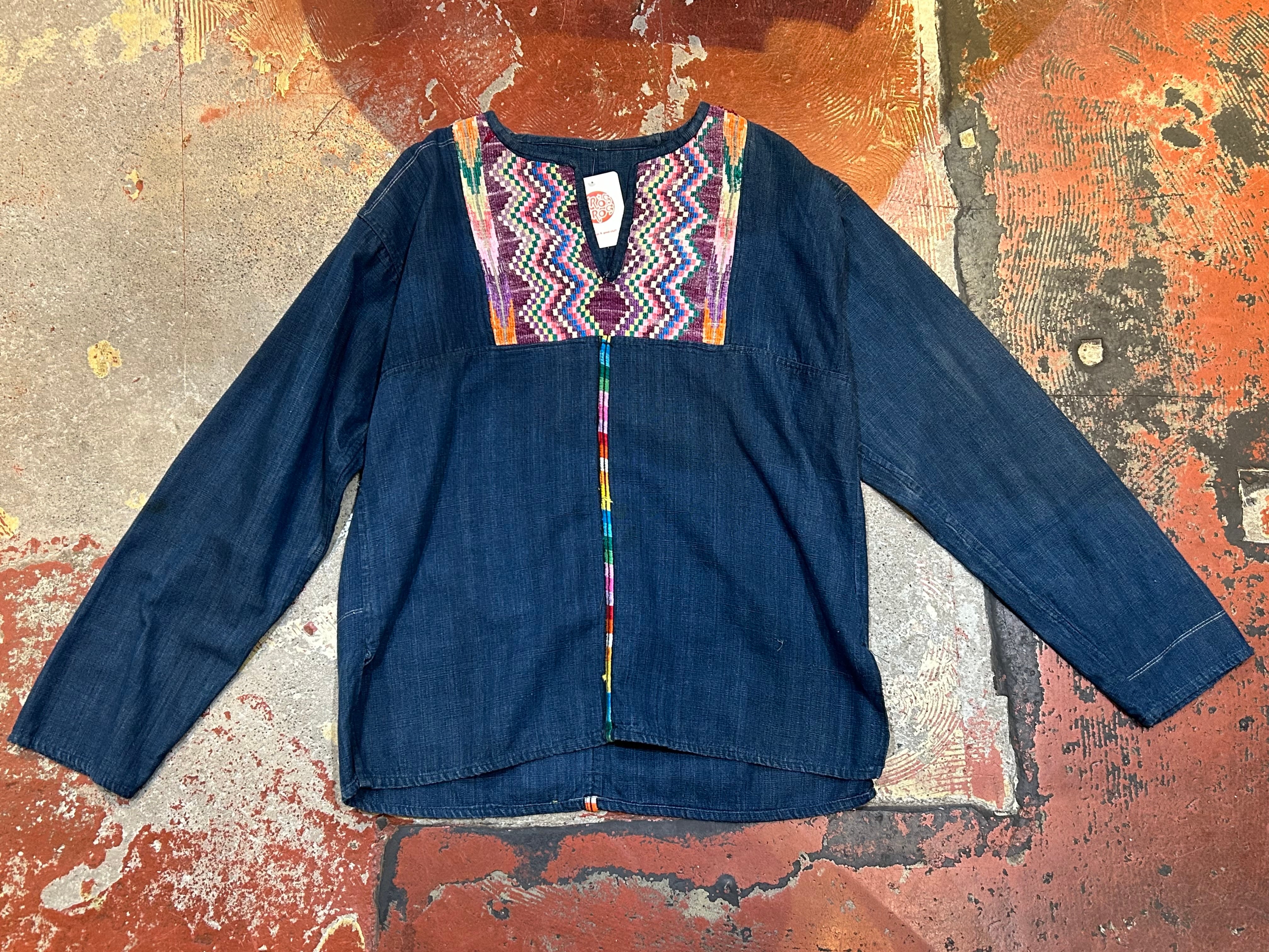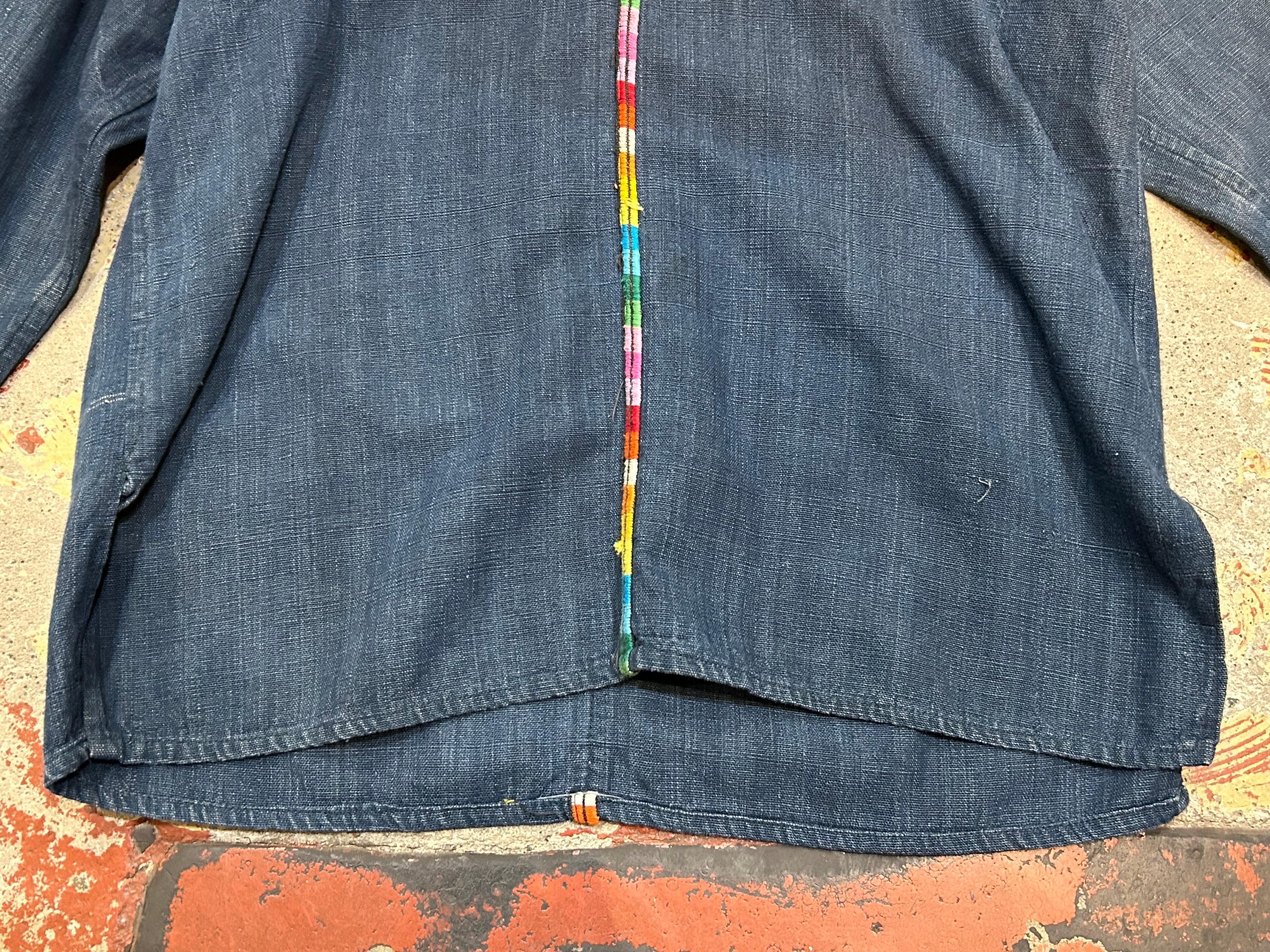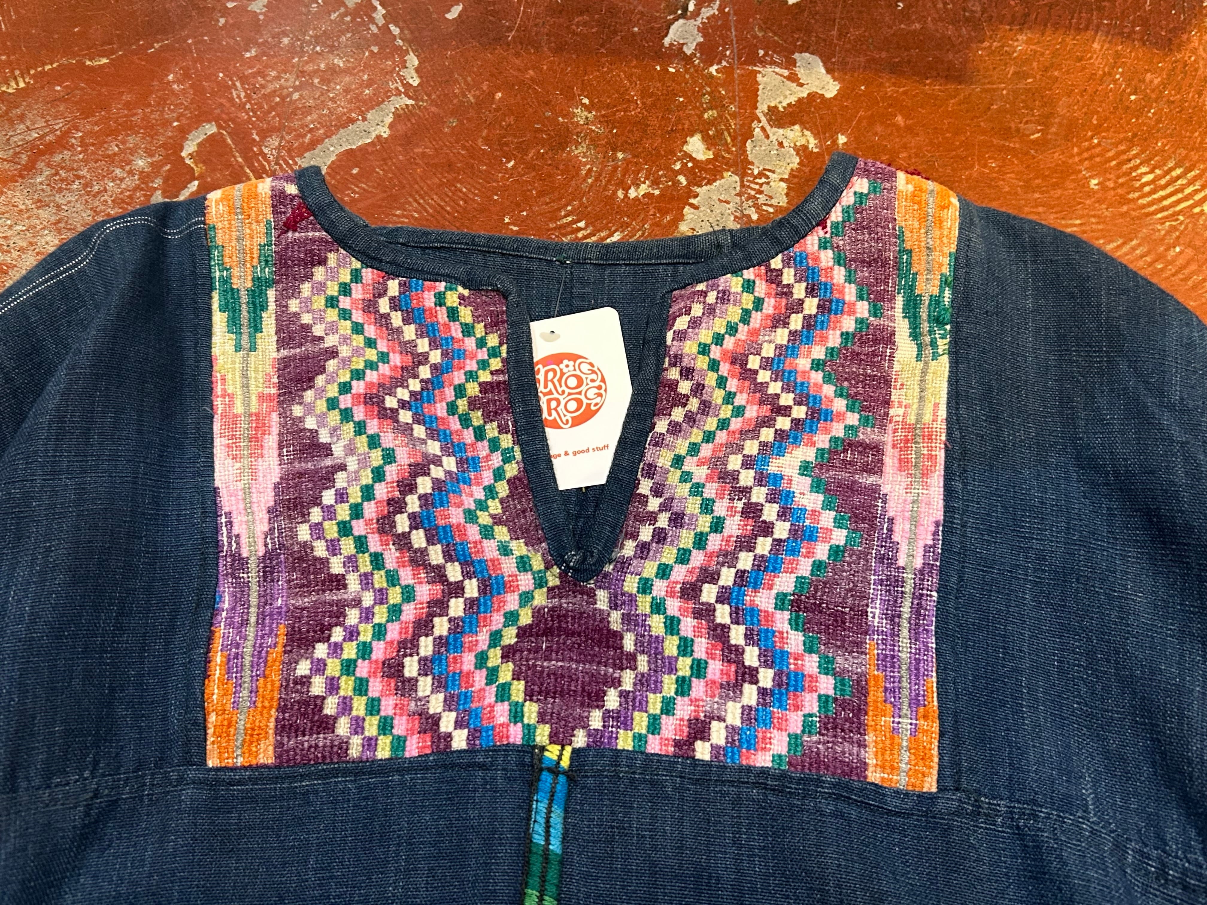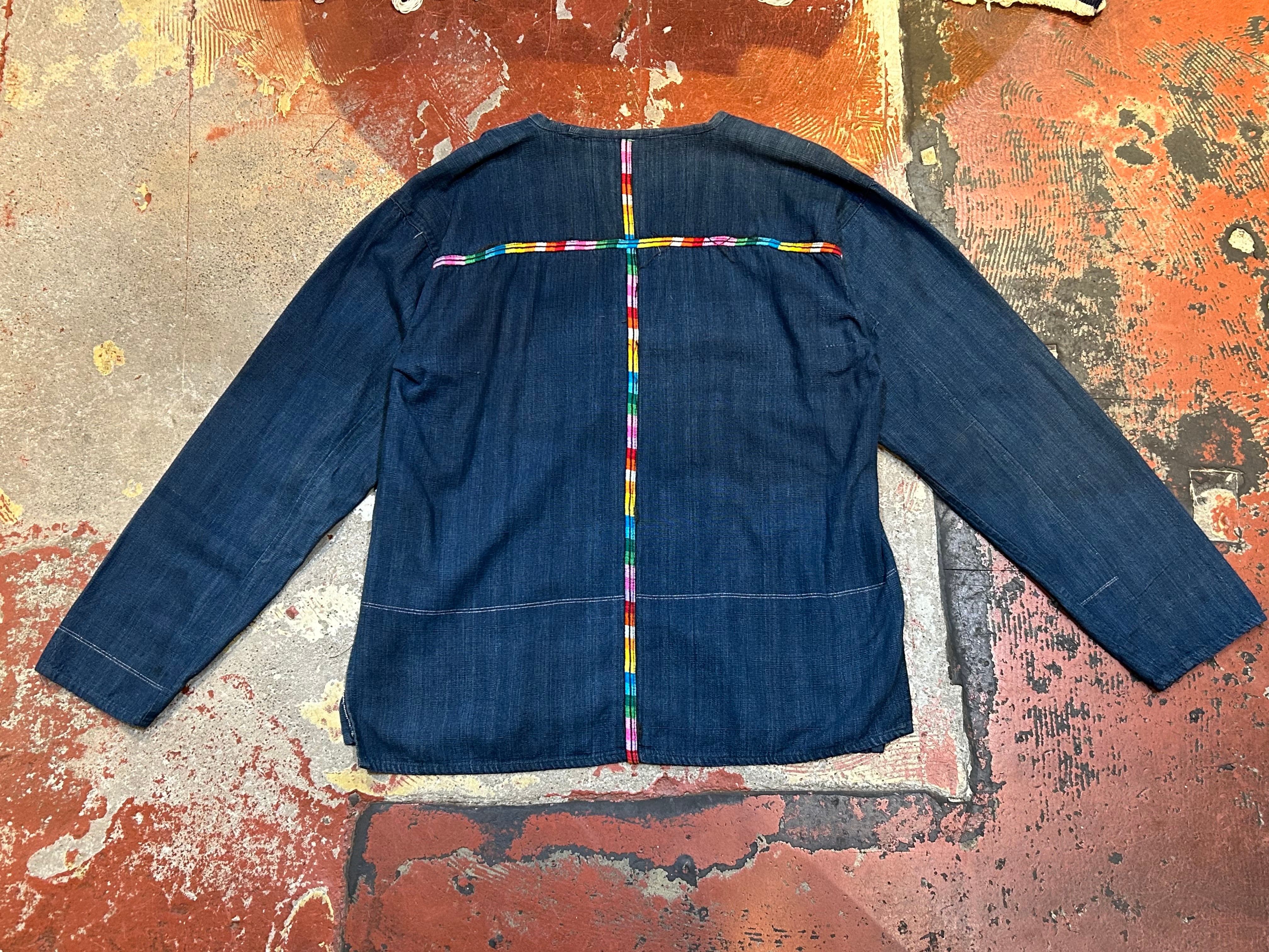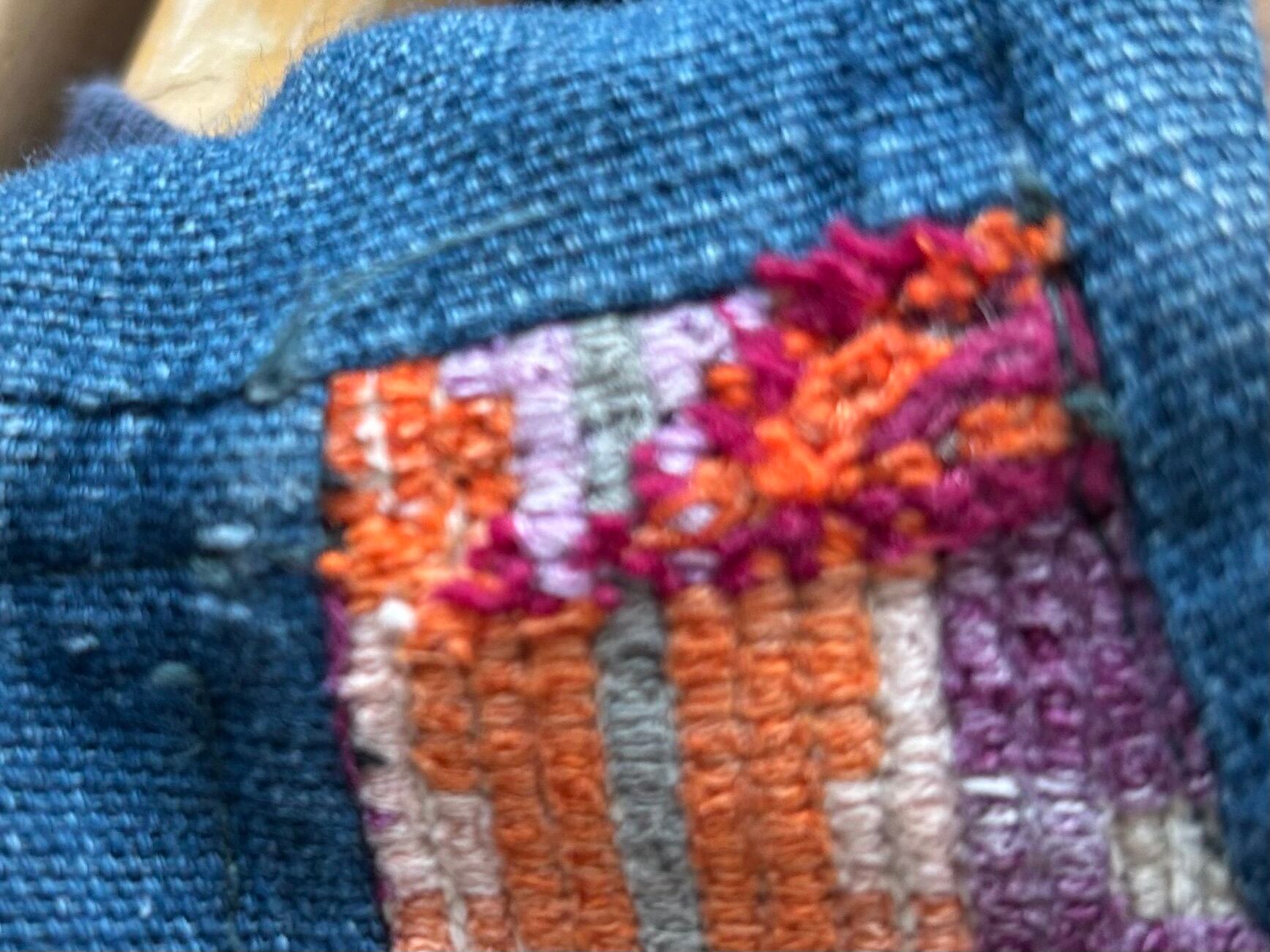 インディゴ生地にカラフルな刺繍が圧巻の1着。