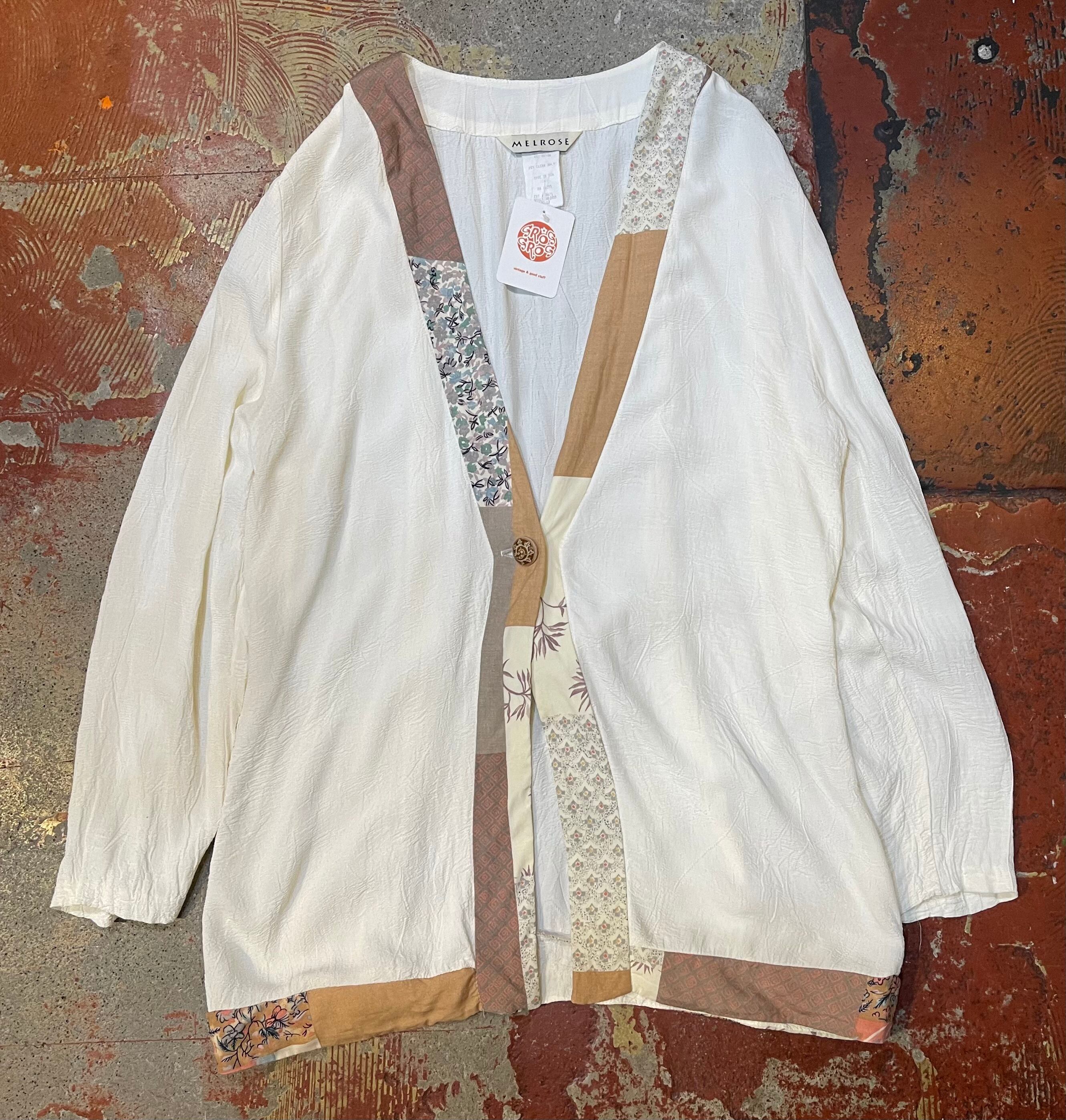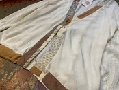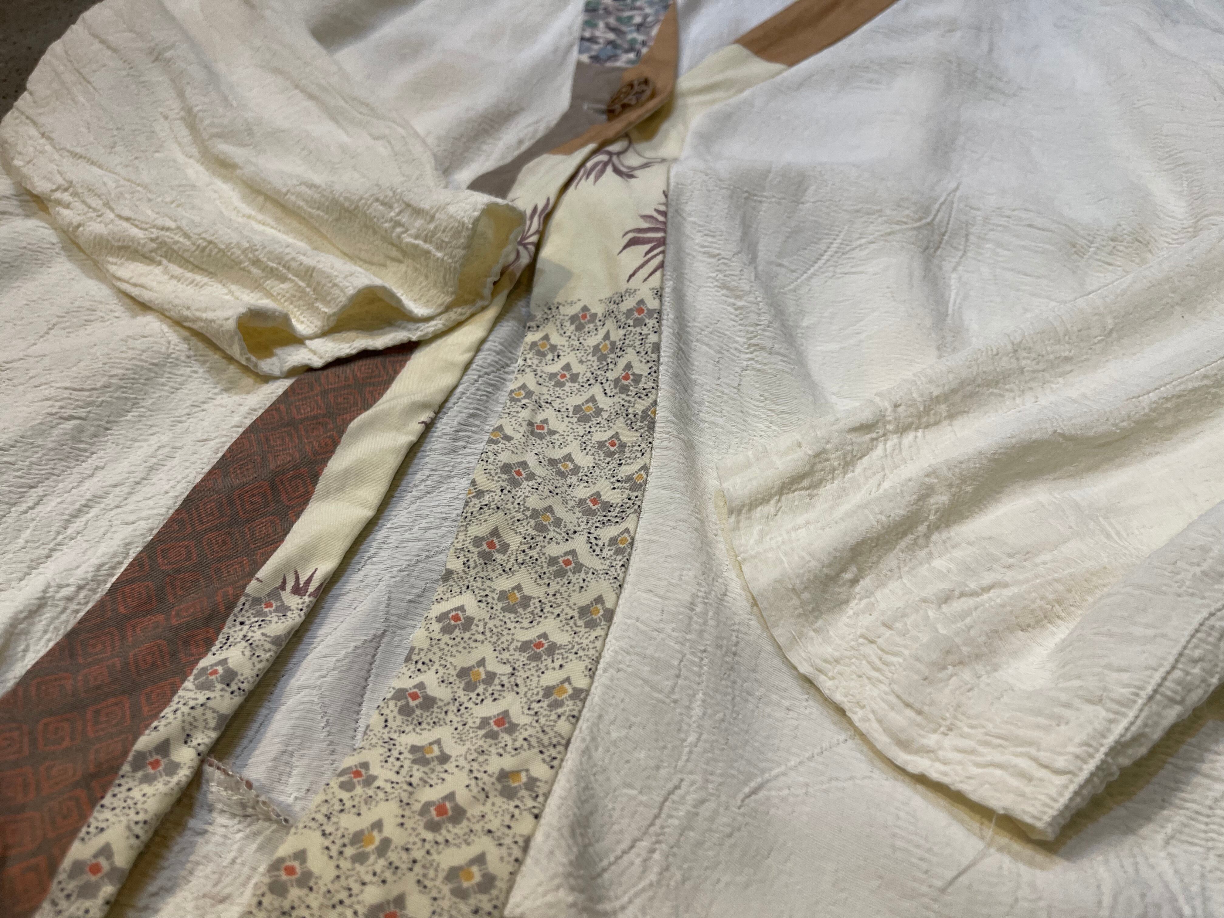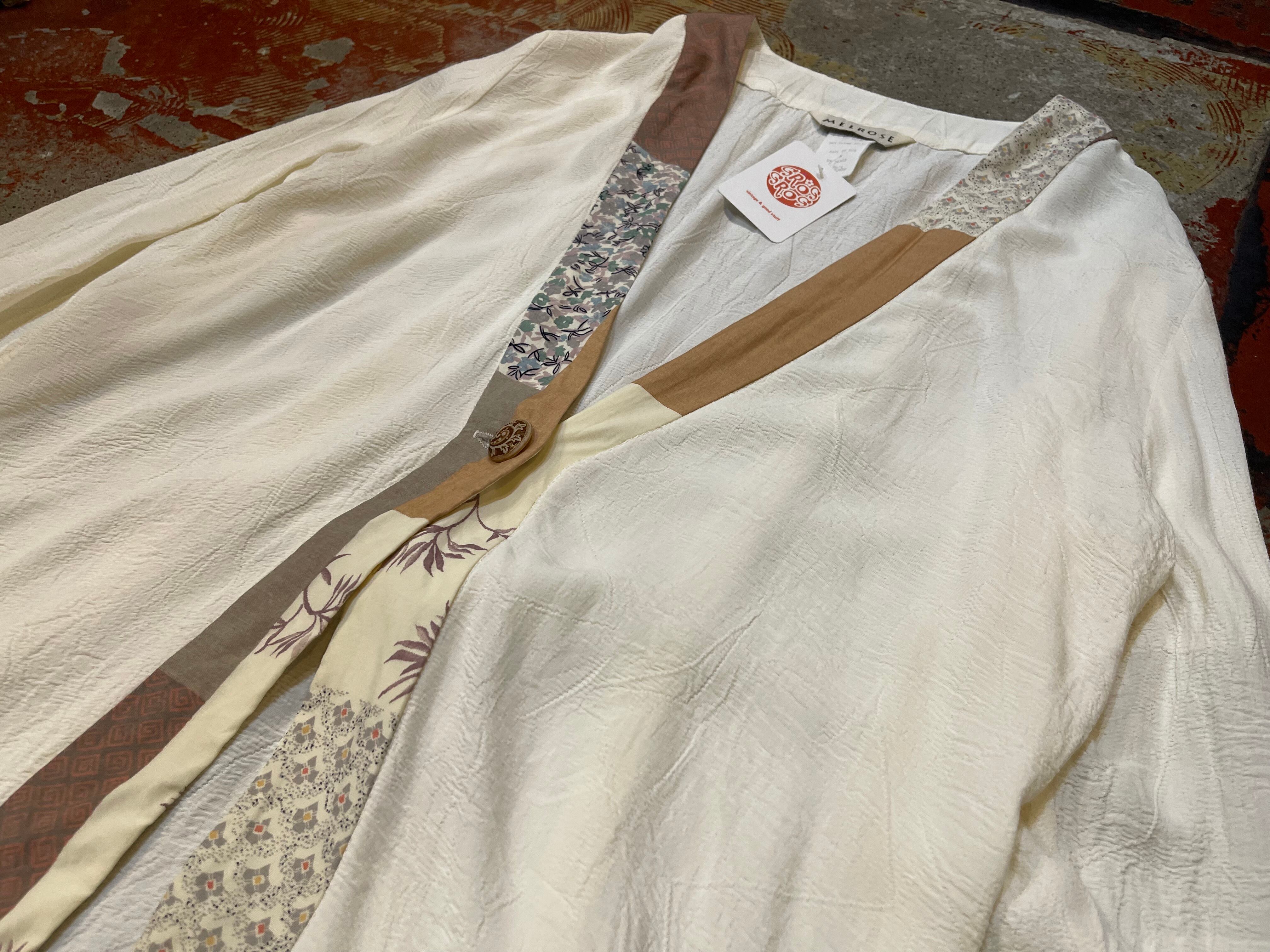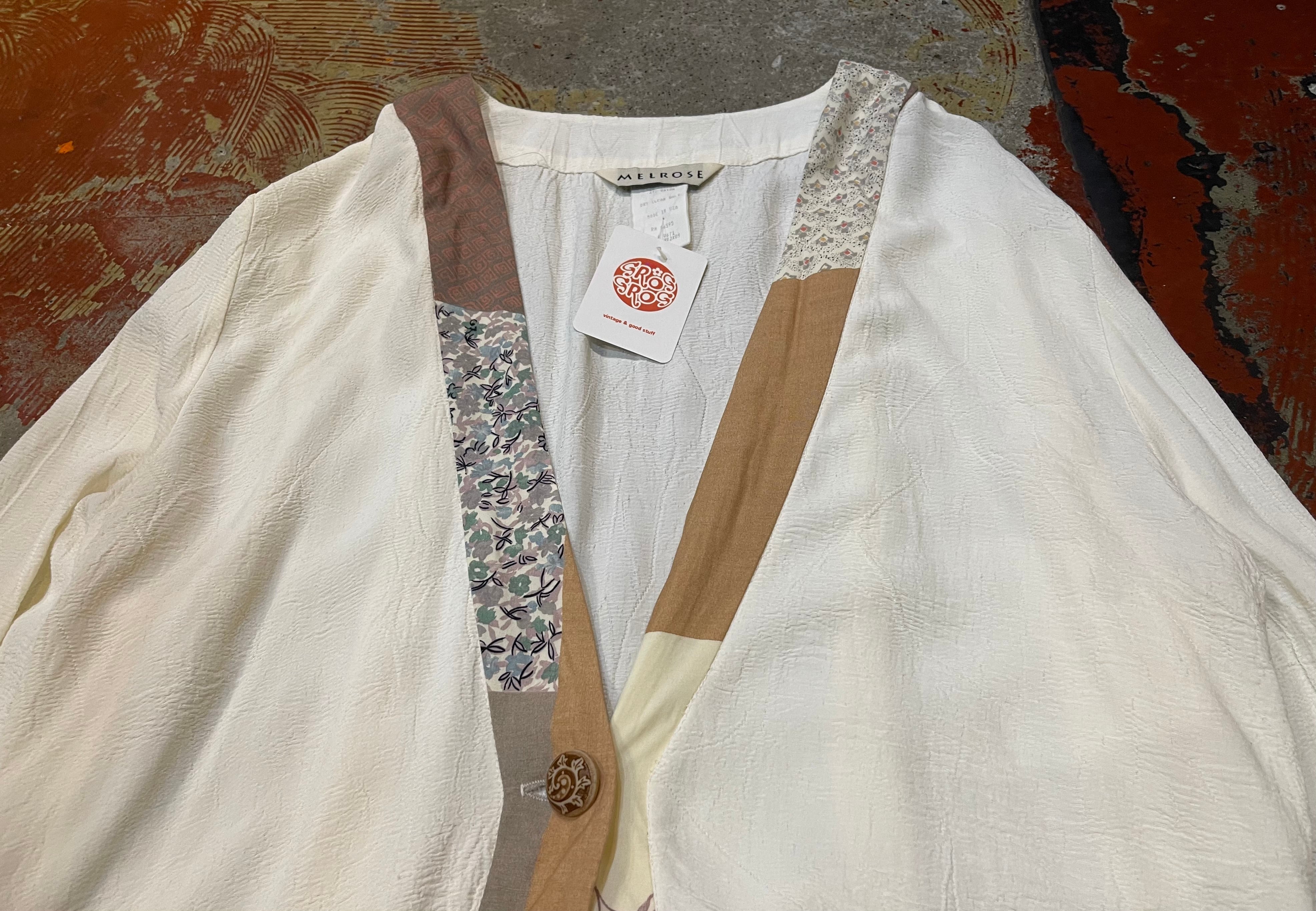 がっぽり羽織れるカーディガンのような作りで、柄生地で切り替えられた着物のような襟が面白い1着。