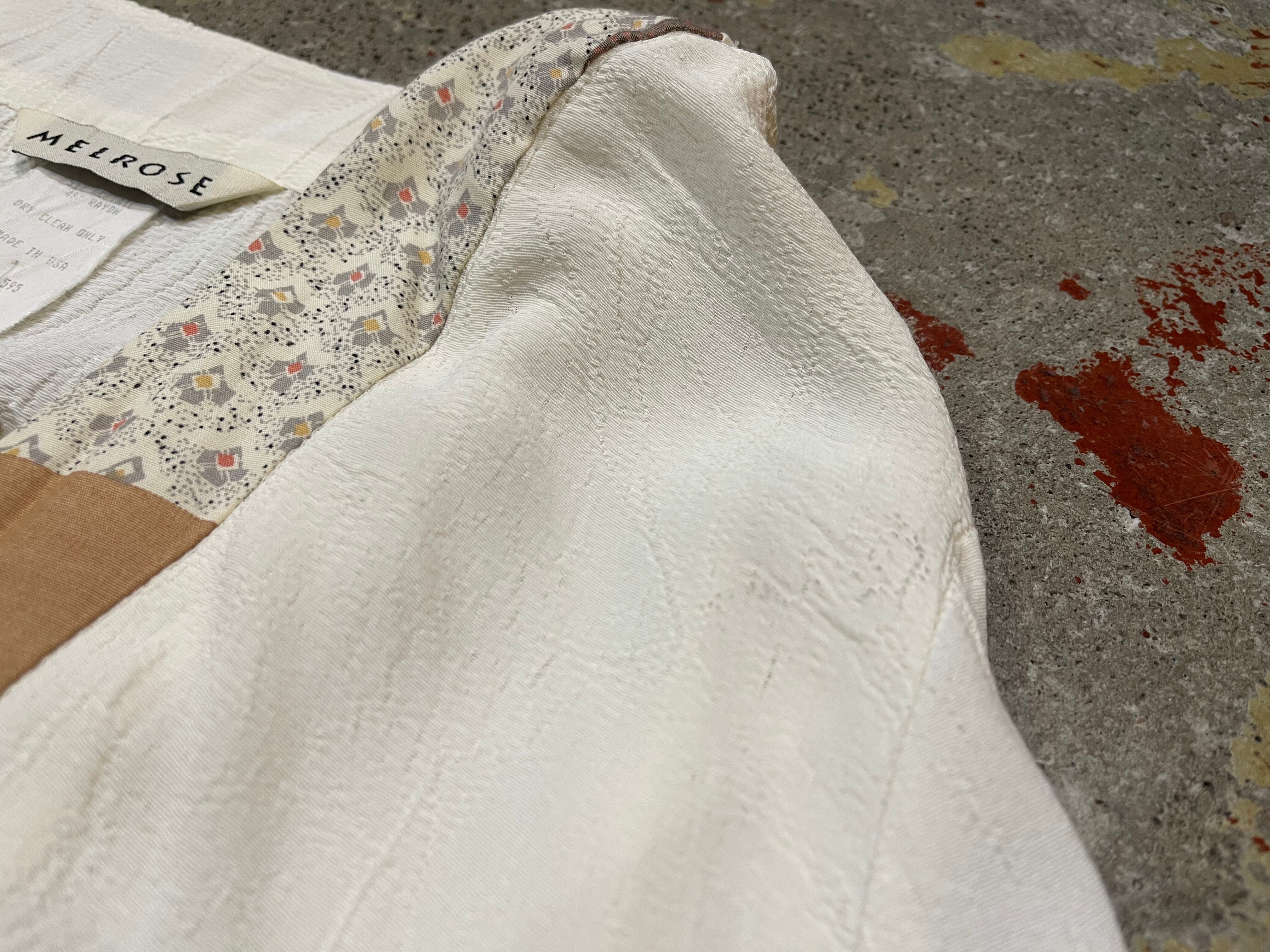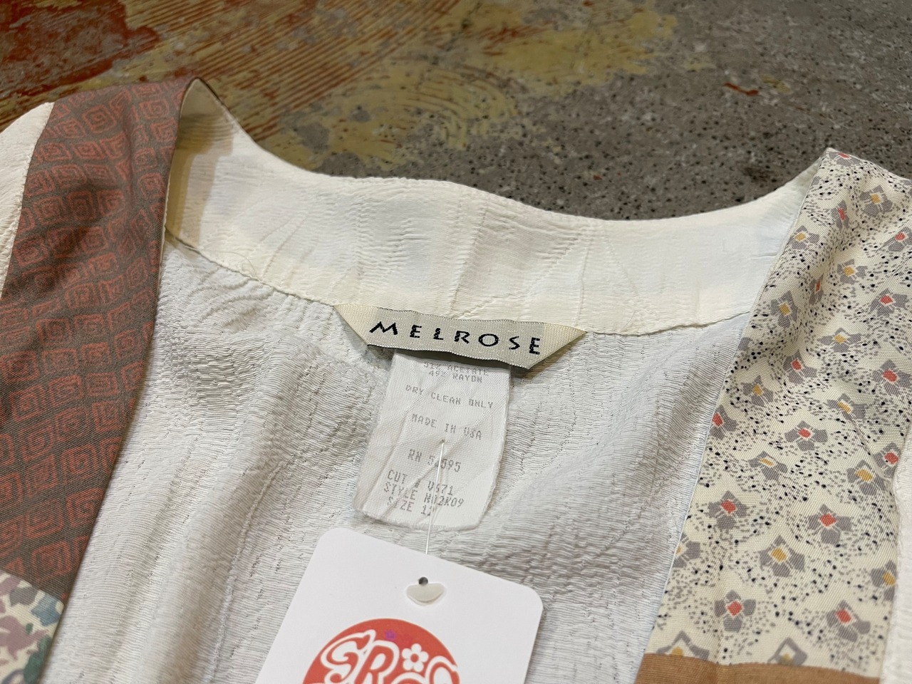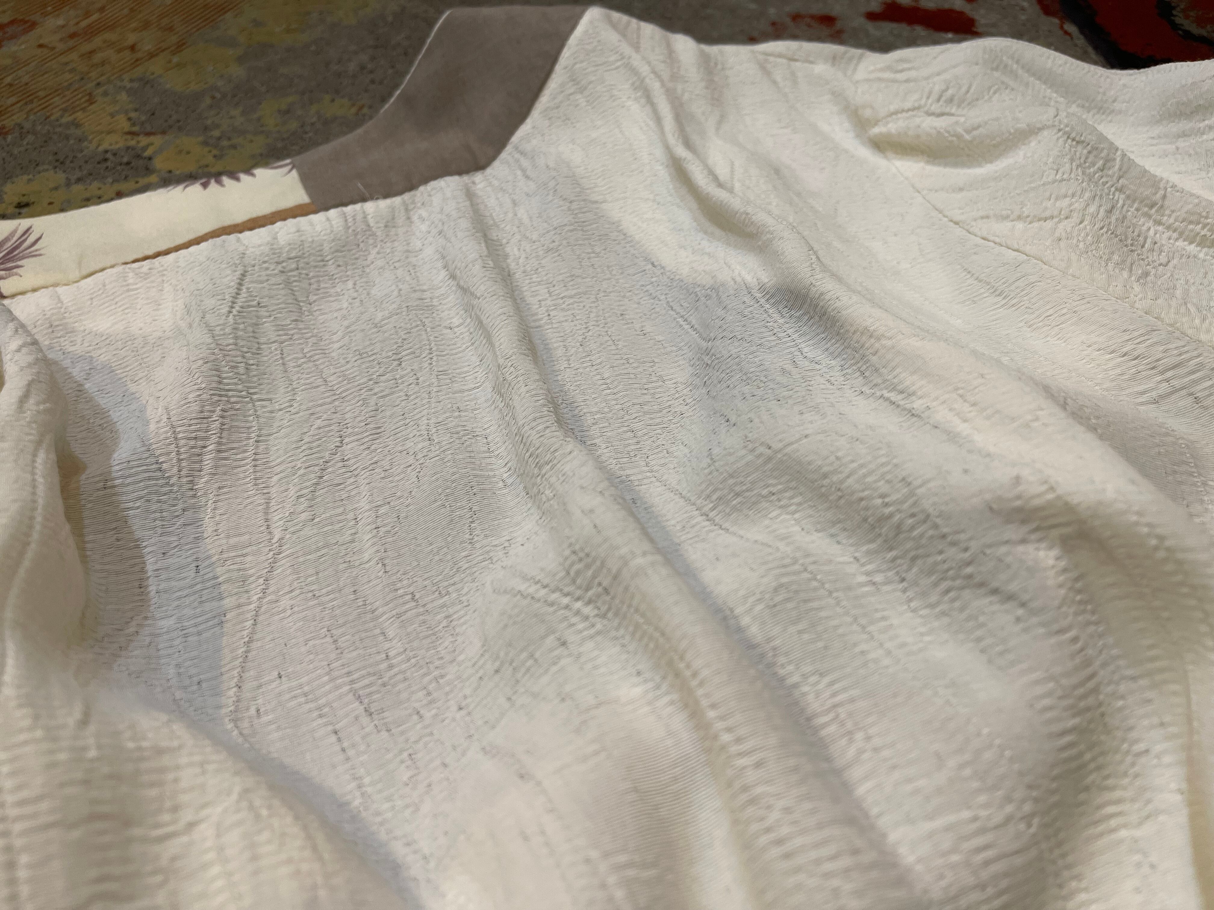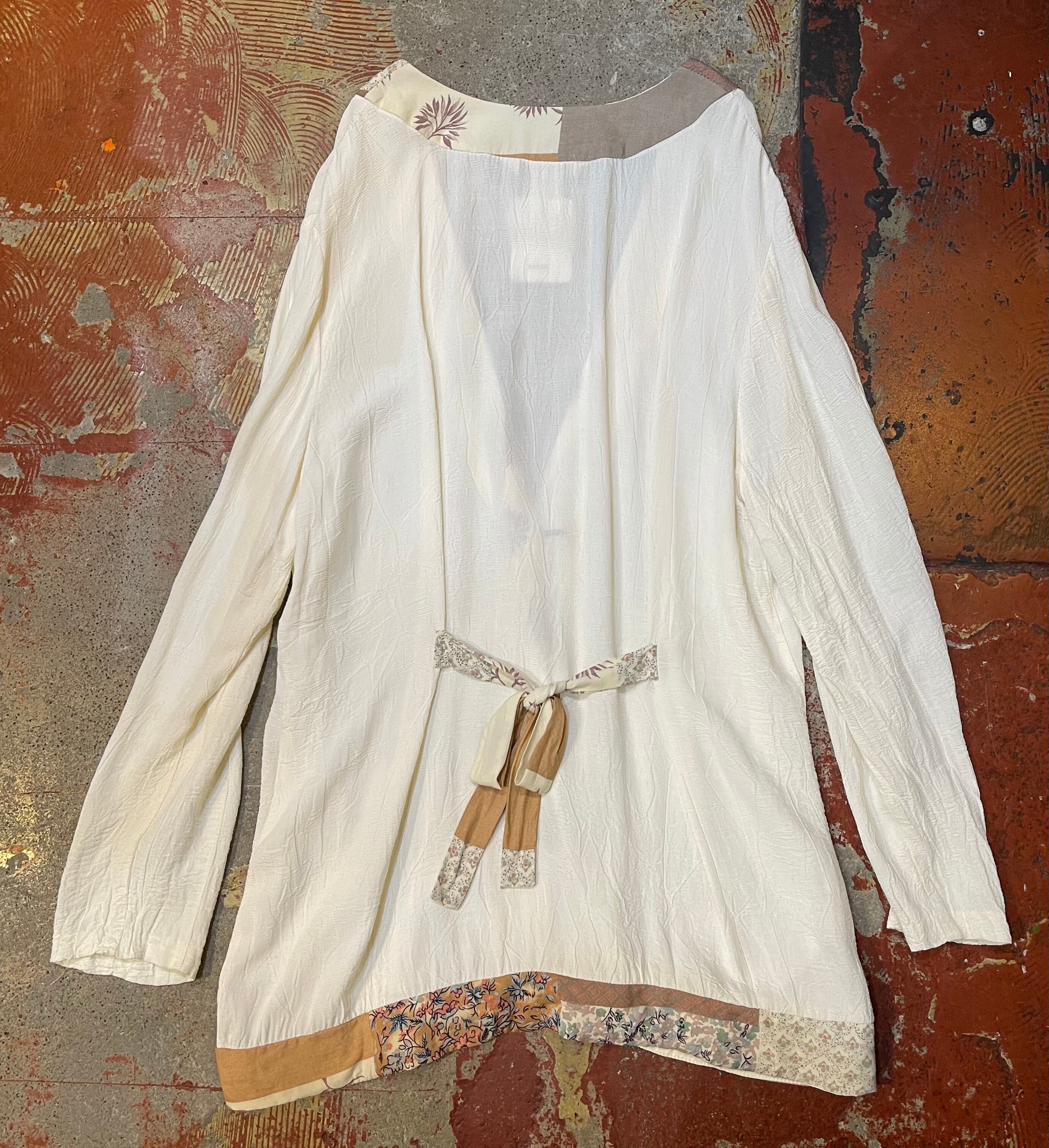 がっぽり羽織れるカーディガンのような作りで、柄生地で切り替えられた着物のような襟が面白い1着。