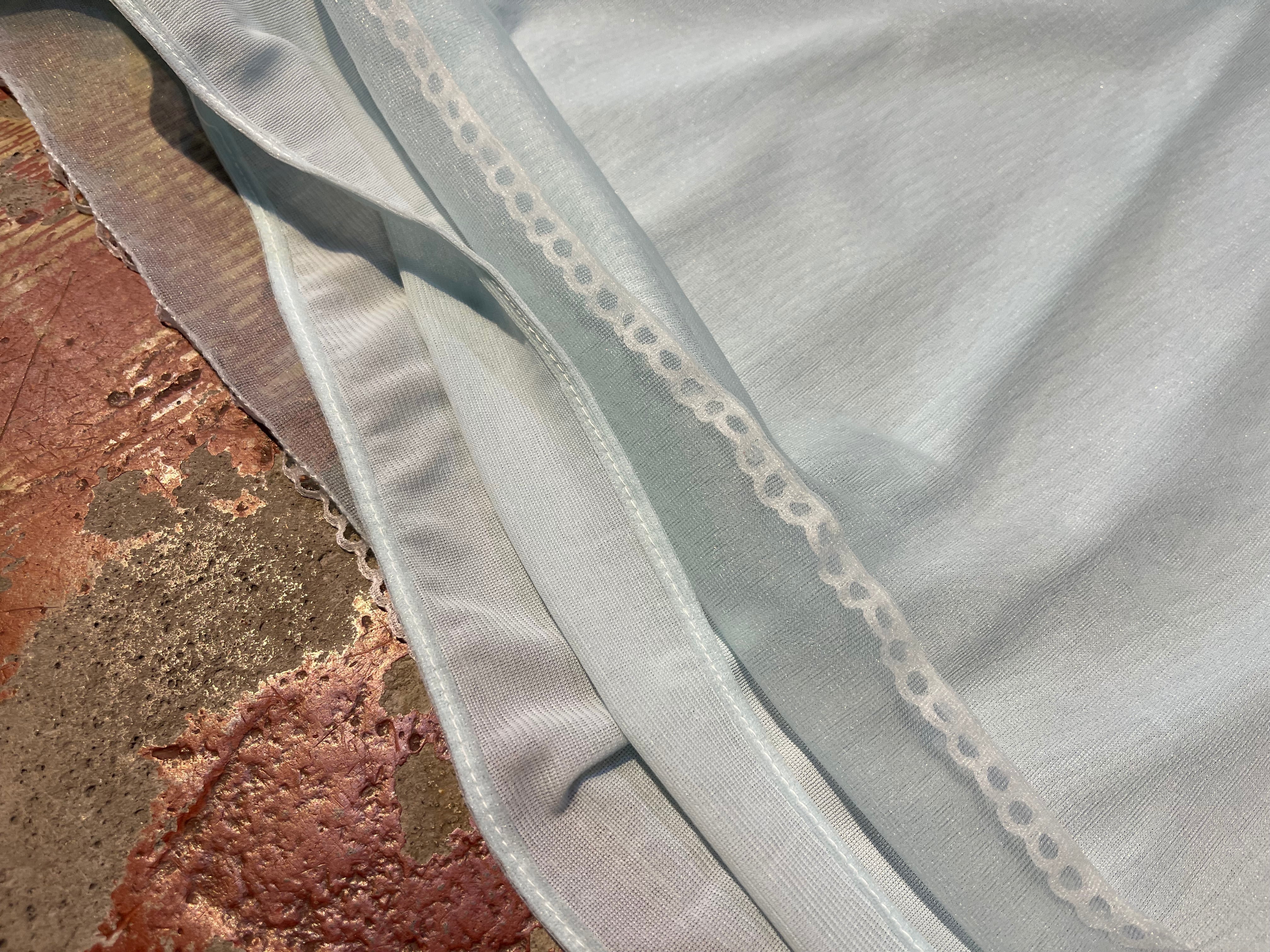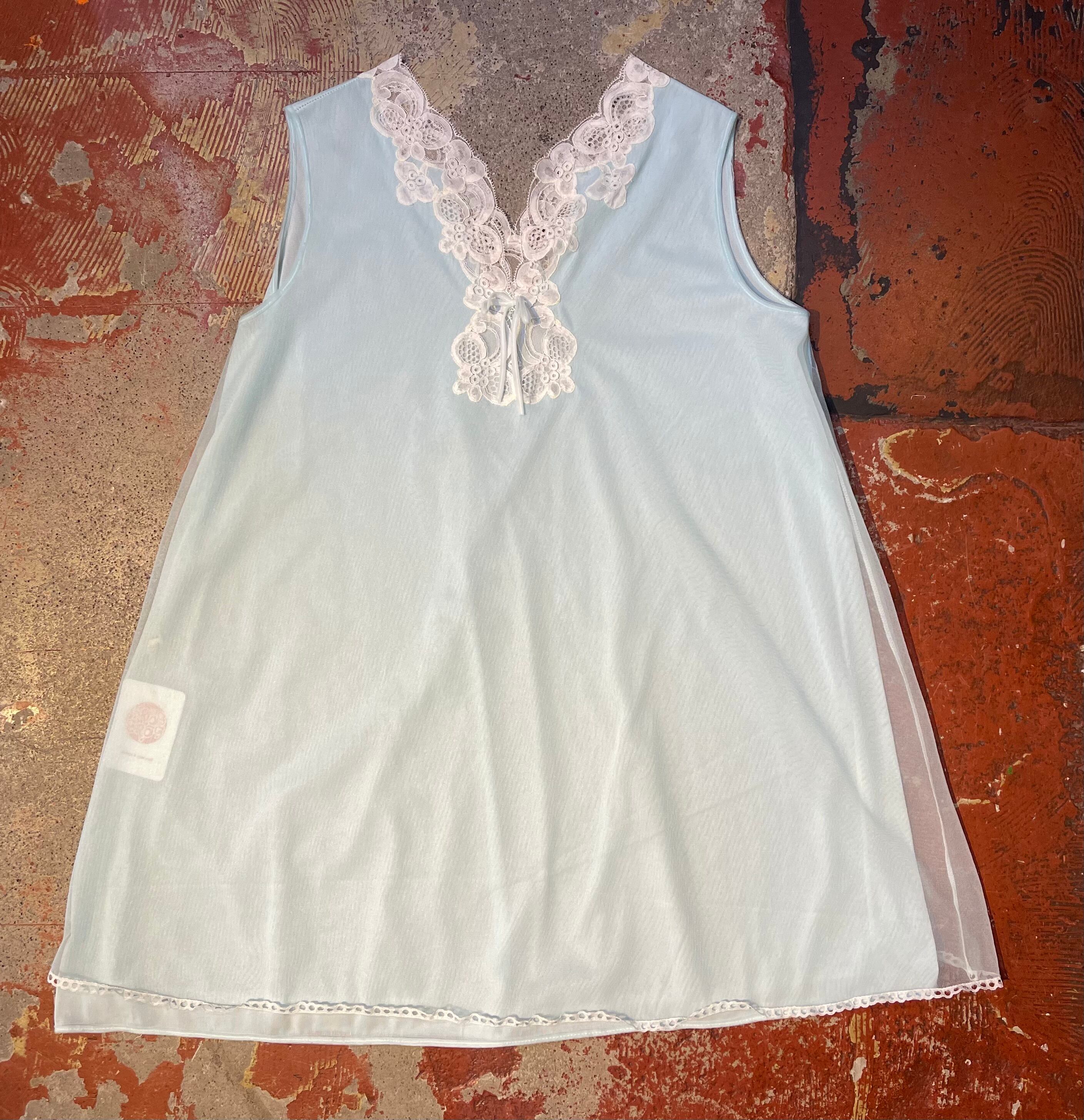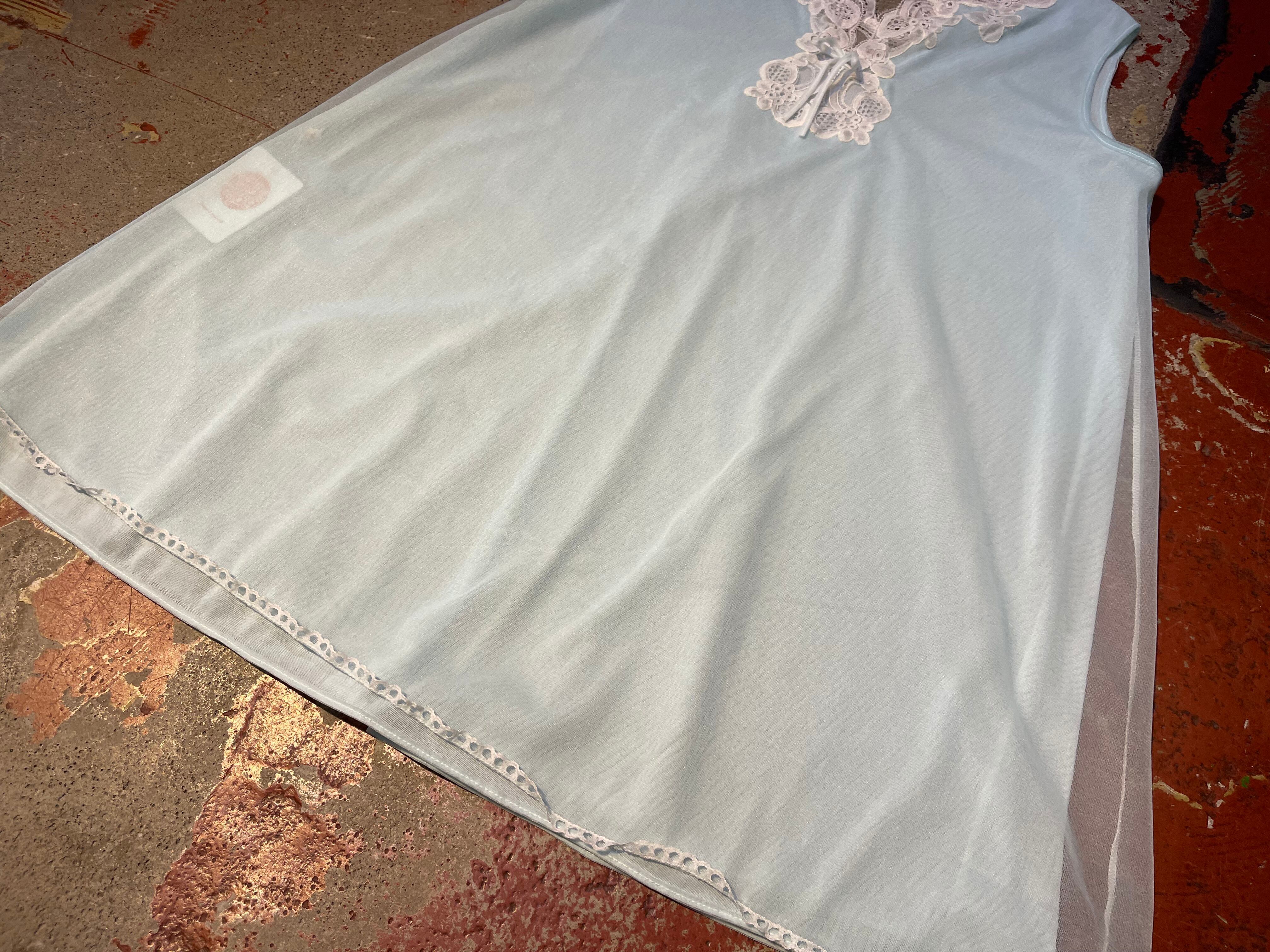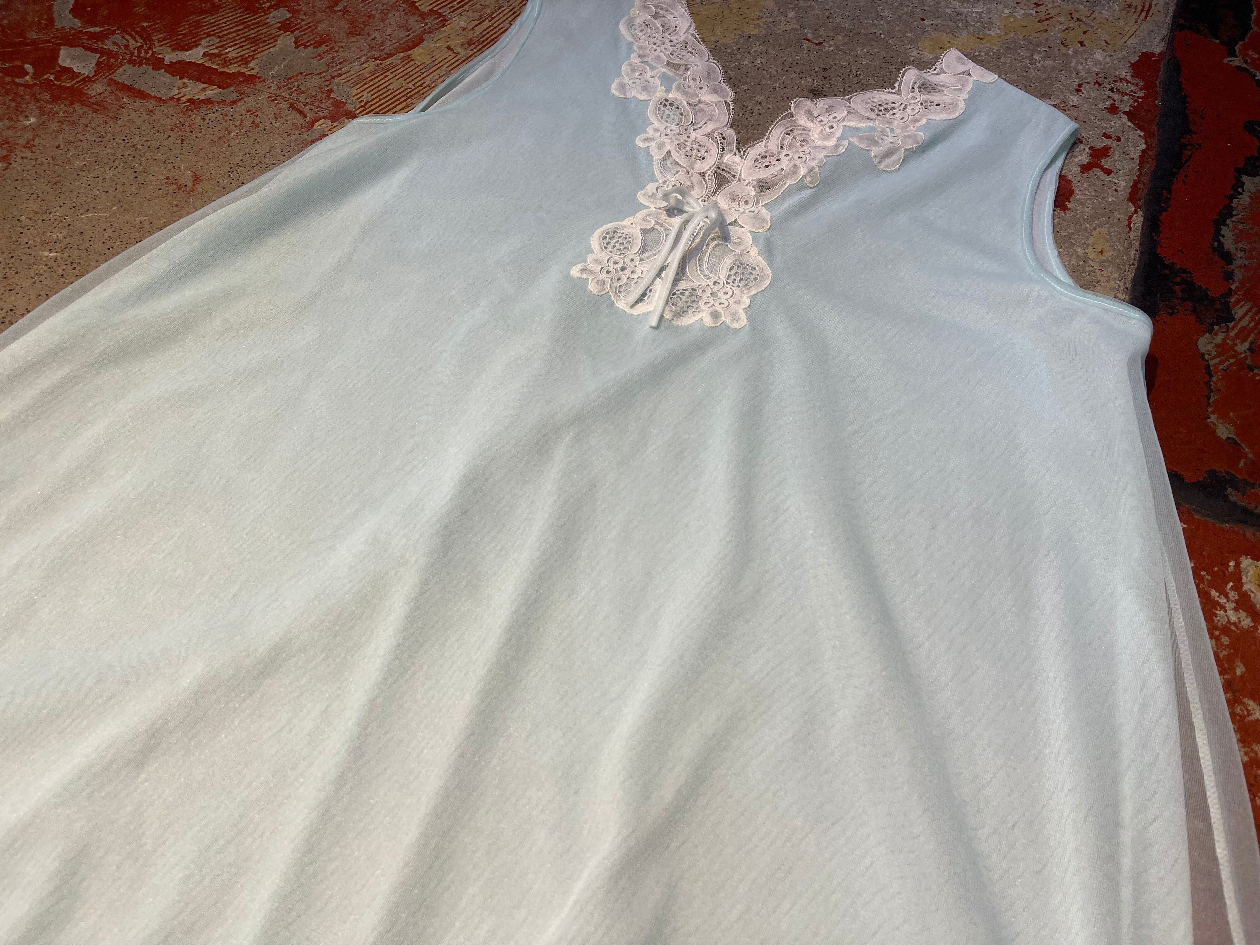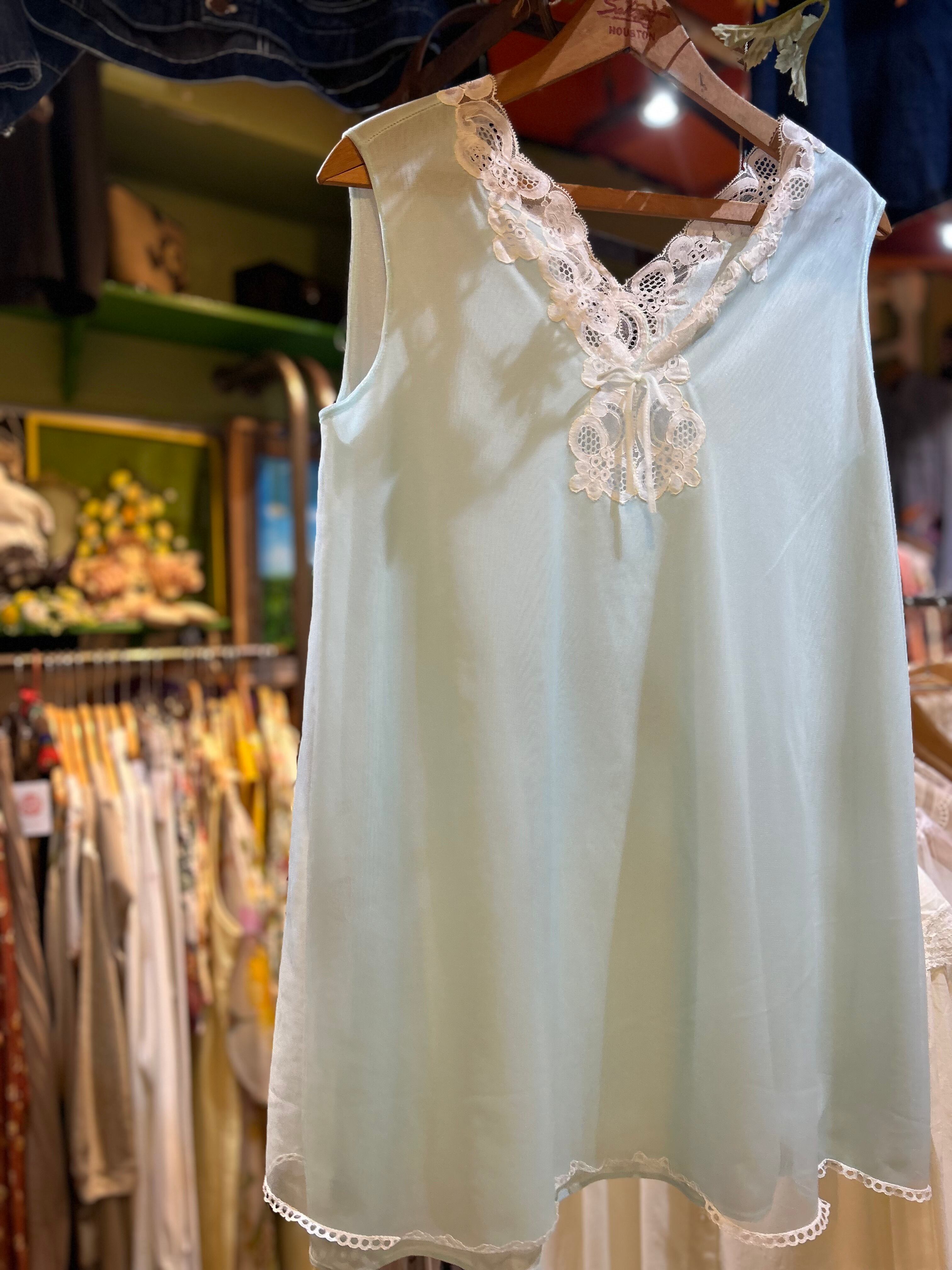 水色ボディ、ノースリーブに白いレースのデザインで重ね着コーデに大活躍間違いなしな1着です。