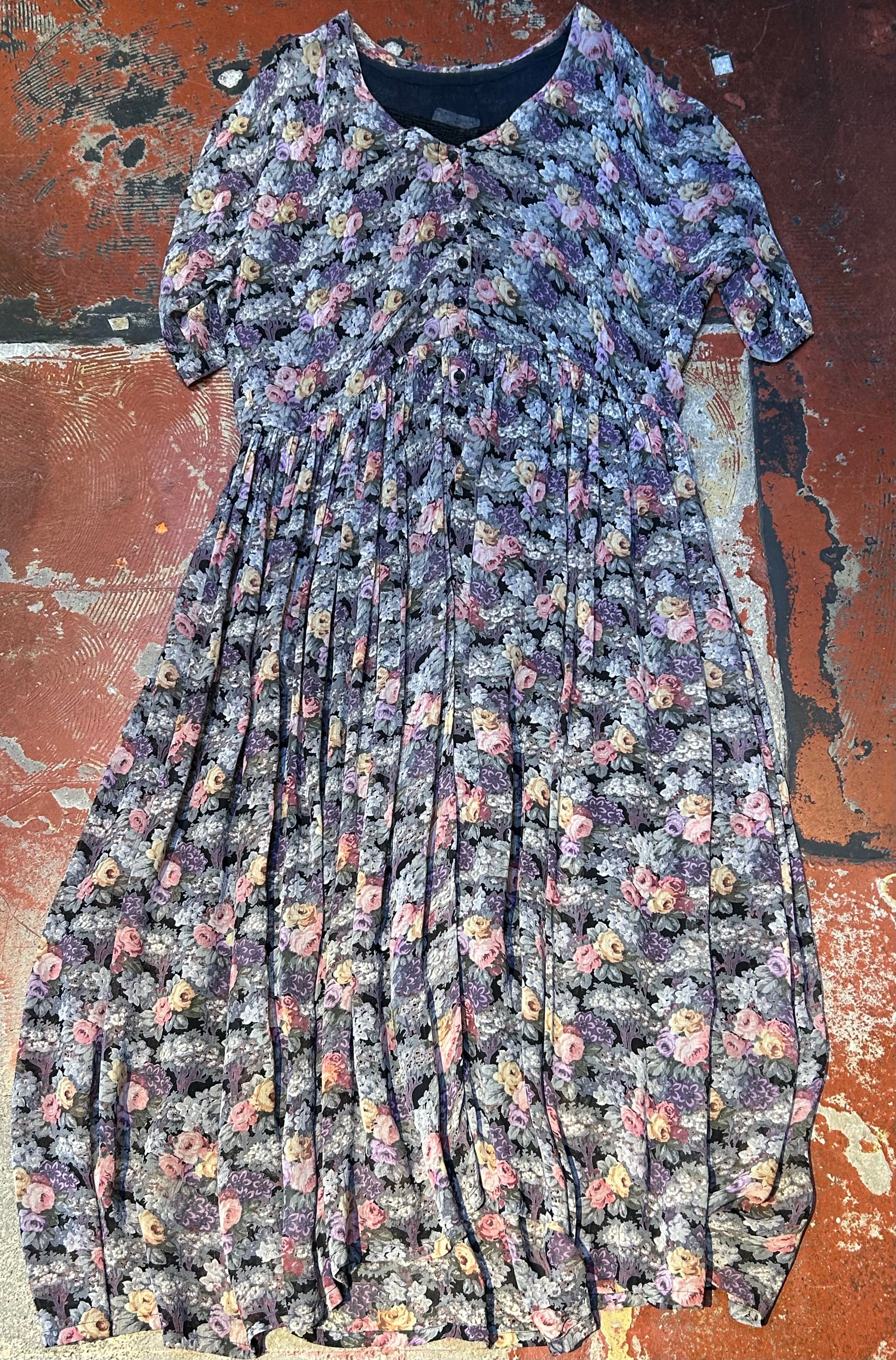 size:表記M 肩幅なし、身幅63cm、ウエスト96cm、着丈126cm、ウエストから裾92cm