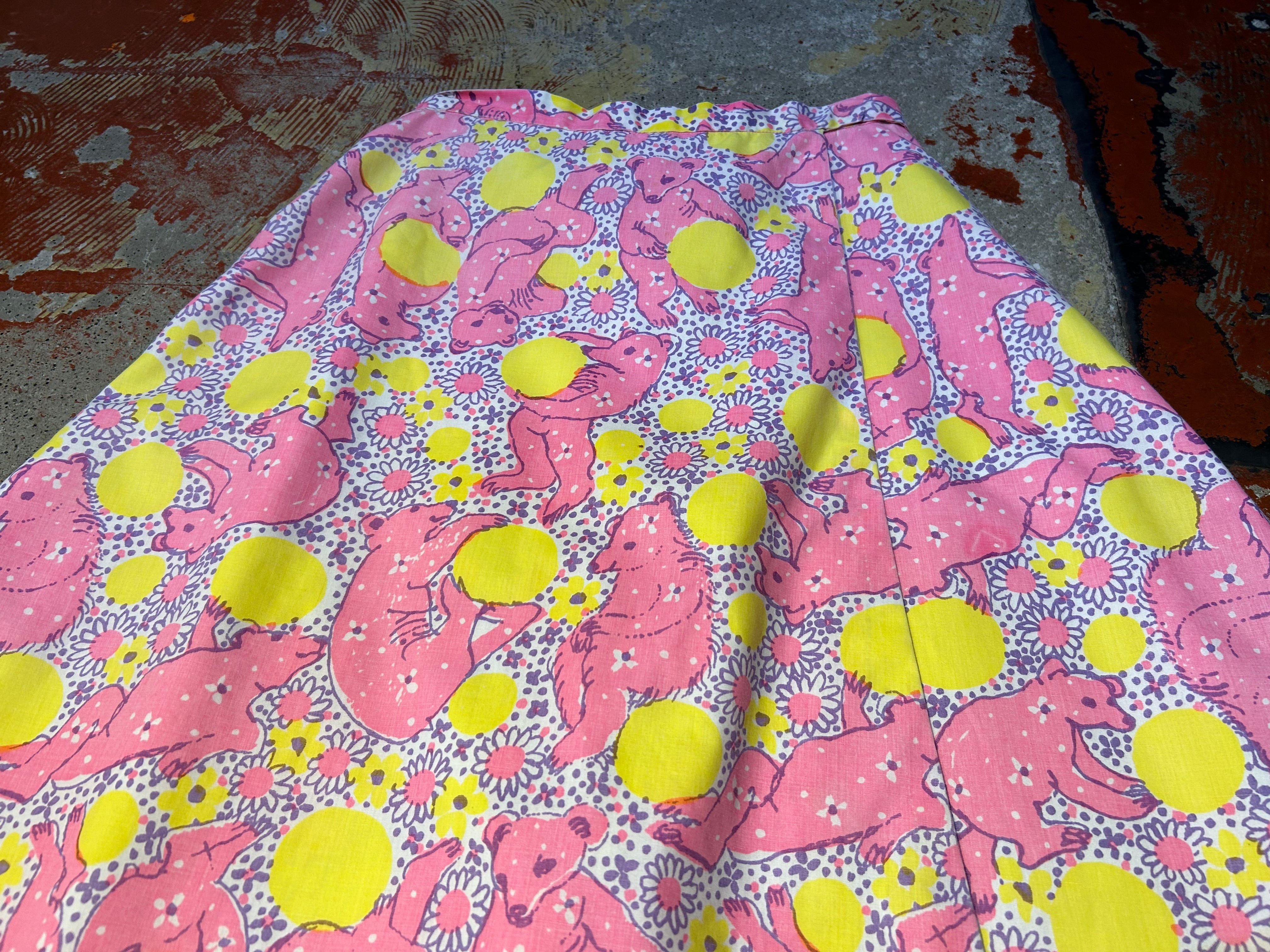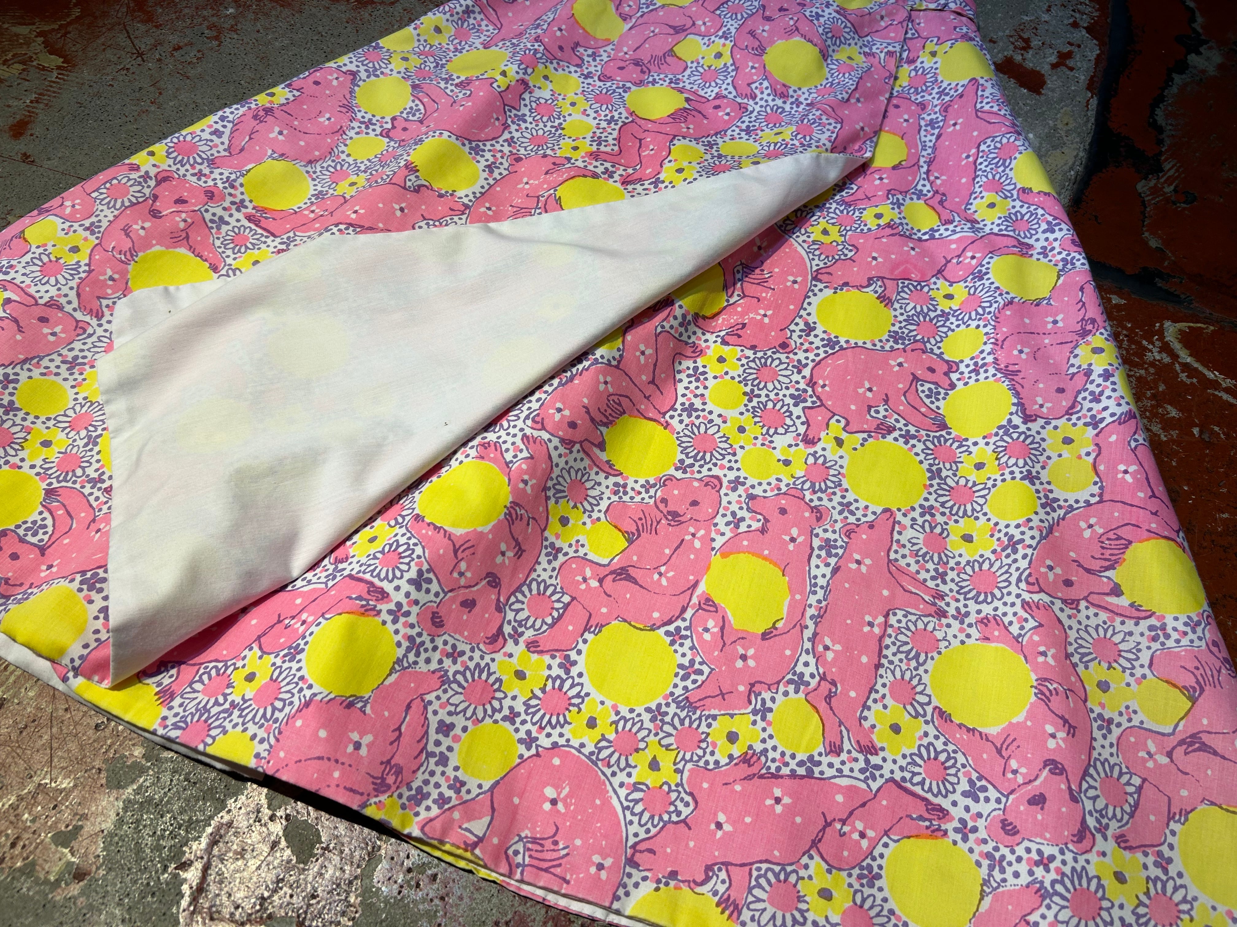 黄色い丸い玉と、お花柄、くまが黄色い丸いもので遊んでいるプリントが可愛いアイテム。