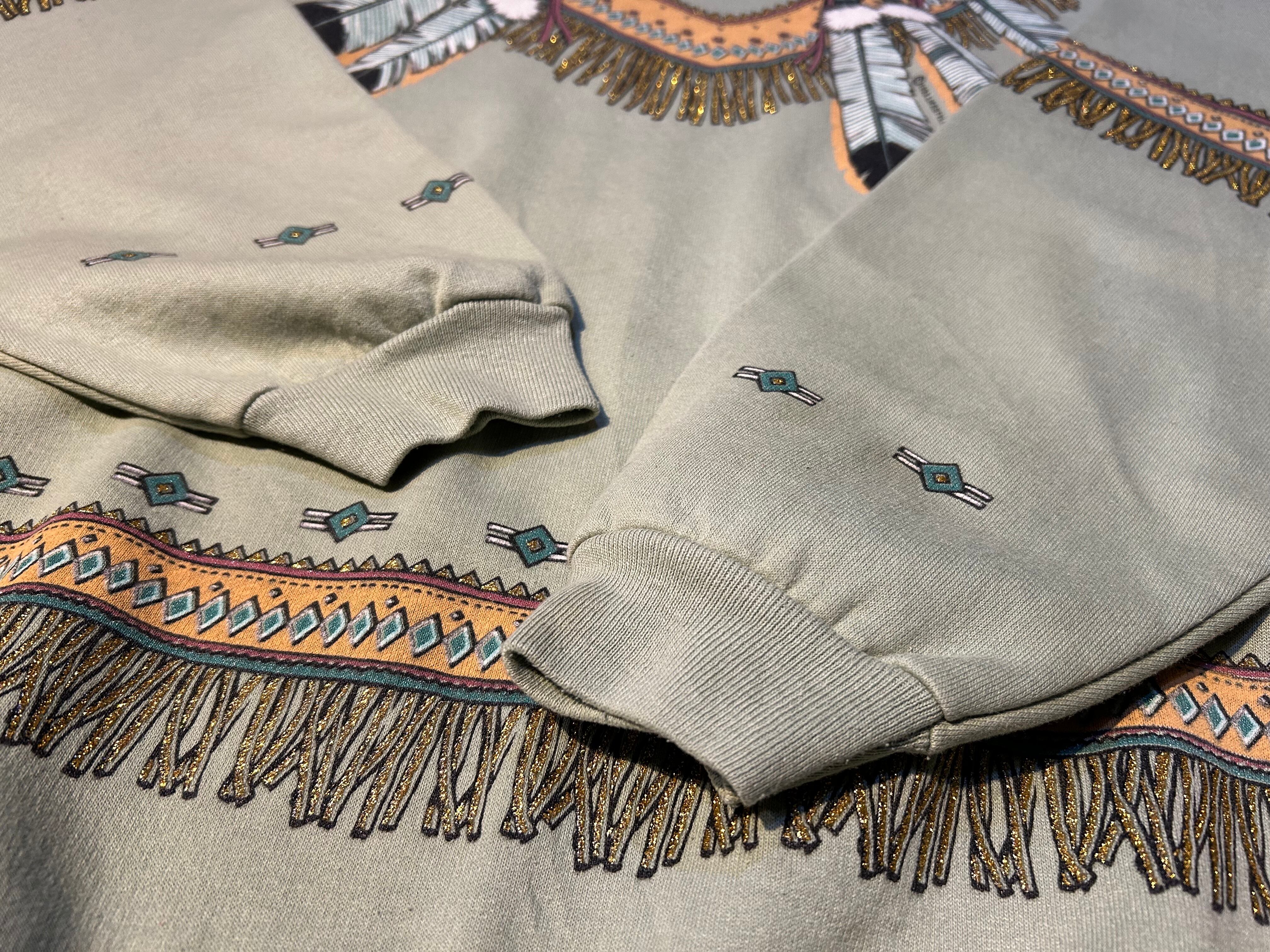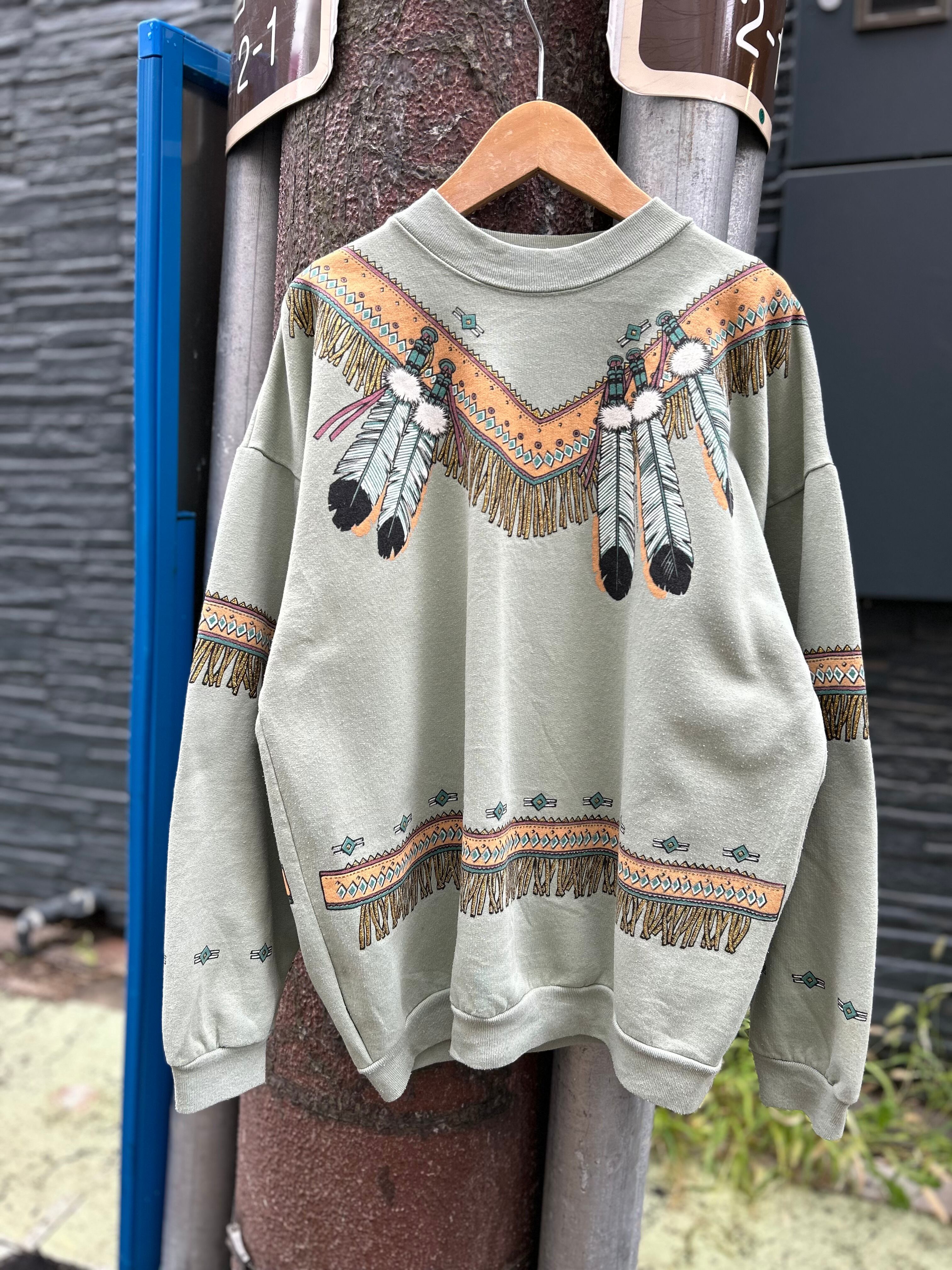渋めグリーンボディに、ネイティブなプリントが目を奪うアイテム。