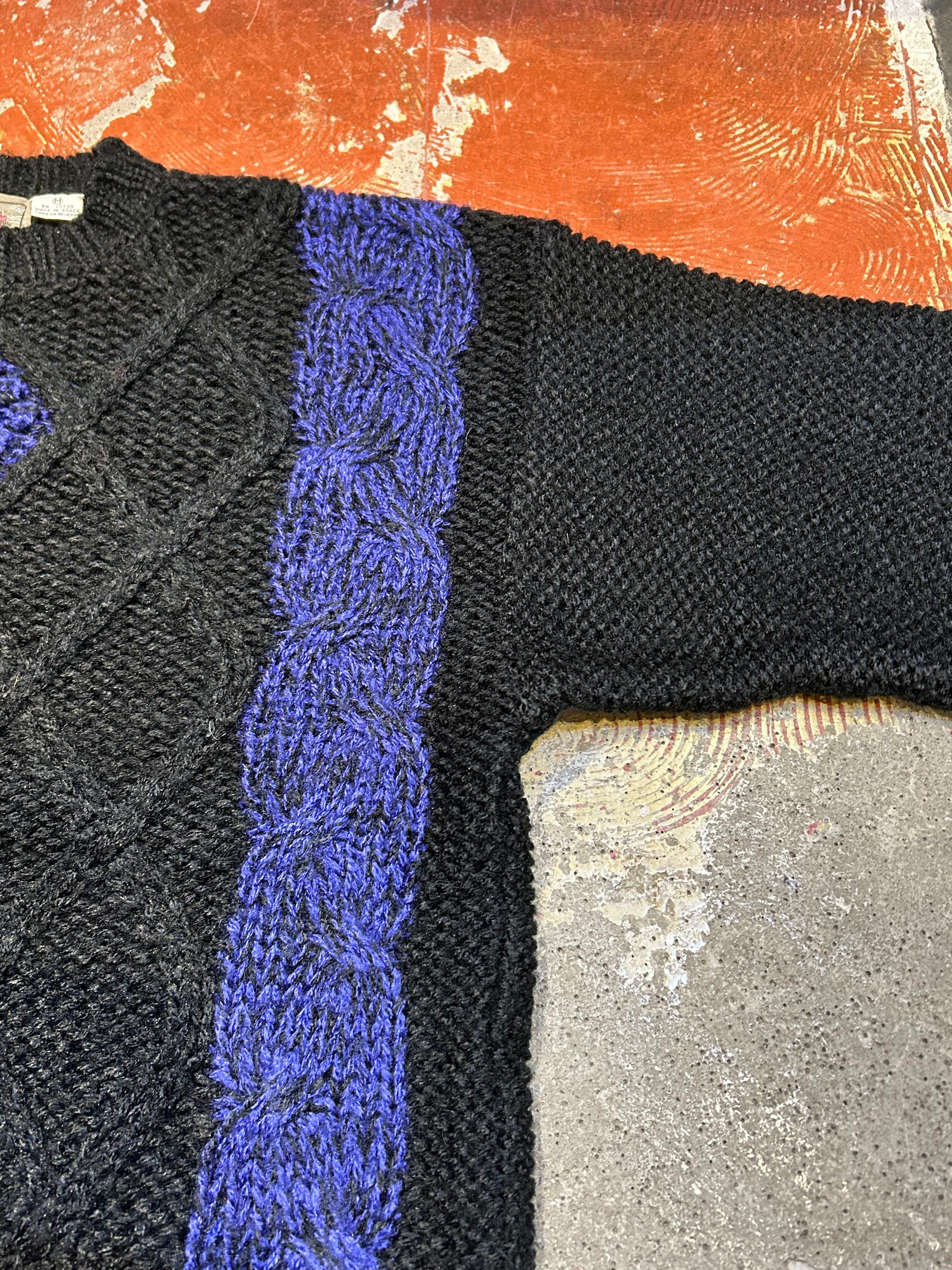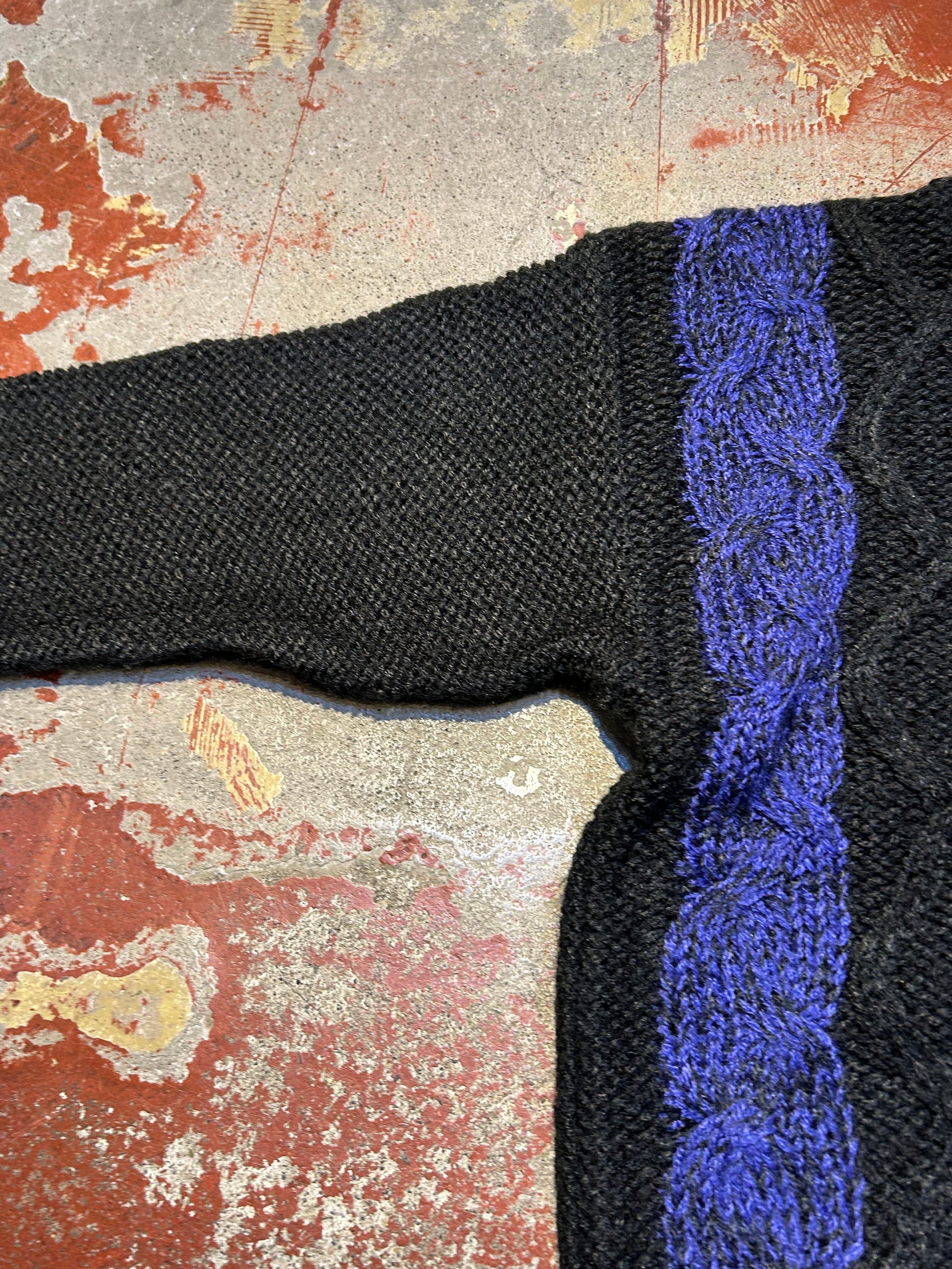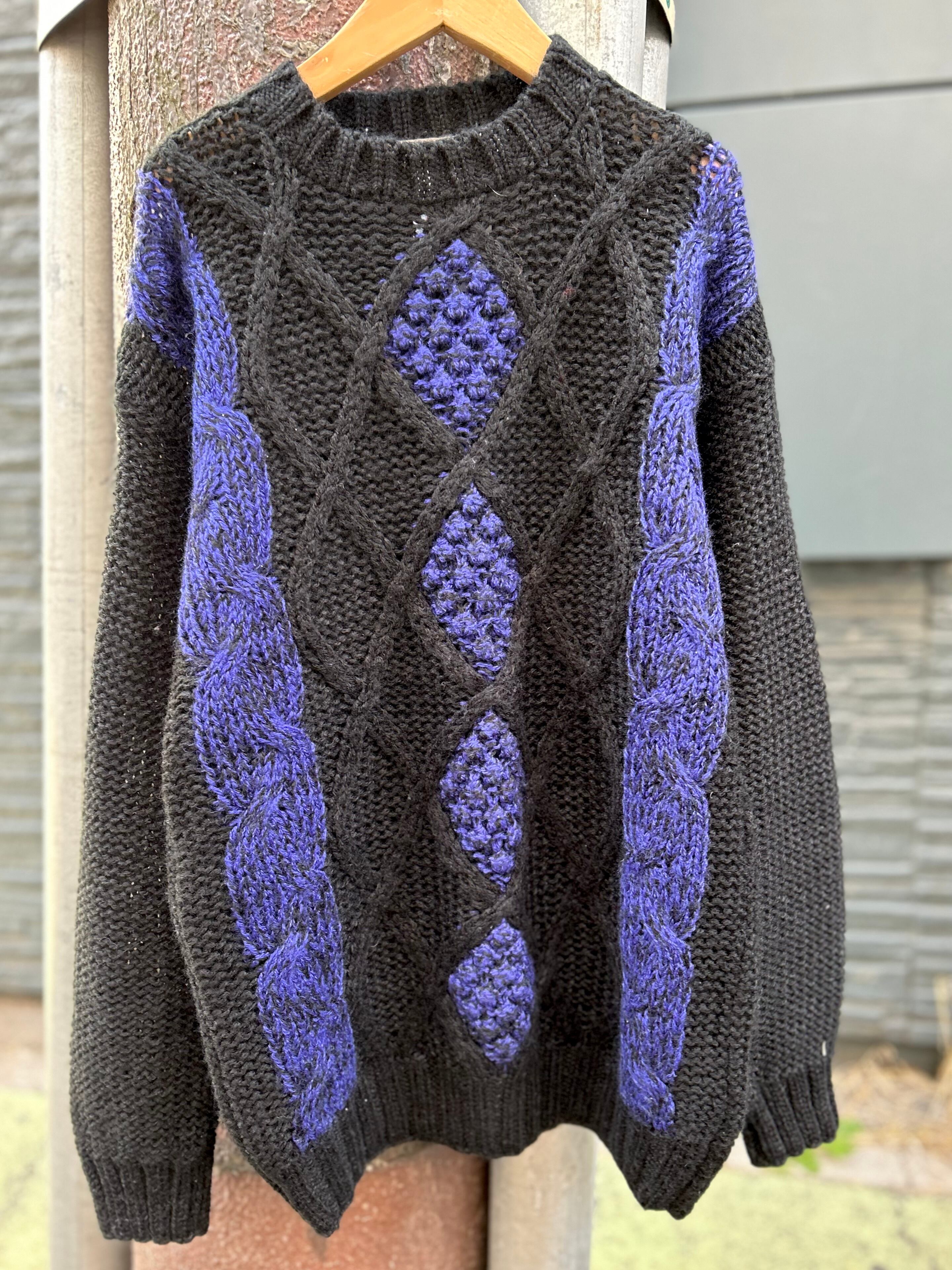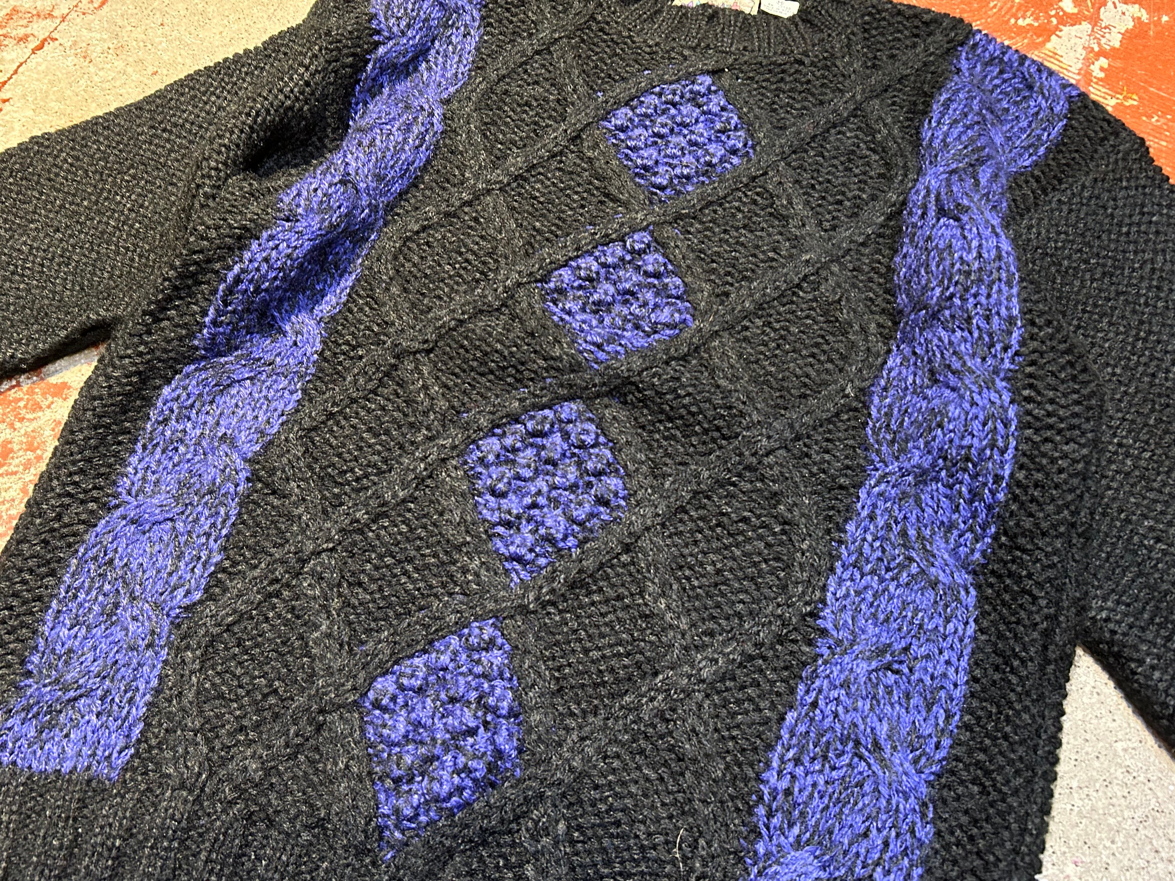 格子型にアランニットのような編み模様が可愛いアイテム。