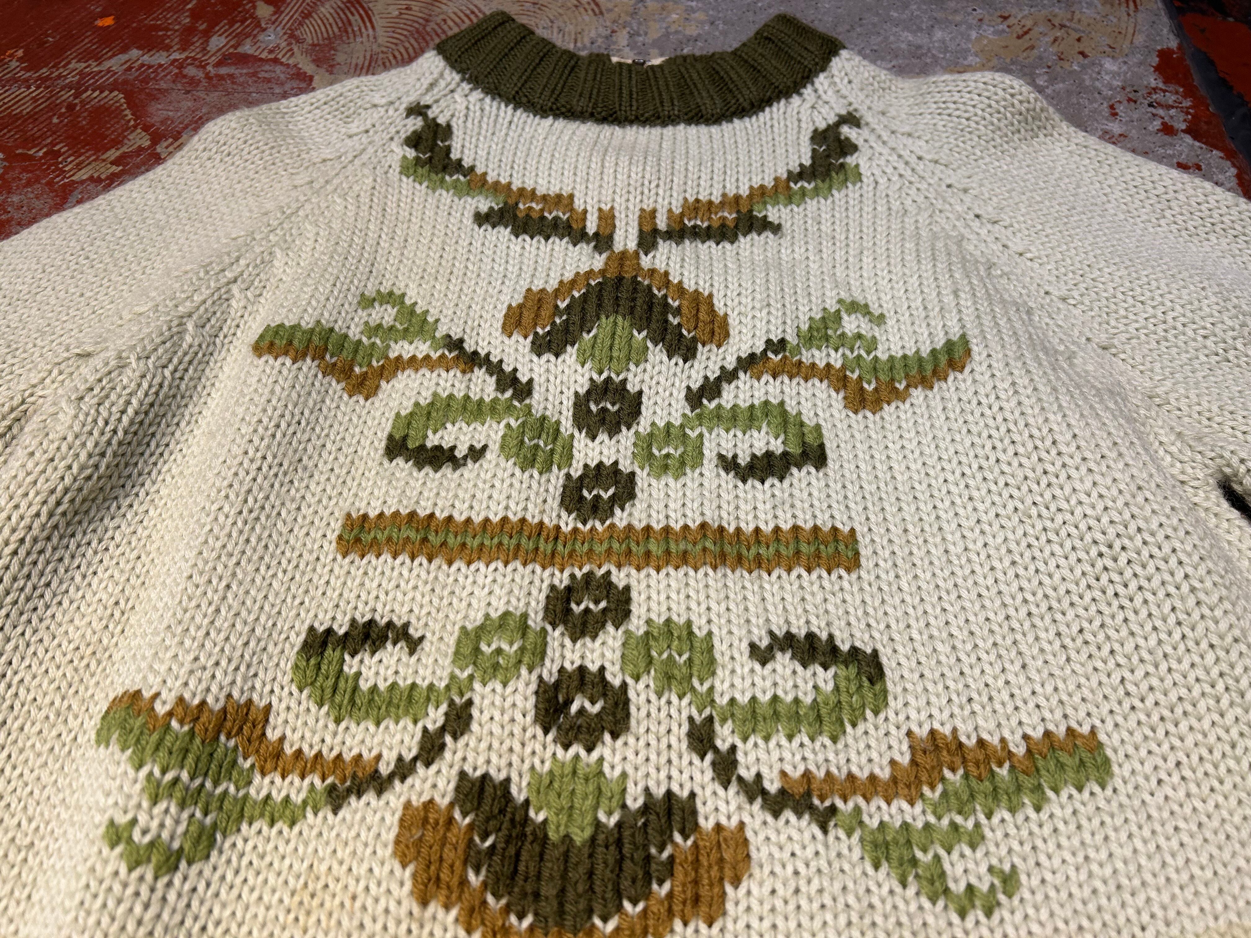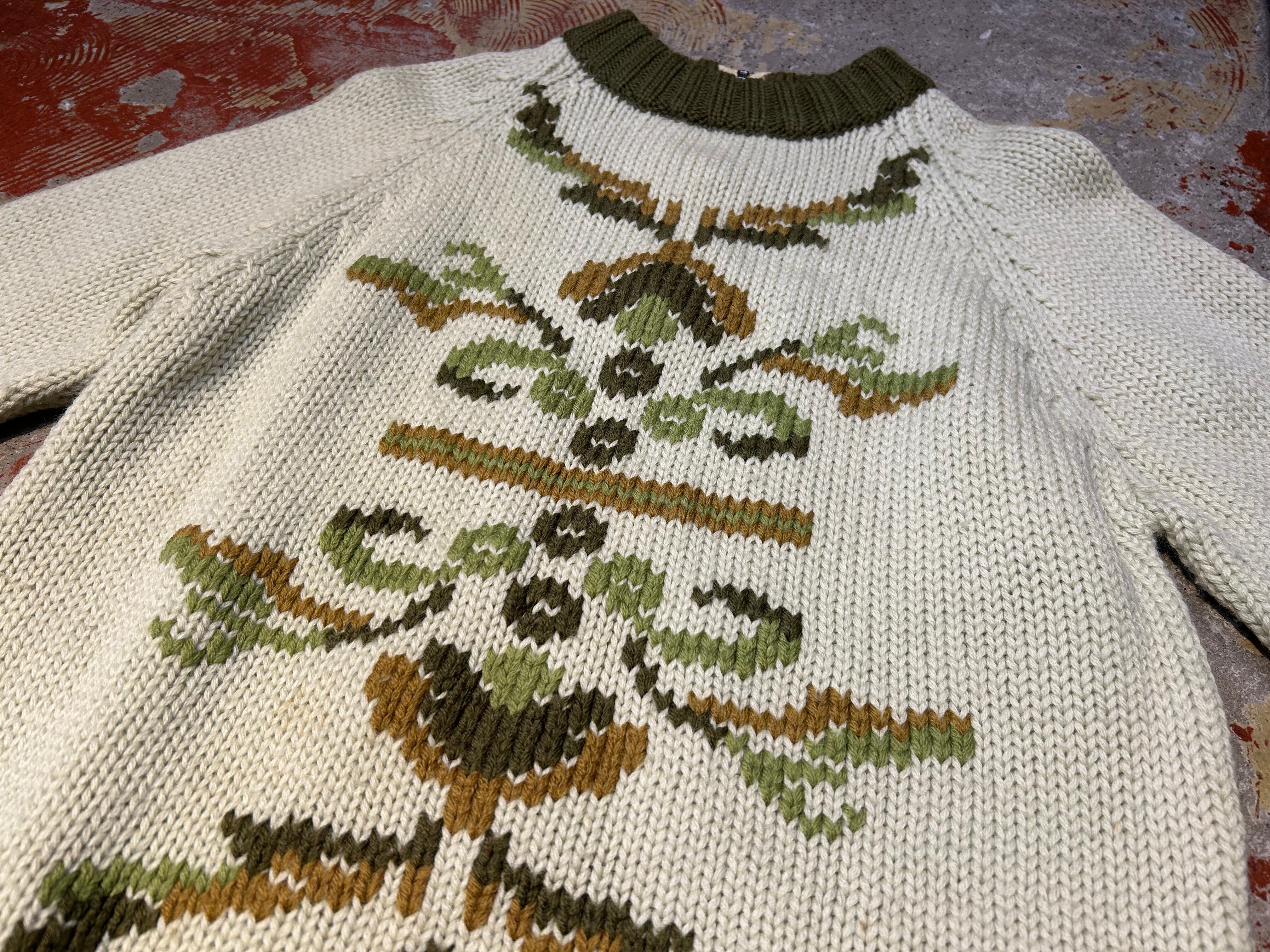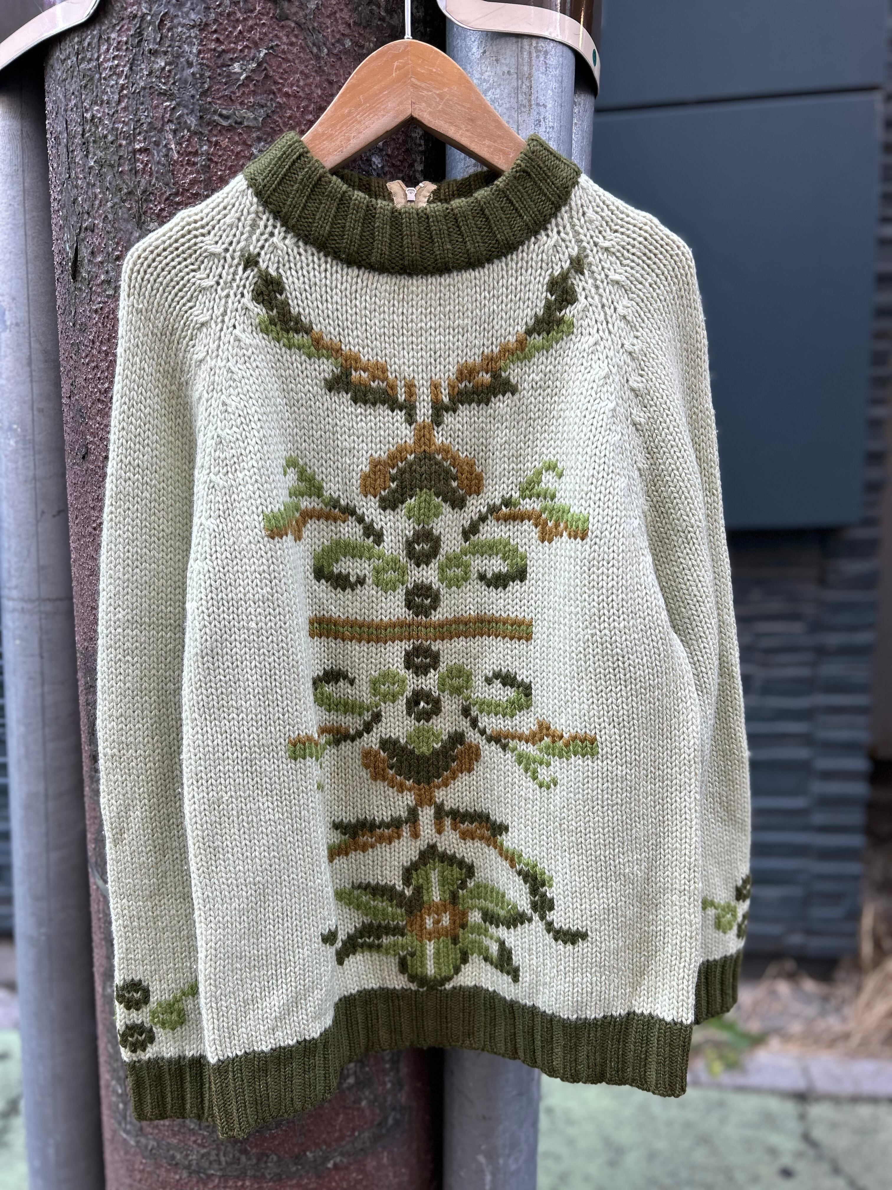 モスグリーンとグリーンの綺麗なニットセーター。フロントのデザインも非常に可愛らしく、一枚で決まるニットセーターです。