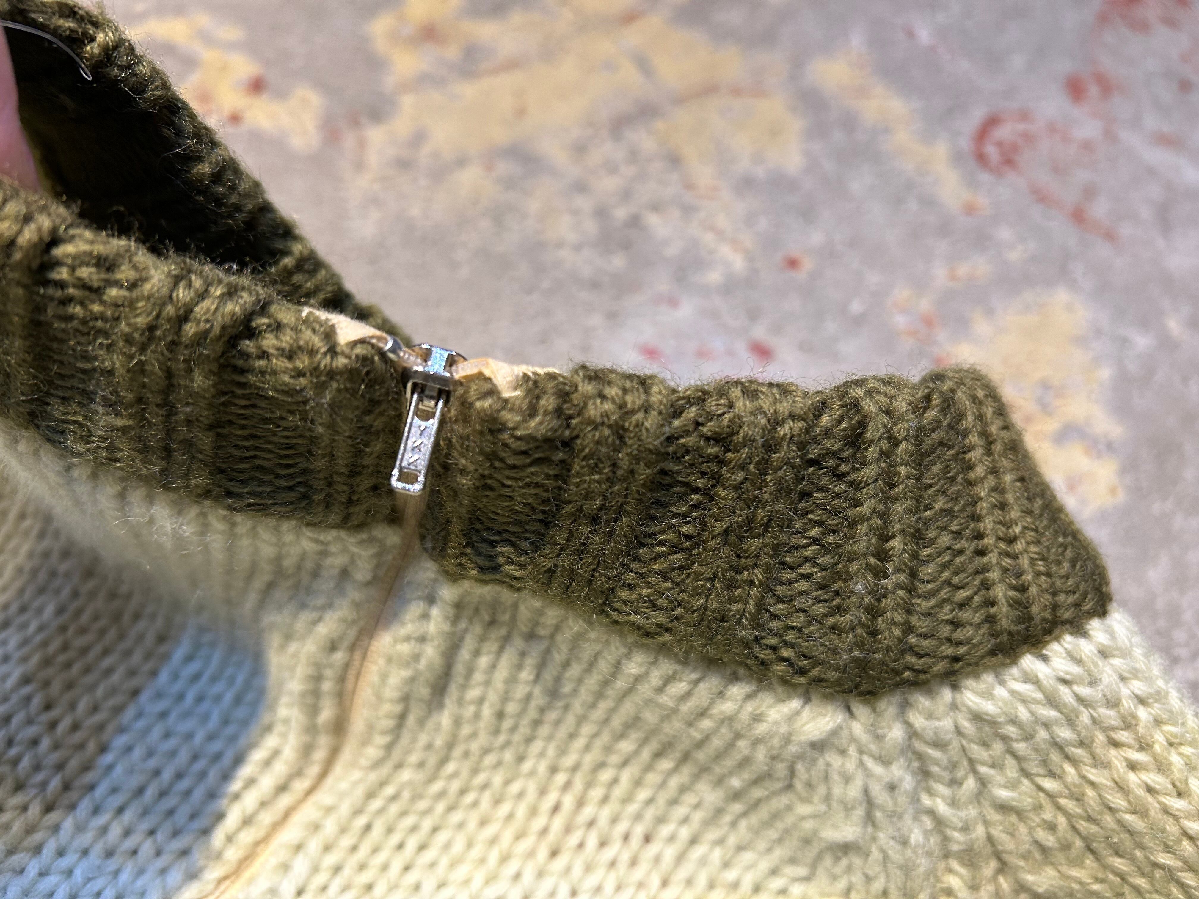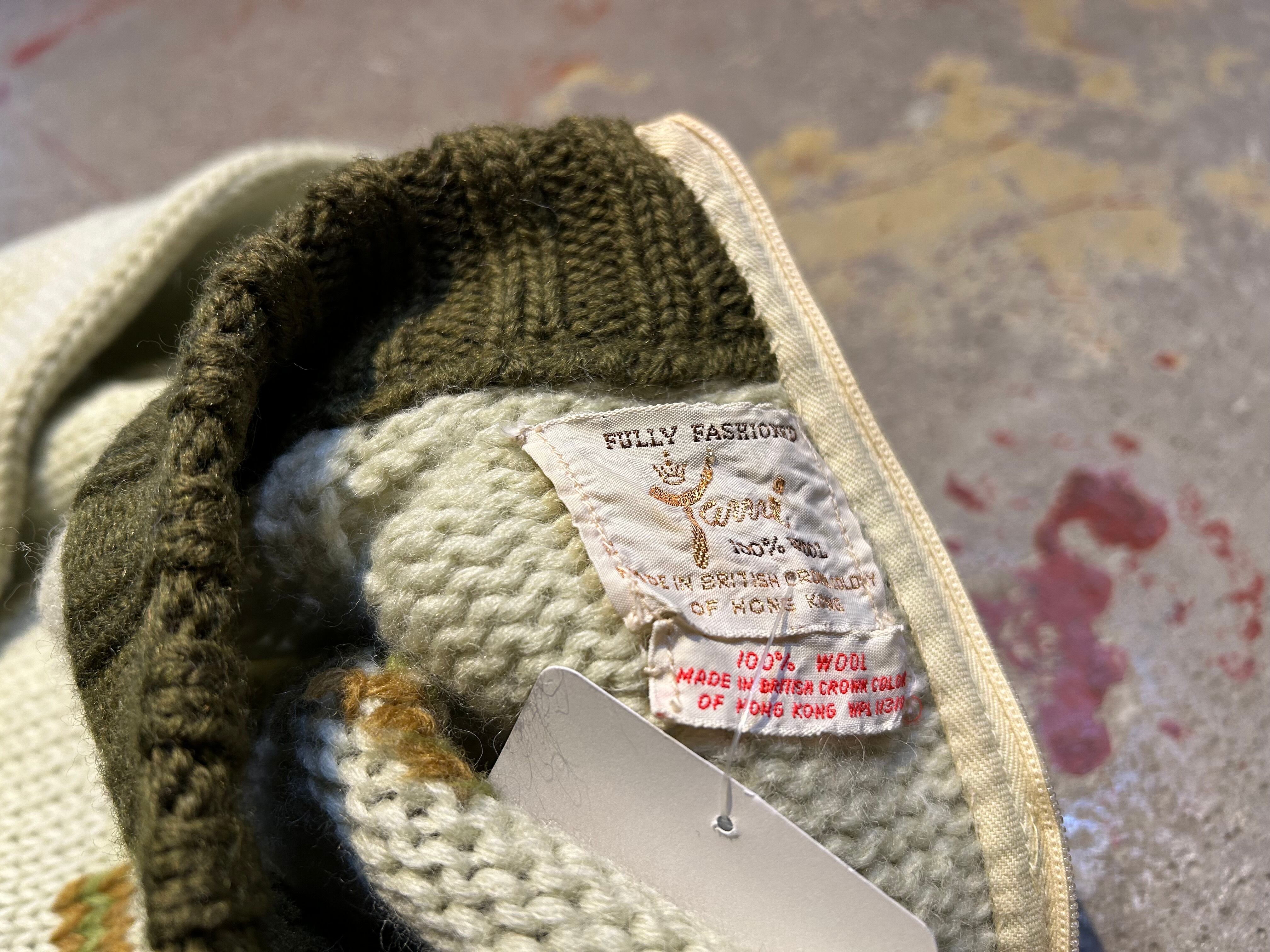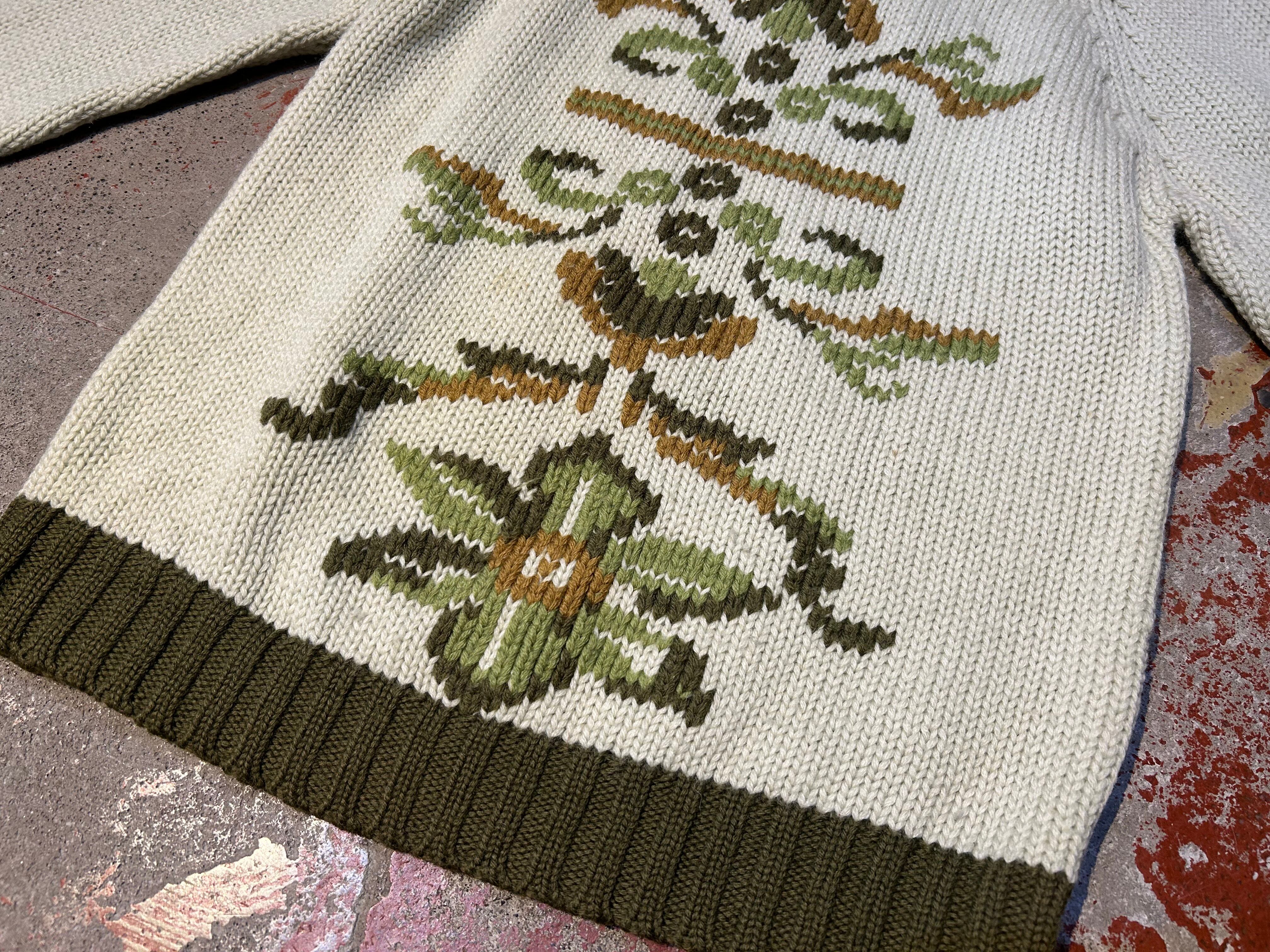 モスグリーンとグリーンの綺麗なニットセーター。フロントのデザインも非常に可愛らしく、一枚で決まるニットセーターです。
